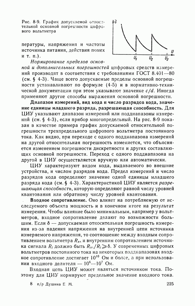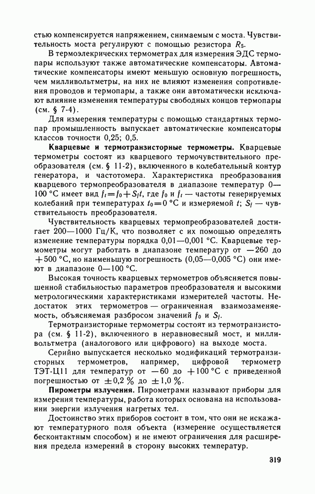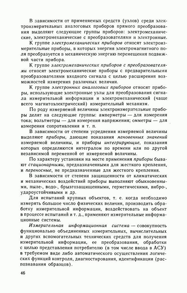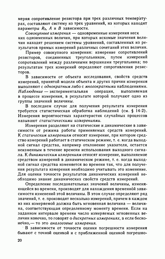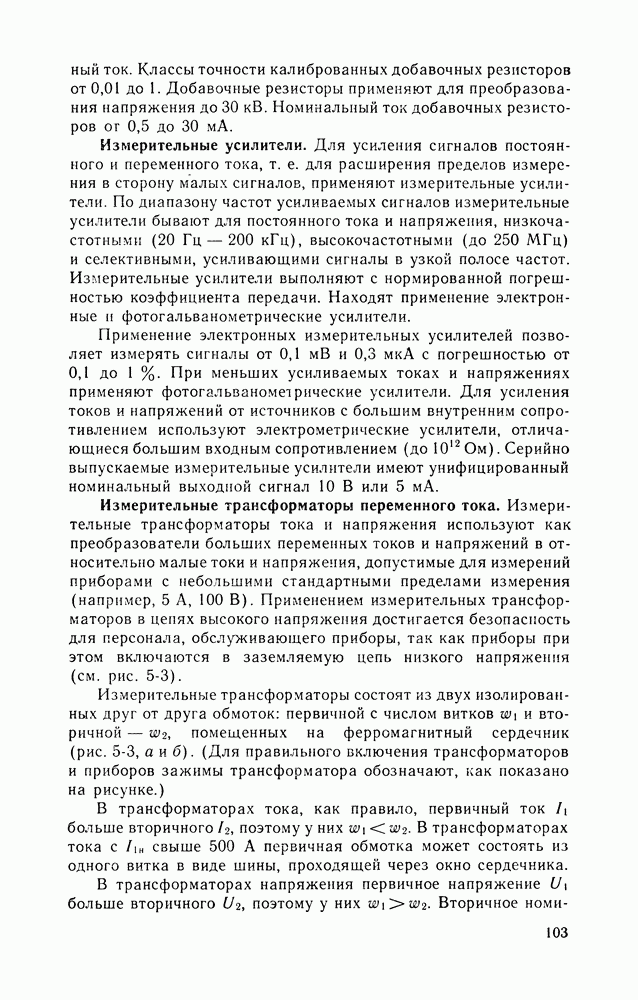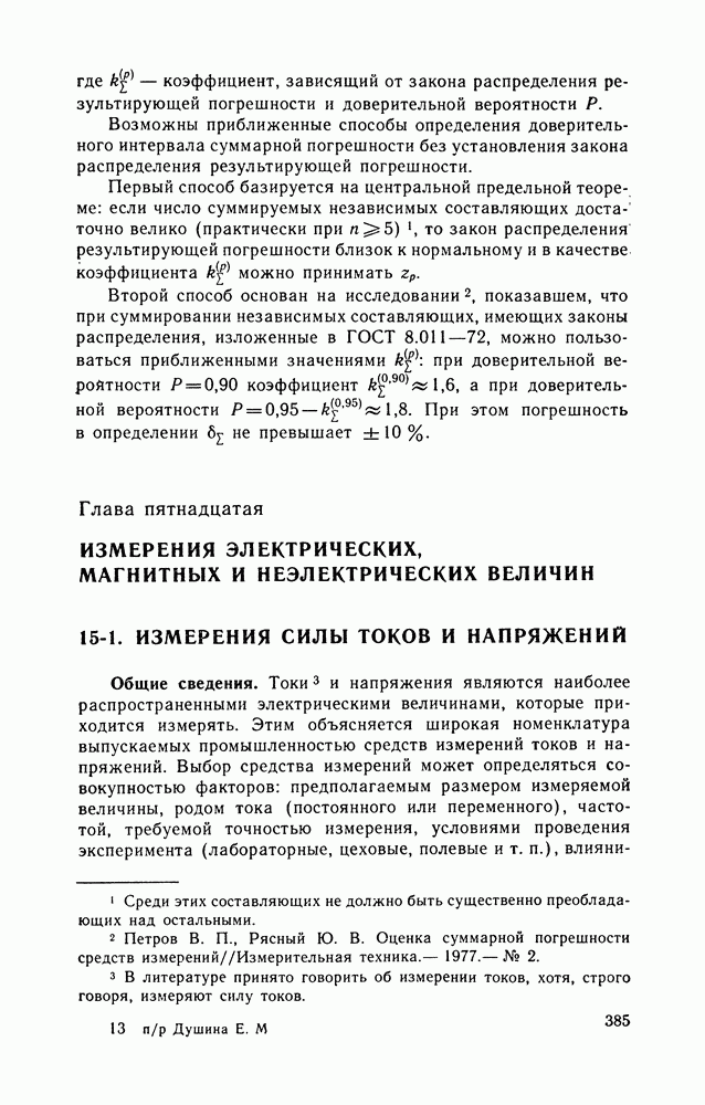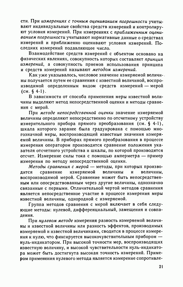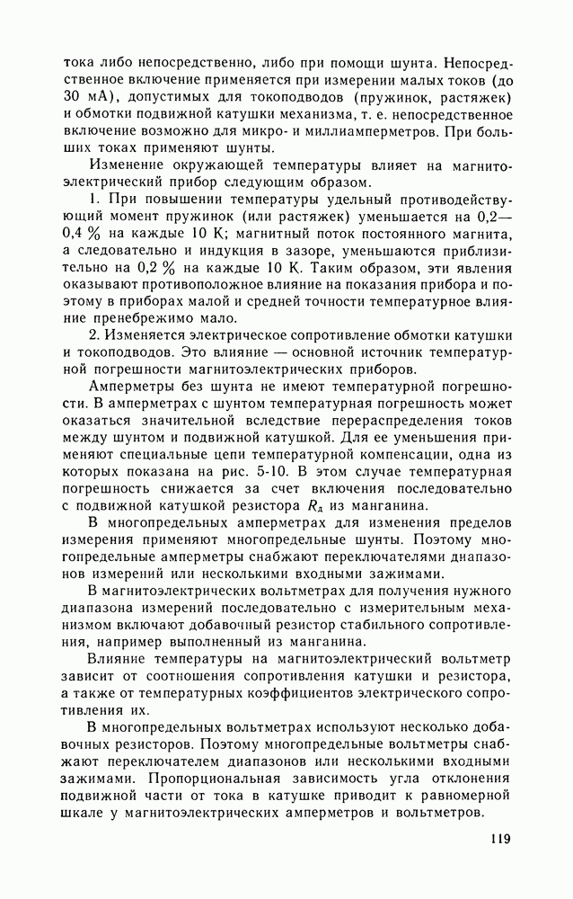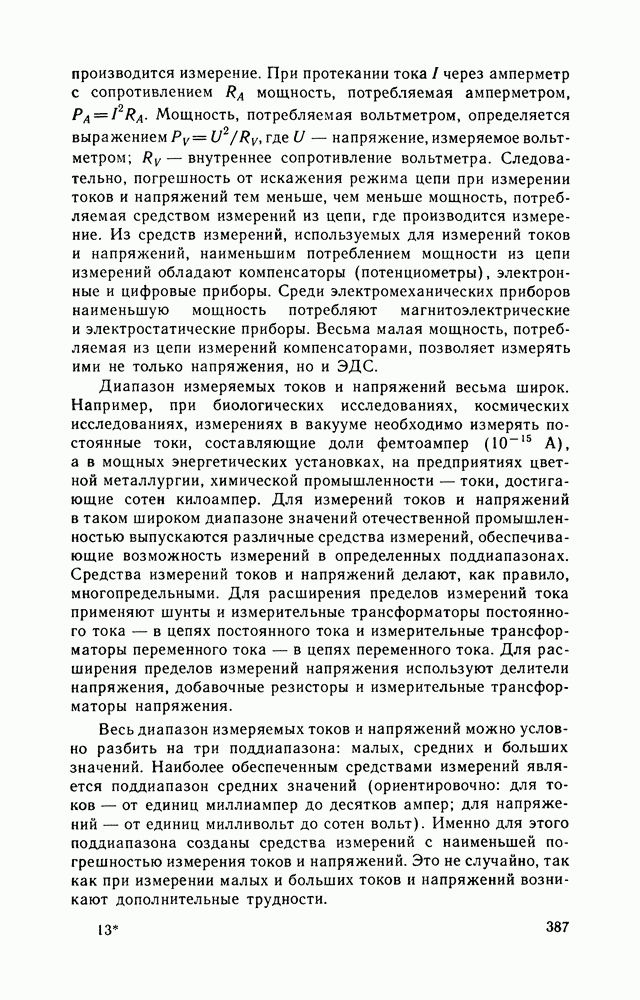 Измерение малых сопротивлений. Сопротивления в диапазоне от единиц ом до Наиболее точными в данном диапазоне являются двойные мосты. В табл. 15-7 приведены классы точности и диапазоны измерений для двойных мостов, в частности для моста типа При измерении очень малых сопротивлений для обеспечения необходимой чувствительности моста требуется через исследуемый объект пропускать большие токи. Так, при измерении мостом Измерение малых сопротивлений одинарными мостами производят в более узком диапазоне — начиная с 10-4 Ом. Точность измерения такими мостами малых сопротивлений ниже точности измерения двойными мостами (см. табл. 15-7). В электронных миллиомметрах измерения производятся на переменном токе, что позволяет значительно снизить мощность, выделяемую на объекте измерений (см. § 6-5). Обычно напряжение на исследуемом объекте составляет десятки милливольт. Измерение больших сопротивлений. При измерении сопротивлений, больших 106—108 Ом, применяют одинарные мосты постоянного тока, электронные тераомметры (мегомметры), цифровые омметры и магнитоэлектрические мегомметры. Сложность измерения больших сопротивлений определяется прежде всего шунтирующим влиянием сопротивления изоляции между входными зажимами приборов, которое при изготовлении и дестабилизирующем влиянии внешних факторов (температуры, влажности, загрязнения и др.) не может быть обеспечено постоянным. Кроме того, токи, протекающие через объекты с большим сопротивлением, становятся весьма малыми, что предъявляет высокие требования к чувствительности средств измерений. В связи с этим приходится повышать напряжение на исследуемом объекте до сотен и даже тысяч вольт. Это предъявляет соответствующие требования к измеряемым объектам. Для измерения таких сопротивлений с наибольшей точностью применяют одинарные мосты постоянного тока (см. табл. 15-7). Верхние пределы измерений таких мостов равны 1015 Ом Для измерений относительного отклонения сопротивлений от требуемого (или установленного) значения применяют процентные омметры и компараторы сопротивлений. Процентные омметры Косвенные измерения. Наиболее распространенным является способ амперметра и вольтметра (см. рис. 15-19). Этот способ может применяться для измерения различных по значению сопротивлений. Достоинство этого способа заключается в том, что через резистор можно пропускать такой же ток, как и ток, протекающий через объект в рабочих условиях, что важно при измерении нелинейных сопротивлений, т. е. таких сопротивлений, значения которых зависят от тока. Значение сопротивления можно определить по закону Ома: