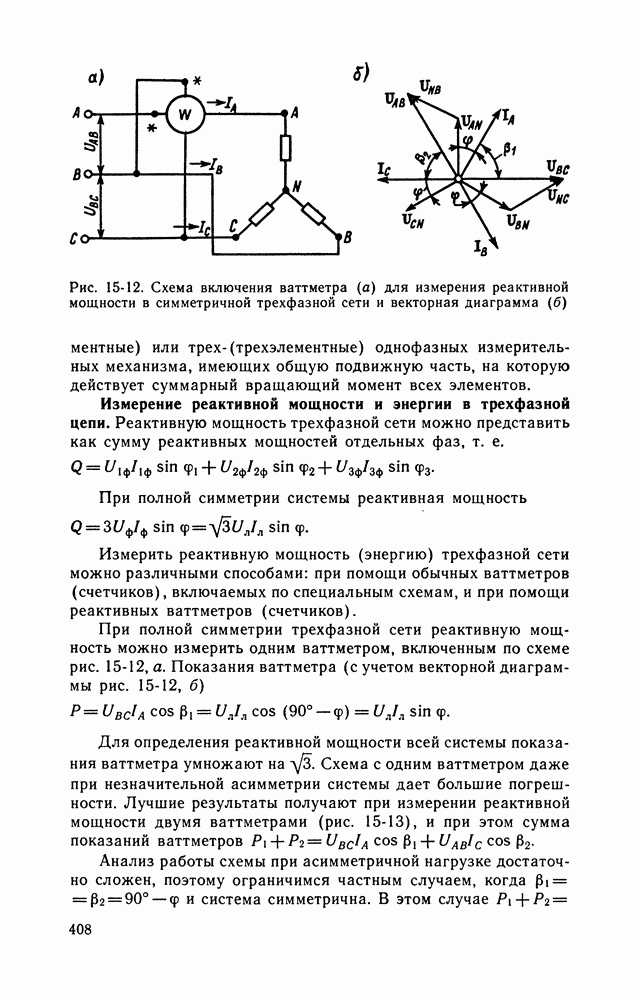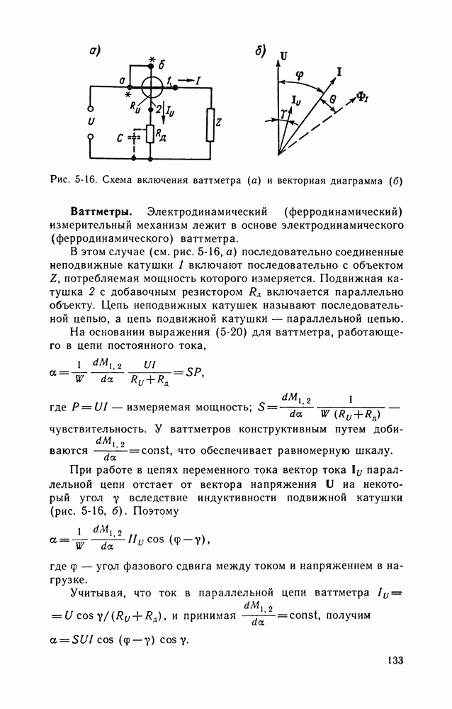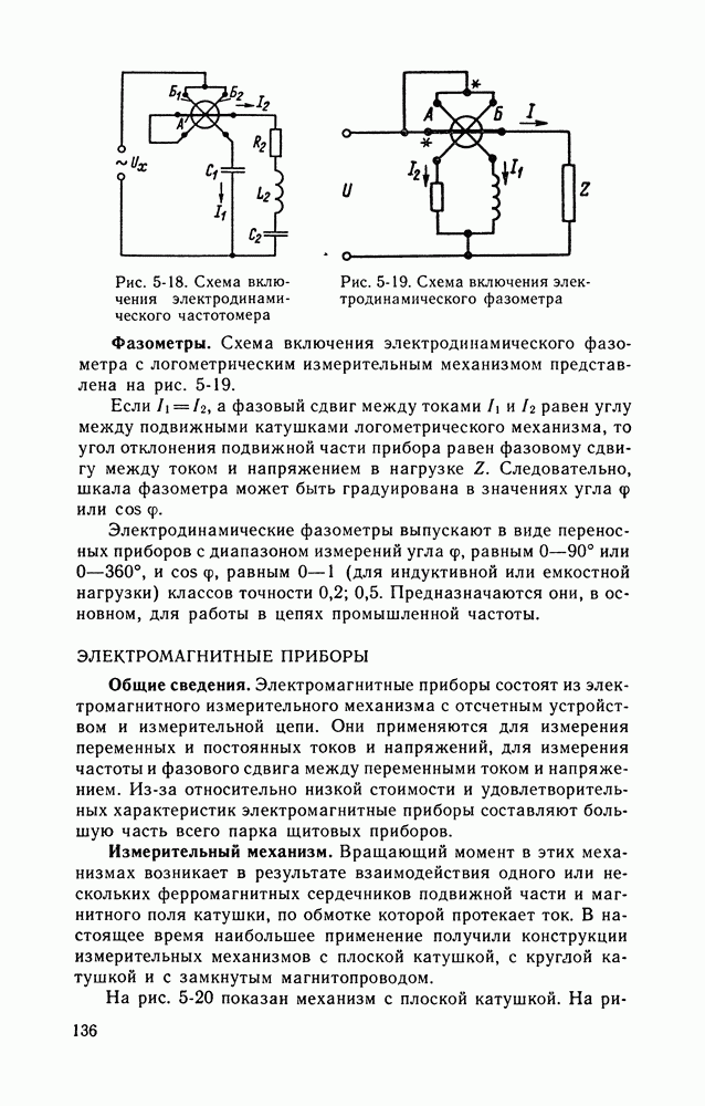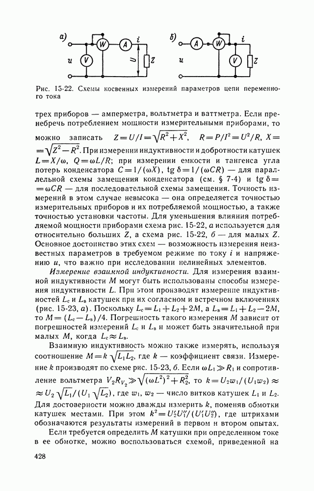 Рис. 15-22. Схемы косвенных измерений параметров цепи переменноного тока трех приборов — амперметра, вольтметра и ваттметра. Если пренебречь потреблением мощности измерительными приборами, то можно записать Измерение взаимной индуктивности. Для измерения взаимной индуктивности М могут быть использованы способы измерения индуктивности Взаимную индуктивность можно также измерять, используя соотношение Для достоверности можно дважды измерить 6, поменяв обмотки катушек местами. При этом Если требуется определить М катушки при определенном токе в ее обмотке, можно воспользоваться схемой, приведенной на