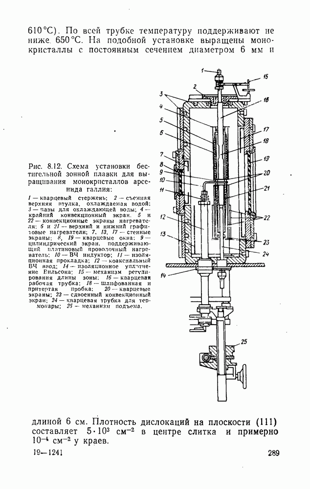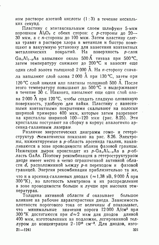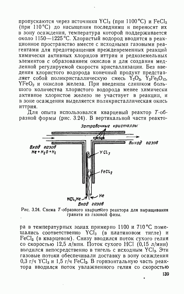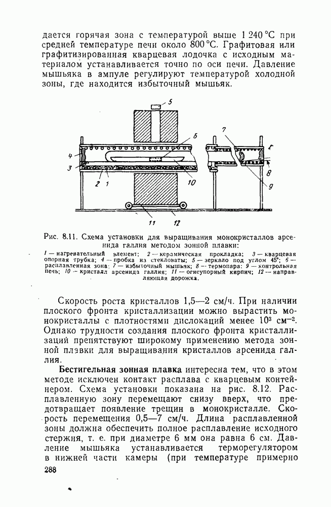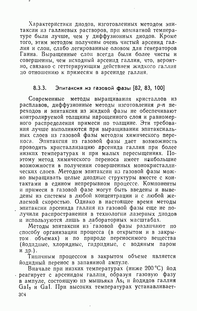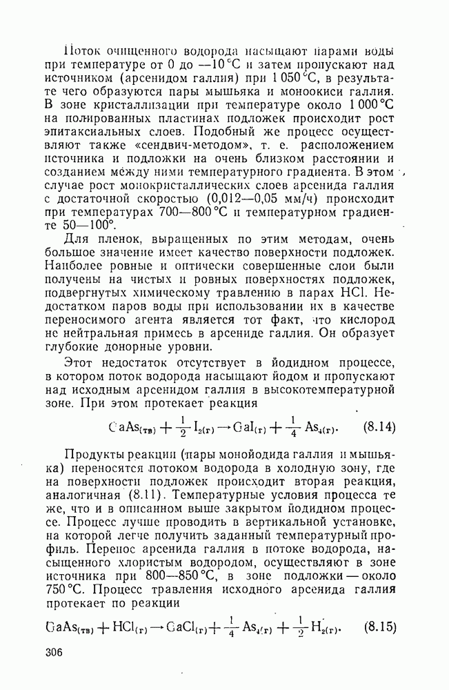 Продукты реакции (пары монойодида галлия и мышьяка) переносятся потоком водорода в холодную зону, где на поверхности подложек происходит вторая реакция, аналогичная (8.11). Температурные условия процесса те же, что и в описанном выше закрытом йодидном процессе. Процесс лучше проводить в вертикальной установке, на которой легче получить заданный температурный профиль. Перепое арсенида галлия в потоке водорода, насыщенного хлористым водородом, осуществляют в зоне источника при