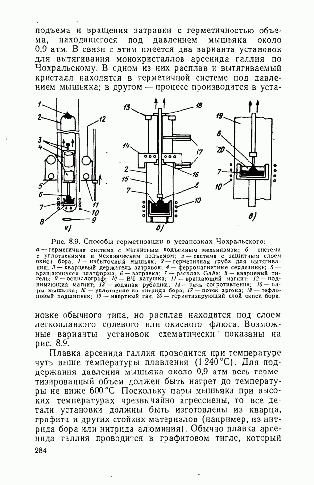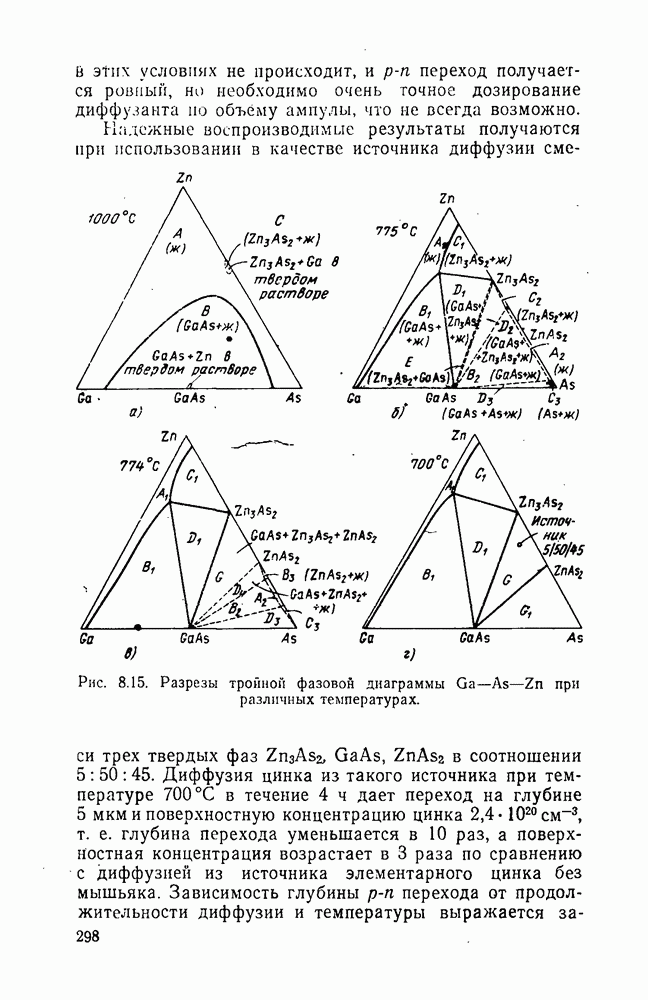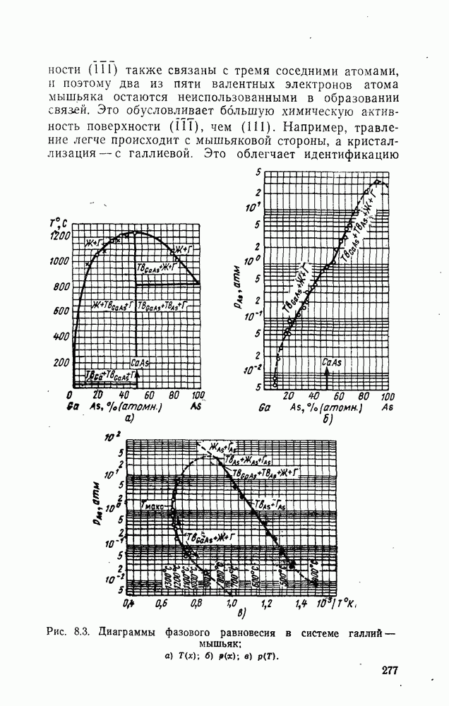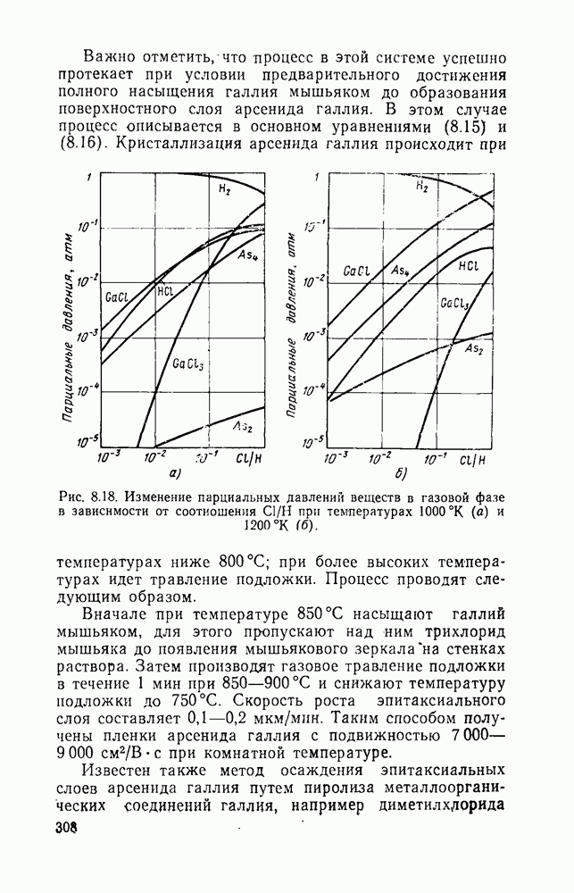 Рис. 8.18. Изменение парциальных давлений веществ в газовой фазе в зависимости от соотношения Кристаллизация арсенида галлия происходит при температурах ниже Вначале при температуре Известен также метод осаждения эпитаксиальных слоев арсенида галлия путем пиролиза металлоорганических соединений галлия, например диметилхдорида