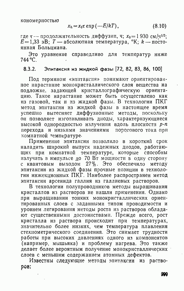 Поток очищенного водорода насыщают парами воды при температуре от 0 до В зоне кристаллизации при температуре около 1000 °С на полированных пластинах подложек происходит рост эпитаксиальных слоев. Подобный же процесс осуществляют также «сендвич-методом», т. е. расположением источника и подложки на очень близком расстоянии и созданием между ними температурного градиента. В этом Для пленок, выращенных по этим методам, очень большое значение имеет качество поверхности подложек. Наиболее ровные и оптически совершенные слои были получены на чистых и ровных поверхностях подложек, подвергнутых химическому травлению в парах Этот недостаток отсутствует в йодидном процессе, в котором поток водорода насыщают йодом и пропускают над исходным арсенидом галлия в высокотемпературной зоне. При этом протекает реакция