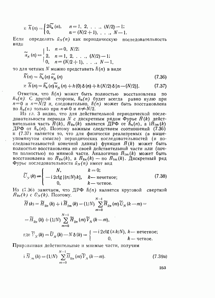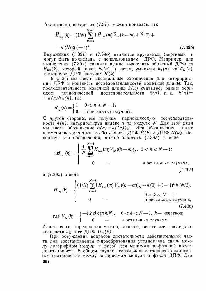 Как уже было видно, периодические последовательности и последовательности конечной длины представляются дискретным преобразованием Фурье. Результаты предыдущих разделов не могут быть применены непосредственно к дискретному преобразованию Фурье. Однако при соответствующем определении физической реализуемости можно установить соотношения между действительной и мнимой частями дискретного преобразования Фурье так, как это было сделано в § 7.1 [7, 8].