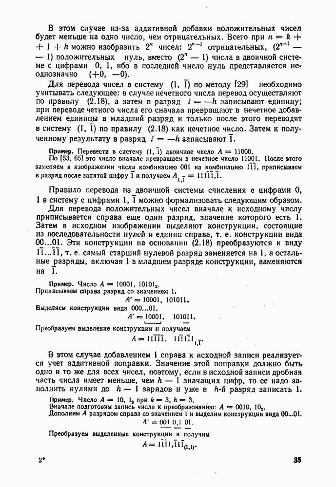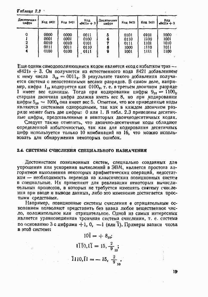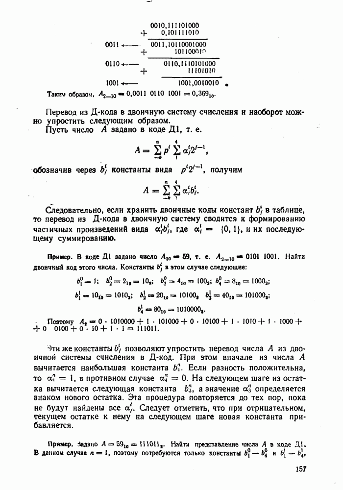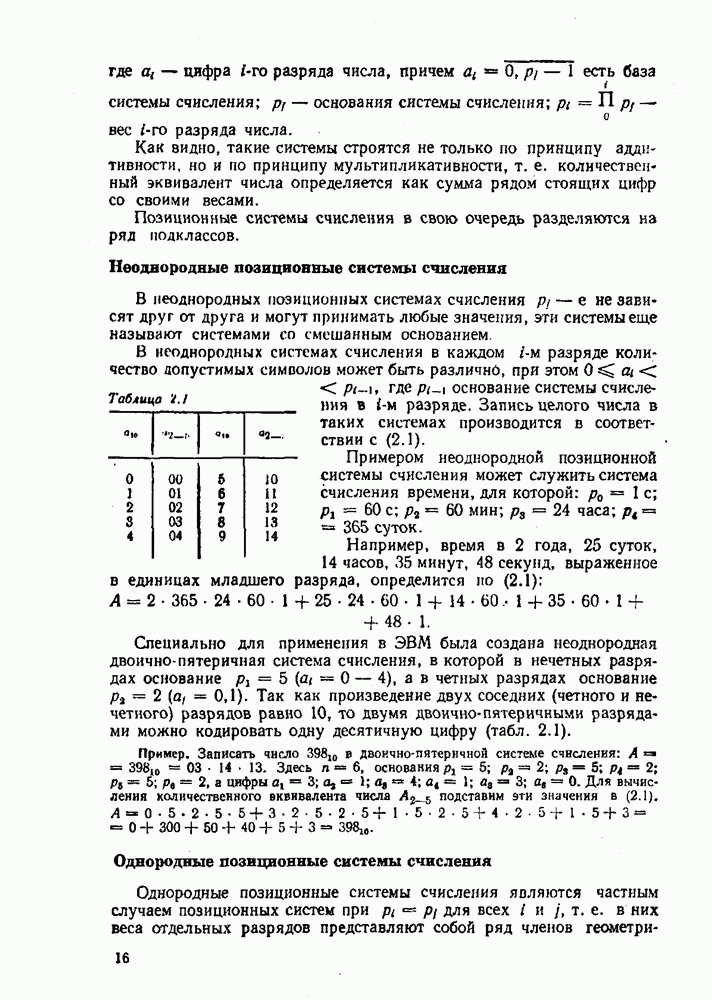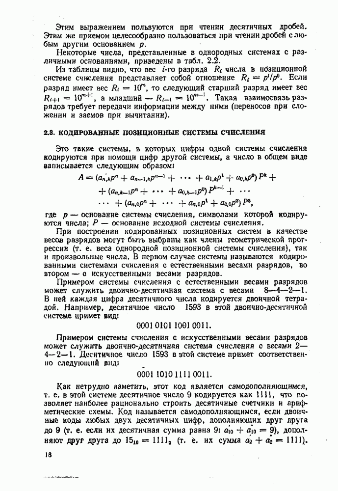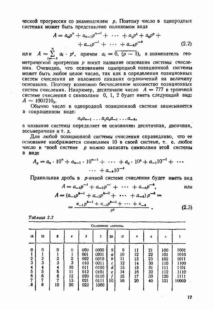 2.7. ПЕРЕВОД ЧИСЕЛ ИЗ ОДНОЙ СИСТЕМЫ СЧИСЛЕНИЯ В ДРУГУЮСуществует два основных метода перевода числа из одной системы счисления в другую: табличный и расчетный. Табличный метод прямого перевода основан на сопоставлении таблиц соответствия чисел различных систем счисления. Этот метод очень громоздок и требует большого объема памяти для хранения таблиц» но применим для любых систем счисления (не только для позиционных). Суть другого вида табличного метода состоит в том, что имеются таблицы эквивалентов в каждой системе только для цифр, т. е. баз, этих систем и степеней основания (положительных и отрицательных), т. е. базиса систем. Задача перевода сводится к тому, что в выражения полиномов (2.2) и (2.3) для исходной системы счисления представляют эквиваленты ил новой системы для всех цифр и их весов разрядов и производят действия (умножения и сложения) по правилам арифметики по новому основанию Пример. Число Таблица эквивалентов