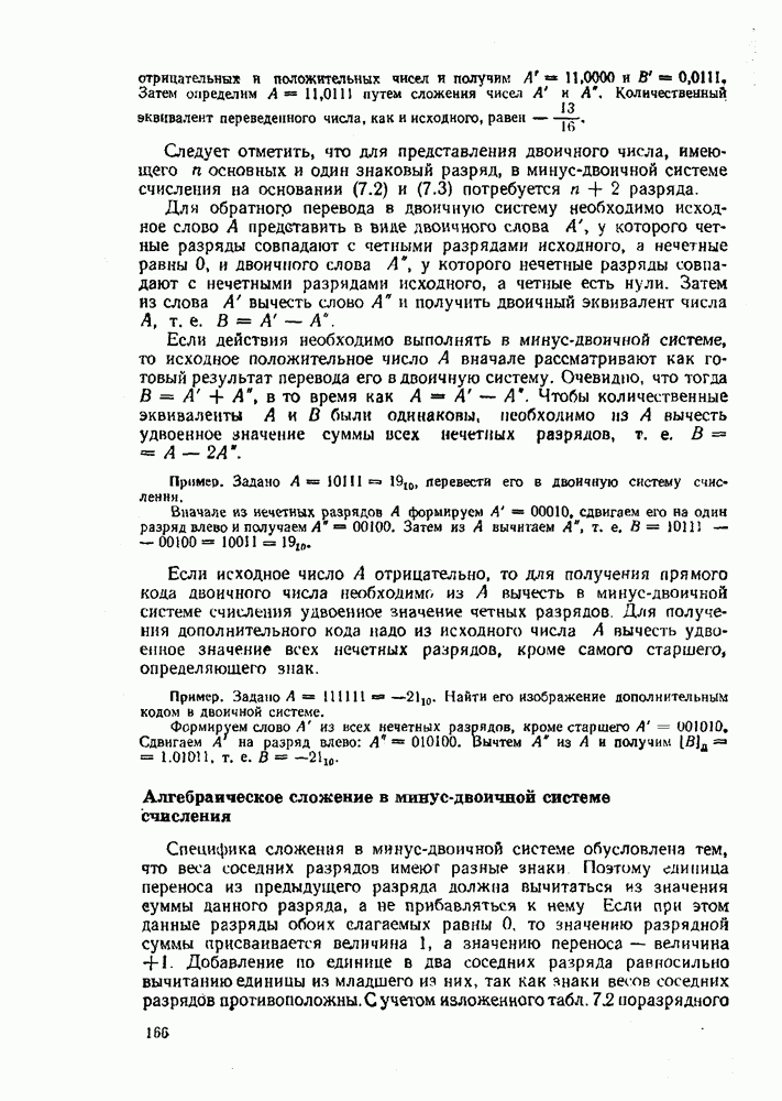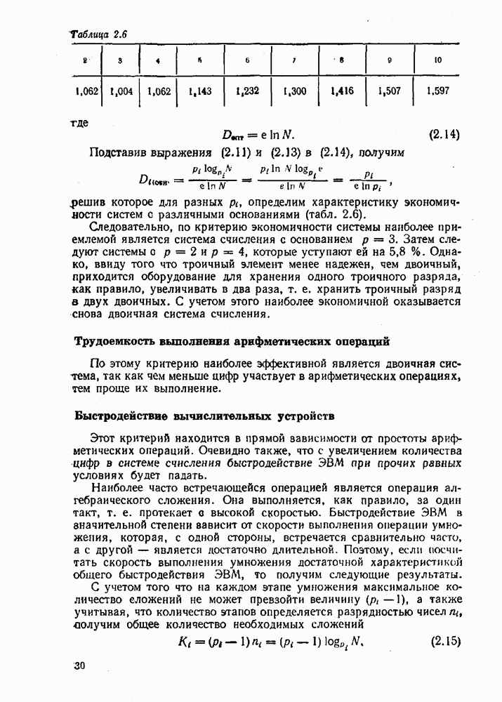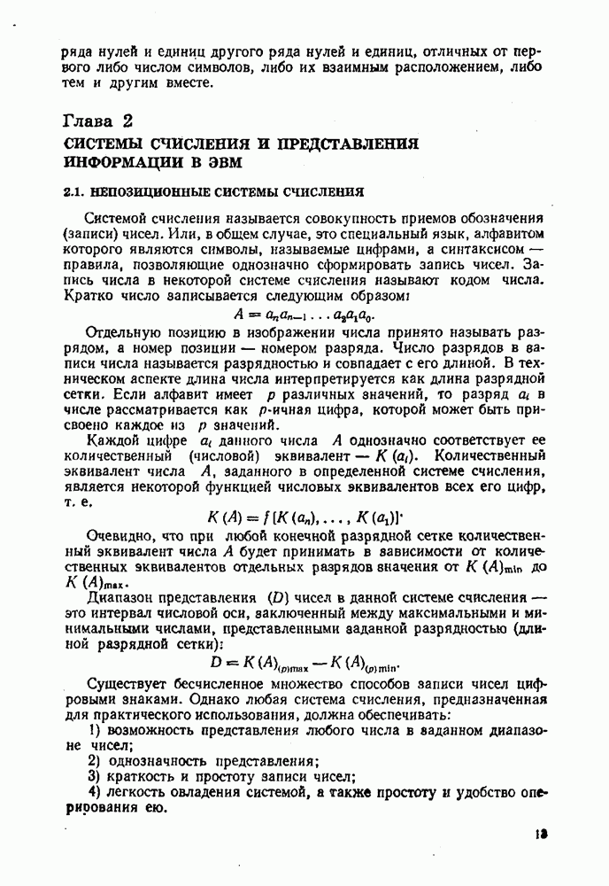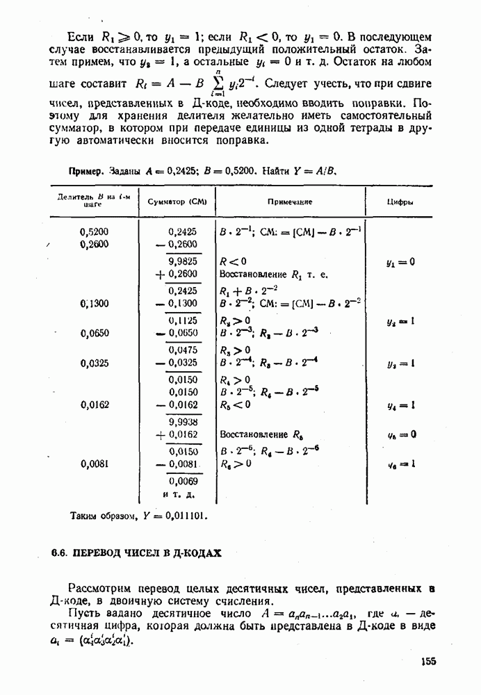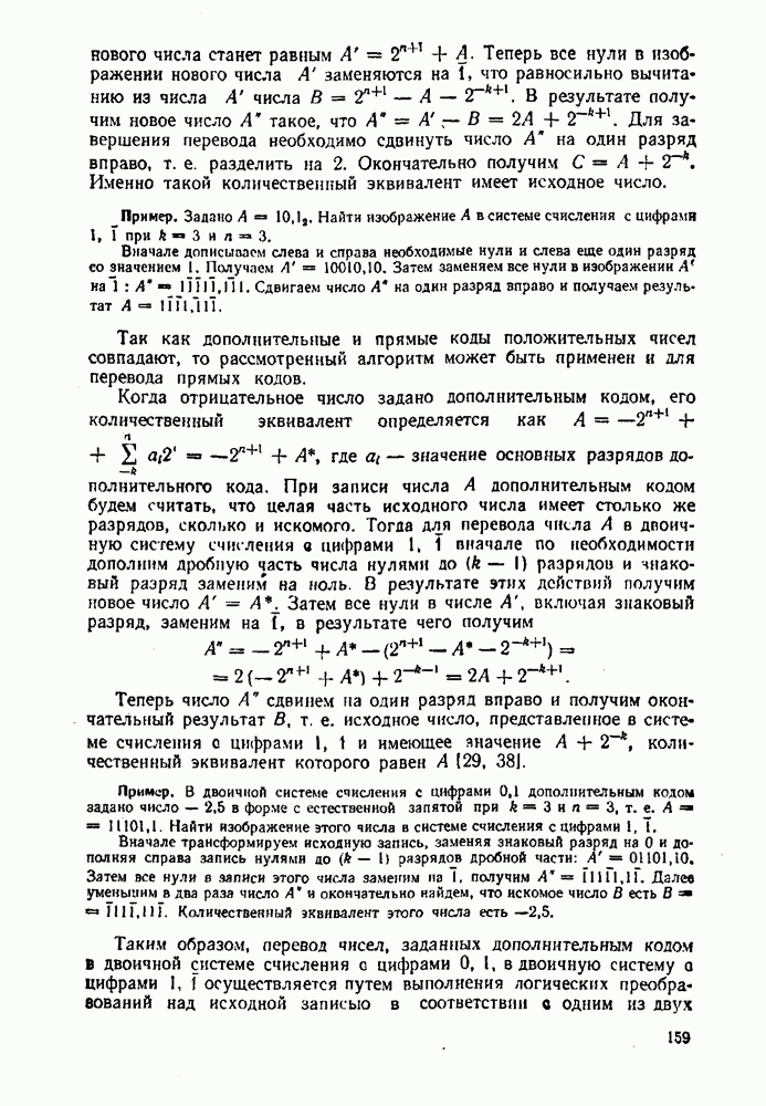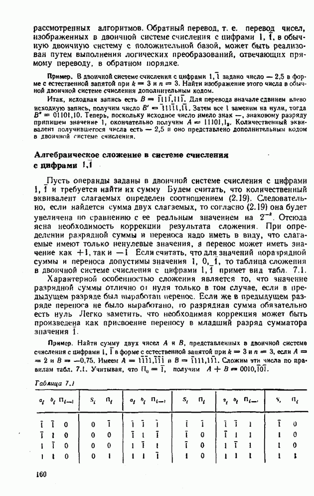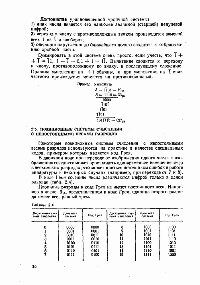 2.7. ПЕРЕВОД ЧИСЕЛ ИЗ ОДНОЙ СИСТЕМЫ СЧИСЛЕНИЯ В ДРУГУЮСуществует два основных метода перевода числа из одной системы счисления в другую: табличный и расчетный. Табличный метод прямого перевода основан на сопоставлении таблиц соответствия чисел различных систем счисления. Этот метод очень громоздок и требует большого объема памяти для хранения таблиц» но применим для любых систем счисления (не только для позиционных). Суть другого вида табличного метода состоит в том, что имеются таблицы эквивалентов в каждой системе только для цифр, т. е. баз, этих систем и степеней основания (положительных и отрицательных), т. е. базиса систем. Задача перевода сводится к тому, что в выражения полиномов (2.2) и (2.3) для исходной системы счисления представляют эквиваленты ил новой системы для всех цифр и их весов разрядов и производят действия (умножения и сложения) по правилам арифметики по новому основанию Пример. Число Таблица эквивалентов