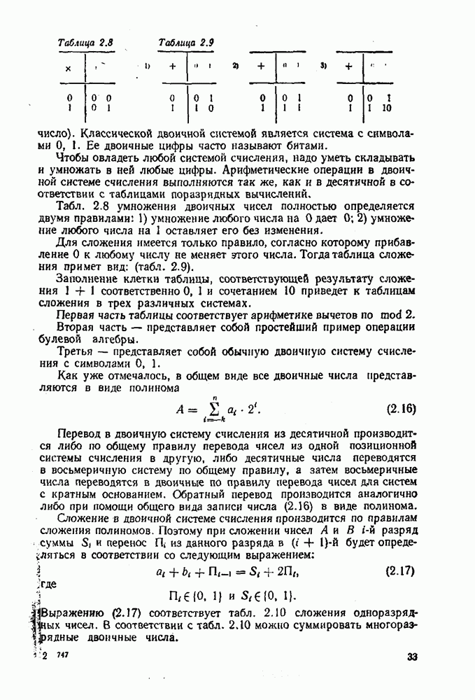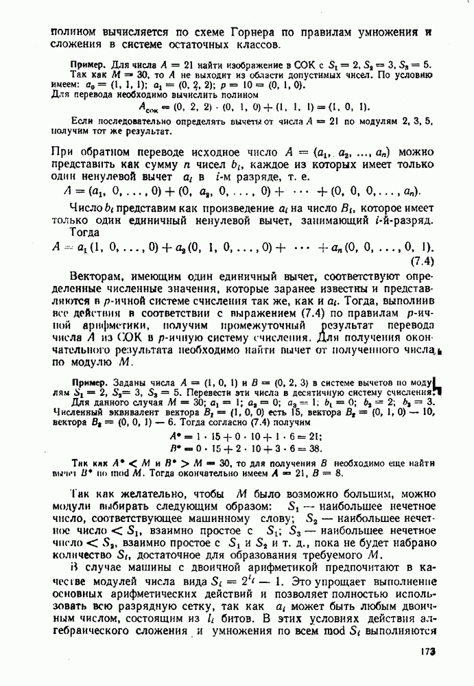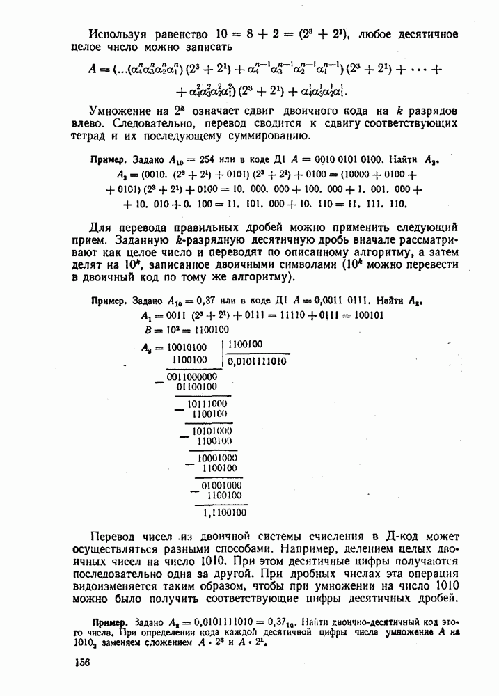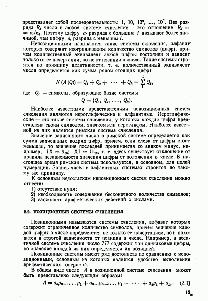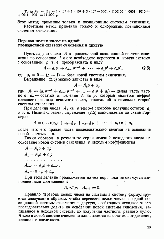 т. е. получим б) при переводе из двоичной системы счисления в десятичную исходное число не обходимо делить на основание новой системы, т. е. 1010. Деление выполнять в двоичной системе трудно. Поэтому на практике при необходимости перевода чисел из системы с малым основанием в систему с большим основанием удобно пользоваться общей записью чисел в виде полинома (2.5). В общем случае можно вычислить многочлен