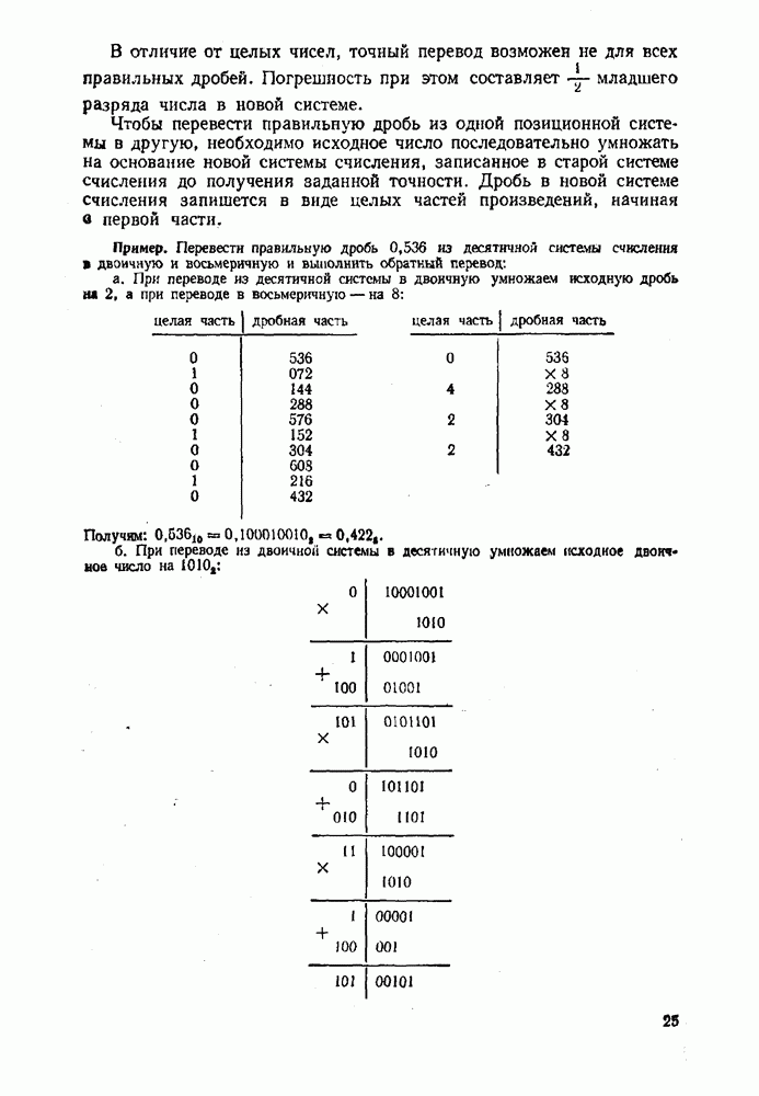 Умножая его последовательно В отличие от целых чисел, точный перевод возможен не для всех правильных дробей. Погрешность при этом составляет младшего разряда числа в новой системе. Чтобы перевести правильную дробь из одной позиционной системы в другую, необходимо исходное число последовательно умножать на основание новой системы счисления, записанное в старой системе счисления до получения заданной точности. Дробь в новой системе счисления запишется в виде целых частей произведений, начиная в первой части. Пример. Перевести правильную дробь 0,536 из десятичной системы счисления В двоичную и восьмеричную и выполнить обратный перевод: а. При переводе из десятичной системы в двоичную умножаем исходную дробь на 2, а при переводе в восьмеричную — на 1010: