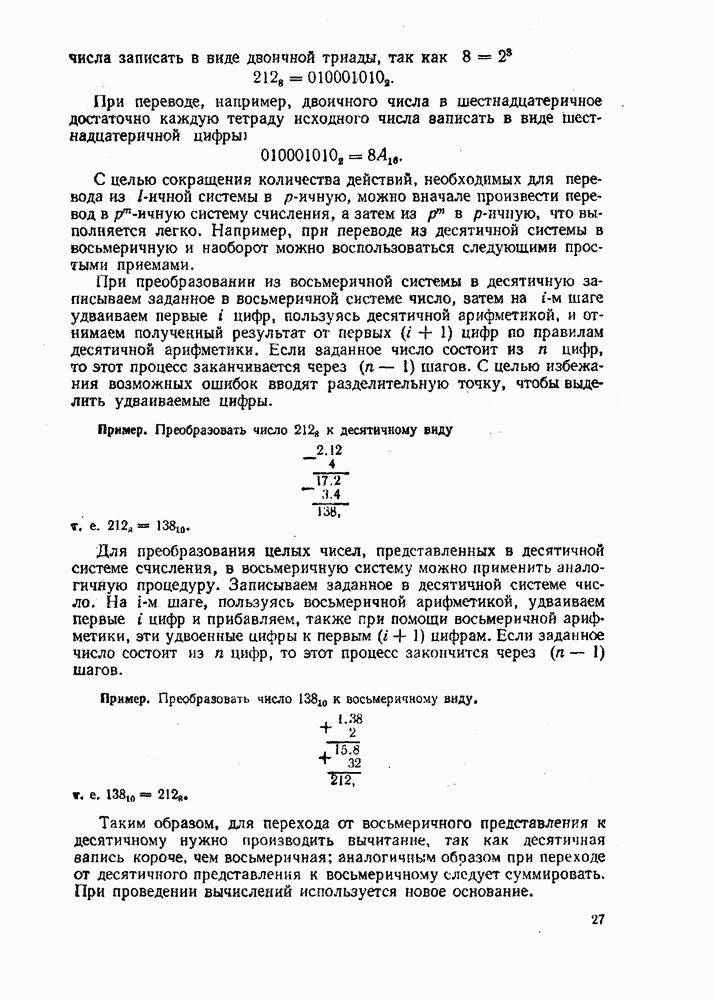 Таким образом, для перехода от восьмеричного представления к десятичному нужно производить вычитание, так как десятичная запись короче, чем восьмеричная; аналогичным образом при переходе от десятичного представления к восьмеричному следует суммировать. При проведении вычислений используется новое основание.