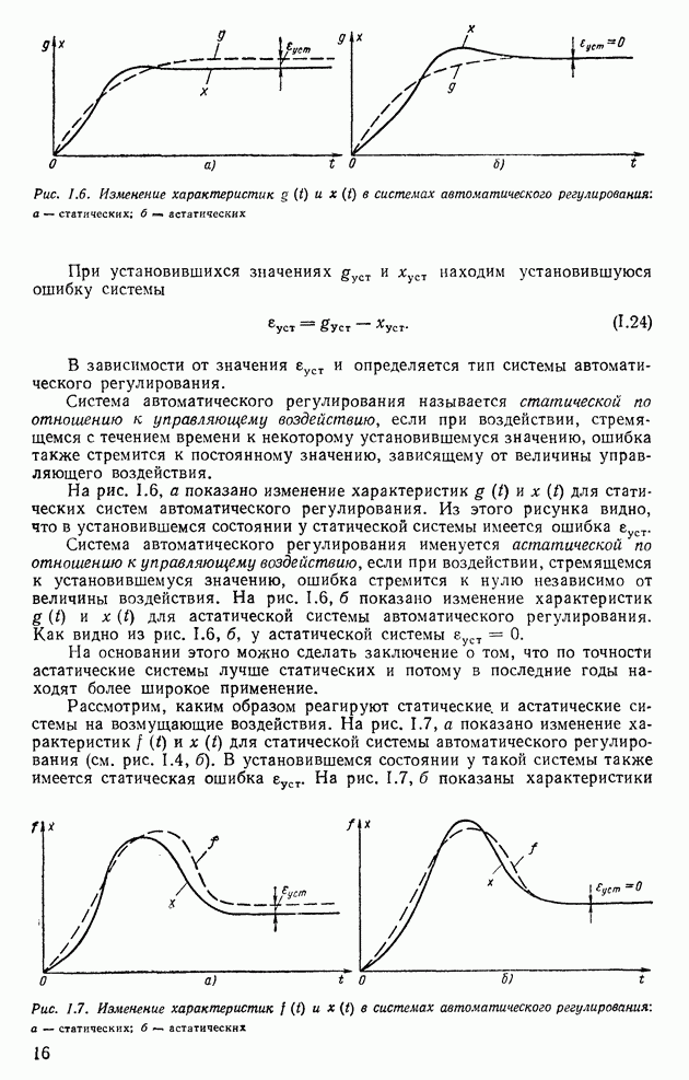 Система автоматического регулирования именуется астатической по отношению к управляющему воздействию, если при воздействии, стремящемся к установившемуся значению, ошибка стремится к нулю независимо от величины воздействия. На рис. 1.6, б показано изменение характеристик