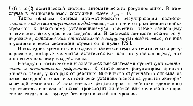 Таким образом, система автоматического регулирования является статической по возмущающему воздействию, если при его приложении ошибка стремится к некоторому установившемуся значению, также зависящему от величины возмущающего воздействия. В системах автоматического регулирования, астатических относительно возмущающего воздействия, ошибка в установившемся состоянии стремится к нулю [72].