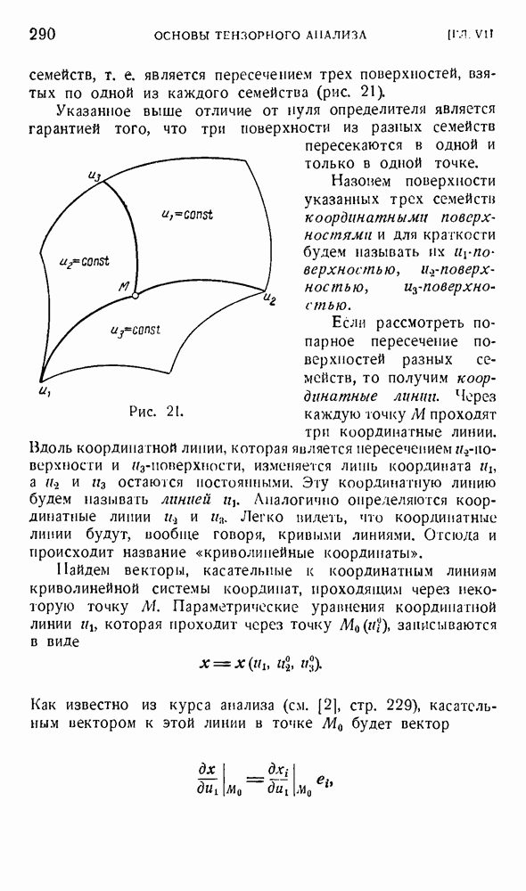 являются уравнениями двух других семейств поверхностей. Если точка М имеет координаты семейств, т. е. является пересечением трех поверхностей, взятых по одной из каждого семейства (рис. 21). Указанное выше отличие от нуля определителя является гарантией того, что три поверхности из разных семейств пересекаются в одной и только в одной точке. Назопем поверхности указанных трех семейств координатными поверхностями и для краткости будем называть их поверхностью,