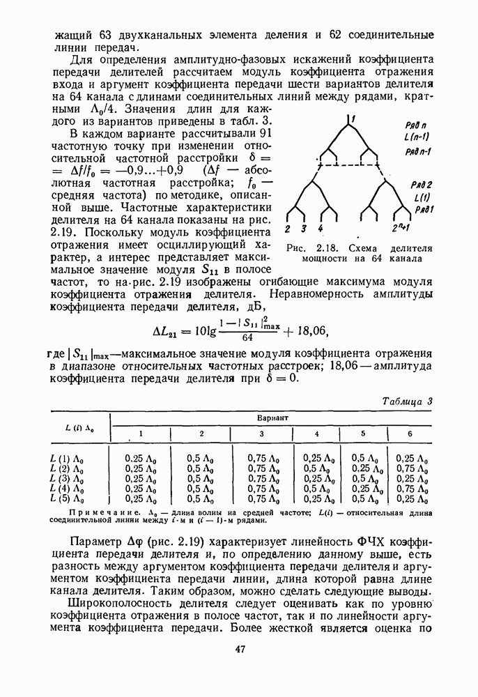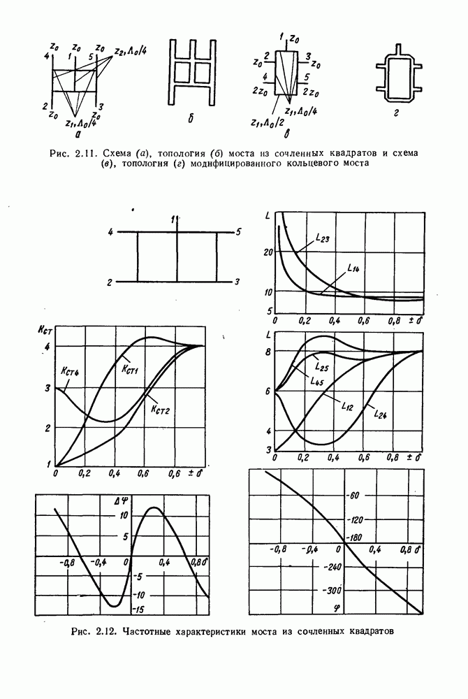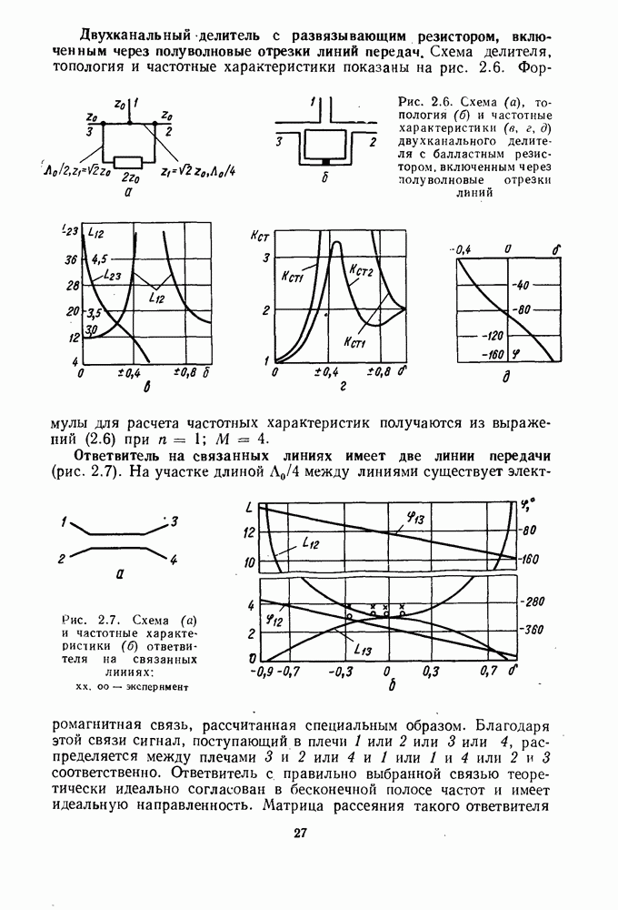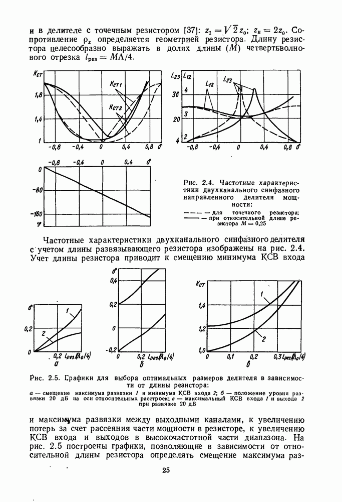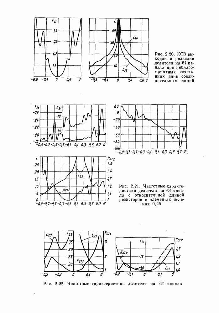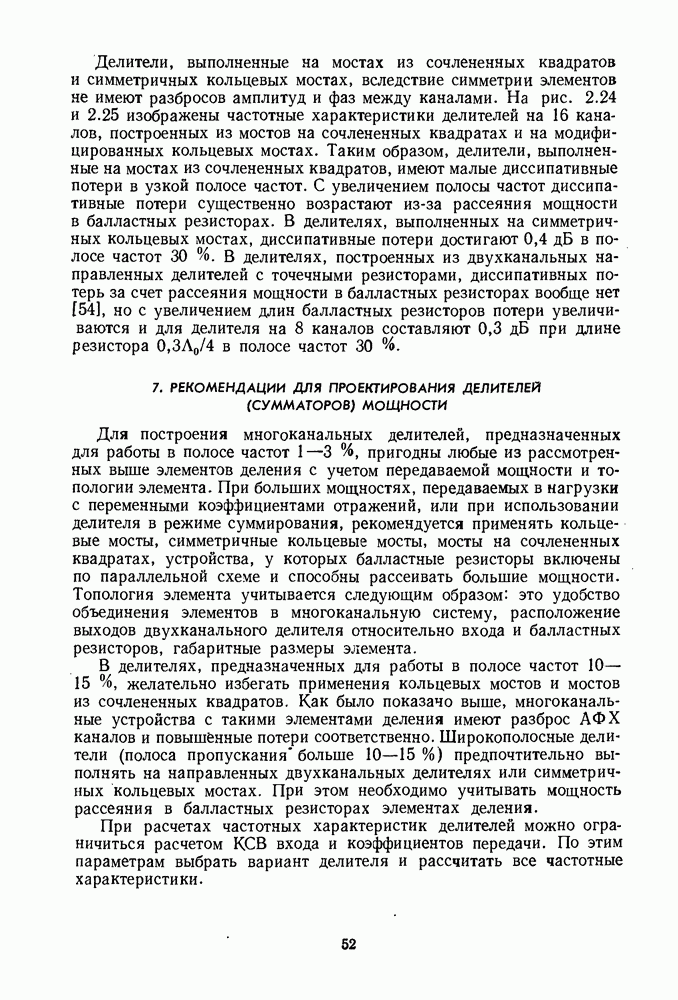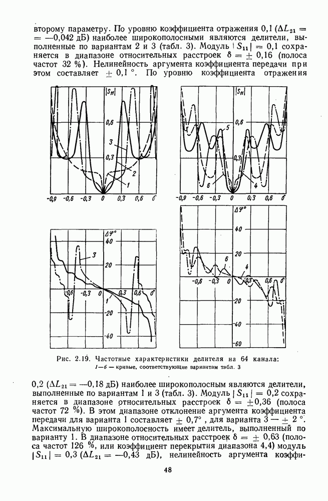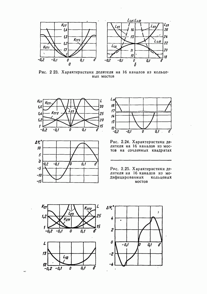 (кликните для просмотра скана) Делители, выполненные на мостах из сочлененных квадратов и симметричных кольцевых мостах, вследствие симметрии элементов не имеют разбросов амплитуд и фаз между каналами. На рис. 2.24 и 2.25 изображены частотные характеристики делителей на 16 каналов, построенных из мостов на сочлененных квадратах и на модифицированных кольцевых мостах. Таким образом, делители, выполненные на мостах из сочлененных квадратов, имеют малые диссипативные потери в узкой полосе частот. С увеличением полосы частот диссипативные потери существенно возрастают из-за рассеяния мощности в балластных резисторах. В делителях, выполненных на симметричных кольцевых мостах, диссипативные потери достигают 0,4 дБ в полосе частот 30 %. В делителях, построенных из двухканальных направленных делителей с точечными резисторами, диссипативных потерь за счет рассеяния мощности в балластных резисторах вообще нет [54], но с увеличением длин балластных резисторов потери увеличиваются и для делителя на 8 каналов составляют 0,3 дБ при длине резистора