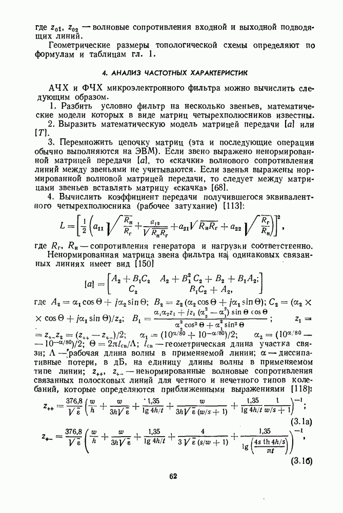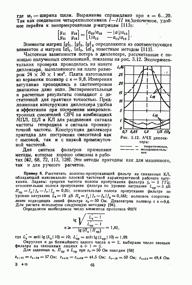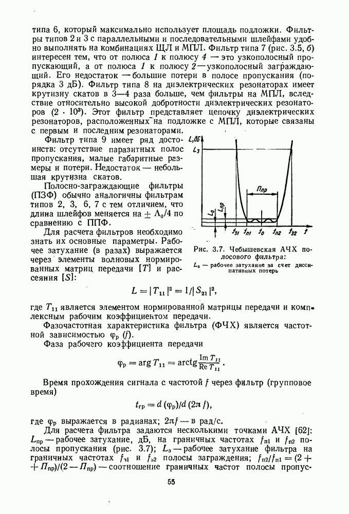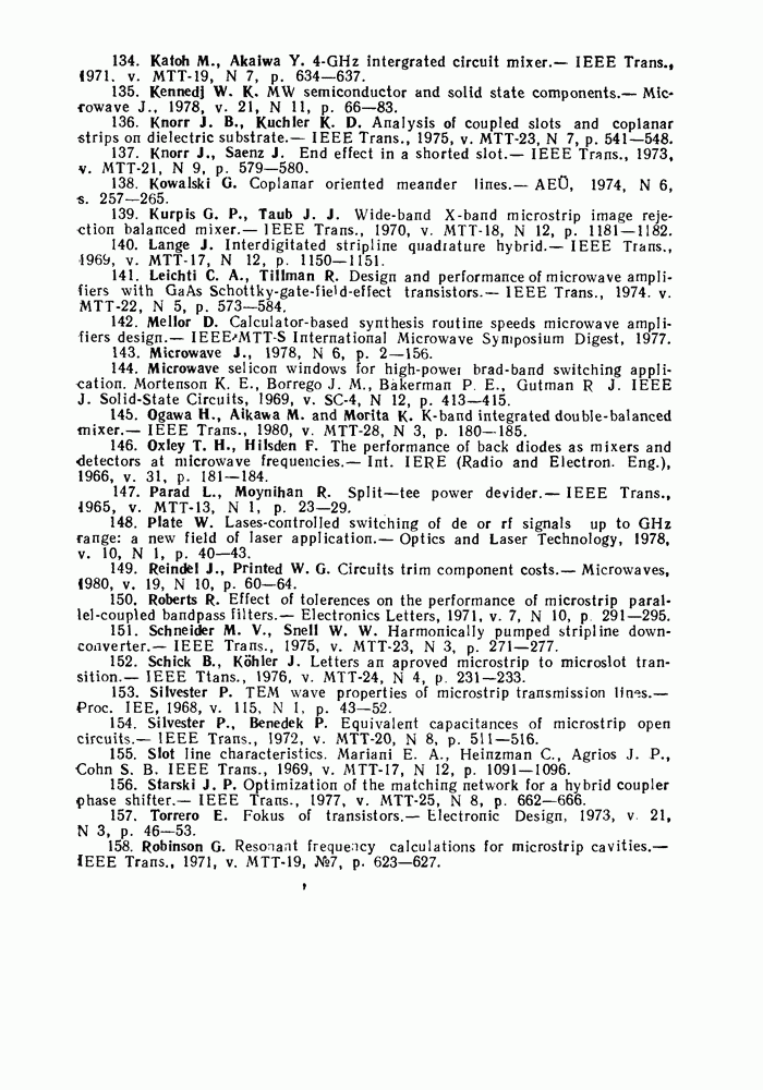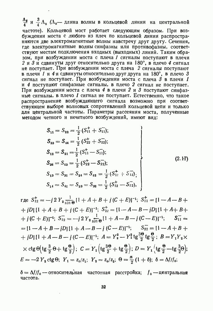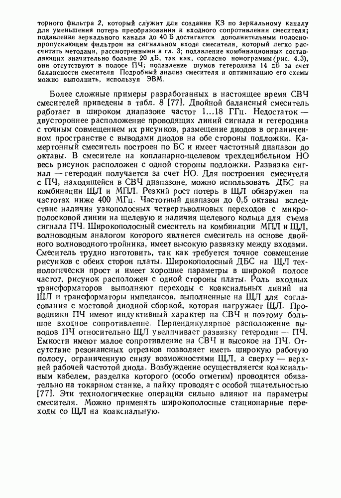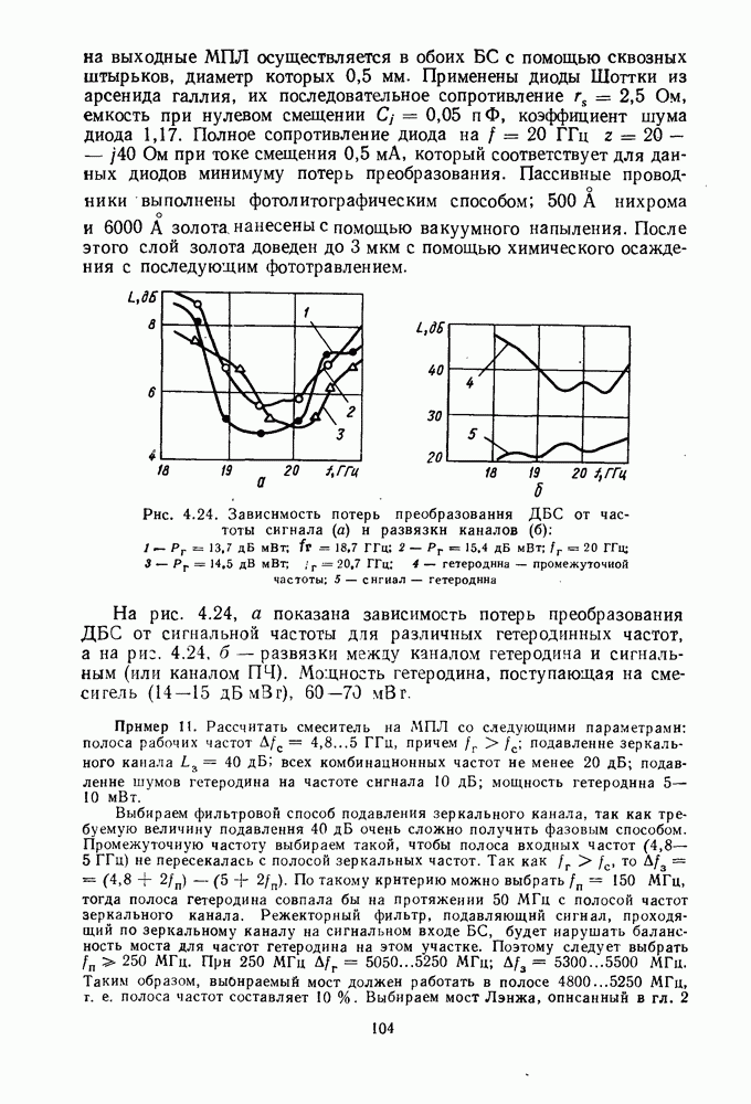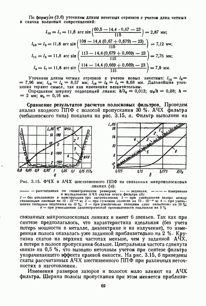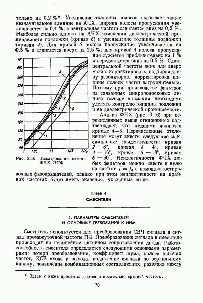 (кликните для просмотра скана) Делители, выполненные на мостах из сочлененных квадратов и симметричных кольцевых мостах, вследствие симметрии элементов не имеют разбросов амплитуд и фаз между каналами. На рис. 2.24 и 2.25 изображены частотные характеристики делителей на 16 каналов, построенных из мостов на сочлененных квадратах и на модифицированных кольцевых мостах. Таким образом, делители, выполненные на мостах из сочлененных квадратов, имеют малые диссипативные потери в узкой полосе частот. С увеличением полосы частот диссипативные потери существенно возрастают из-за рассеяния мощности в балластных резисторах. В делителях, выполненных на симметричных кольцевых мостах, диссипативные потери достигают 0,4 дБ в полосе частот 30 %. В делителях, построенных из двухканальных направленных делителей с точечными резисторами, диссипативных потерь за счет рассеяния мощности в балластных резисторах вообще нет [54], но с увеличением длин балластных резисторов потери увеличиваются и для делителя на 8 каналов составляют 0,3 дБ при длине резистора