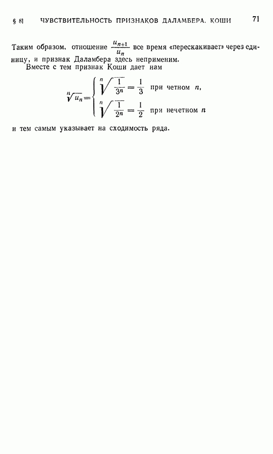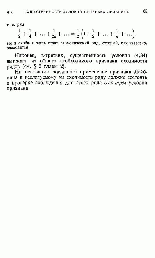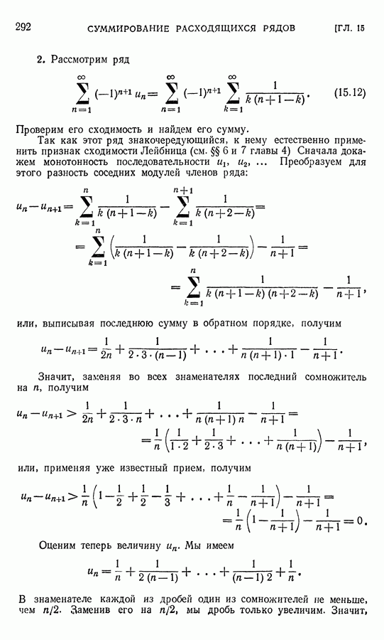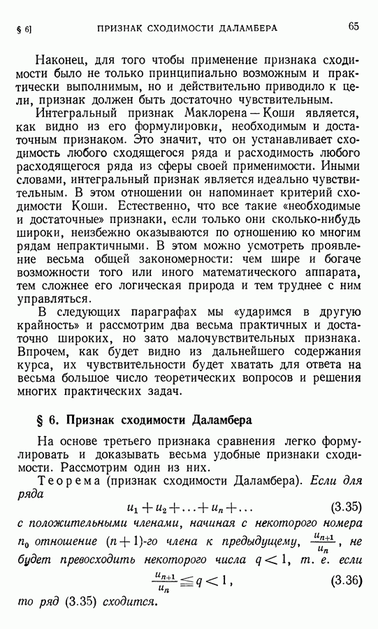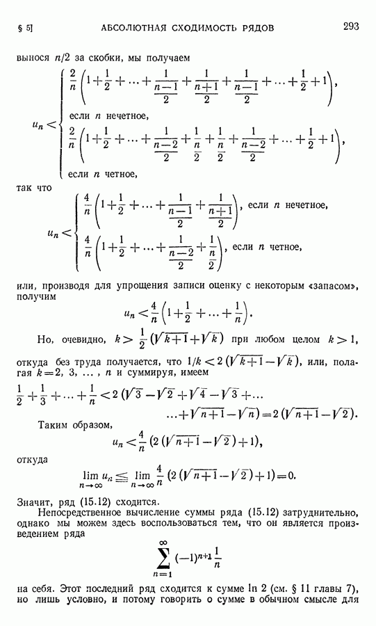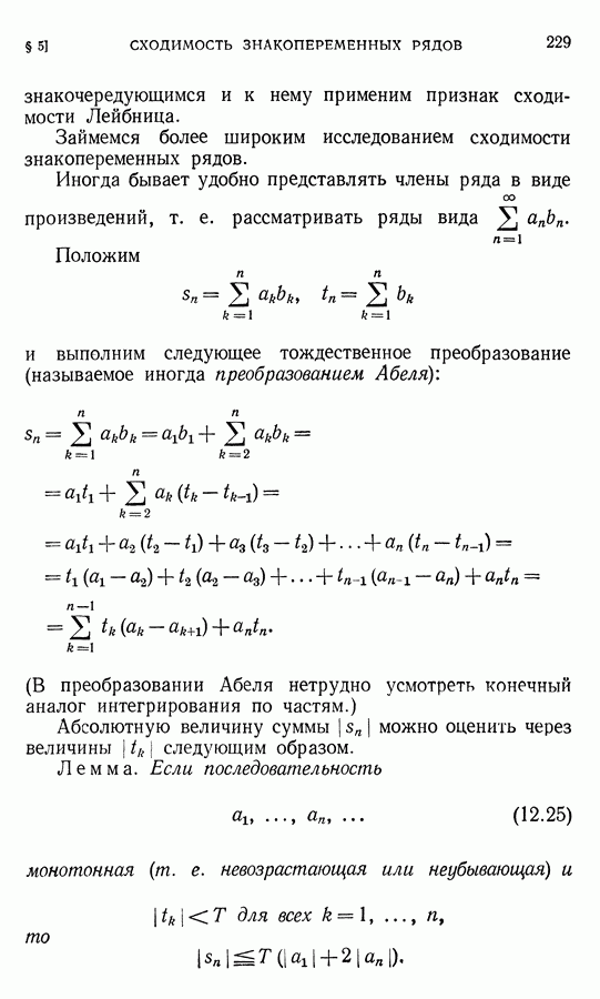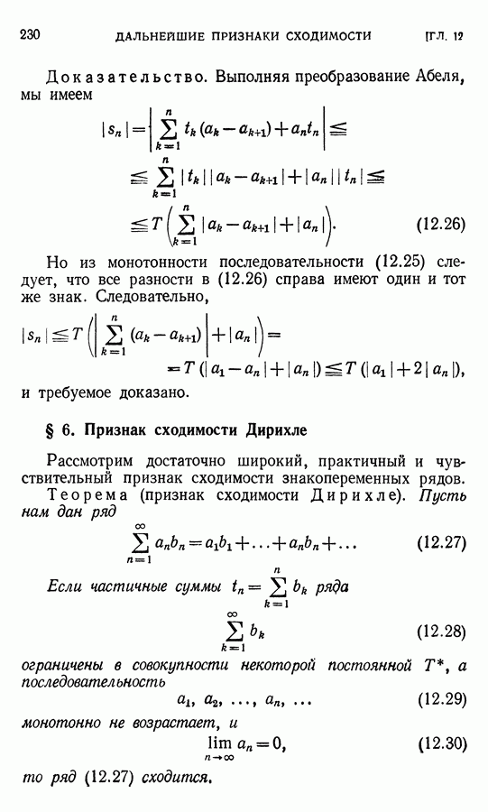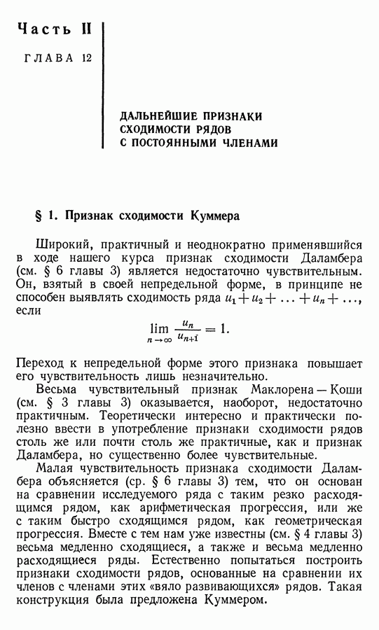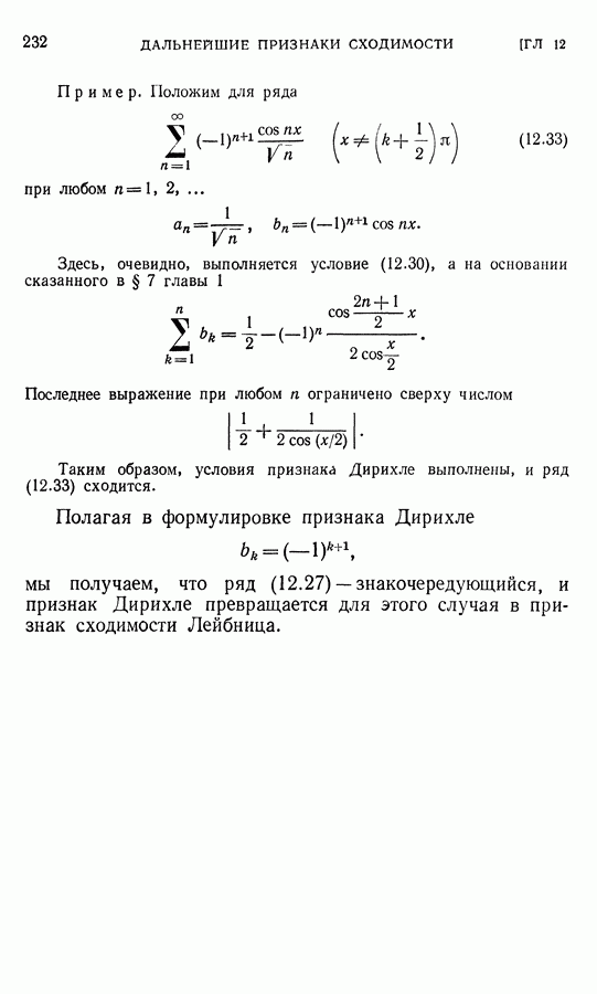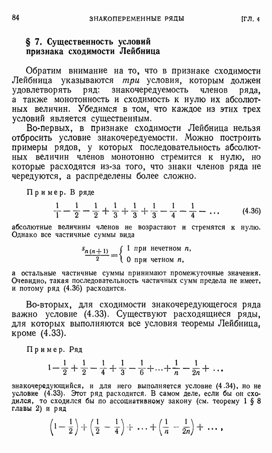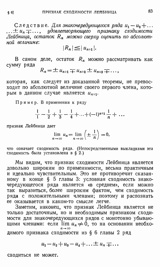 Мы видим, что признак сходимости Лейбница является довольно широким по применимости, весьма практичным и идеально чувствительным. Это не противоречит сказанному в конце § 5 главы 3: условная сходимость знакочередующегося ряда является «в среднем», если можно так выразиться, более широким фактом, чем сходимость ряда с положительными членами; поэтому и распознать ее оказывается в каком-то смысле легче.