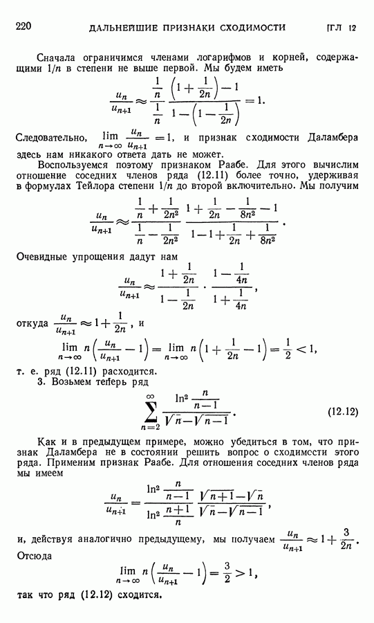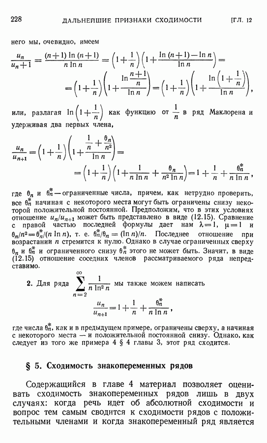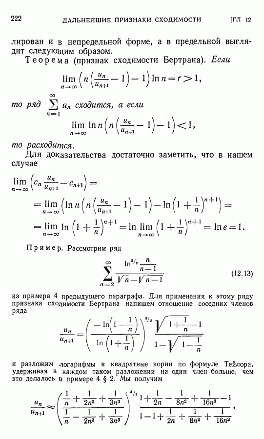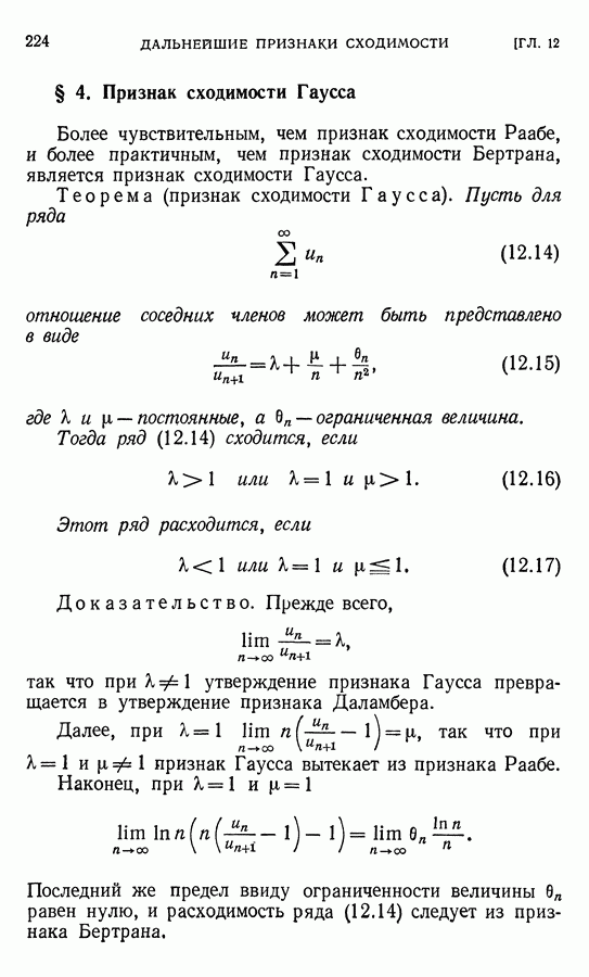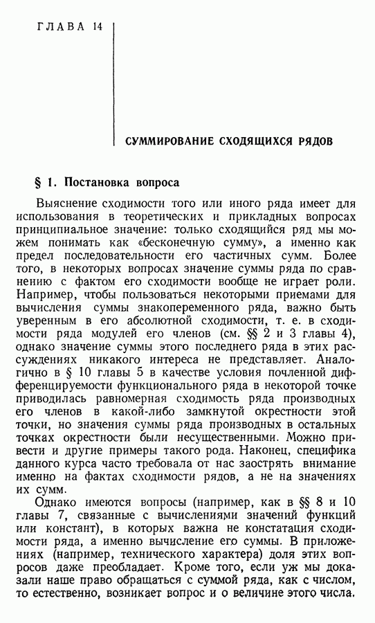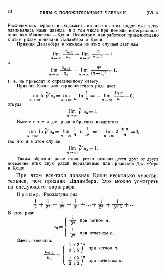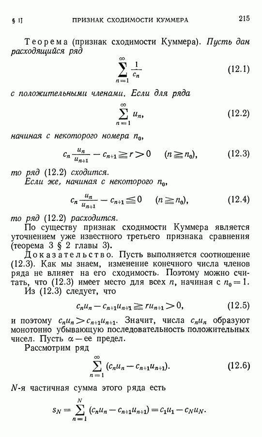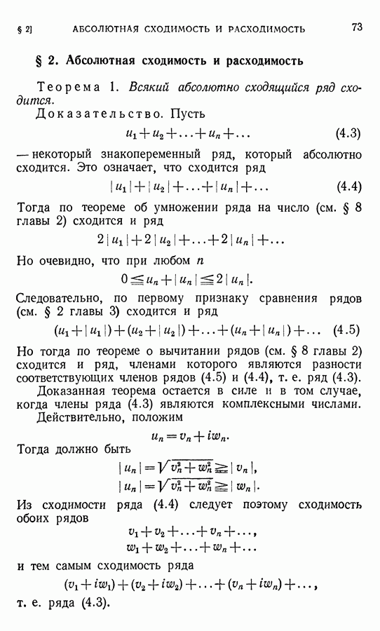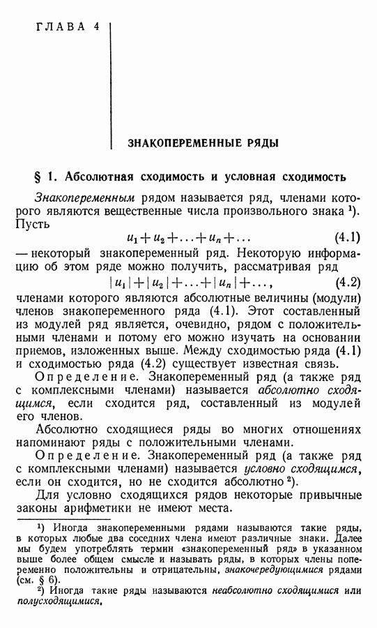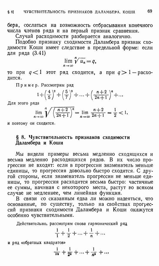 Мы видим, что признак сходимости Лейбница является довольно широким по применимости, весьма практичным и идеально чувствительным. Это не противоречит сказанному в конце § 5 главы 3: условная сходимость знакочередующегося ряда является «в среднем», если можно так выразиться, более широким фактом, чем сходимость ряда с положительными членами; поэтому и распознать ее оказывается в каком-то смысле легче.