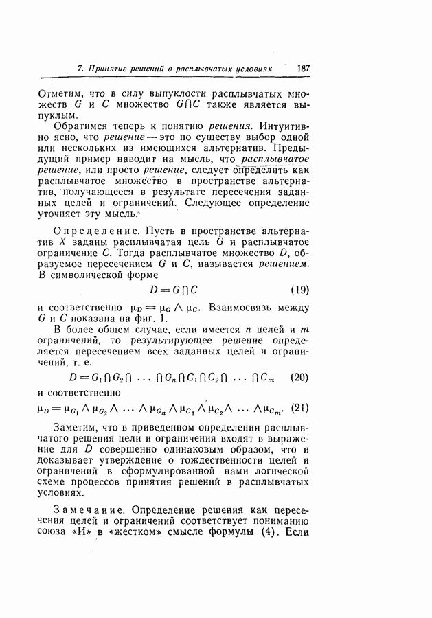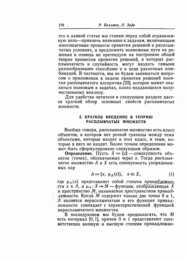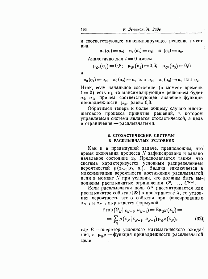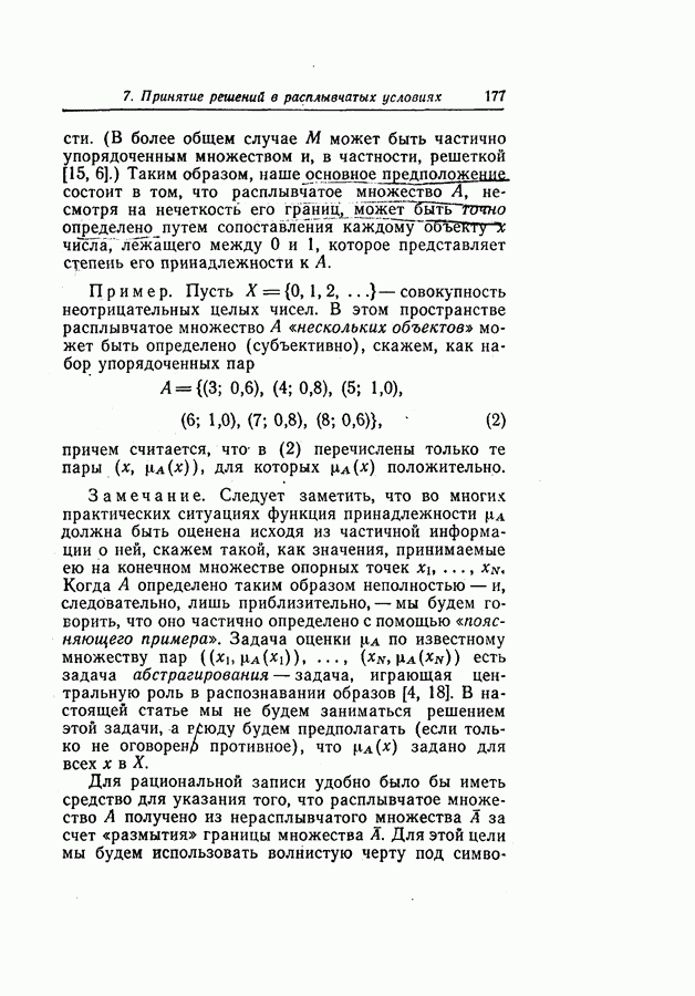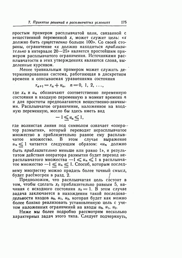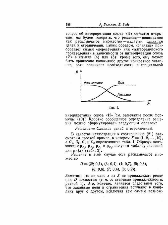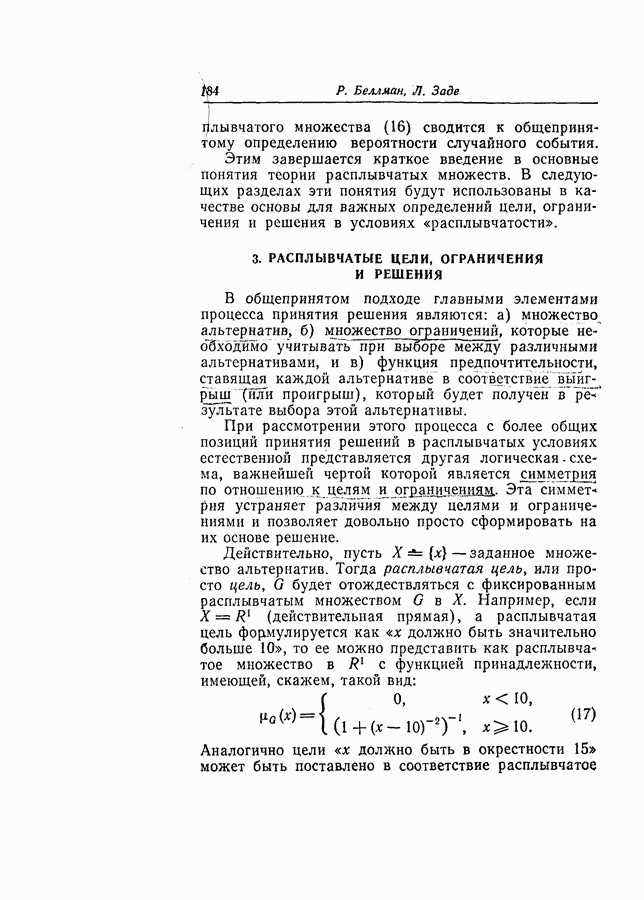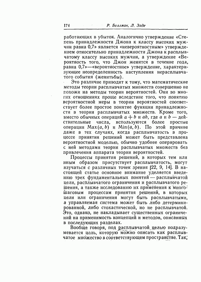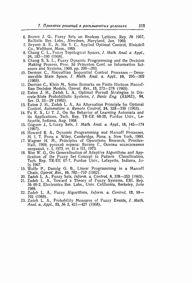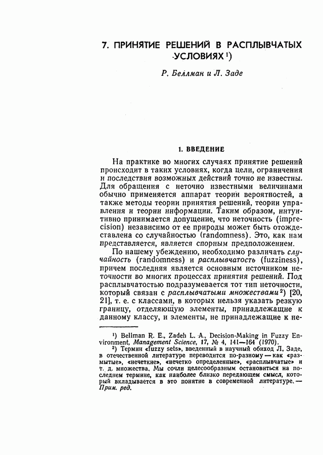 7. ЗАКЛЮЧЕНИЕСоздание общей теории принятия решений в расплывчатых условиях является чрезвычайно сложной и трудной задачей. Приведенные в настоящей статье результаты следует рассматривать лишь как первую попытку построения логической схемы такой теории. Многие аспекты теории принятия решений в расплывчатых условиях требуют более тщательного анализа. К ним относятся такие вопросы, как осуществление расплывчатых решений, способ объединения целей и ограничений в случае их неодинаковой важности или взаимозависимости, управление расплывчатыми системами и реализация расплывчатых алгоритмов, понятие расплывчатой обратной связи и ее влияние на принятие решений, управление системами, в расплывчатых условиях, частично определенных с помощью «поясняющего примера», и, наконец, принятие решений в смешанных условиях, в которых неточность является следствием как случайности, так и расплывчатости. ЛИТЕРАТУРА(см. скан) (см. скан)