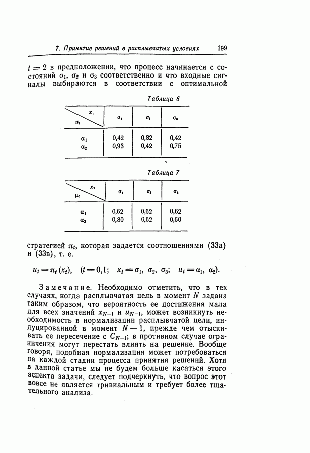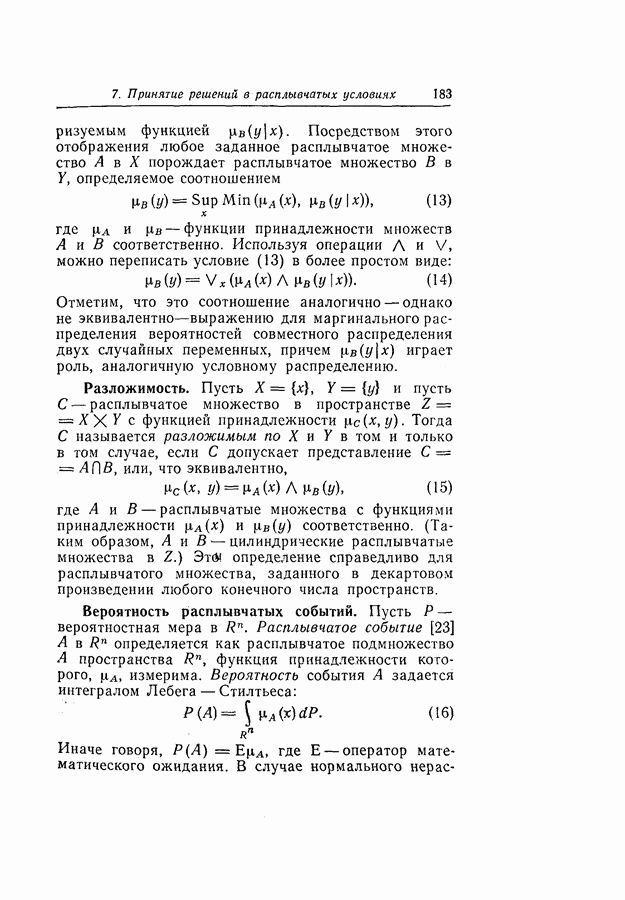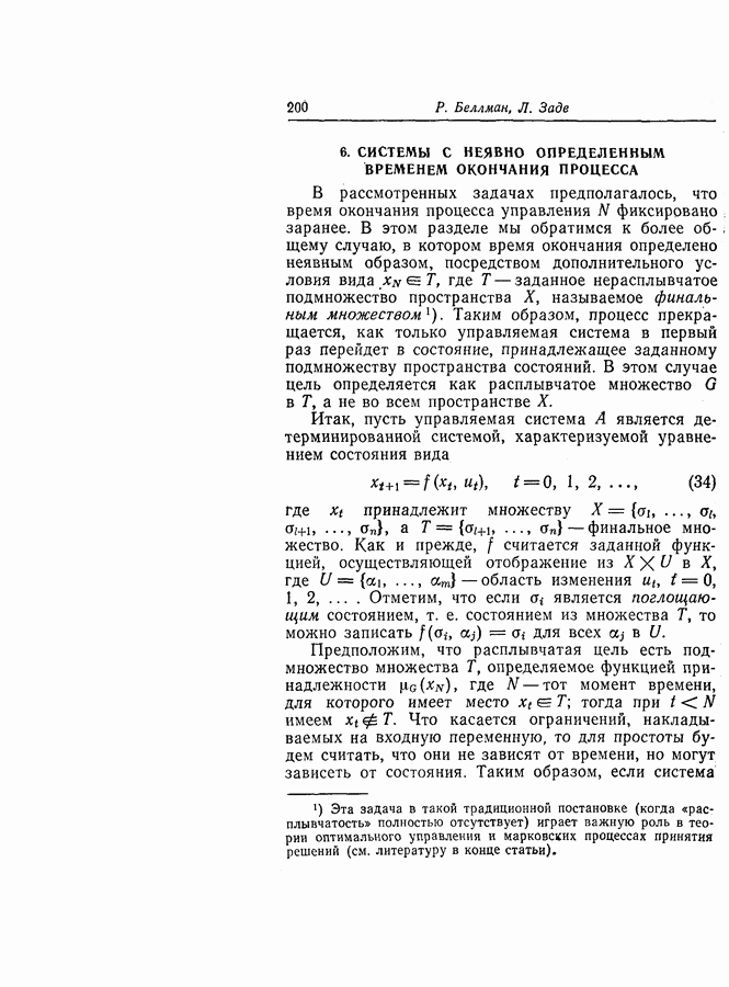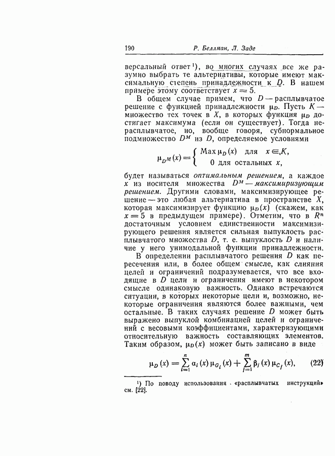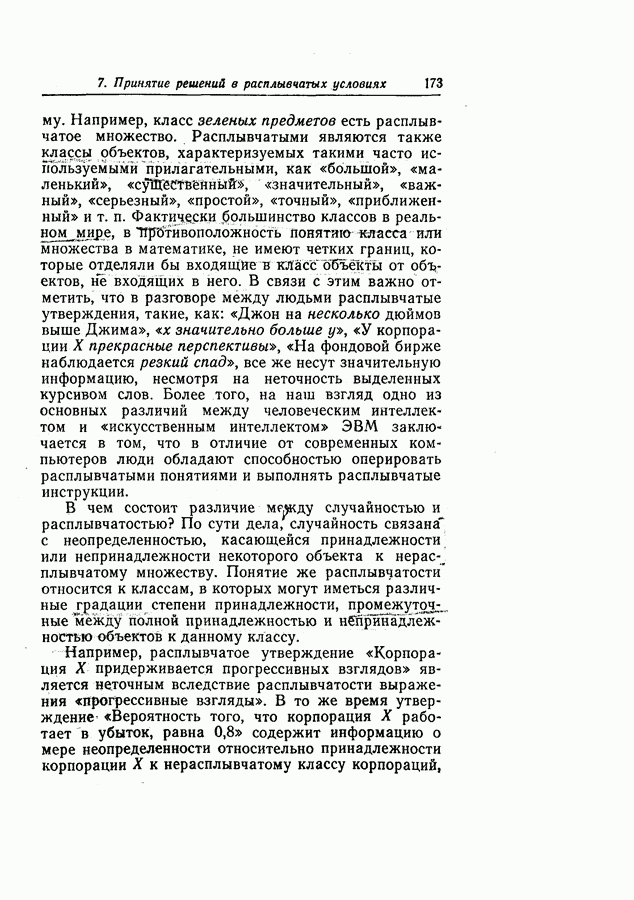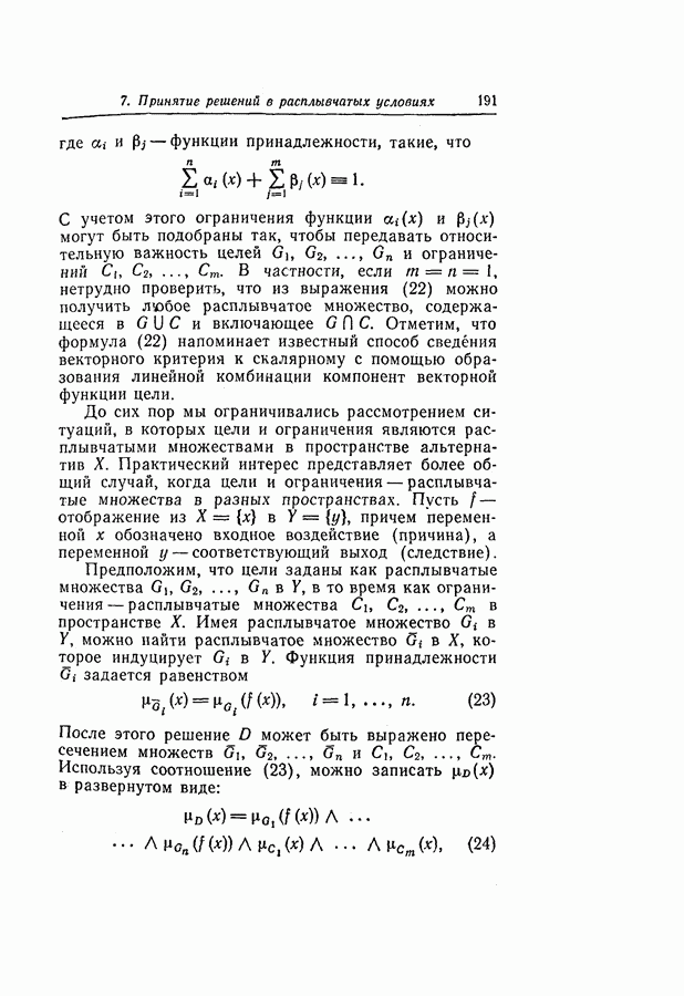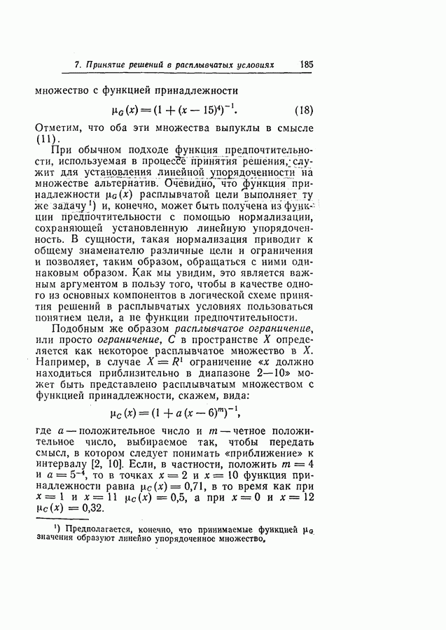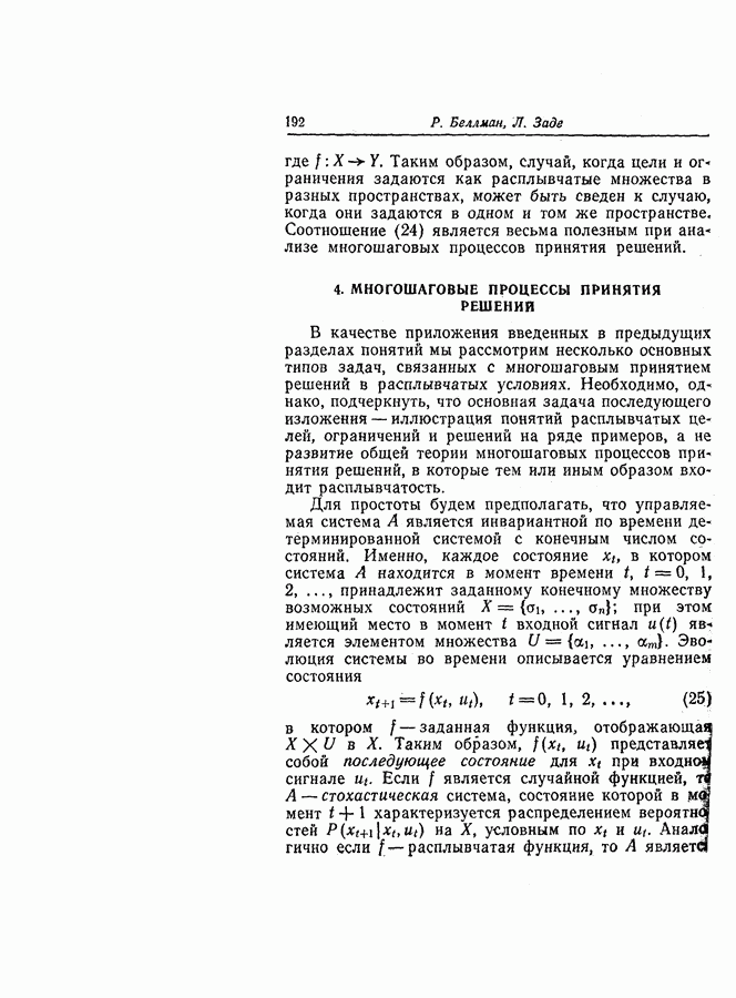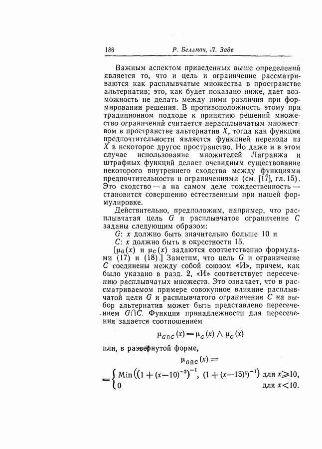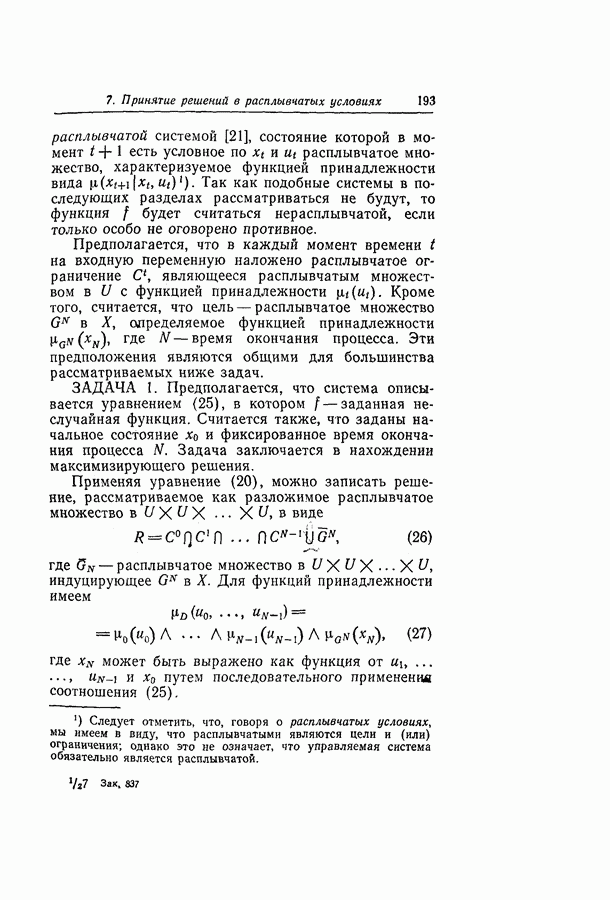7. ЗАКЛЮЧЕНИЕСоздание общей теории принятия решений в расплывчатых условиях является чрезвычайно сложной и трудной задачей. Приведенные в настоящей статье результаты следует рассматривать лишь как первую попытку построения логической схемы такой теории. Многие аспекты теории принятия решений в расплывчатых условиях требуют более тщательного анализа. К ним относятся такие вопросы, как осуществление расплывчатых решений, способ объединения целей и ограничений в случае их неодинаковой важности или взаимозависимости, управление расплывчатыми системами и реализация расплывчатых алгоритмов, понятие расплывчатой обратной связи и ее влияние на принятие решений, управление системами, в расплывчатых условиях, частично определенных с помощью «поясняющего примера», и, наконец, принятие решений в смешанных условиях, в которых неточность является следствием как случайности, так и расплывчатости. ЛИТЕРАТУРА(см. скан) (см. скан)