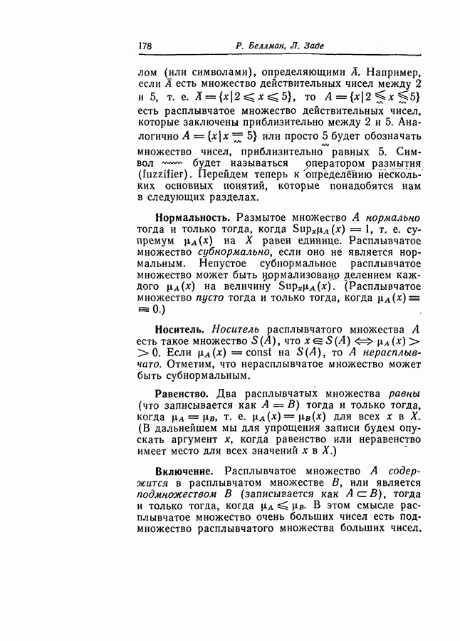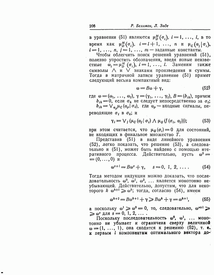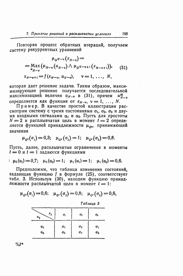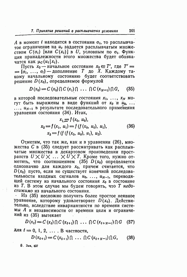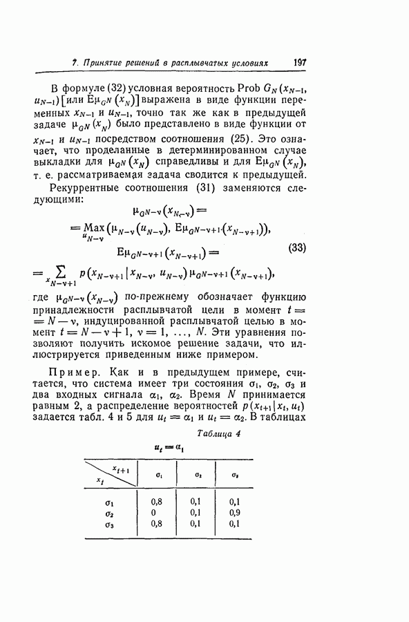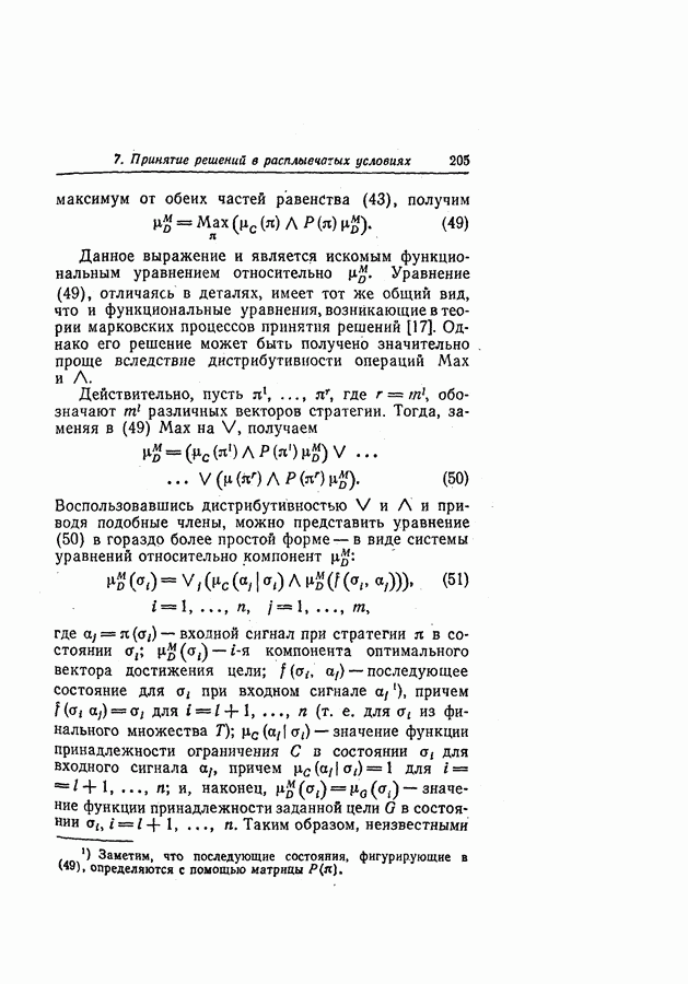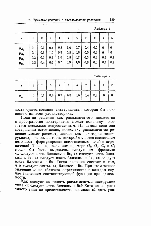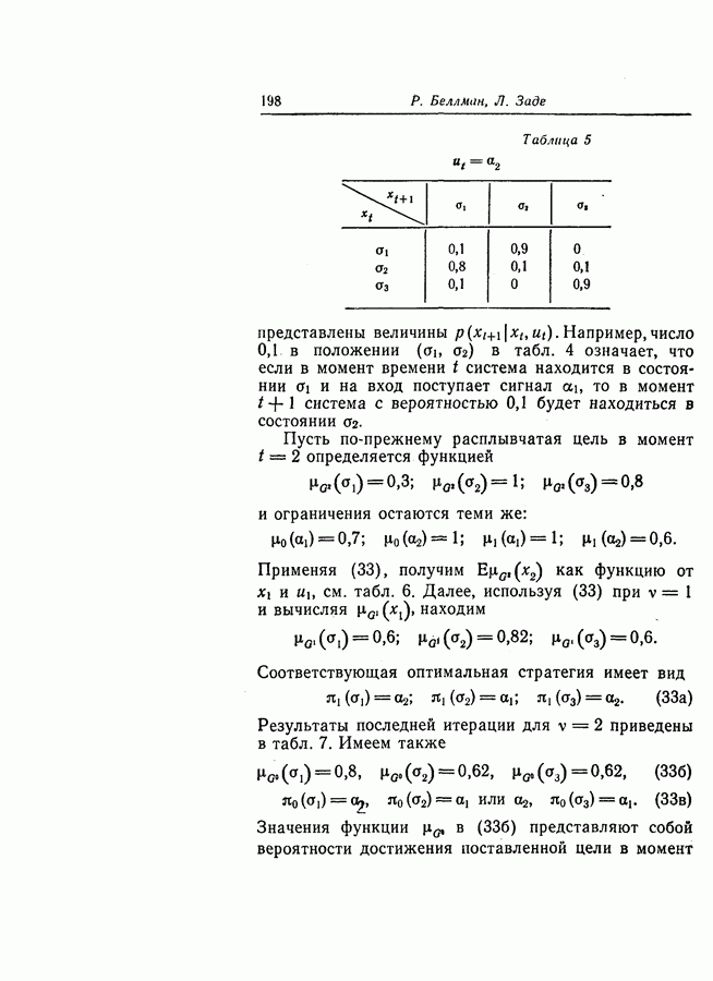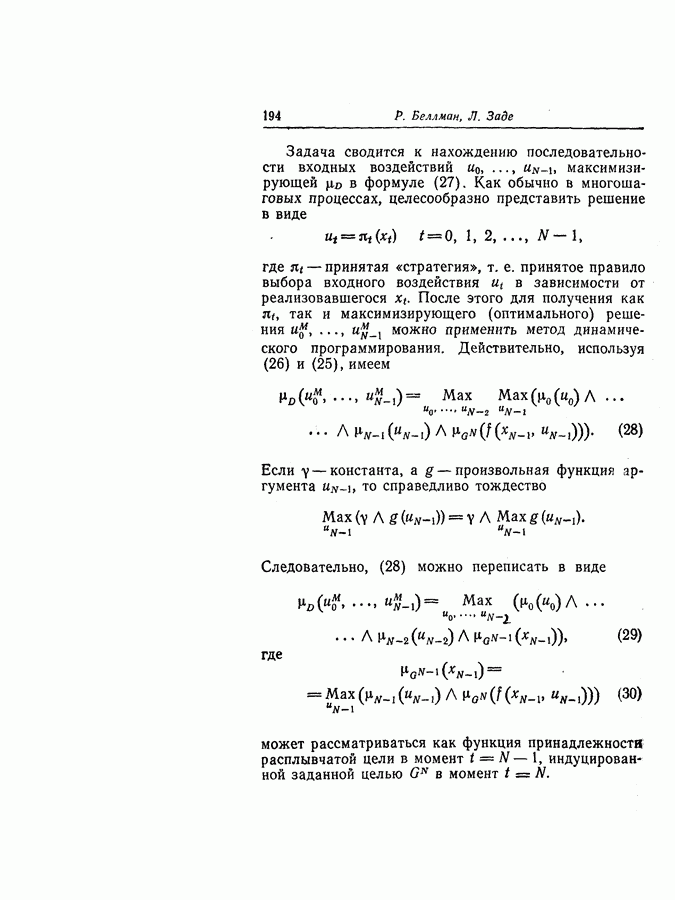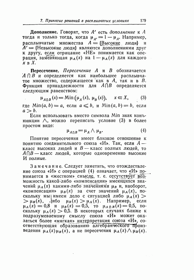 7. ЗАКЛЮЧЕНИЕСоздание общей теории принятия решений в расплывчатых условиях является чрезвычайно сложной и трудной задачей. Приведенные в настоящей статье результаты следует рассматривать лишь как первую попытку построения логической схемы такой теории. Многие аспекты теории принятия решений в расплывчатых условиях требуют более тщательного анализа. К ним относятся такие вопросы, как осуществление расплывчатых решений, способ объединения целей и ограничений в случае их неодинаковой важности или взаимозависимости, управление расплывчатыми системами и реализация расплывчатых алгоритмов, понятие расплывчатой обратной связи и ее влияние на принятие решений, управление системами, в расплывчатых условиях, частично определенных с помощью «поясняющего примера», и, наконец, принятие решений в смешанных условиях, в которых неточность является следствием как случайности, так и расплывчатости. ЛИТЕРАТУРА(см. скан) (см. скан)