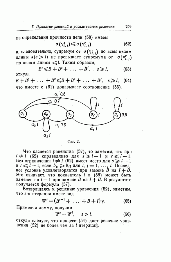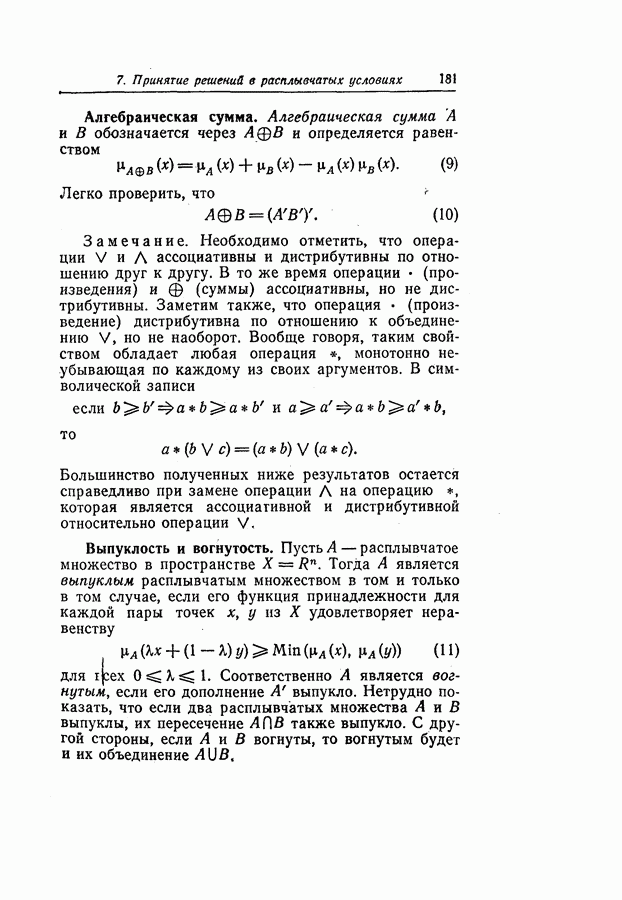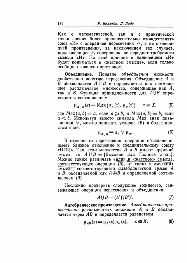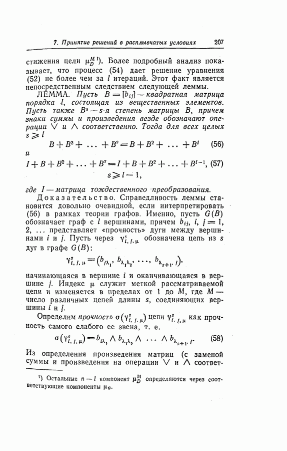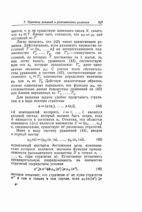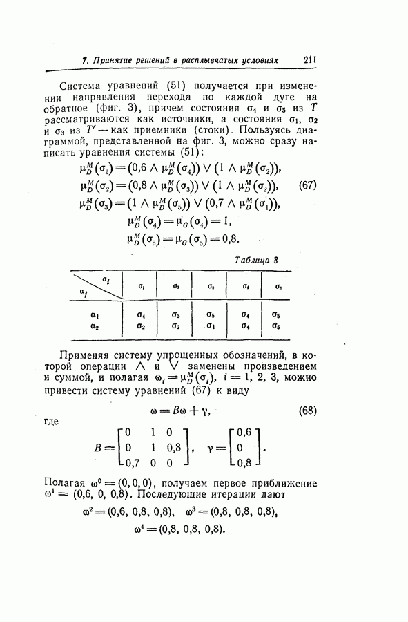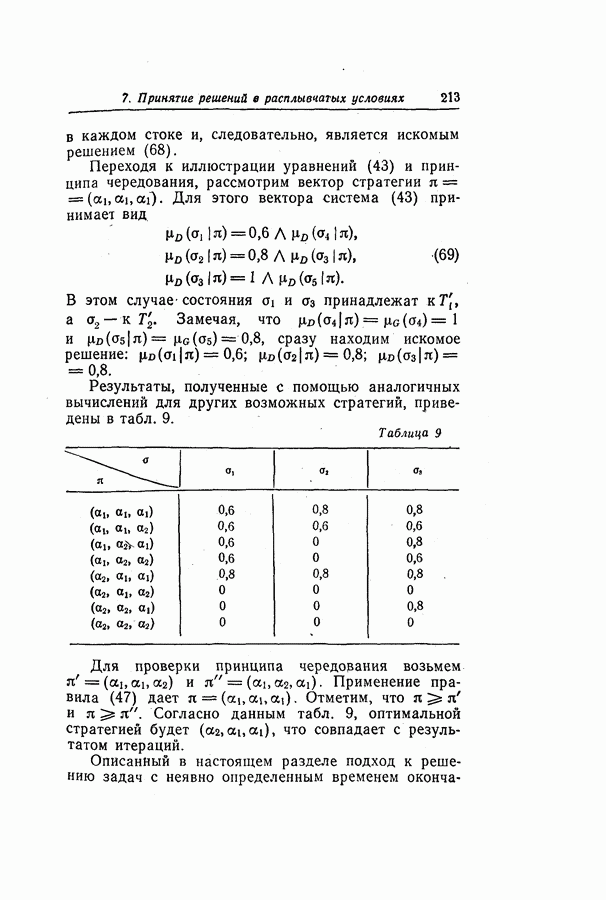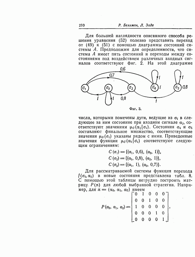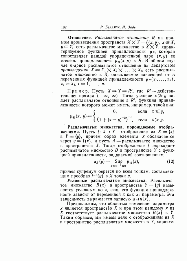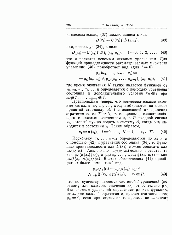 7. ЗАКЛЮЧЕНИЕСоздание общей теории принятия решений в расплывчатых условиях является чрезвычайно сложной и трудной задачей. Приведенные в настоящей статье результаты следует рассматривать лишь как первую попытку построения логической схемы такой теории. Многие аспекты теории принятия решений в расплывчатых условиях требуют более тщательного анализа. К ним относятся такие вопросы, как осуществление расплывчатых решений, способ объединения целей и ограничений в случае их неодинаковой важности или взаимозависимости, управление расплывчатыми системами и реализация расплывчатых алгоритмов, понятие расплывчатой обратной связи и ее влияние на принятие решений, управление системами, в расплывчатых условиях, частично определенных с помощью «поясняющего примера», и, наконец, принятие решений в смешанных условиях, в которых неточность является следствием как случайности, так и расплывчатости. ЛИТЕРАТУРА(см. скан) (см. скан)
