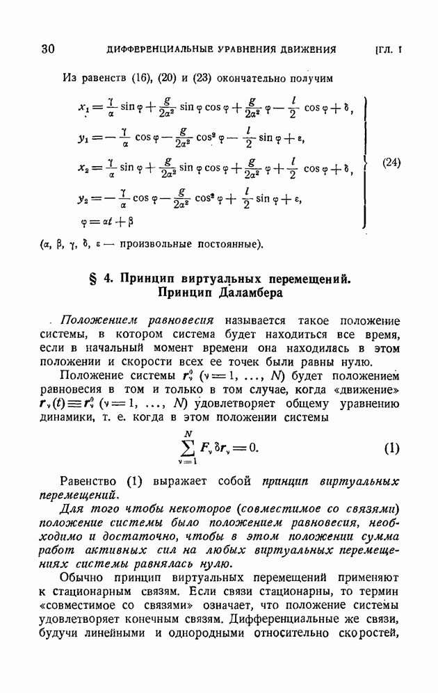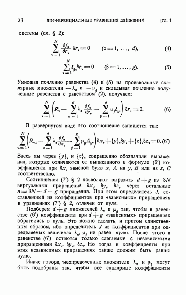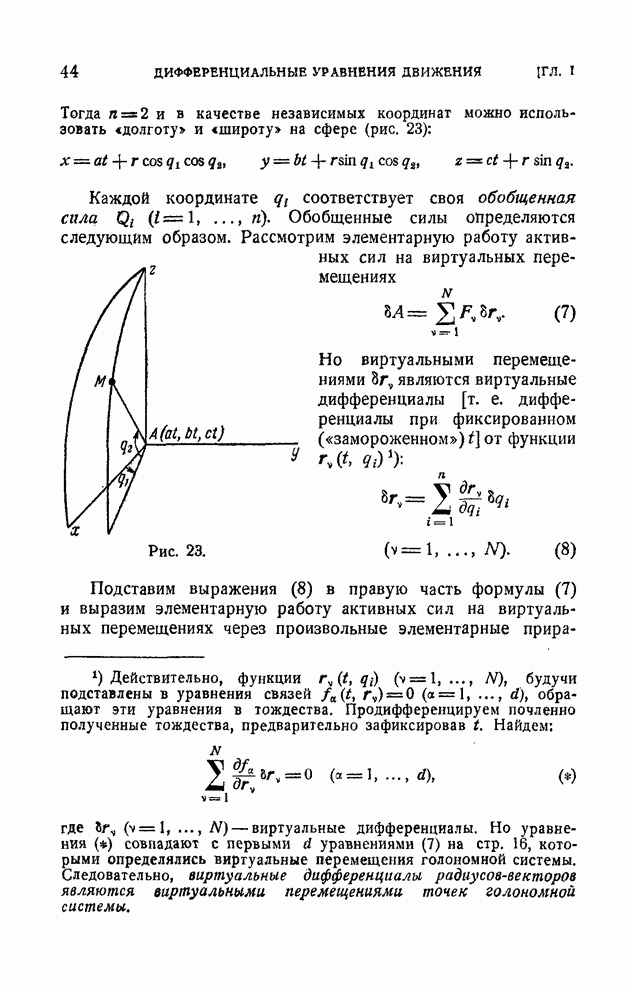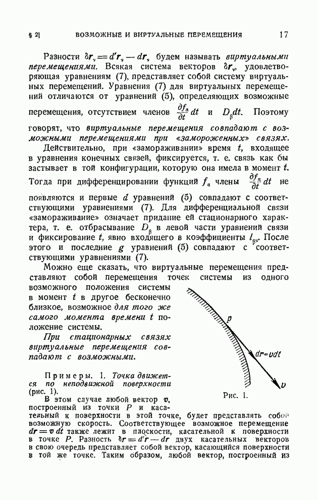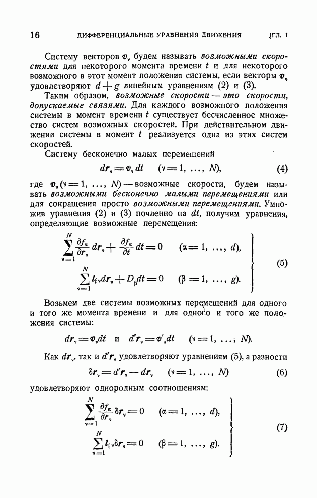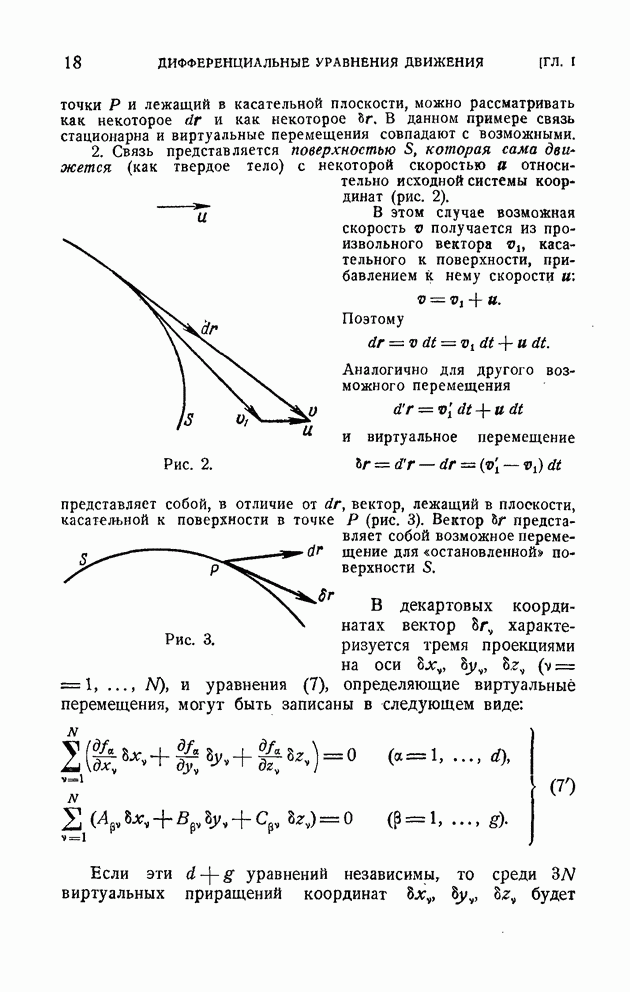 Здесь При наличии конечной связи вида (2) система не может в каждый данный момент времени занимать произвольное положение в пространстве. Конечная связь накладывает ограничения на возможные положения системы в момент времени Каждая конечная связь вида (2) влечет за собой как следствие дифференциальную связь, уравнение которой получается почленным дифференцированием равенства (2):