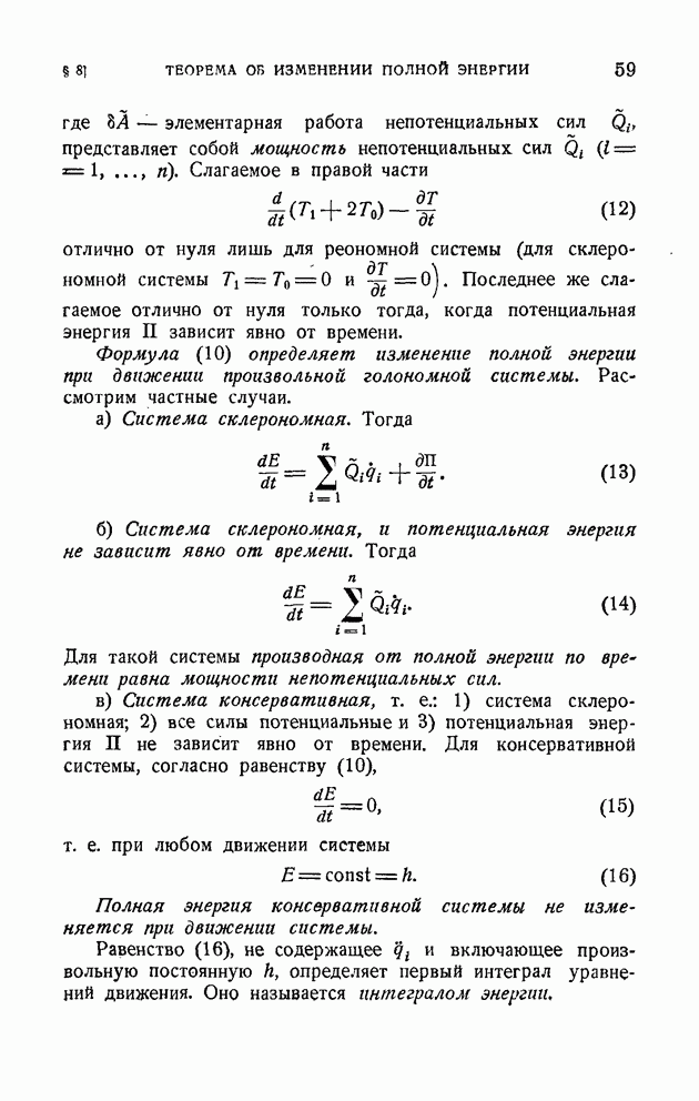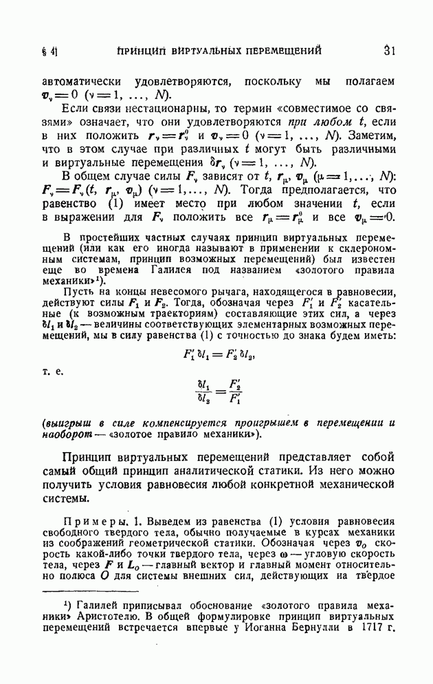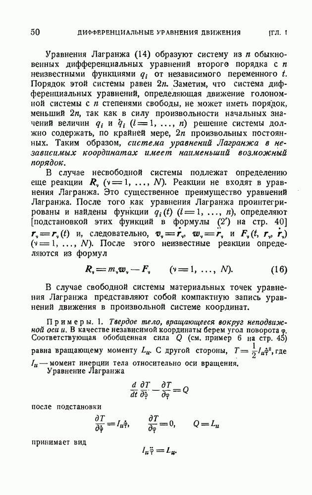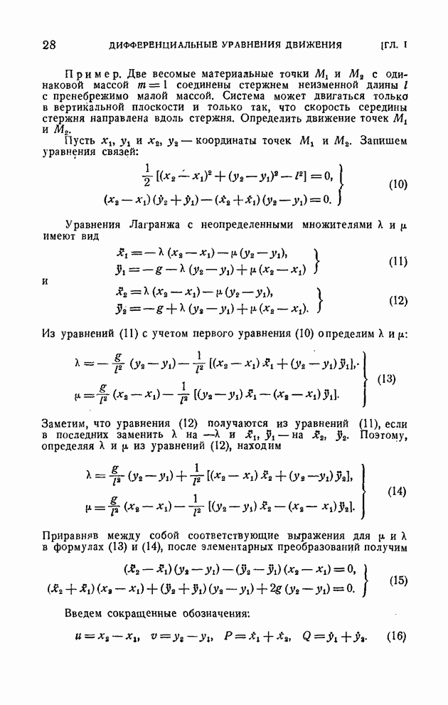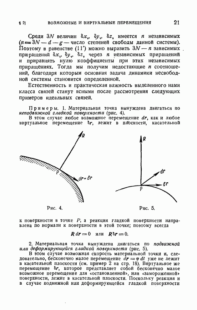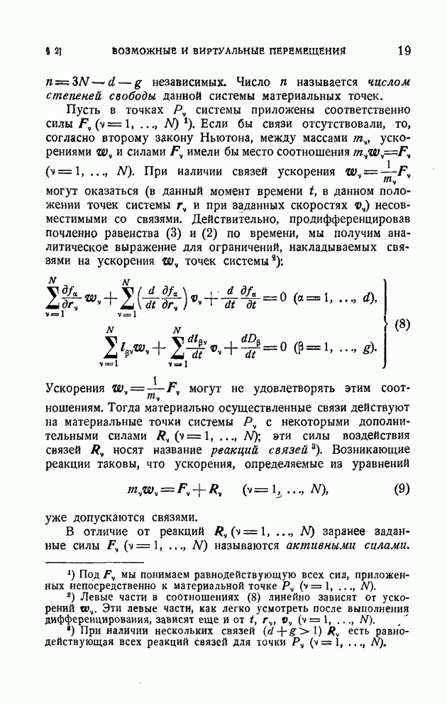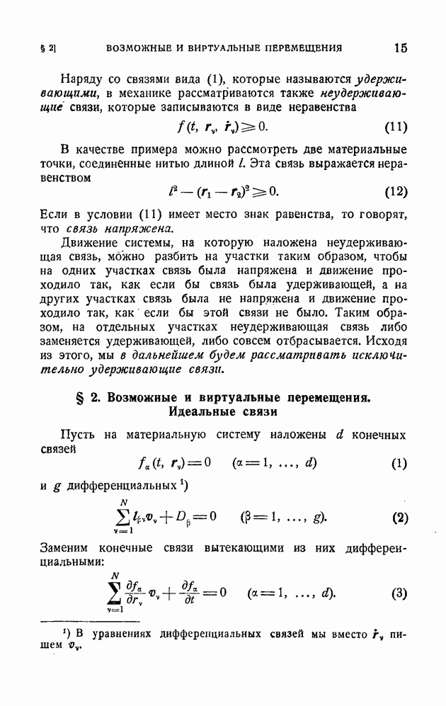 Если в условии (11) имеет место знак равенства, то говорят, что связь напряжена. Движение системы, на которую наложена неудерживающая связь, можно разбить на участки таким образом, чтобы на одних участках связь была напряжена и движение проходило так, как если бы связь была удерживающей, а на других участках связь была не напряжена и движение проходило так, как если бы этой связи не было. Таким образом, на отдельных участках неудерживающая связь либо заменяется удерживающей, либо совсем отбрасывается. Исходя из этого, мы в дальнейшем будем рассматривать исключительно удерживающие связи.