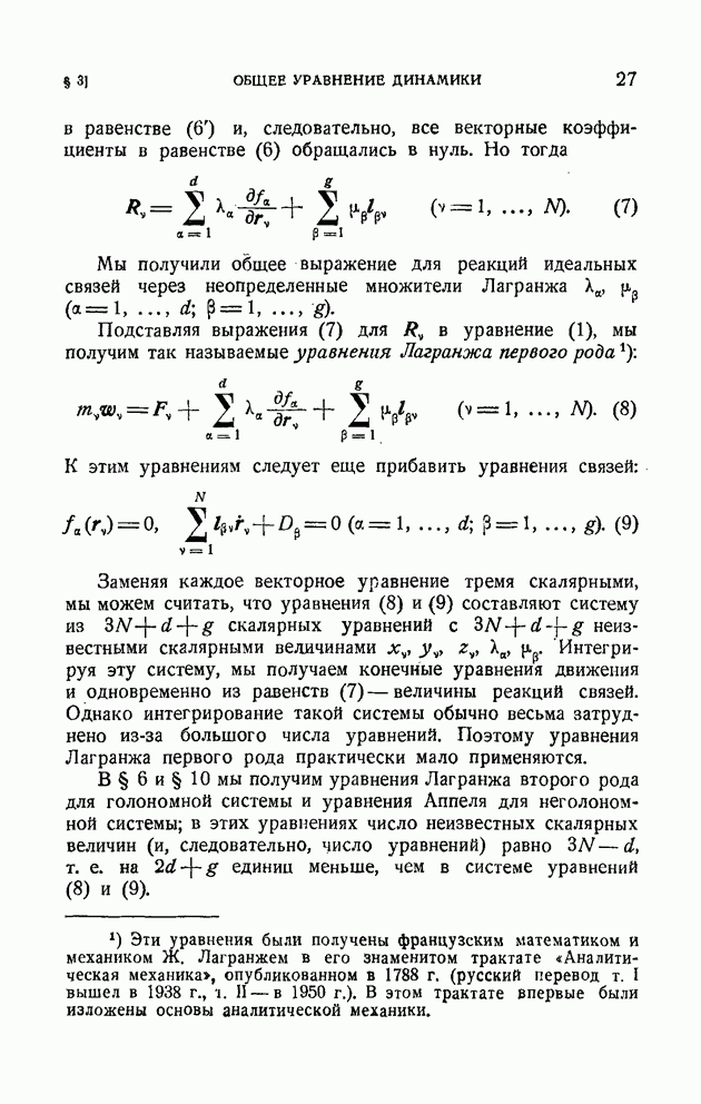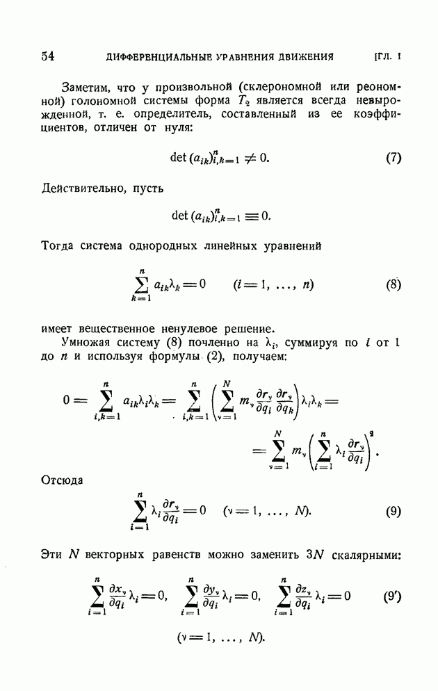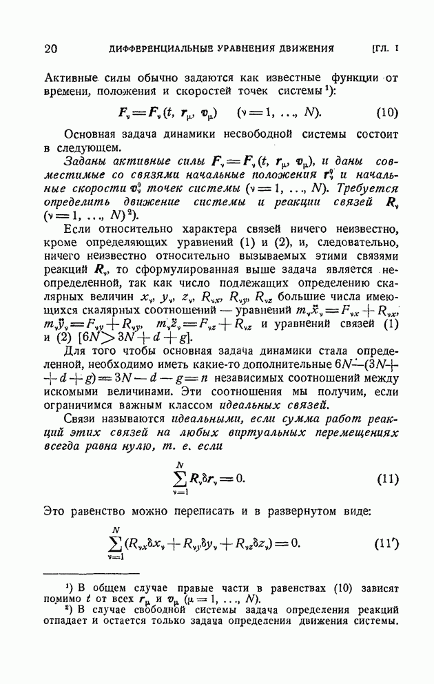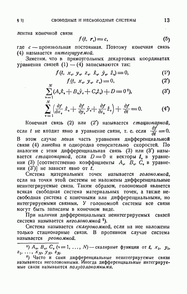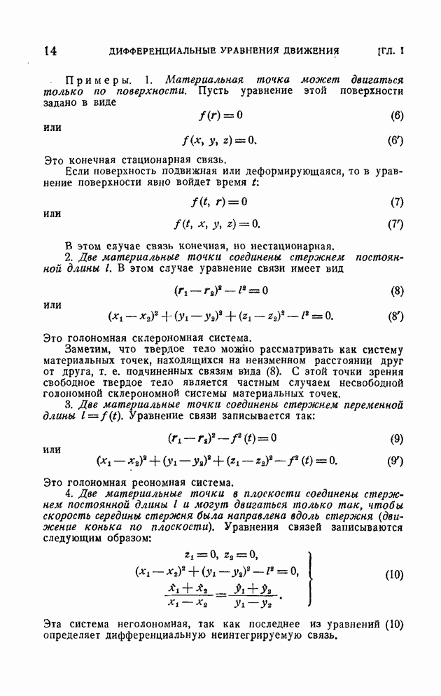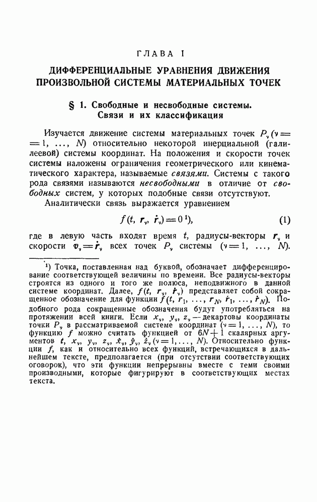 ГЛАВА I. ДИФФЕРЕНЦИАЛЬНЫЕ УРАВНЕНИЯ ДВИЖЕНИЯ ПРОИЗВОЛЬНОЙ СИСТЕМЫ МАТЕРИАЛЬНЫХ ТОЧЕК§ 1. Свободные и несвободные системы. Связи и их классификацияИзучается движение системы материальных точек Аналитически связь выражается уравнением