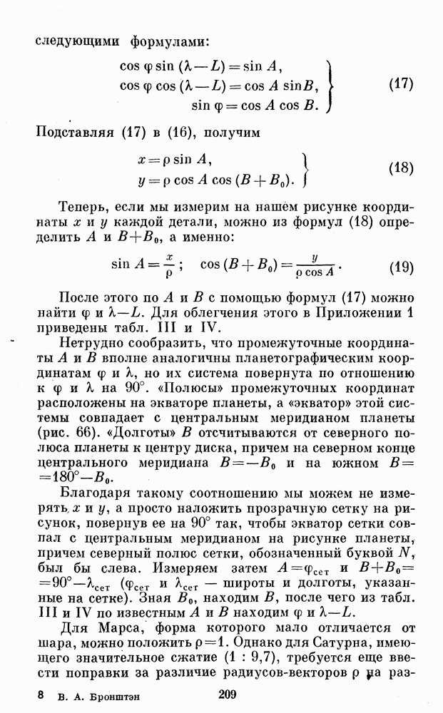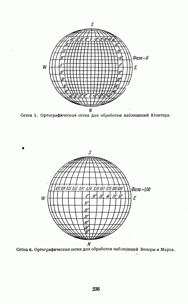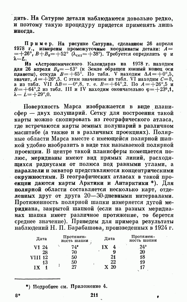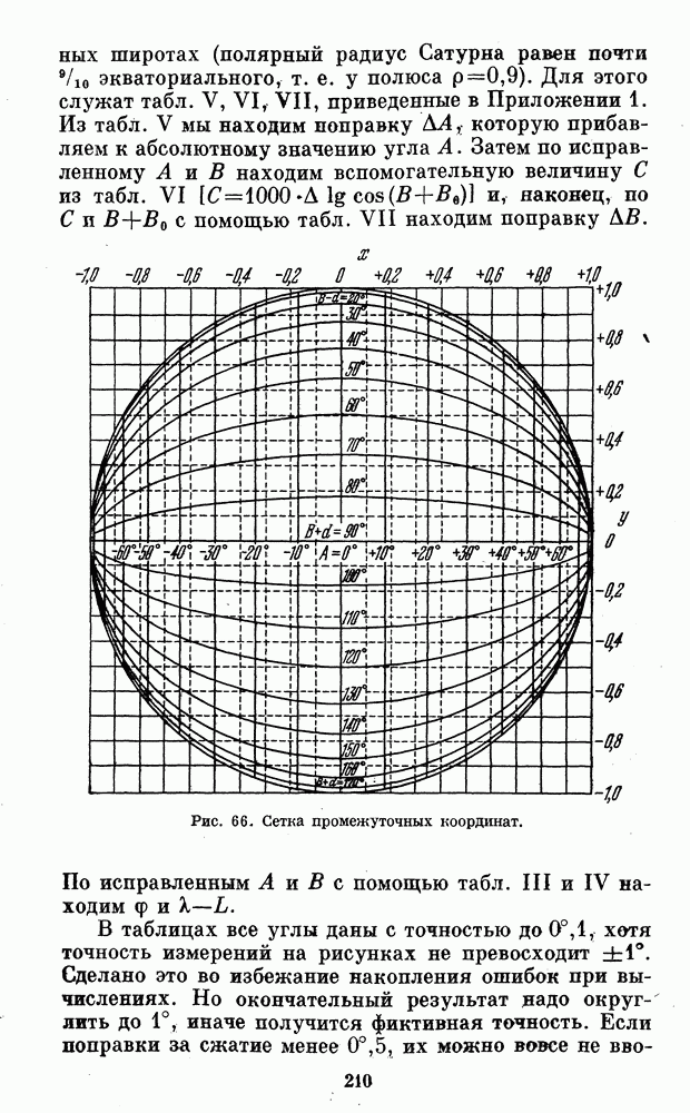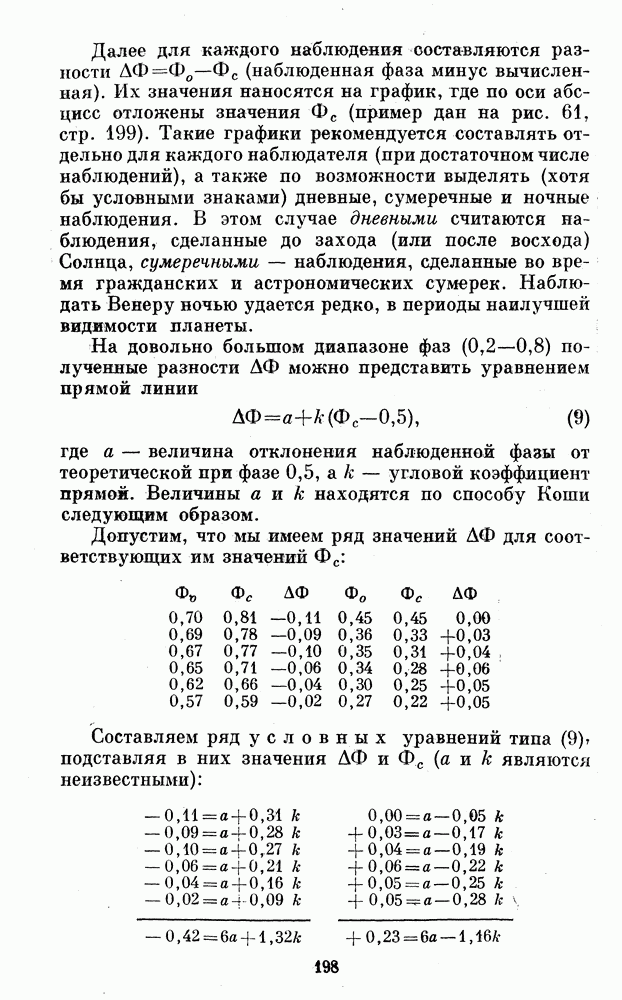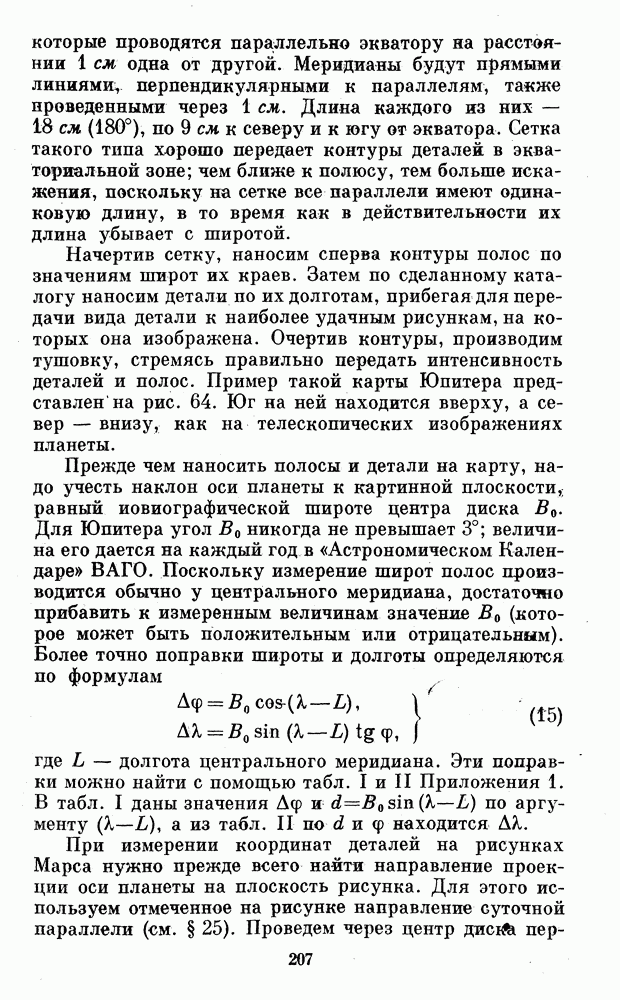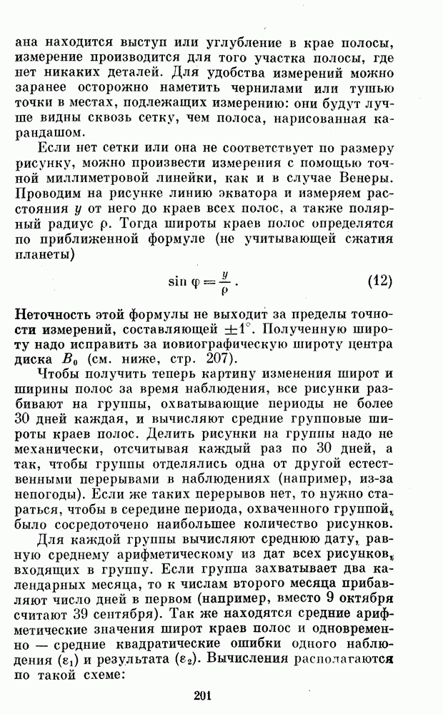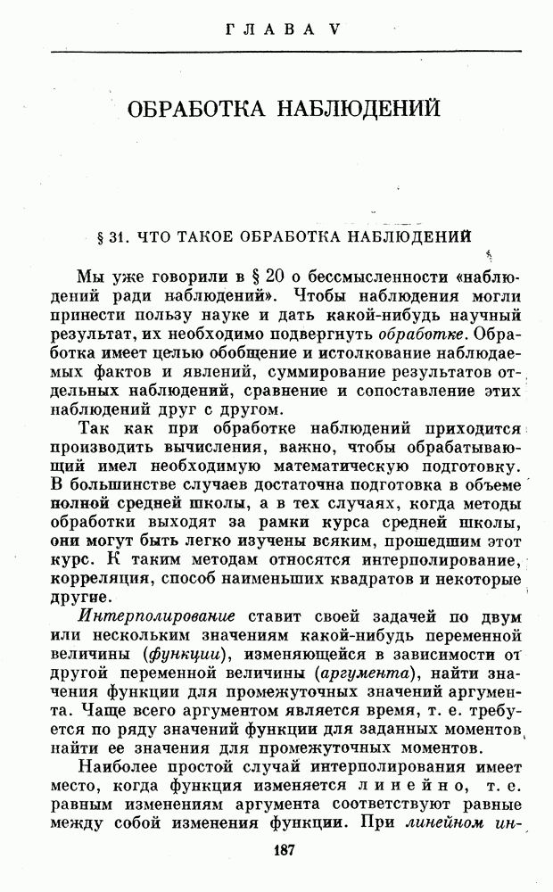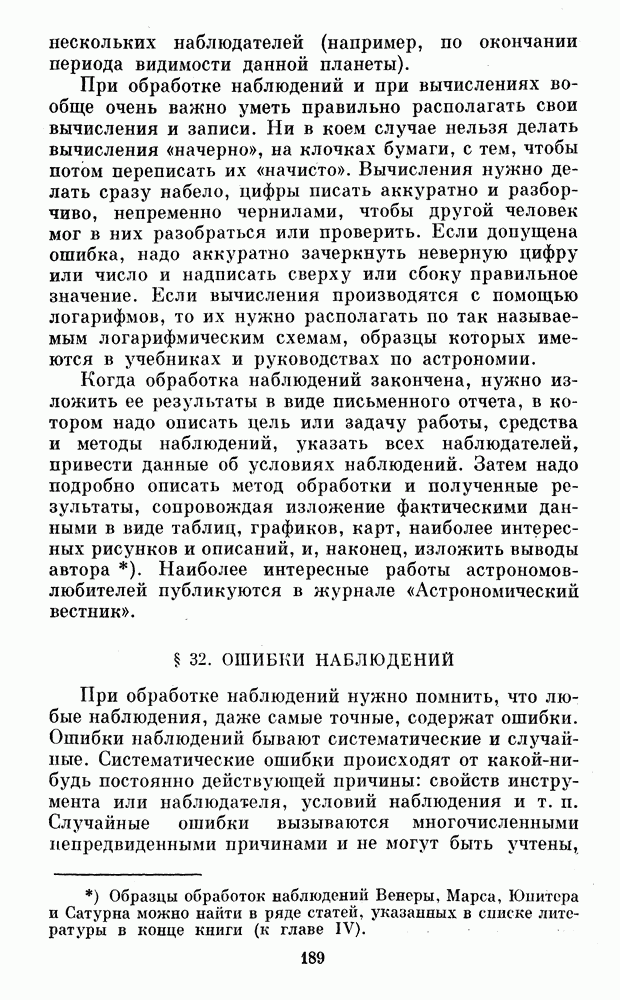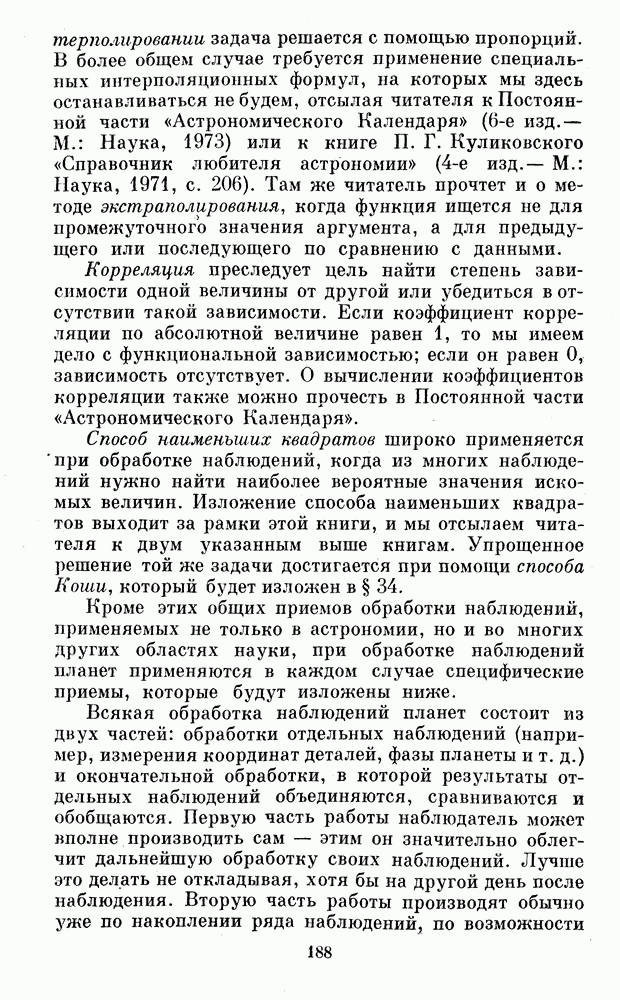 ГЛАВА V. ОБРАБОТКА НАБЛЮДЕНИЙ§ 31. ЧТО ТАКОЕ ОБРАБОТКА НАБЛЮДЕНИЙМы уже говорили в § 20 о бессмысленности «наблюдений ради наблюдений». Чтобы наблюдения могли принести пользу науке и дать какой-нибудь научный результат, их необходимо подвергнуть обработке. Обработка имеет целью обобщение и истолкование наблюдаемых фактов и явлений, суммирование результатов отдельных наблюдений, сравнение и сопоставление этих наблюдений друг с другом. Так как при обработке наблюдений приходится производить вычисления, важно, чтобы обрабатывающий имел необходимую математическую подготовку. В большинстве случаев достаточна подготовка в объеме полной средней школы, а в тех случаях, когда методы обработки выходят за рамки курса средней школы, они могут быть легко изучены всяким, прошедшим этот курс. К таким методам относятся интерполирование, корреляция, способ наименьших квадратов и некоторые другие. Интерполирование ставит своей задачей по двум или нескольким значениям какой-нибудь переменной величины (функции), изменяющейся в зависимости от другой переменной величины (аргумента), найти значения функции для промежуточных значений аргумента. Чаще всего аргументом является время, т. е. требуется по ряду значений функции для заданных моментов t найти ее значения для промежуточных моментов. Наиболее простой случай интерполирования имеет место, когда функция изменяется линейно, т.е. равным изменениям аргумента соответствуют равные между собой изменения функции. П При линейном интерполировании задача решается с помощью пропорций. В более общем случае требуется применение специальных интерполяционных формул, на которых мы здесь останавливаться не будем, отсылая читателя к Постоянной части «Астрономического Календаря» (6-е изд.- М.: Наука, 1973) или к книге П. Г. Куликовского «Справочник любителя астрономии» (4-е изд.- М.: Наука, 1971, с. 206). Там же читатель прочтет и о методе экстраполирования, когда функция ищется не для промежуточного значения аргумента, а для предыдущего или последующего по сравнению с данными. Корреляция преследует цель найти степень зависимости одной величины от другой или убедиться в отсутствии такой зависимости. Если коэффициент корреляции по абсолютной величине равен 1, то мы имеем дело с функциональной зависимостью; если он равен 0, зависимость отсутствует. О вычислении коэффициентов корреляции также можно прочесть в Постоянной части «Астрономического Календаря». Способ наименьших квадратов широко применяется при обработке наблюдений, когда из многих наблюдений нужно найти наиболее вероятные значения искомых величин. Изложение способа наименьших квадратов выходит за рамки этой книги, и мы отсылаем читателя к двум указанным выше книгам. Упрощенное решение той же задачи достигается при помощи способа Коши, который будет изложен в § 34. Кроме этих общих приемов обработки наблюдений, применяемых не только в астрономии, но и во многих других областях науки, при обработке наблюдений планет применяются в каждом случае специфические приемы, которые будут изложены ниже. Всякая обработка наблюдений планет состоит из двух частей: обработки отдельных наблюдений (например, измерения координат деталей, фазы планеты и т. д.) и окончательной обработки, в которой результаты отдельных наблюдений объединяются, сравниваются и обо