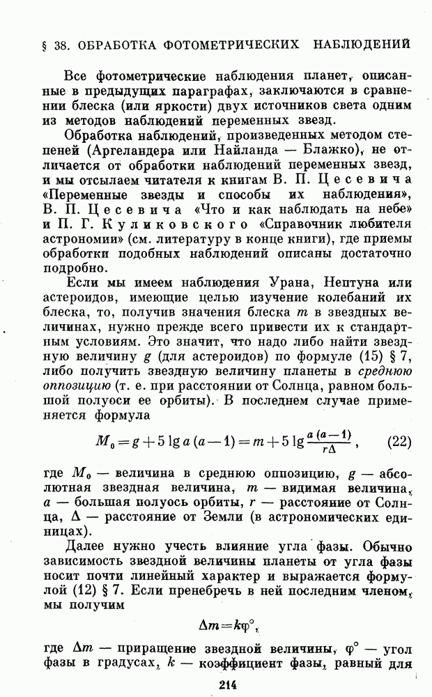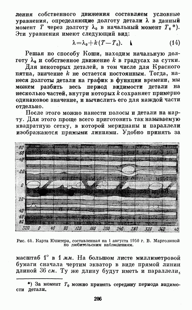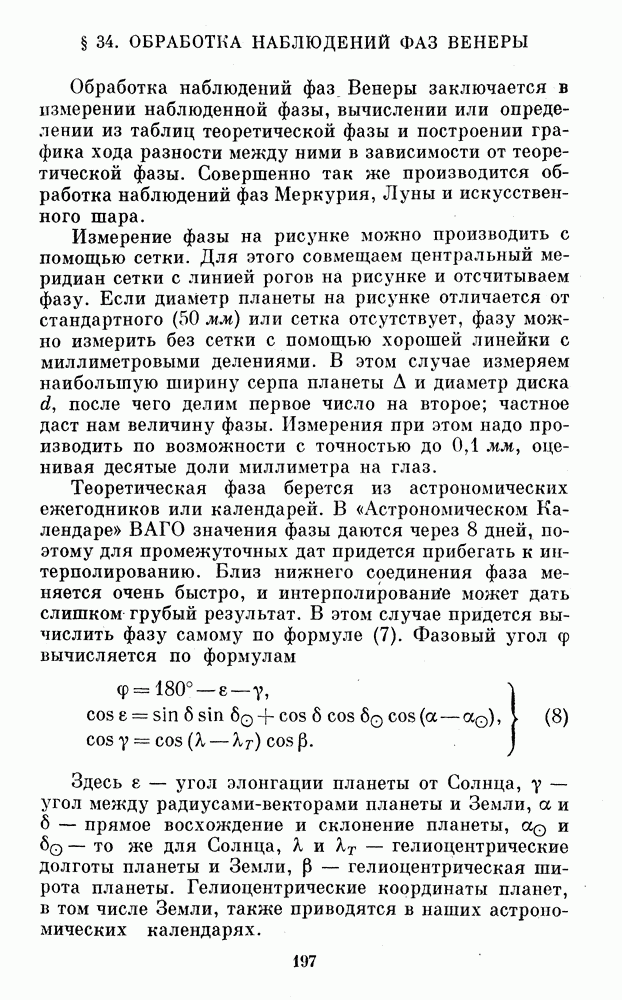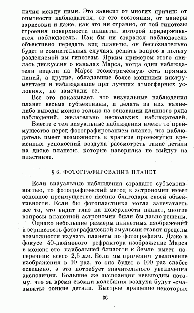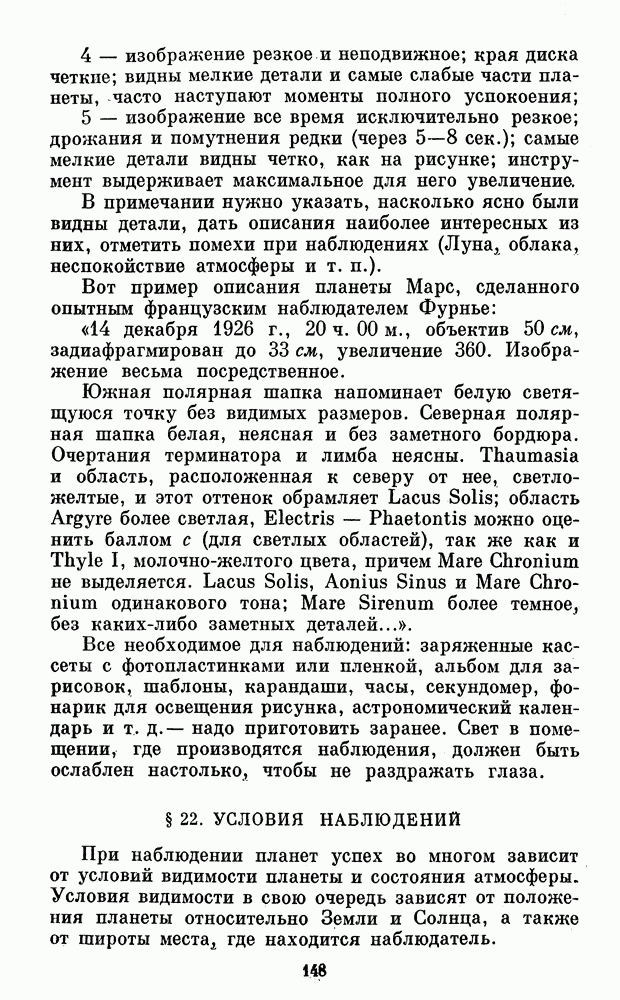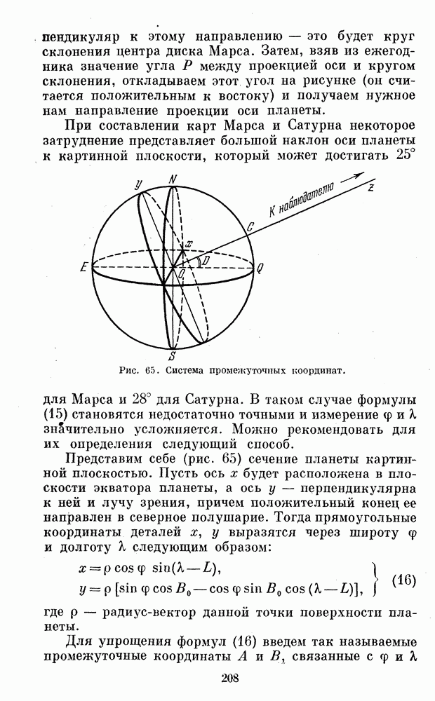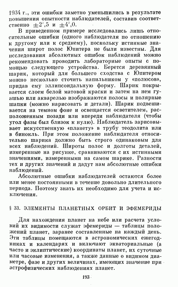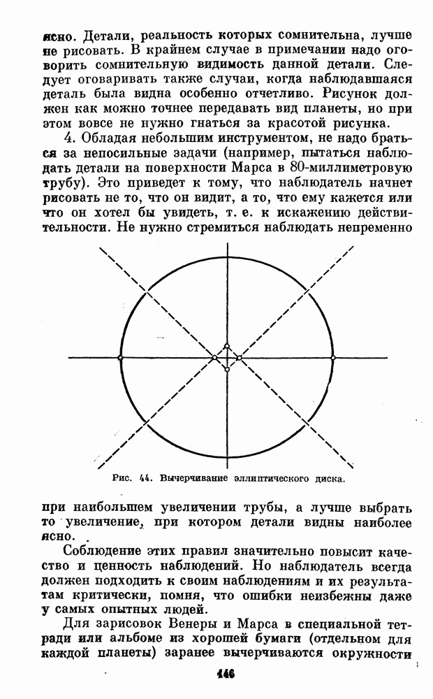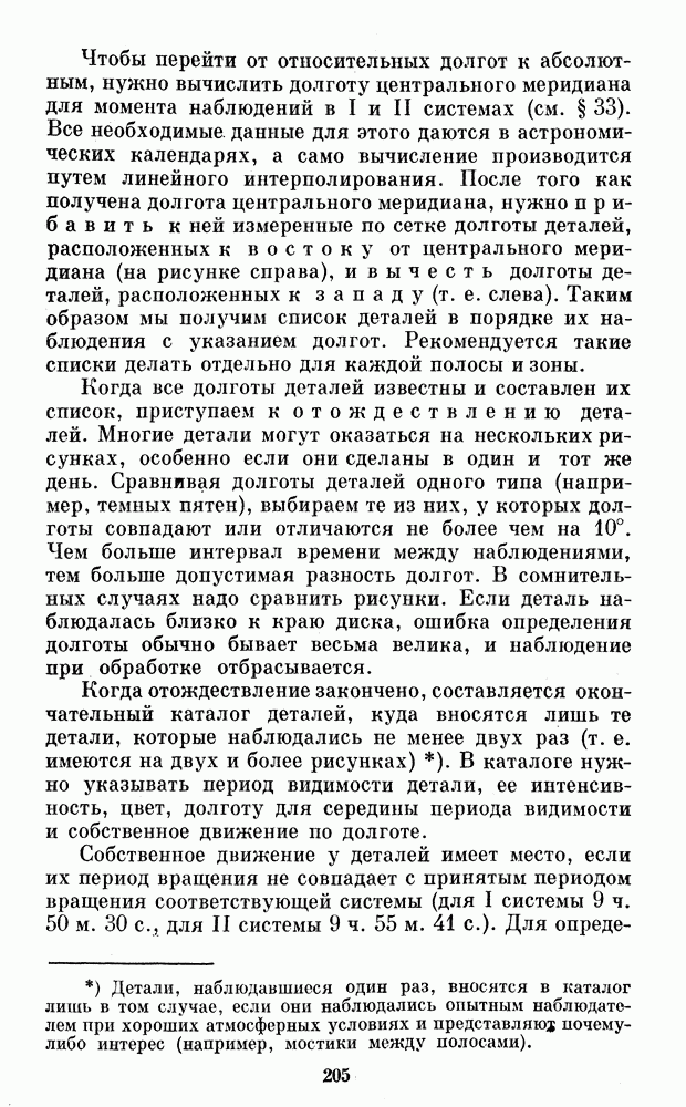 ГЛАВА V. ОБРАБОТКА НАБЛЮДЕНИЙ§ 31. ЧТО ТАКОЕ ОБРАБОТКА НАБЛЮДЕНИЙМы уже говорили в § 20 о бессмысленности «наблюдений ради наблюдений». Чтобы наблюдения могли принести пользу науке и дать какой-нибудь научный результат, их необходимо подвергнуть обработке. Обработка имеет целью обобщение и истолкование наблюдаемых фактов и явлений, суммирование результатов отдельных наблюдений, сравнение и сопоставление этих наблюдений друг с другом. Так как при обработке наблюдений приходится производить вычисления, важно, чтобы обрабатывающий имел необходимую математическую подготовку. В большинстве случаев достаточна подготовка в объеме полной средней школы, а в тех случаях, когда методы обработки выходят за рамки курса средней школы, они могут быть легко изучены всяким, прошедшим этот курс. К таким методам относятся интерполирование, корреляция, способ наименьших квадратов и некоторые другие. Интерполирование ставит своей задачей по двум или нескольким значениям какой-нибудь переменной величины (функции), изменяющейся в зависимости от другой переменной величины (аргумента), найти значения функции для промежуточных значений аргумента. Чаще всего аргументом является время, т. е. требуется по ряду значений функции для заданных моментов t найти ее значения для промежуточных моментов. Наиболее простой случай интерполирования имеет место, когда функция изменяется линейно, т.е. равным изменениям аргумента соответствуют равные между собой изменения функции. П При линейном интерполировании задача решается с помощью пропорций. В более общем случае требуется применение специальных интерполяционных формул, на которых мы здесь останавливаться не будем, отсылая читателя к Постоянной части «Астрономического Календаря» (6-е изд.- М.: Наука, 1973) или к книге П. Г. Куликовского «Справочник любителя астрономии» (4-е изд.- М.: Наука, 1971, с. 206). Там же читатель прочтет и о методе экстраполирования, когда функция ищется не для промежуточного значения аргумента, а для предыдущего или последующего по сравнению с данными. Корреляция преследует цель найти степень зависимости одной величины от другой или убедиться в отсутствии такой зависимости. Если коэффициент корреляции по абсолютной величине равен 1, то мы имеем дело с функциональной зависимостью; если он равен 0, зависимость отсутствует. О вычислении коэффициентов корреляции также можно прочесть в Постоянной части «Астрономического Календаря». Способ наименьших квадратов широко применяется при обработке наблюдений, когда из многих наблюдений нужно найти наиболее вероятные значения искомых величин. Изложение способа наименьших квадратов выходит за рамки этой книги, и мы отсылаем читателя к двум указанным выше книгам. Упрощенное решение той же задачи достигается при помощи способа Коши, который будет изложен в § 34. Кроме этих общих приемов обработки наблюдений, применяемых не только в астрономии, но и во многих других областях науки, при обработке наблюдений планет применяются в каждом случае специфические приемы, которые будут изложены ниже. Всякая обработка наблюдений планет состоит из двух частей: обработки отдельных наблюдений (например, измерения координат деталей, фазы планеты и т. д.) и окончательной обработки, в которой результаты отдельных наблюдений объединяются, сравниваются и обо