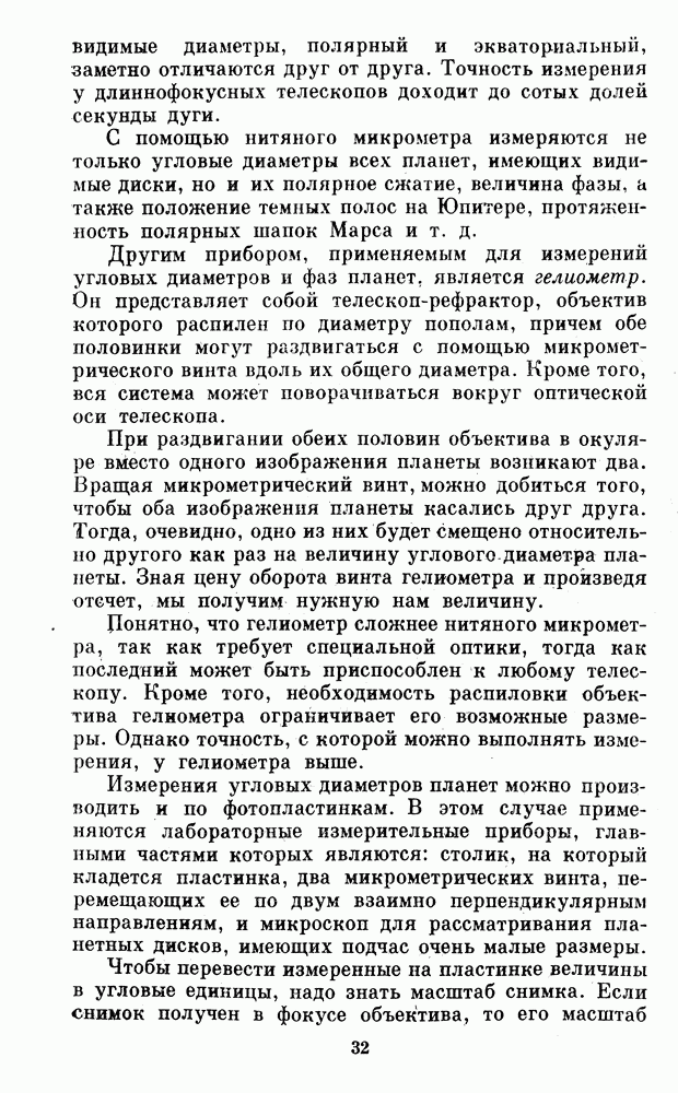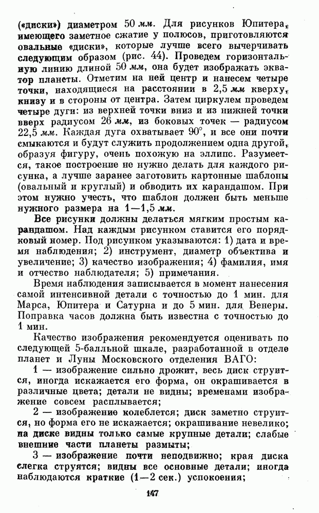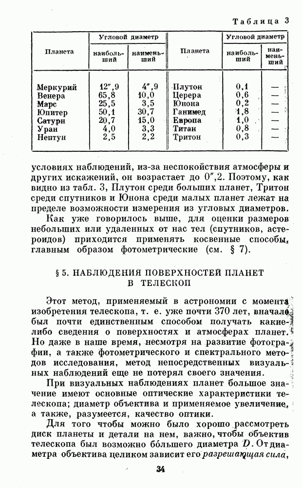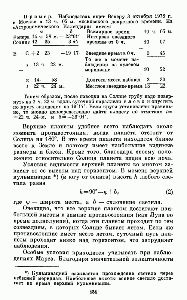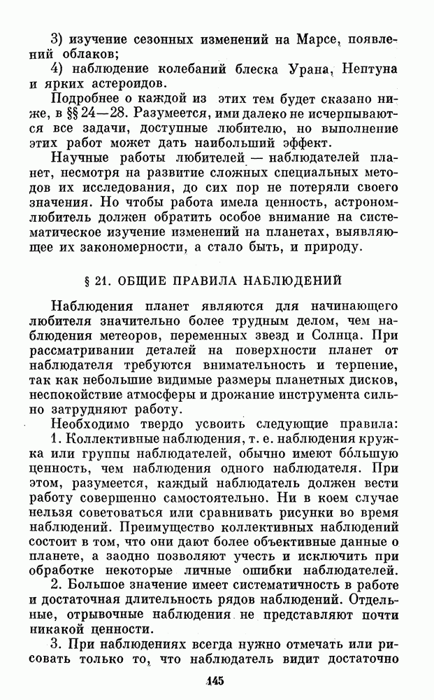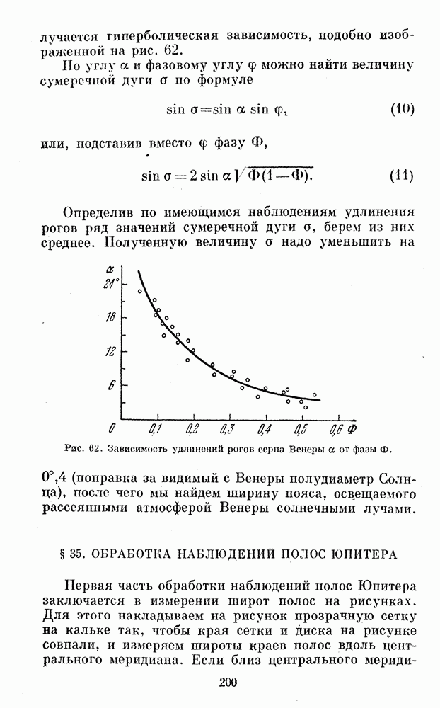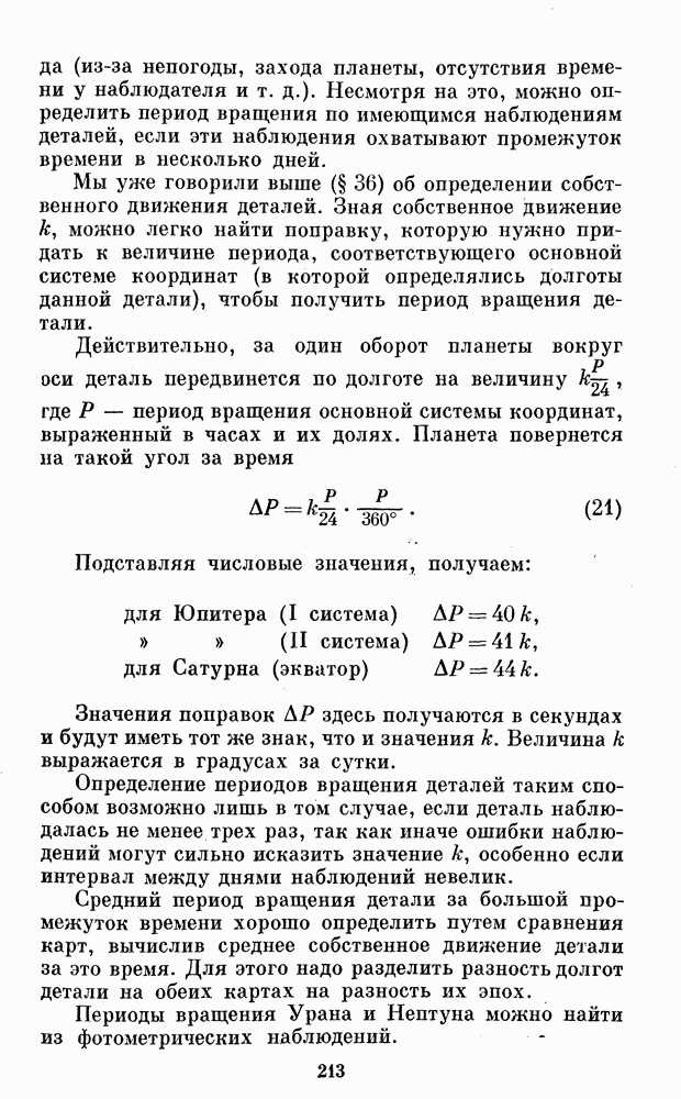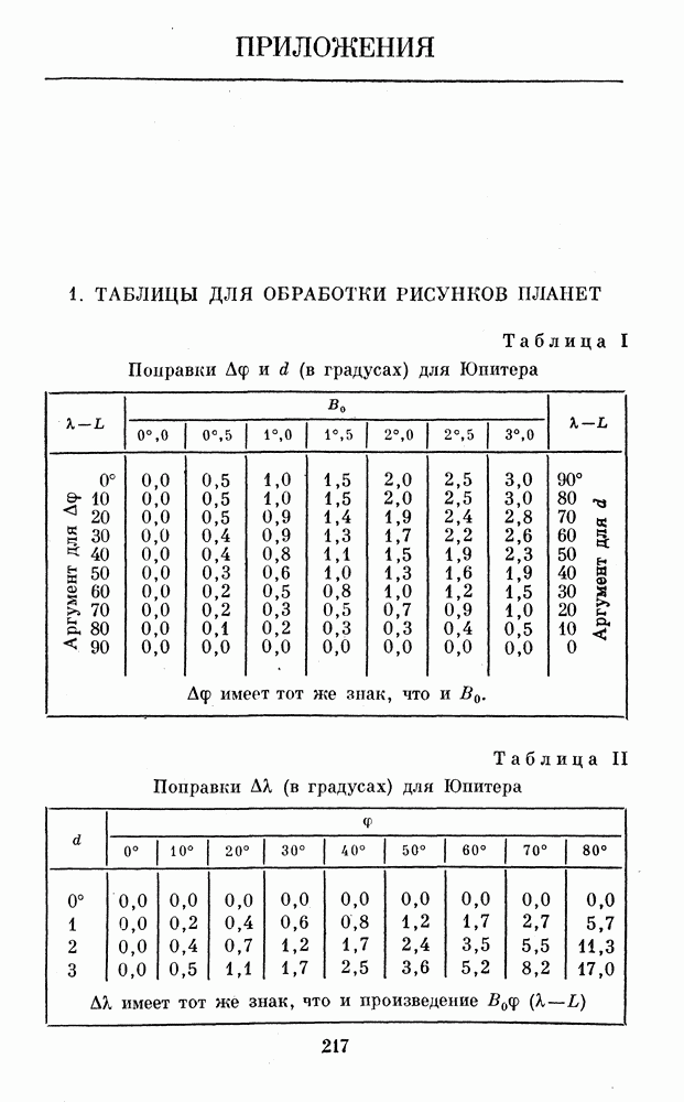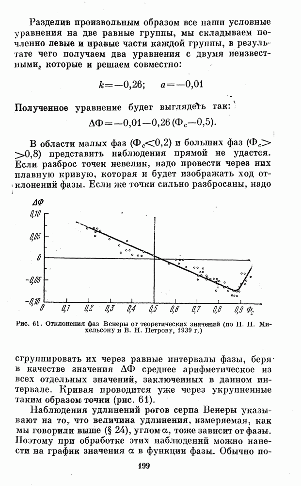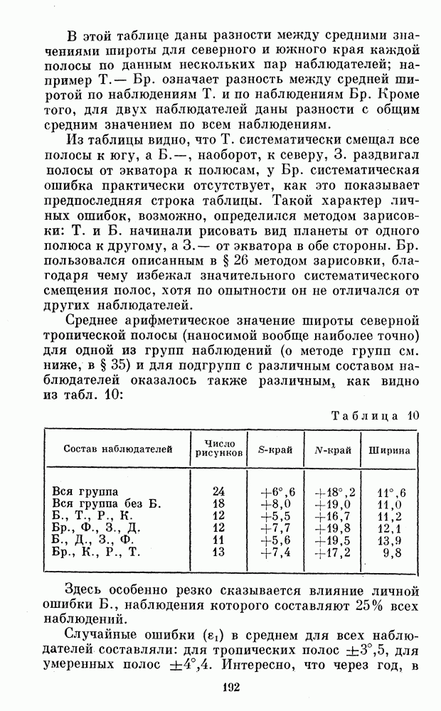 ГЛАВА V. ОБРАБОТКА НАБЛЮДЕНИЙ§ 31. ЧТО ТАКОЕ ОБРАБОТКА НАБЛЮДЕНИЙМы уже говорили в § 20 о бессмысленности «наблюдений ради наблюдений». Чтобы наблюдения могли принести пользу науке и дать какой-нибудь научный результат, их необходимо подвергнуть обработке. Обработка имеет целью обобщение и истолкование наблюдаемых фактов и явлений, суммирование результатов отдельных наблюдений, сравнение и сопоставление этих наблюдений друг с другом. Так как при обработке наблюдений приходится производить вычисления, важно, чтобы обрабатывающий имел необходимую математическую подготовку. В большинстве случаев достаточна подготовка в объеме полной средней школы, а в тех случаях, когда методы обработки выходят за рамки курса средней школы, они могут быть легко изучены всяким, прошедшим этот курс. К таким методам относятся интерполирование, корреляция, способ наименьших квадратов и некоторые другие. Интерполирование ставит своей задачей по двум или нескольким значениям какой-нибудь переменной величины (функции), изменяющейся в зависимости от другой переменной величины (аргумента), найти значения функции для промежуточных значений аргумента. Чаще всего аргументом является время, т. е. требуется по ряду значений функции для заданных моментов t найти ее значения для промежуточных моментов. Наиболее простой случай интерполирования имеет место, когда функция изменяется линейно, т.е. равным изменениям аргумента соответствуют равные между собой изменения функции. П При линейном интерполировании задача решается с помощью пропорций. В более общем случае требуется применение специальных интерполяционных формул, на которых мы здесь останавливаться не будем, отсылая читателя к Постоянной части «Астрономического Календаря» (6-е изд.- М.: Наука, 1973) или к книге П. Г. Куликовского «Справочник любителя астрономии» (4-е изд.- М.: Наука, 1971, с. 206). Там же читатель прочтет и о методе экстраполирования, когда функция ищется не для промежуточного значения аргумента, а для предыдущего или последующего по сравнению с данными. Корреляция преследует цель найти степень зависимости одной величины от другой или убедиться в отсутствии такой зависимости. Если коэффициент корреляции по абсолютной величине равен 1, то мы имеем дело с функциональной зависимостью; если он равен 0, зависимость отсутствует. О вычислении коэффициентов корреляции также можно прочесть в Постоянной части «Астрономического Календаря». Способ наименьших квадратов широко применяется при обработке наблюдений, когда из многих наблюдений нужно найти наиболее вероятные значения искомых величин. Изложение способа наименьших квадратов выходит за рамки этой книги, и мы отсылаем читателя к двум указанным выше книгам. Упрощенное решение той же задачи достигается при помощи способа Коши, который будет изложен в § 34. Кроме этих общих приемов обработки наблюдений, применяемых не только в астрономии, но и во многих других областях науки, при обработке наблюдений планет применяются в каждом случае специфические приемы, которые будут изложены ниже. Всякая обработка наблюдений планет состоит из двух частей: обработки отдельных наблюдений (например, измерения координат деталей, фазы планеты и т. д.) и окончательной обработки, в которой результаты отдельных наблюдений объединяются, сравниваются и обо