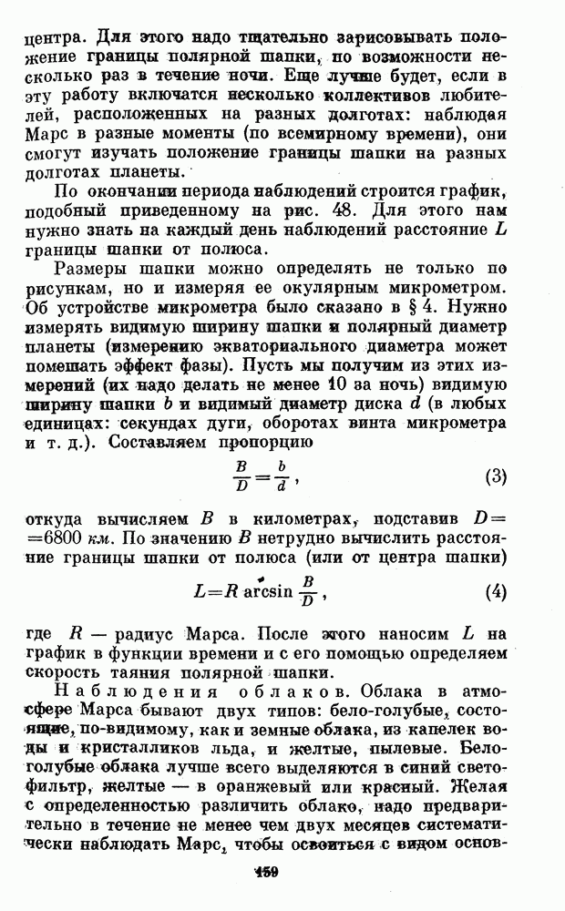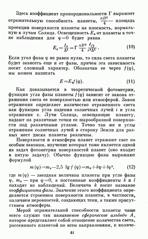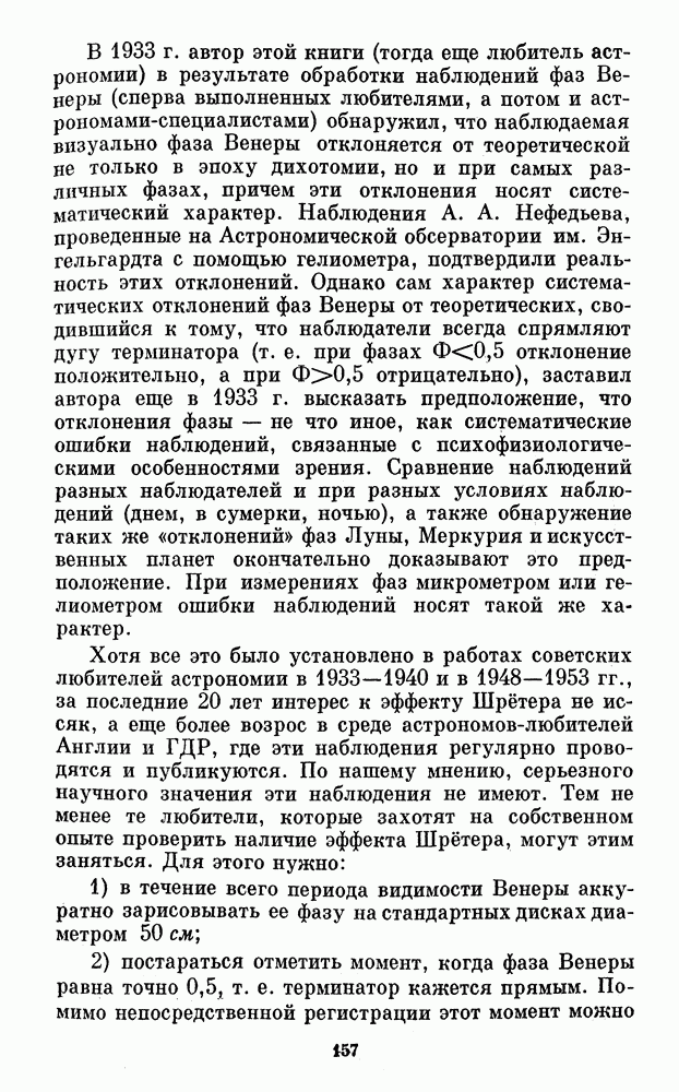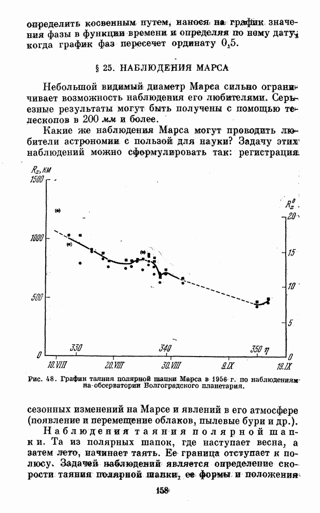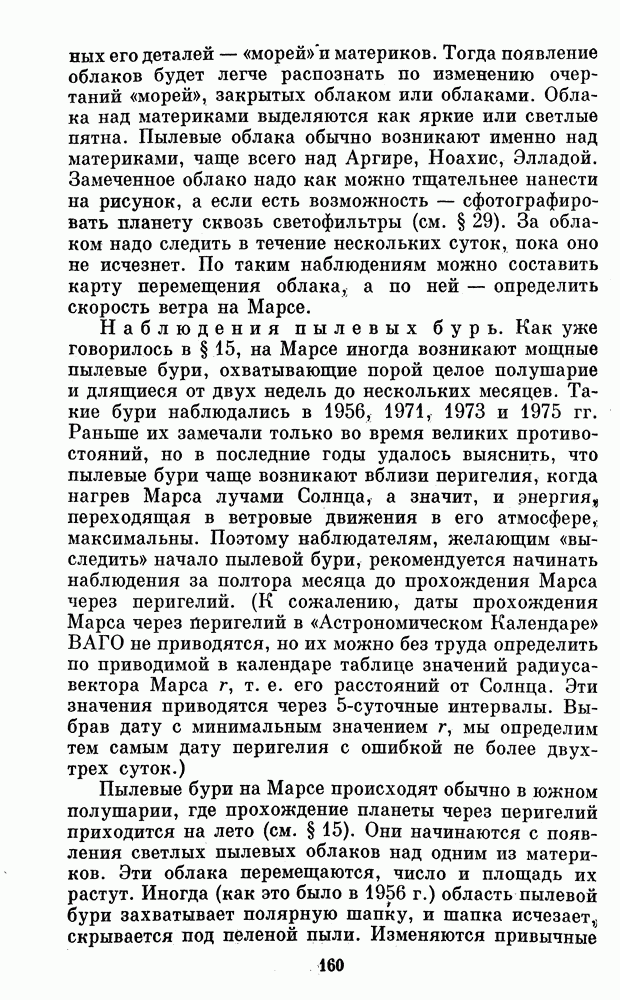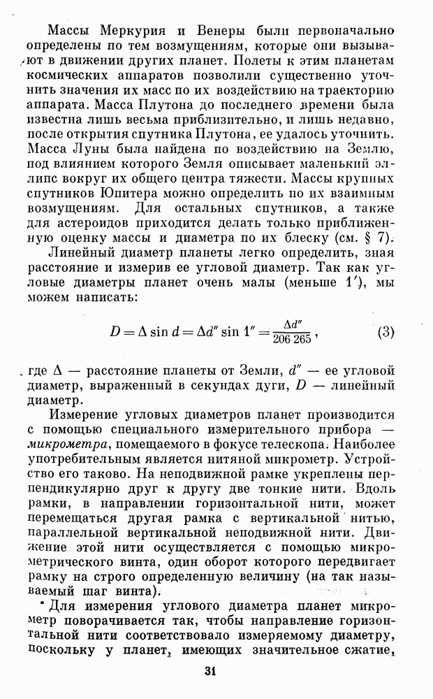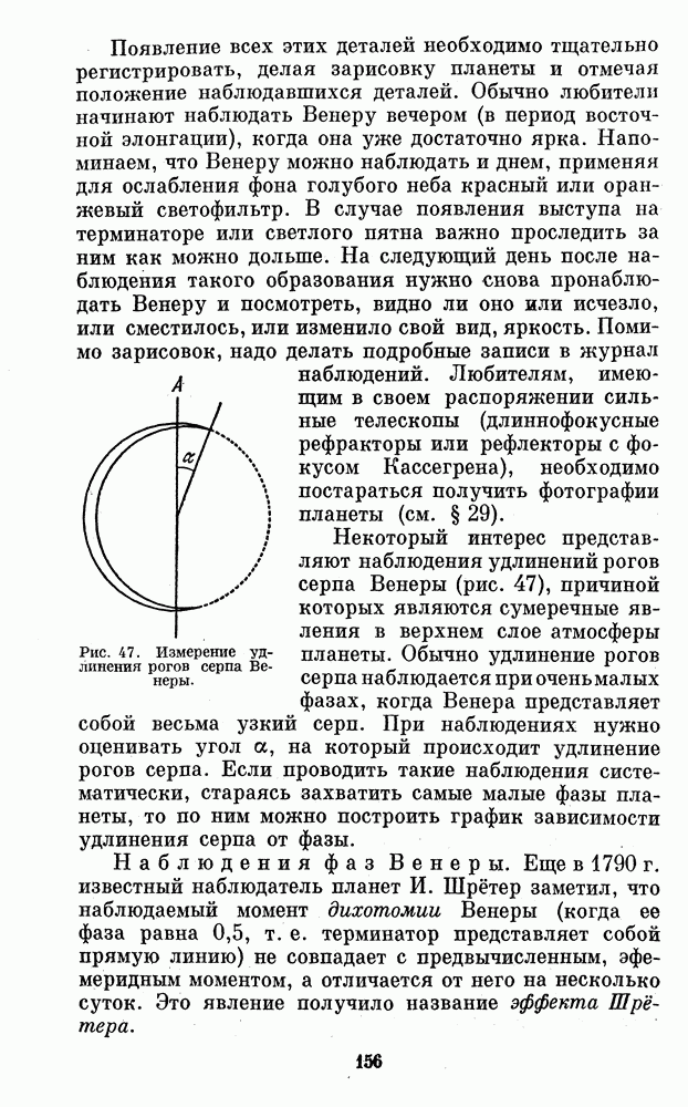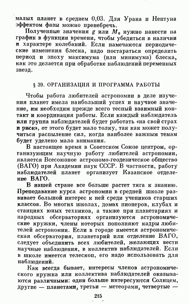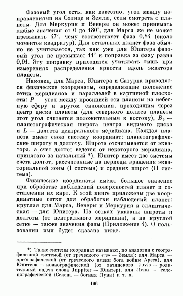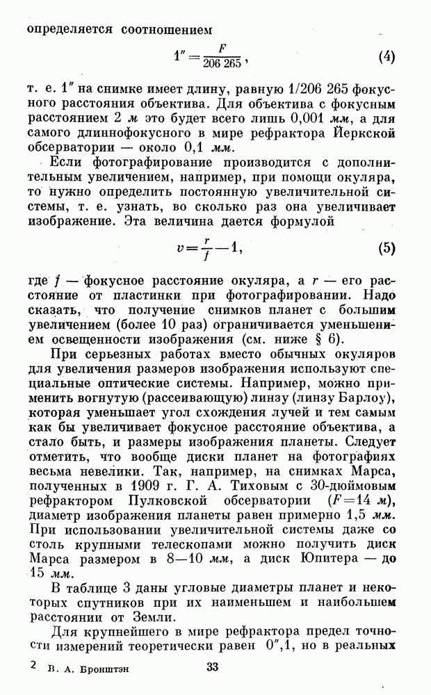 ГЛАВА V. ОБРАБОТКА НАБЛЮДЕНИЙ§ 31. ЧТО ТАКОЕ ОБРАБОТКА НАБЛЮДЕНИЙМы уже говорили в § 20 о бессмысленности «наблюдений ради наблюдений». Чтобы наблюдения могли принести пользу науке и дать какой-нибудь научный результат, их необходимо подвергнуть обработке. Обработка имеет целью обобщение и истолкование наблюдаемых фактов и явлений, суммирование результатов отдельных наблюдений, сравнение и сопоставление этих наблюдений друг с другом. Так как при обработке наблюдений приходится производить вычисления, важно, чтобы обрабатывающий имел необходимую математическую подготовку. В большинстве случаев достаточна подготовка в объеме полной средней школы, а в тех случаях, когда методы обработки выходят за рамки курса средней школы, они могут быть легко изучены всяким, прошедшим этот курс. К таким методам относятся интерполирование, корреляция, способ наименьших квадратов и некоторые другие. Интерполирование ставит своей задачей по двум или нескольким значениям какой-нибудь переменной величины (функции), изменяющейся в зависимости от другой переменной величины (аргумента), найти значения функции для промежуточных значений аргумента. Чаще всего аргументом является время, т. е. требуется по ряду значений функции для заданных моментов t найти ее значения для промежуточных моментов. Наиболее простой случай интерполирования имеет место, когда функция изменяется линейно, т.е. равным изменениям аргумента соответствуют равные между собой изменения функции. П При линейном интерполировании задача решается с помощью пропорций. В более общем случае требуется применение специальных интерполяционных формул, на которых мы здесь останавливаться не будем, отсылая читателя к Постоянной части «Астрономического Календаря» (6-е изд.- М.: Наука, 1973) или к книге П. Г. Куликовского «Справочник любителя астрономии» (4-е изд.- М.: Наука, 1971, с. 206). Там же читатель прочтет и о методе экстраполирования, когда функция ищется не для промежуточного значения аргумента, а для предыдущего или последующего по сравнению с данными. Корреляция преследует цель найти степень зависимости одной величины от другой или убедиться в отсутствии такой зависимости. Если коэффициент корреляции по абсолютной величине равен 1, то мы имеем дело с функциональной зависимостью; если он равен 0, зависимость отсутствует. О вычислении коэффициентов корреляции также можно прочесть в Постоянной части «Астрономического Календаря». Способ наименьших квадратов широко применяется при обработке наблюдений, когда из многих наблюдений нужно найти наиболее вероятные значения искомых величин. Изложение способа наименьших квадратов выходит за рамки этой книги, и мы отсылаем читателя к двум указанным выше книгам. Упрощенное решение той же задачи достигается при помощи способа Коши, который будет изложен в § 34. Кроме этих общих приемов обработки наблюдений, применяемых не только в астрономии, но и во многих других областях науки, при обработке наблюдений планет применяются в каждом случае специфические приемы, которые будут изложены ниже. Всякая обработка наблюдений планет состоит из двух частей: обработки отдельных наблюдений (например, измерения координат деталей, фазы планеты и т. д.) и окончательной обработки, в которой результаты отдельных наблюдений объединяются, сравниваются и обо