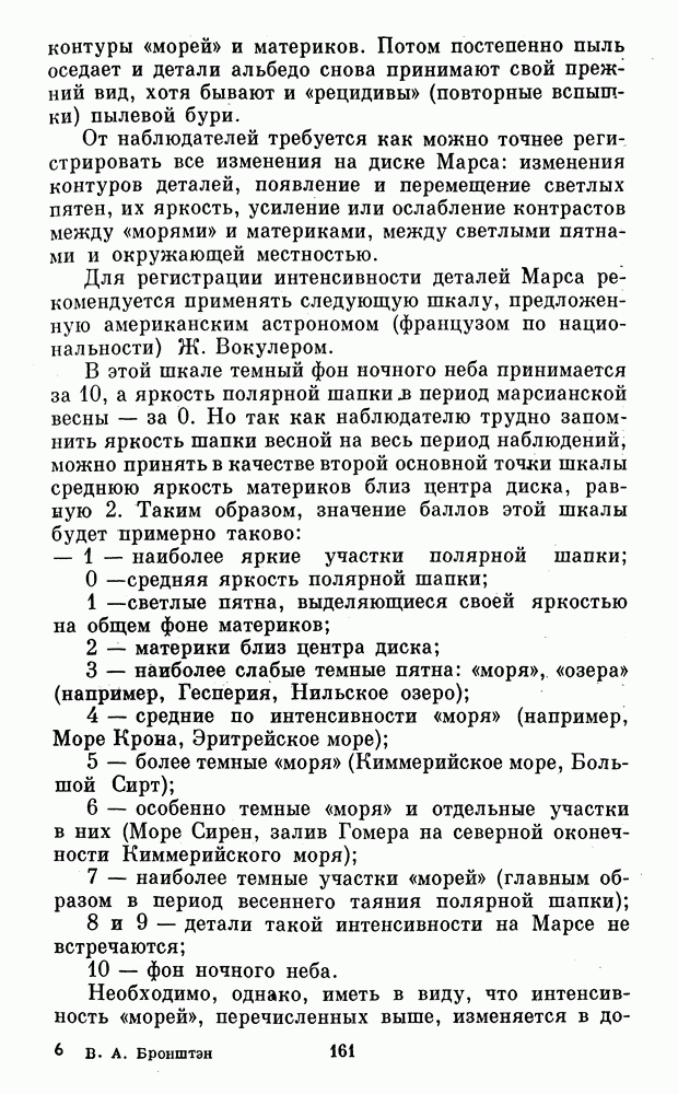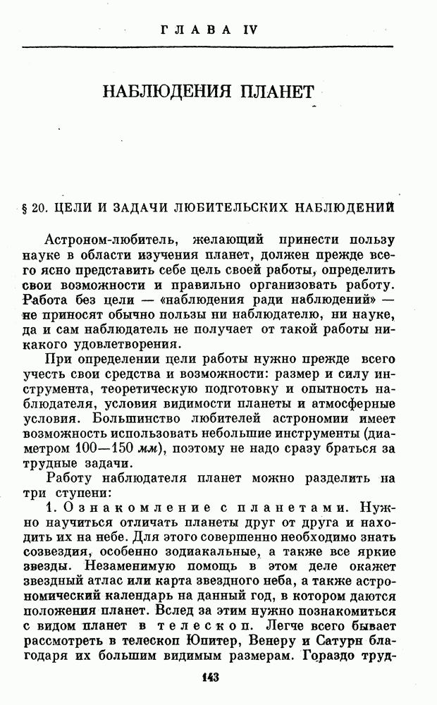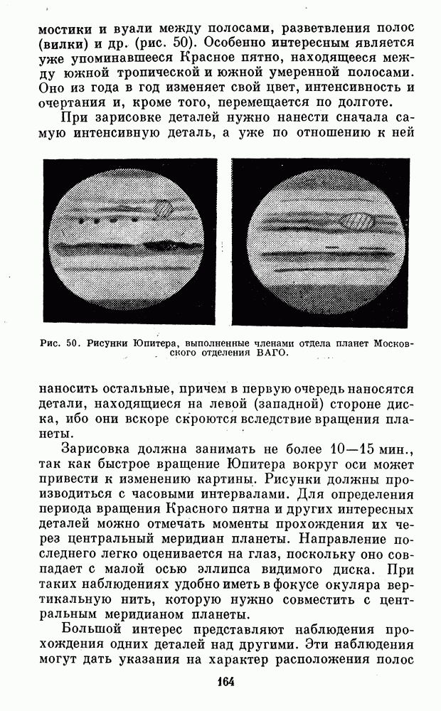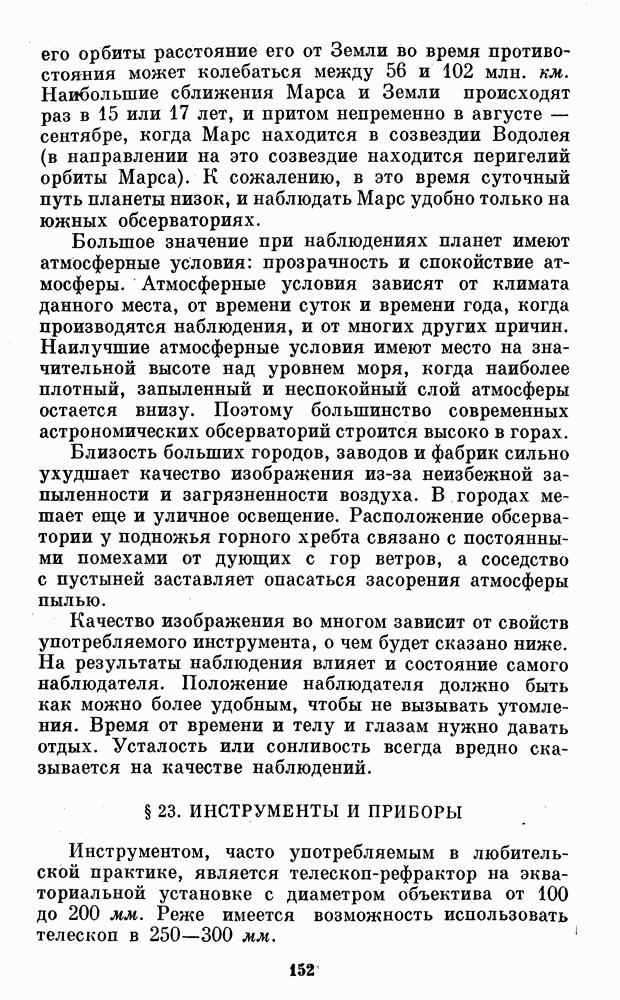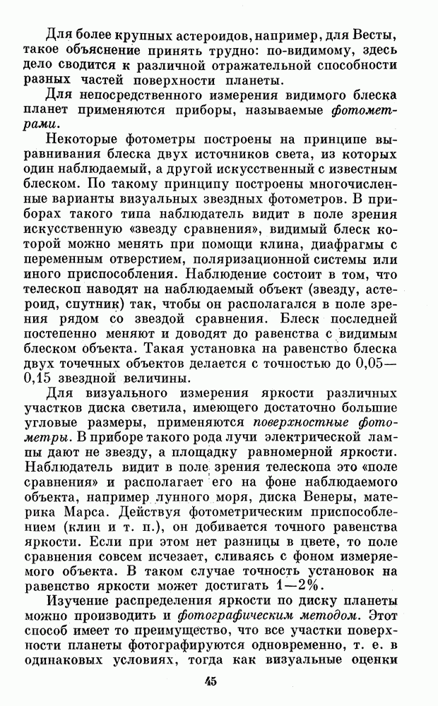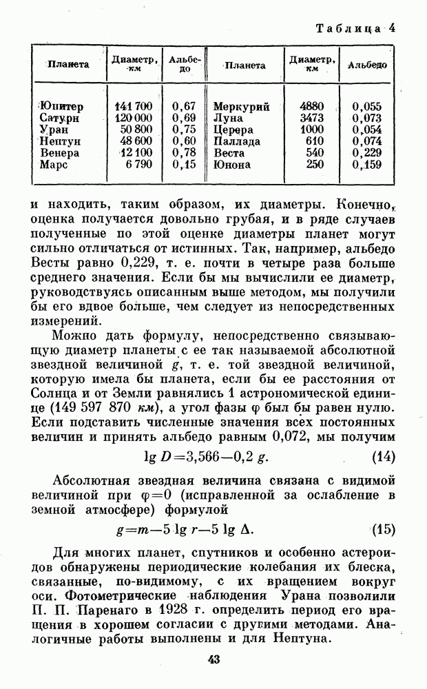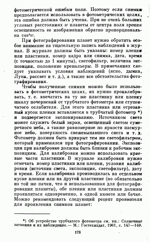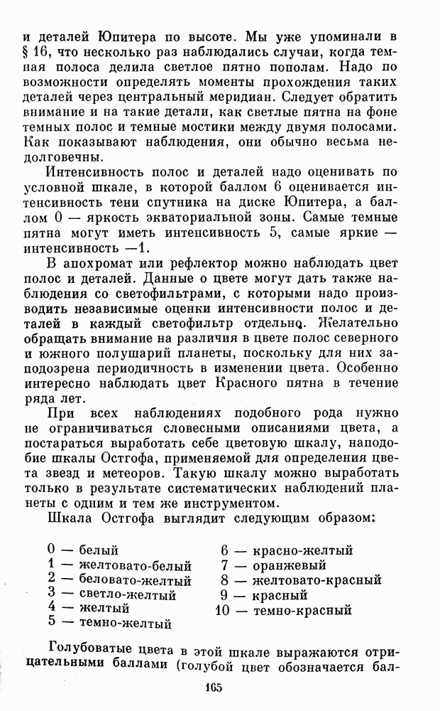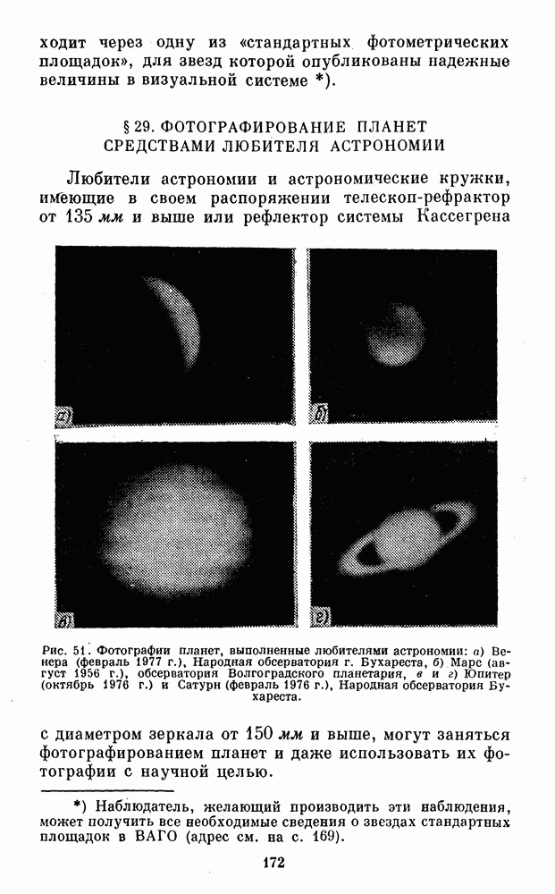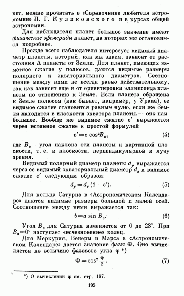 ГЛАВА V. ОБРАБОТКА НАБЛЮДЕНИЙ§ 31. ЧТО ТАКОЕ ОБРАБОТКА НАБЛЮДЕНИЙМы уже говорили в § 20 о бессмысленности «наблюдений ради наблюдений». Чтобы наблюдения могли принести пользу науке и дать какой-нибудь научный результат, их необходимо подвергнуть обработке. Обработка имеет целью обобщение и истолкование наблюдаемых фактов и явлений, суммирование результатов отдельных наблюдений, сравнение и сопоставление этих наблюдений друг с другом. Так как при обработке наблюдений приходится производить вычисления, важно, чтобы обрабатывающий имел необходимую математическую подготовку. В большинстве случаев достаточна подготовка в объеме полной средней школы, а в тех случаях, когда методы обработки выходят за рамки курса средней школы, они могут быть легко изучены всяким, прошедшим этот курс. К таким методам относятся интерполирование, корреляция, способ наименьших квадратов и некоторые другие. Интерполирование ставит своей задачей по двум или нескольким значениям какой-нибудь переменной величины (функции), изменяющейся в зависимости от другой переменной величины (аргумента), найти значения функции для промежуточных значений аргумента. Чаще всего аргументом является время, т. е. требуется по ряду значений функции для заданных моментов t найти ее значения для промежуточных моментов. Наиболее простой случай интерполирования имеет место, когда функция изменяется линейно, т.е. равным изменениям аргумента соответствуют равные между собой изменения функции. П При линейном интерполировании задача решается с помощью пропорций. В более общем случае требуется применение специальных интерполяционных формул, на которых мы здесь останавливаться не будем, отсылая читателя к Постоянной части «Астрономического Календаря» (6-е изд.- М.: Наука, 1973) или к книге П. Г. Куликовского «Справочник любителя астрономии» (4-е изд.- М.: Наука, 1971, с. 206). Там же читатель прочтет и о методе экстраполирования, когда функция ищется не для промежуточного значения аргумента, а для предыдущего или последующего по сравнению с данными. Корреляция преследует цель найти степень зависимости одной величины от другой или убедиться в отсутствии такой зависимости. Если коэффициент корреляции по абсолютной величине равен 1, то мы имеем дело с функциональной зависимостью; если он равен 0, зависимость отсутствует. О вычислении коэффициентов корреляции также можно прочесть в Постоянной части «Астрономического Календаря». Способ наименьших квадратов широко применяется при обработке наблюдений, когда из многих наблюдений нужно найти наиболее вероятные значения искомых величин. Изложение способа наименьших квадратов выходит за рамки этой книги, и мы отсылаем читателя к двум указанным выше книгам. Упрощенное решение той же задачи достигается при помощи способа Коши, который будет изложен в § 34. Кроме этих общих приемов обработки наблюдений, применяемых не только в астрономии, но и во многих других областях науки, при обработке наблюдений планет применяются в каждом случае специфические приемы, которые будут изложены ниже. Всякая обработка наблюдений планет состоит из двух частей: обработки отдельных наблюдений (например, измерения координат деталей, фазы планеты и т. д.) и окончательной обработки, в которой результаты отдельных наблюдений объединяются, сравниваются и обо