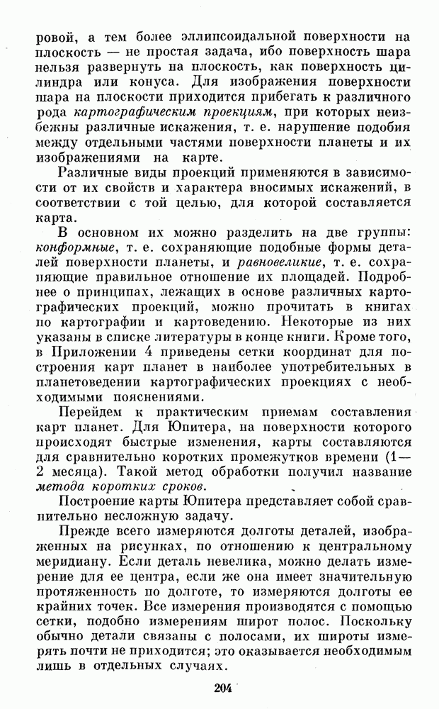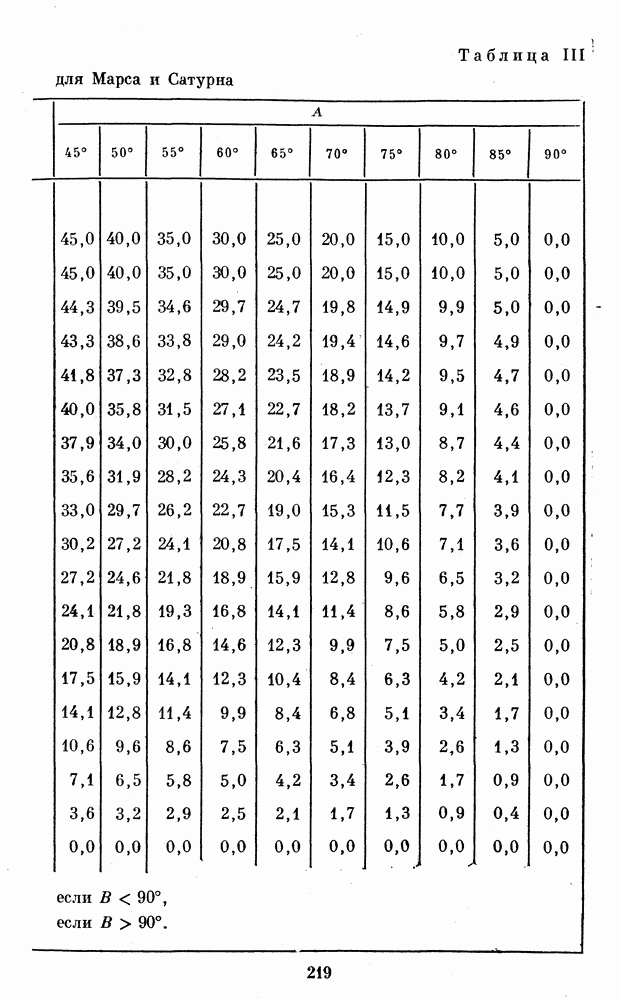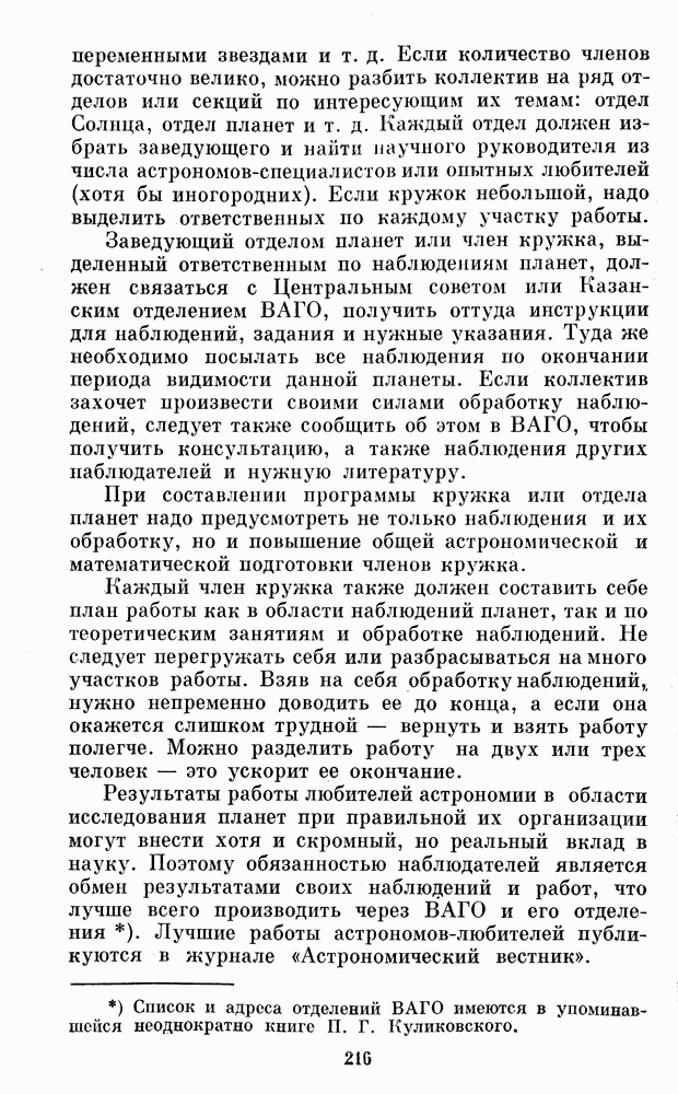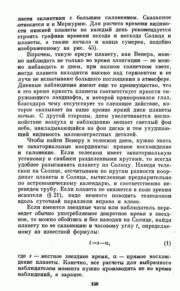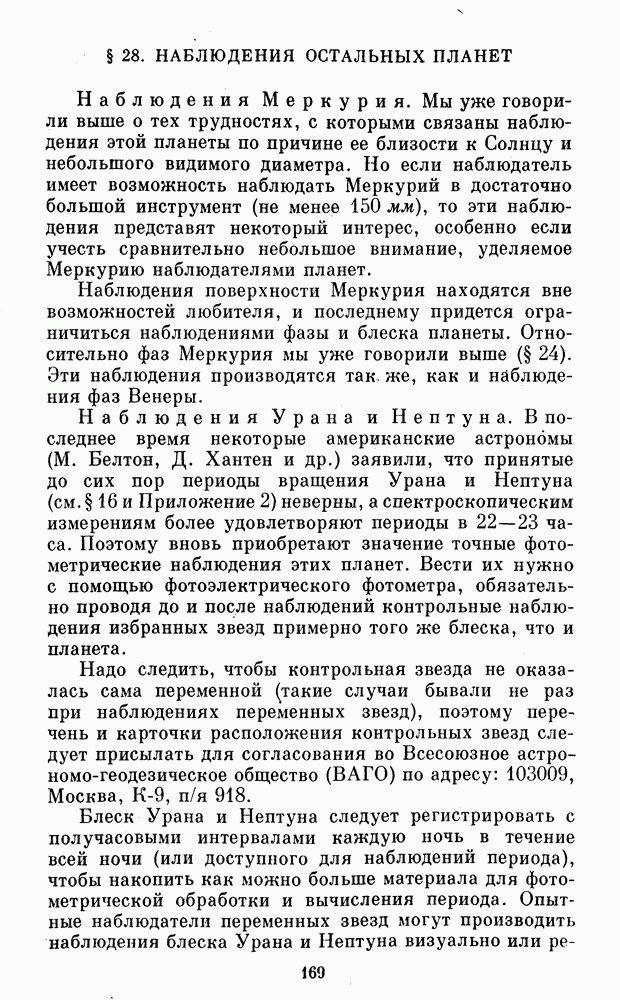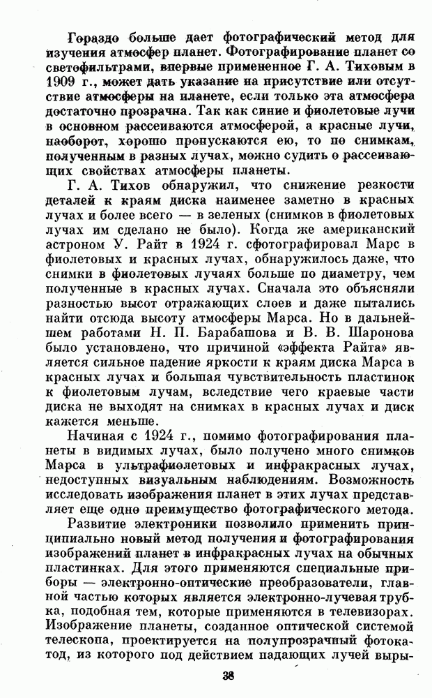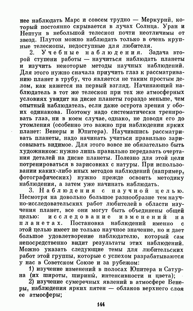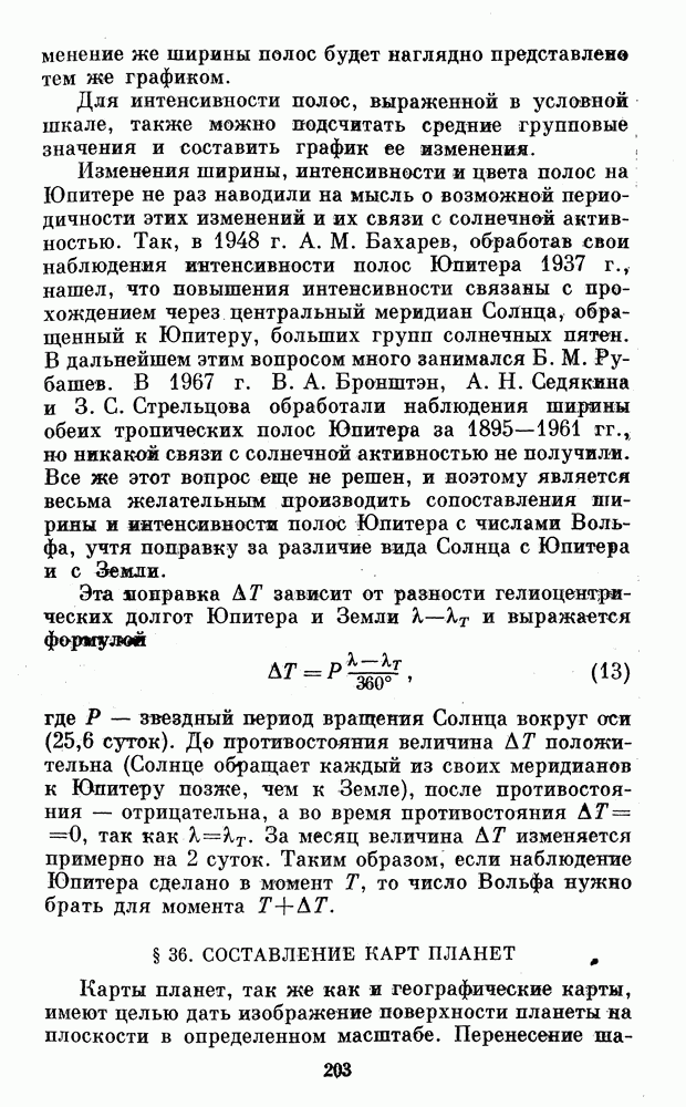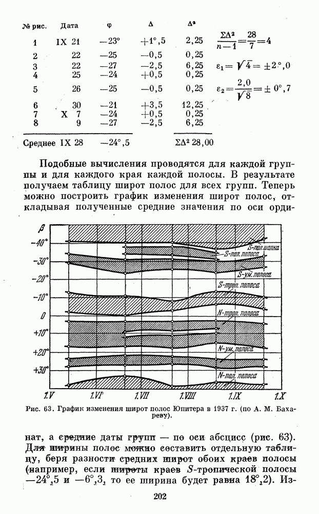 ГЛАВА V. ОБРАБОТКА НАБЛЮДЕНИЙ§ 31. ЧТО ТАКОЕ ОБРАБОТКА НАБЛЮДЕНИЙМы уже говорили в § 20 о бессмысленности «наблюдений ради наблюдений». Чтобы наблюдения могли принести пользу науке и дать какой-нибудь научный результат, их необходимо подвергнуть обработке. Обработка имеет целью обобщение и истолкование наблюдаемых фактов и явлений, суммирование результатов отдельных наблюдений, сравнение и сопоставление этих наблюдений друг с другом. Так как при обработке наблюдений приходится производить вычисления, важно, чтобы обрабатывающий имел необходимую математическую подготовку. В большинстве случаев достаточна подготовка в объеме полной средней школы, а в тех случаях, когда методы обработки выходят за рамки курса средней школы, они могут быть легко изучены всяким, прошедшим этот курс. К таким методам относятся интерполирование, корреляция, способ наименьших квадратов и некоторые другие. Интерполирование ставит своей задачей по двум или нескольким значениям какой-нибудь переменной величины (функции), изменяющейся в зависимости от другой переменной величины (аргумента), найти значения функции для промежуточных значений аргумента. Чаще всего аргументом является время, т. е. требуется по ряду значений функции для заданных моментов t найти ее значения для промежуточных моментов. Наиболее простой случай интерполирования имеет место, когда функция изменяется линейно, т.е. равным изменениям аргумента соответствуют равные между собой изменения функции. П При линейном интерполировании задача решается с помощью пропорций. В более общем случае требуется применение специальных интерполяционных формул, на которых мы здесь останавливаться не будем, отсылая читателя к Постоянной части «Астрономического Календаря» (6-е изд.- М.: Наука, 1973) или к книге П. Г. Куликовского «Справочник любителя астрономии» (4-е изд.- М.: Наука, 1971, с. 206). Там же читатель прочтет и о методе экстраполирования, когда функция ищется не для промежуточного значения аргумента, а для предыдущего или последующего по сравнению с данными. Корреляция преследует цель найти степень зависимости одной величины от другой или убедиться в отсутствии такой зависимости. Если коэффициент корреляции по абсолютной величине равен 1, то мы имеем дело с функциональной зависимостью; если он равен 0, зависимость отсутствует. О вычислении коэффициентов корреляции также можно прочесть в Постоянной части «Астрономического Календаря». Способ наименьших квадратов широко применяется при обработке наблюдений, когда из многих наблюдений нужно найти наиболее вероятные значения искомых величин. Изложение способа наименьших квадратов выходит за рамки этой книги, и мы отсылаем читателя к двум указанным выше книгам. Упрощенное решение той же задачи достигается при помощи способа Коши, который будет изложен в § 34. Кроме этих общих приемов обработки наблюдений, применяемых не только в астрономии, но и во многих других областях науки, при обработке наблюдений планет применяются в каждом случае специфические приемы, которые будут изложены ниже. Всякая обработка наблюдений планет состоит из двух частей: обработки отдельных наблюдений (например, измерения координат деталей, фазы планеты и т. д.) и окончательной обработки, в которой результаты отдельных наблюдений объединяются, сравниваются и обо