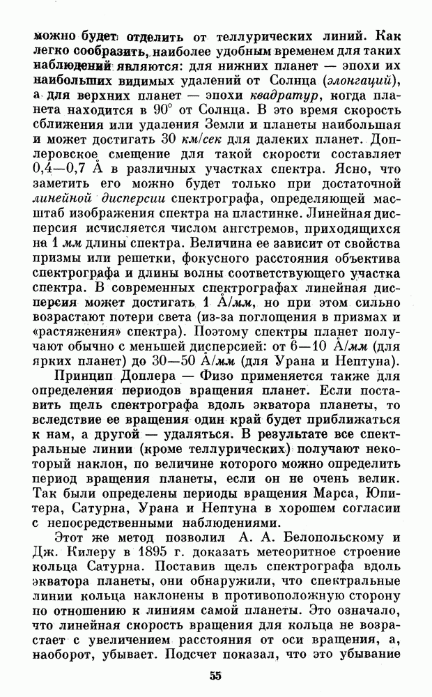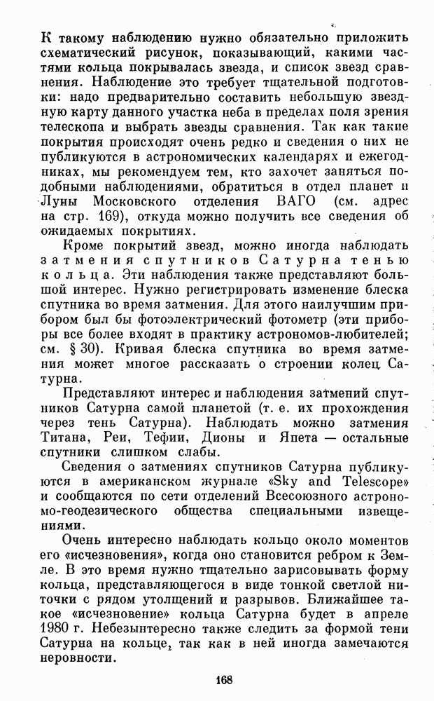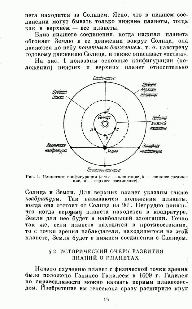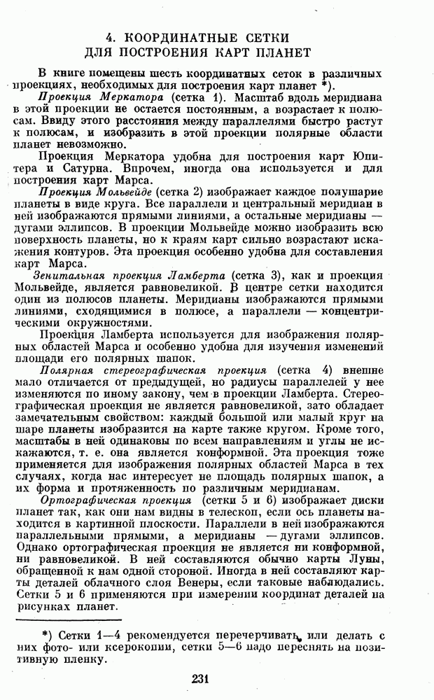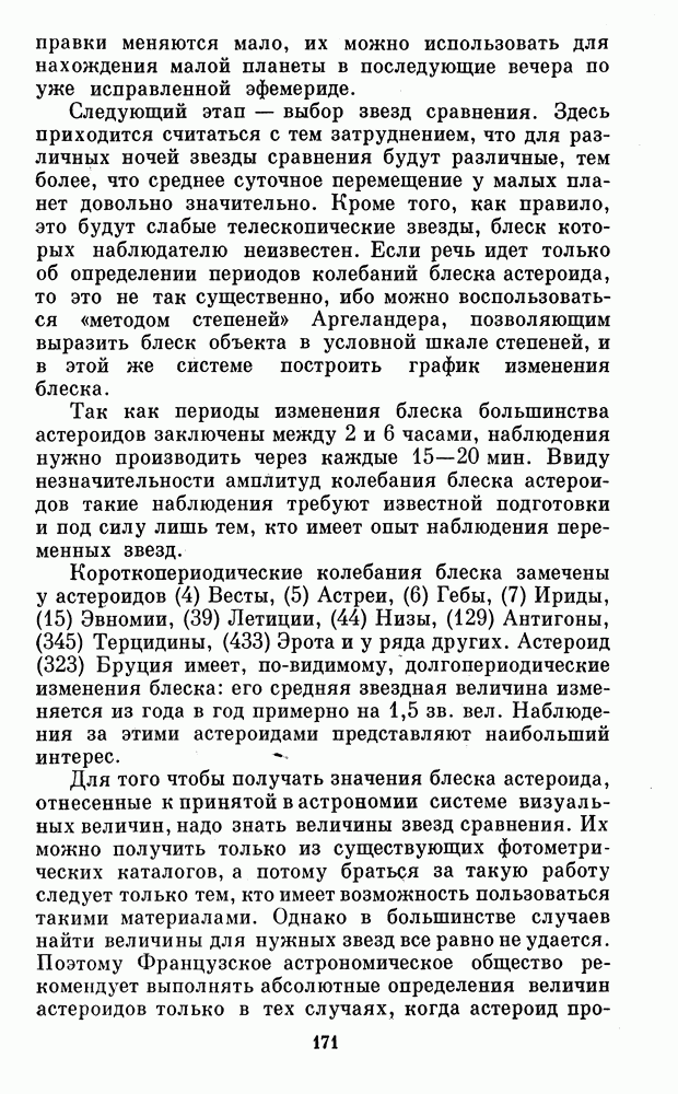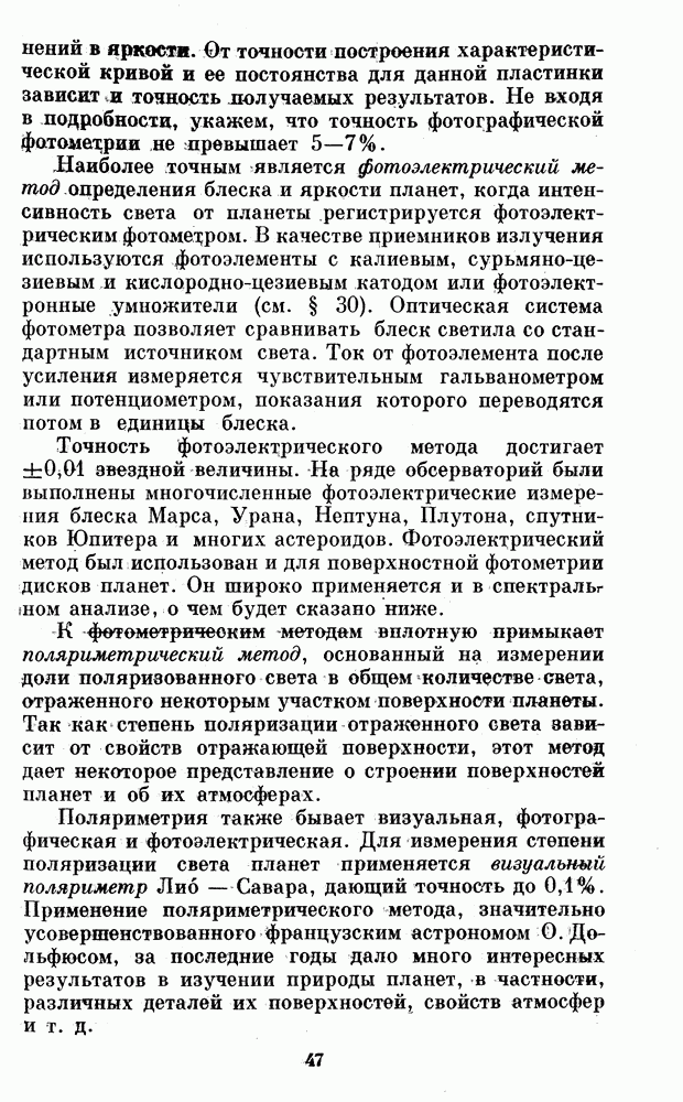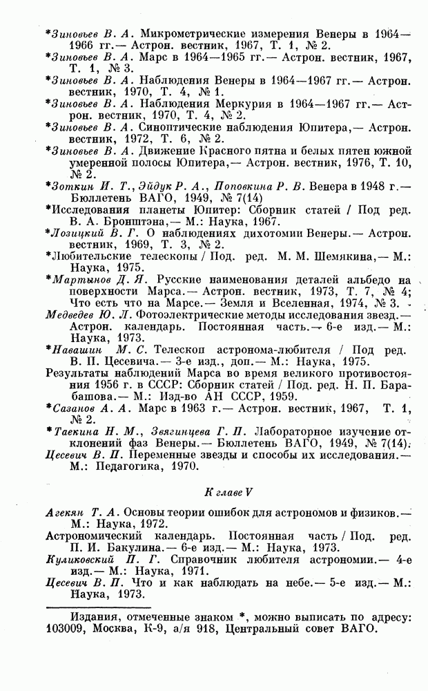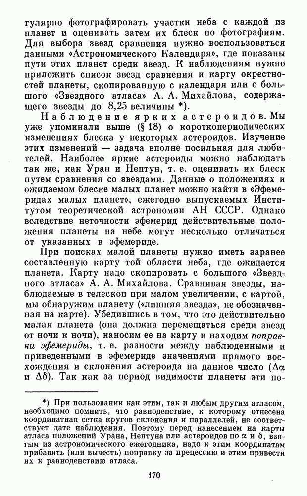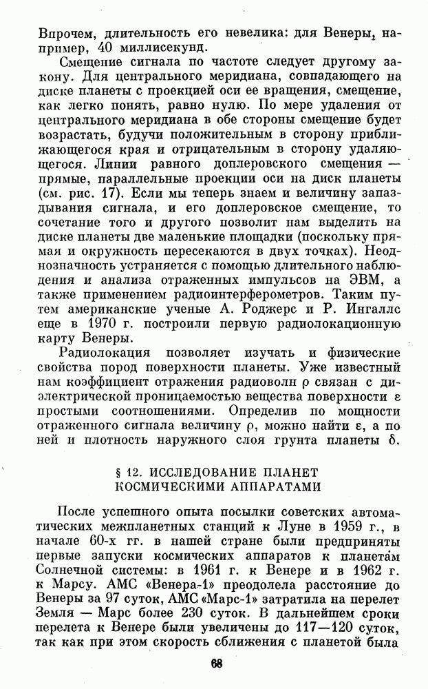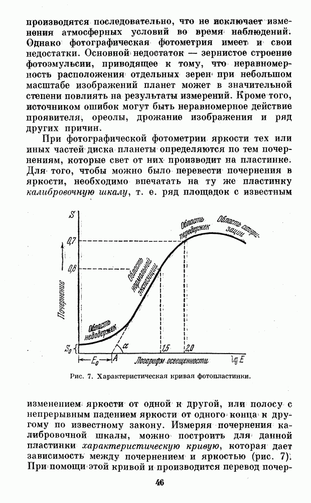 ГЛАВА V. ОБРАБОТКА НАБЛЮДЕНИЙ§ 31. ЧТО ТАКОЕ ОБРАБОТКА НАБЛЮДЕНИЙМы уже говорили в § 20 о бессмысленности «наблюдений ради наблюдений». Чтобы наблюдения могли принести пользу науке и дать какой-нибудь научный результат, их необходимо подвергнуть обработке. Обработка имеет целью обобщение и истолкование наблюдаемых фактов и явлений, суммирование результатов отдельных наблюдений, сравнение и сопоставление этих наблюдений друг с другом. Так как при обработке наблюдений приходится производить вычисления, важно, чтобы обрабатывающий имел необходимую математическую подготовку. В большинстве случаев достаточна подготовка в объеме полной средней школы, а в тех случаях, когда методы обработки выходят за рамки курса средней школы, они могут быть легко изучены всяким, прошедшим этот курс. К таким методам относятся интерполирование, корреляция, способ наименьших квадратов и некоторые другие. Интерполирование ставит своей задачей по двум или нескольким значениям какой-нибудь переменной величины (функции), изменяющейся в зависимости от другой переменной величины (аргумента), найти значения функции для промежуточных значений аргумента. Чаще всего аргументом является время, т. е. требуется по ряду значений функции для заданных моментов t найти ее значения для промежуточных моментов. Наиболее простой случай интерполирования имеет место, когда функция изменяется линейно, т.е. равным изменениям аргумента соответствуют равные между собой изменения функции. П При линейном интерполировании задача решается с помощью пропорций. В более общем случае требуется применение специальных интерполяционных формул, на которых мы здесь останавливаться не будем, отсылая читателя к Постоянной части «Астрономического Календаря» (6-е изд.- М.: Наука, 1973) или к книге П. Г. Куликовского «Справочник любителя астрономии» (4-е изд.- М.: Наука, 1971, с. 206). Там же читатель прочтет и о методе экстраполирования, когда функция ищется не для промежуточного значения аргумента, а для предыдущего или последующего по сравнению с данными. Корреляция преследует цель найти степень зависимости одной величины от другой или убедиться в отсутствии такой зависимости. Если коэффициент корреляции по абсолютной величине равен 1, то мы имеем дело с функциональной зависимостью; если он равен 0, зависимость отсутствует. О вычислении коэффициентов корреляции также можно прочесть в Постоянной части «Астрономического Календаря». Способ наименьших квадратов широко применяется при обработке наблюдений, когда из многих наблюдений нужно найти наиболее вероятные значения искомых величин. Изложение способа наименьших квадратов выходит за рамки этой книги, и мы отсылаем читателя к двум указанным выше книгам. Упрощенное решение той же задачи достигается при помощи способа Коши, который будет изложен в § 34. Кроме этих общих приемов обработки наблюдений, применяемых не только в астрономии, но и во многих других областях науки, при обработке наблюдений планет применяются в каждом случае специфические приемы, которые будут изложены ниже. Всякая обработка наблюдений планет состоит из двух частей: обработки отдельных наблюдений (например, измерения координат деталей, фазы планеты и т. д.) и окончательной обработки, в которой результаты отдельных наблюдений объединяются, сравниваются и обо