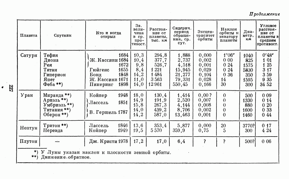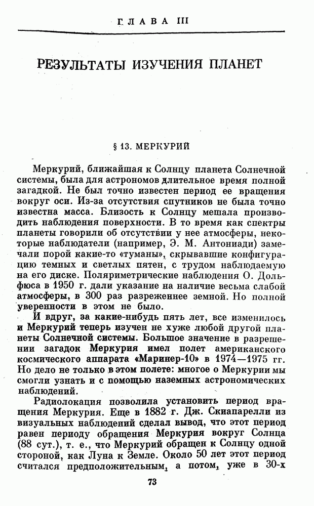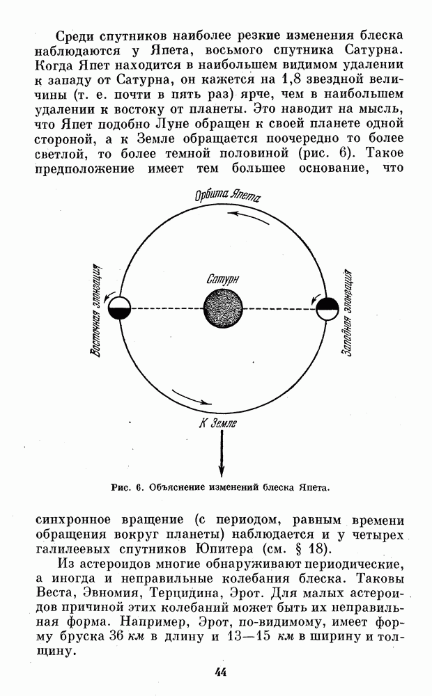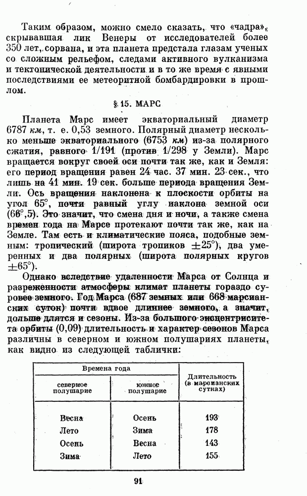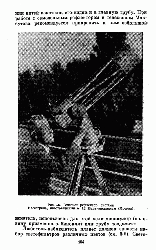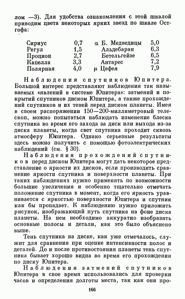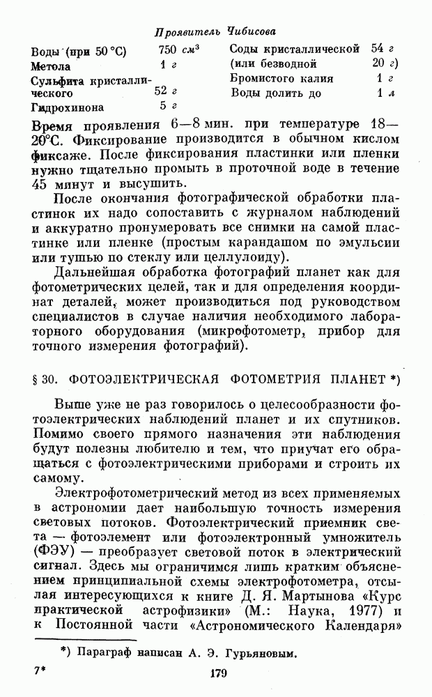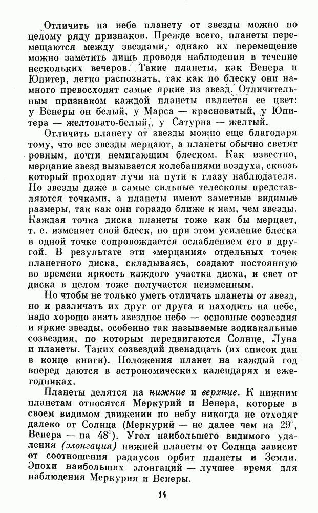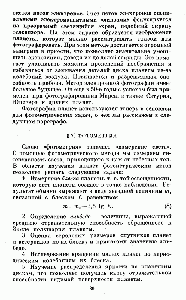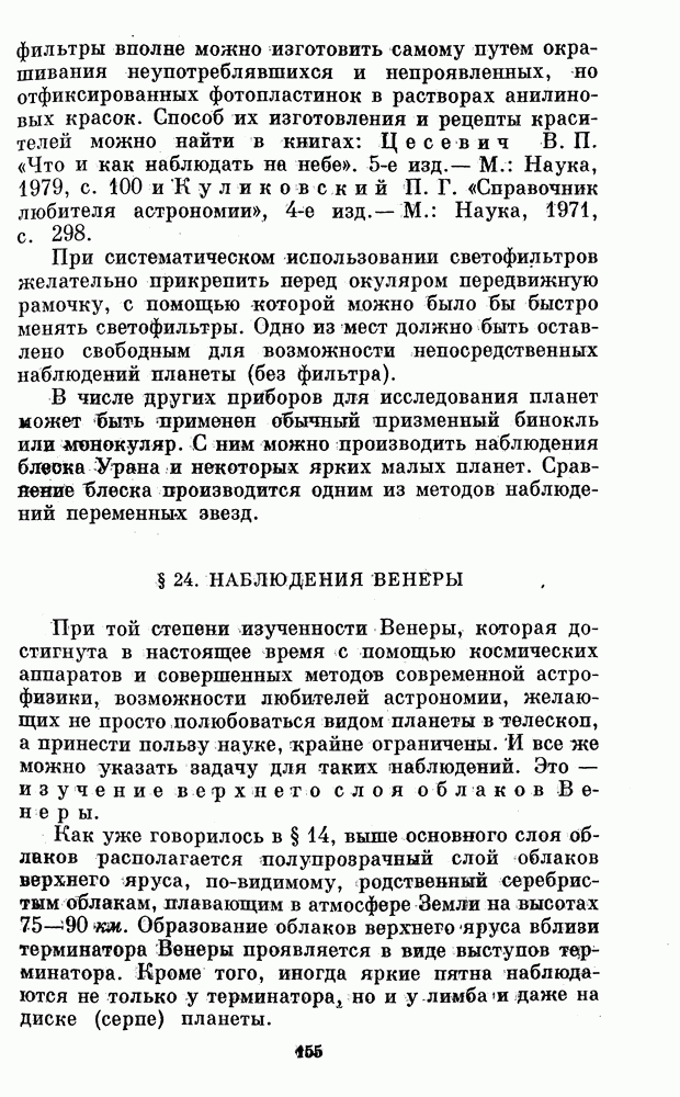 ГЛАВА V. ОБРАБОТКА НАБЛЮДЕНИЙ§ 31. ЧТО ТАКОЕ ОБРАБОТКА НАБЛЮДЕНИЙМы уже говорили в § 20 о бессмысленности «наблюдений ради наблюдений». Чтобы наблюдения могли принести пользу науке и дать какой-нибудь научный результат, их необходимо подвергнуть обработке. Обработка имеет целью обобщение и истолкование наблюдаемых фактов и явлений, суммирование результатов отдельных наблюдений, сравнение и сопоставление этих наблюдений друг с другом. Так как при обработке наблюдений приходится производить вычисления, важно, чтобы обрабатывающий имел необходимую математическую подготовку. В большинстве случаев достаточна подготовка в объеме полной средней школы, а в тех случаях, когда методы обработки выходят за рамки курса средней школы, они могут быть легко изучены всяким, прошедшим этот курс. К таким методам относятся интерполирование, корреляция, способ наименьших квадратов и некоторые другие. Интерполирование ставит своей задачей по двум или нескольким значениям какой-нибудь переменной величины (функции), изменяющейся в зависимости от другой переменной величины (аргумента), найти значения функции для промежуточных значений аргумента. Чаще всего аргументом является время, т. е. требуется по ряду значений функции для заданных моментов t найти ее значения для промежуточных моментов. Наиболее простой случай интерполирования имеет место, когда функция изменяется линейно, т.е. равным изменениям аргумента соответствуют равные между собой изменения функции. П При линейном интерполировании задача решается с помощью пропорций. В более общем случае требуется применение специальных интерполяционных формул, на которых мы здесь останавливаться не будем, отсылая читателя к Постоянной части «Астрономического Календаря» (6-е изд.- М.: Наука, 1973) или к книге П. Г. Куликовского «Справочник любителя астрономии» (4-е изд.- М.: Наука, 1971, с. 206). Там же читатель прочтет и о методе экстраполирования, когда функция ищется не для промежуточного значения аргумента, а для предыдущего или последующего по сравнению с данными. Корреляция преследует цель найти степень зависимости одной величины от другой или убедиться в отсутствии такой зависимости. Если коэффициент корреляции по абсолютной величине равен 1, то мы имеем дело с функциональной зависимостью; если он равен 0, зависимость отсутствует. О вычислении коэффициентов корреляции также можно прочесть в Постоянной части «Астрономического Календаря». Способ наименьших квадратов широко применяется при обработке наблюдений, когда из многих наблюдений нужно найти наиболее вероятные значения искомых величин. Изложение способа наименьших квадратов выходит за рамки этой книги, и мы отсылаем читателя к двум указанным выше книгам. Упрощенное решение той же задачи достигается при помощи способа Коши, который будет изложен в § 34. Кроме этих общих приемов обработки наблюдений, применяемых не только в астрономии, но и во многих других областях науки, при обработке наблюдений планет применяются в каждом случае специфические приемы, которые будут изложены ниже. Всякая обработка наблюдений планет состоит из двух частей: обработки отдельных наблюдений (например, измерения координат деталей, фазы планеты и т. д.) и окончательной обработки, в которой результаты отдельных наблюдений объединяются, сравниваются и обо