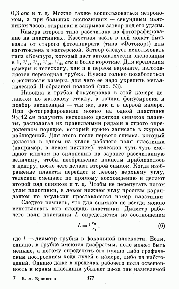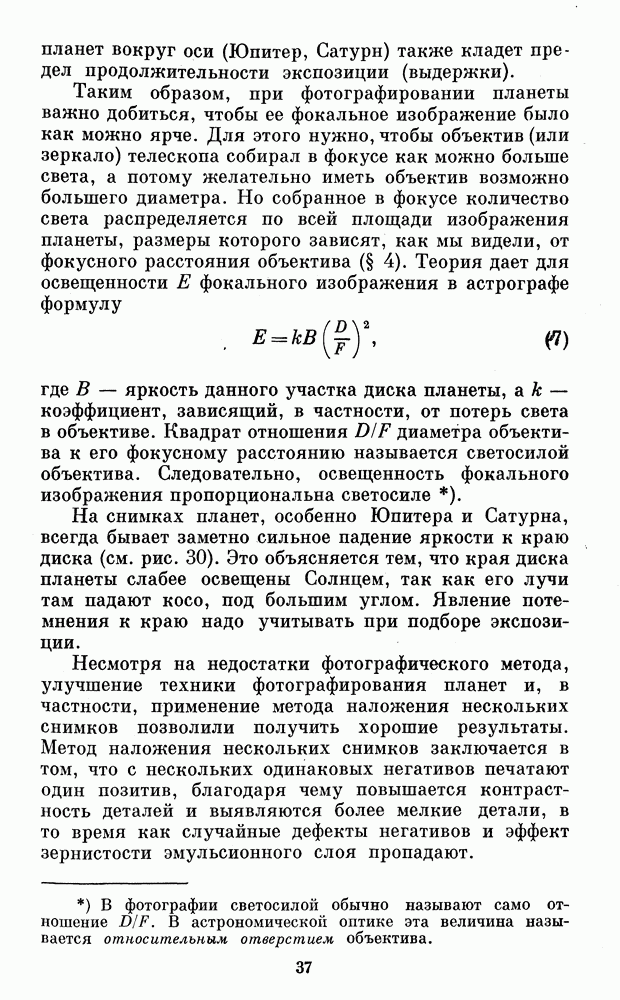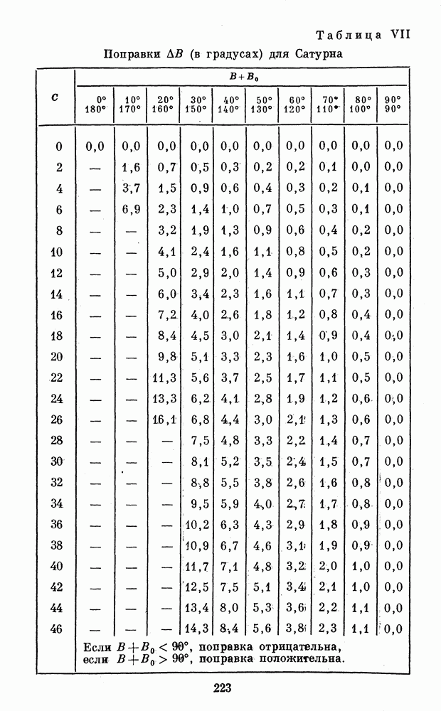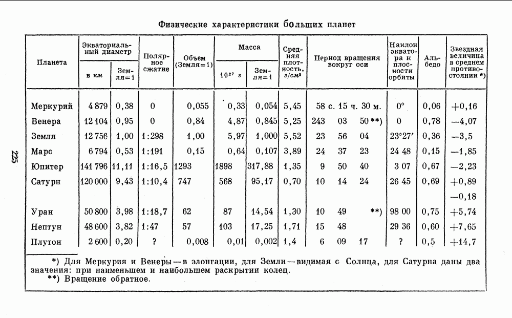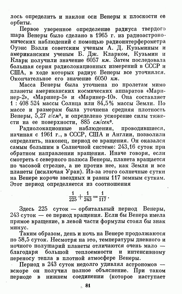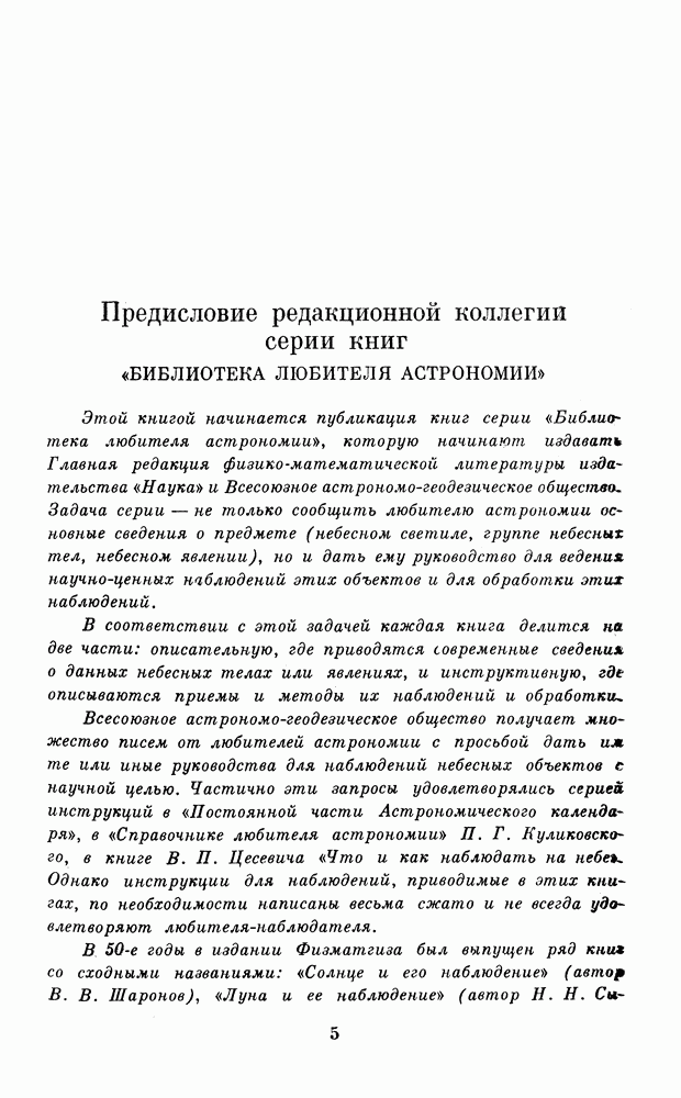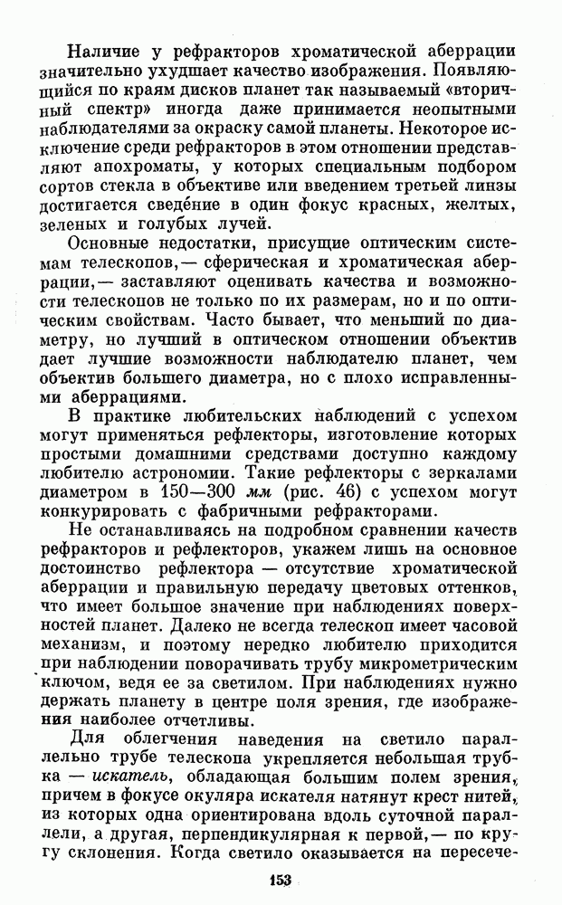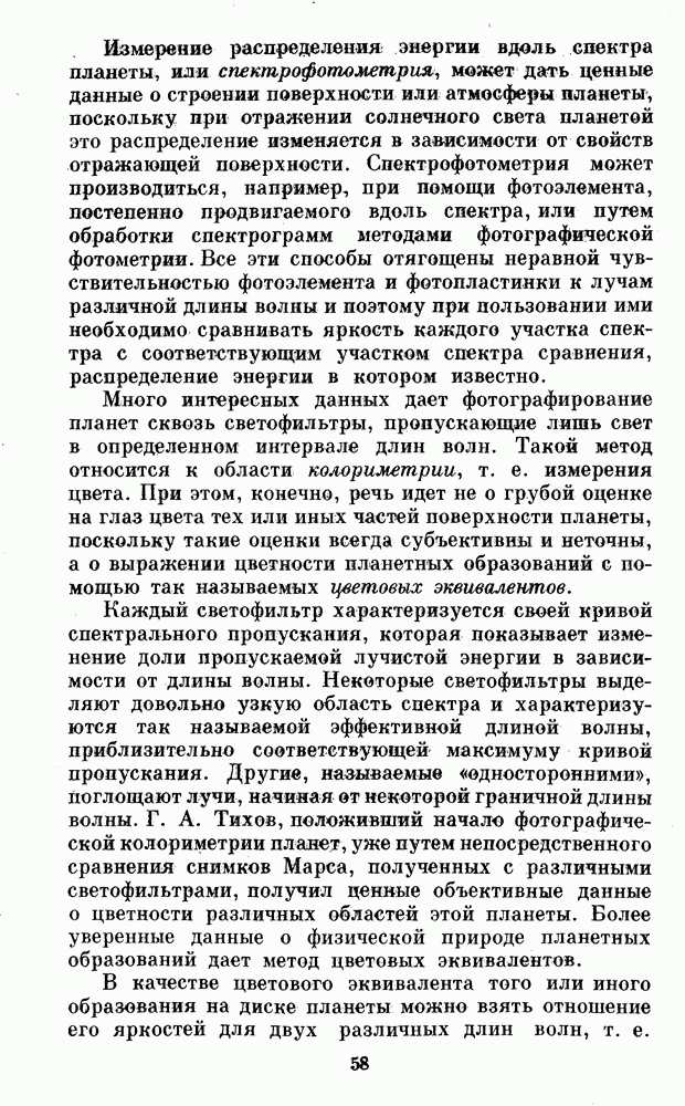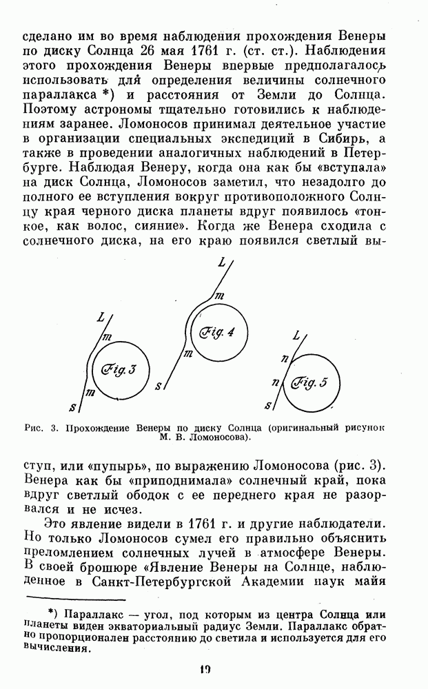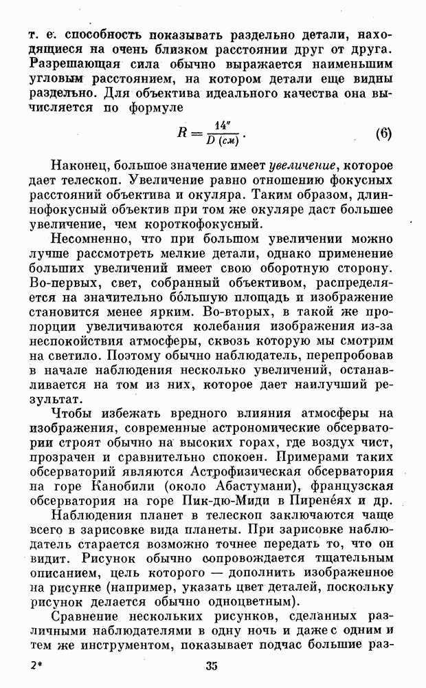 ГЛАВА V. ОБРАБОТКА НАБЛЮДЕНИЙ§ 31. ЧТО ТАКОЕ ОБРАБОТКА НАБЛЮДЕНИЙМы уже говорили в § 20 о бессмысленности «наблюдений ради наблюдений». Чтобы наблюдения могли принести пользу науке и дать какой-нибудь научный результат, их необходимо подвергнуть обработке. Обработка имеет целью обобщение и истолкование наблюдаемых фактов и явлений, суммирование результатов отдельных наблюдений, сравнение и сопоставление этих наблюдений друг с другом. Так как при обработке наблюдений приходится производить вычисления, важно, чтобы обрабатывающий имел необходимую математическую подготовку. В большинстве случаев достаточна подготовка в объеме полной средней школы, а в тех случаях, когда методы обработки выходят за рамки курса средней школы, они могут быть легко изучены всяким, прошедшим этот курс. К таким методам относятся интерполирование, корреляция, способ наименьших квадратов и некоторые другие. Интерполирование ставит своей задачей по двум или нескольким значениям какой-нибудь переменной величины (функции), изменяющейся в зависимости от другой переменной величины (аргумента), найти значения функции для промежуточных значений аргумента. Чаще всего аргументом является время, т. е. требуется по ряду значений функции для заданных моментов t найти ее значения для промежуточных моментов. Наиболее простой случай интерполирования имеет место, когда функция изменяется линейно, т.е. равным изменениям аргумента соответствуют равные между собой изменения функции. П При линейном интерполировании задача решается с помощью пропорций. В более общем случае требуется применение специальных интерполяционных формул, на которых мы здесь останавливаться не будем, отсылая читателя к Постоянной части «Астрономического Календаря» (6-е изд.- М.: Наука, 1973) или к книге П. Г. Куликовского «Справочник любителя астрономии» (4-е изд.- М.: Наука, 1971, с. 206). Там же читатель прочтет и о методе экстраполирования, когда функция ищется не для промежуточного значения аргумента, а для предыдущего или последующего по сравнению с данными. Корреляция преследует цель найти степень зависимости одной величины от другой или убедиться в отсутствии такой зависимости. Если коэффициент корреляции по абсолютной величине равен 1, то мы имеем дело с функциональной зависимостью; если он равен 0, зависимость отсутствует. О вычислении коэффициентов корреляции также можно прочесть в Постоянной части «Астрономического Календаря». Способ наименьших квадратов широко применяется при обработке наблюдений, когда из многих наблюдений нужно найти наиболее вероятные значения искомых величин. Изложение способа наименьших квадратов выходит за рамки этой книги, и мы отсылаем читателя к двум указанным выше книгам. Упрощенное решение той же задачи достигается при помощи способа Коши, который будет изложен в § 34. Кроме этих общих приемов обработки наблюдений, применяемых не только в астрономии, но и во многих других областях науки, при обработке наблюдений планет применяются в каждом случае специфические приемы, которые будут изложены ниже. Всякая обработка наблюдений планет состоит из двух частей: обработки отдельных наблюдений (например, измерения координат деталей, фазы планеты и т. д.) и окончательной обработки, в которой результаты отдельных наблюдений объединяются, сравниваются и обо