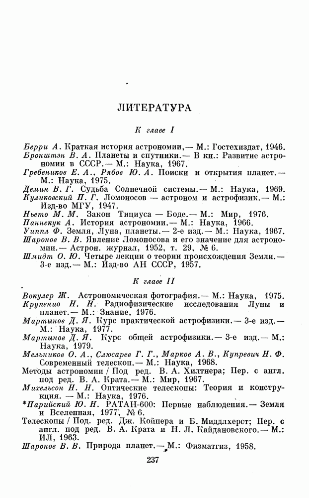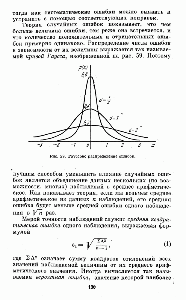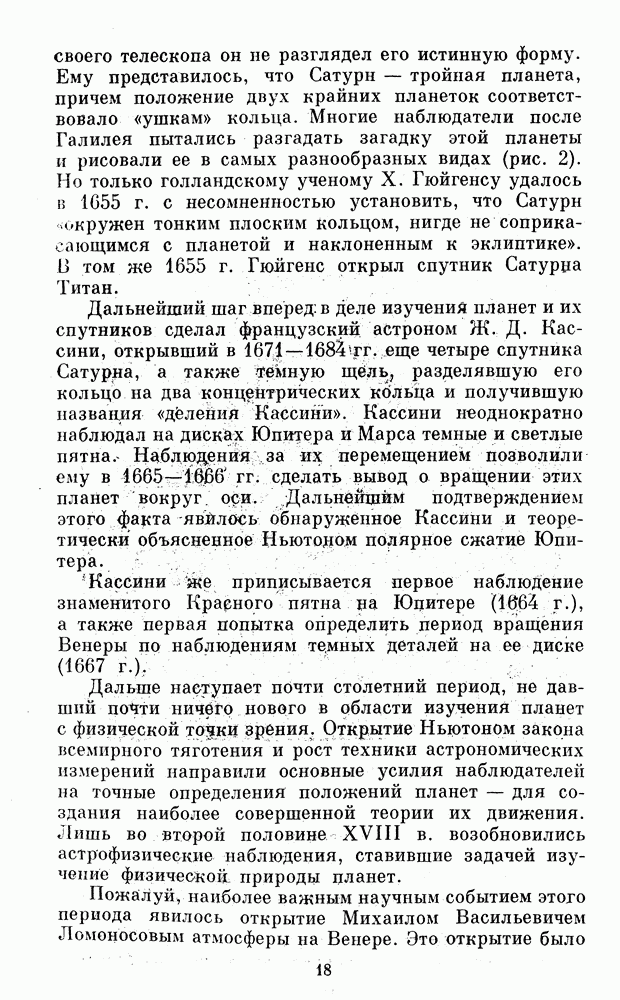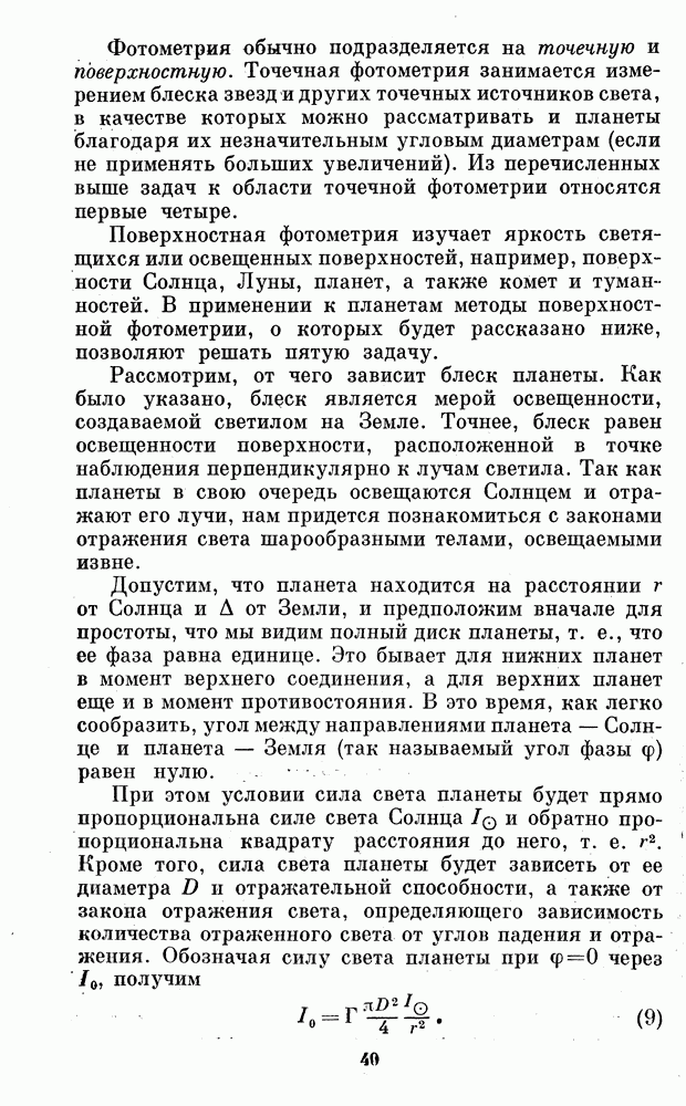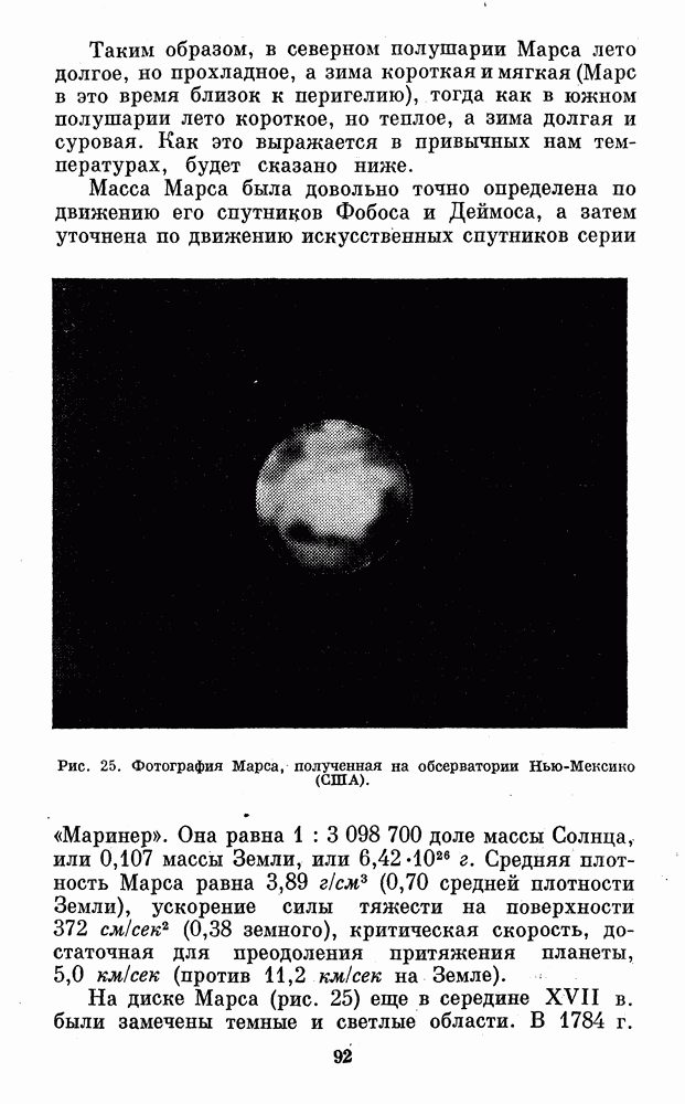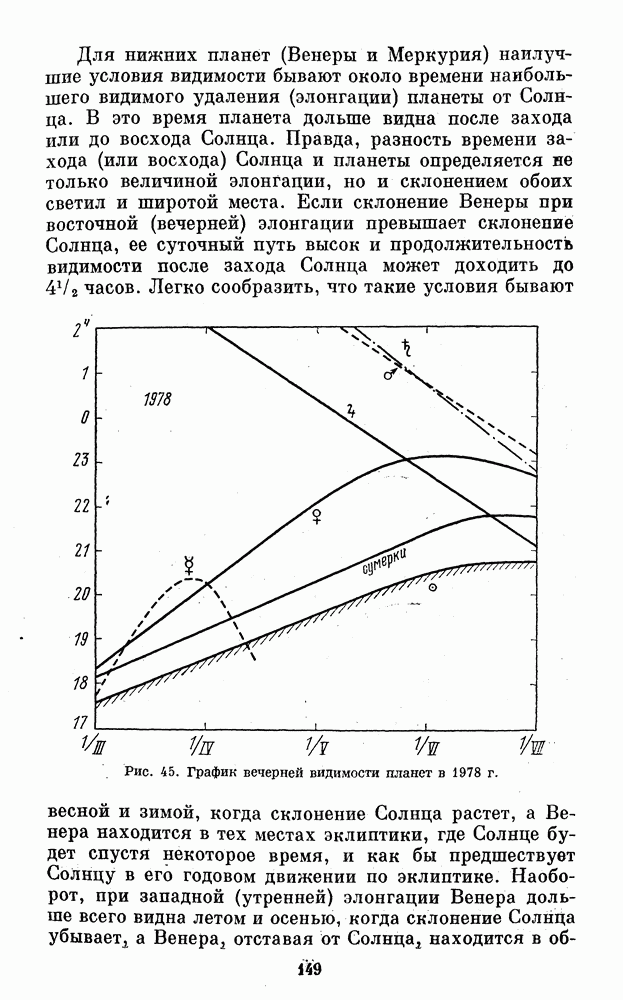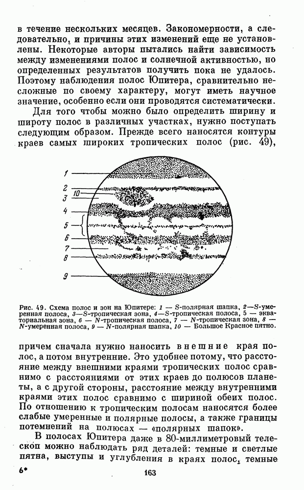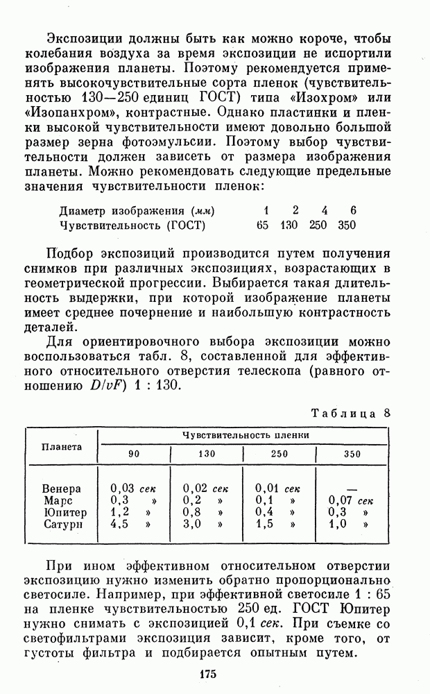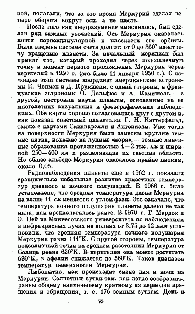 ГЛАВА V. ОБРАБОТКА НАБЛЮДЕНИЙ§ 31. ЧТО ТАКОЕ ОБРАБОТКА НАБЛЮДЕНИЙМы уже говорили в § 20 о бессмысленности «наблюдений ради наблюдений». Чтобы наблюдения могли принести пользу науке и дать какой-нибудь научный результат, их необходимо подвергнуть обработке. Обработка имеет целью обобщение и истолкование наблюдаемых фактов и явлений, суммирование результатов отдельных наблюдений, сравнение и сопоставление этих наблюдений друг с другом. Так как при обработке наблюдений приходится производить вычисления, важно, чтобы обрабатывающий имел необходимую математическую подготовку. В большинстве случаев достаточна подготовка в объеме полной средней школы, а в тех случаях, когда методы обработки выходят за рамки курса средней школы, они могут быть легко изучены всяким, прошедшим этот курс. К таким методам относятся интерполирование, корреляция, способ наименьших квадратов и некоторые другие. Интерполирование ставит своей задачей по двум или нескольким значениям какой-нибудь переменной величины (функции), изменяющейся в зависимости от другой переменной величины (аргумента), найти значения функции для промежуточных значений аргумента. Чаще всего аргументом является время, т. е. требуется по ряду значений функции для заданных моментов t найти ее значения для промежуточных моментов. Наиболее простой случай интерполирования имеет место, когда функция изменяется линейно, т.е. равным изменениям аргумента соответствуют равные между собой изменения функции. П При линейном интерполировании задача решается с помощью пропорций. В более общем случае требуется применение специальных интерполяционных формул, на которых мы здесь останавливаться не будем, отсылая читателя к Постоянной части «Астрономического Календаря» (6-е изд.- М.: Наука, 1973) или к книге П. Г. Куликовского «Справочник любителя астрономии» (4-е изд.- М.: Наука, 1971, с. 206). Там же читатель прочтет и о методе экстраполирования, когда функция ищется не для промежуточного значения аргумента, а для предыдущего или последующего по сравнению с данными. Корреляция преследует цель найти степень зависимости одной величины от другой или убедиться в отсутствии такой зависимости. Если коэффициент корреляции по абсолютной величине равен 1, то мы имеем дело с функциональной зависимостью; если он равен 0, зависимость отсутствует. О вычислении коэффициентов корреляции также можно прочесть в Постоянной части «Астрономического Календаря». Способ наименьших квадратов широко применяется при обработке наблюдений, когда из многих наблюдений нужно найти наиболее вероятные значения искомых величин. Изложение способа наименьших квадратов выходит за рамки этой книги, и мы отсылаем читателя к двум указанным выше книгам. Упрощенное решение той же задачи достигается при помощи способа Коши, который будет изложен в § 34. Кроме этих общих приемов обработки наблюдений, применяемых не только в астрономии, но и во многих других областях науки, при обработке наблюдений планет применяются в каждом случае специфические приемы, которые будут изложены ниже. Всякая обработка наблюдений планет состоит из двух частей: обработки отдельных наблюдений (например, измерения координат деталей, фазы планеты и т. д.) и окончательной обработки, в которой результаты отдельных наблюдений объединяются, сравниваются и обо