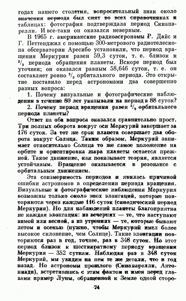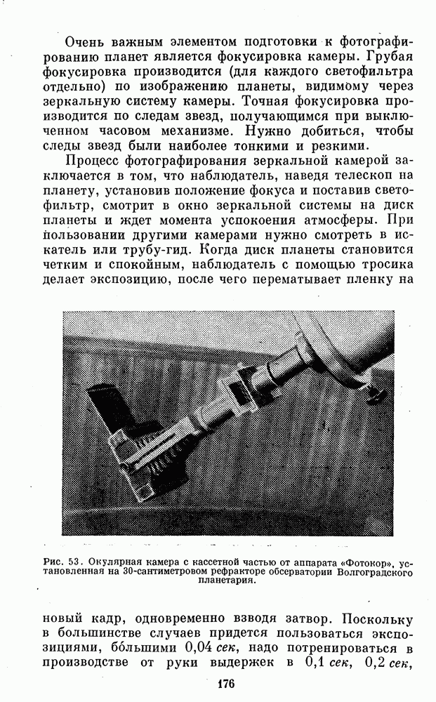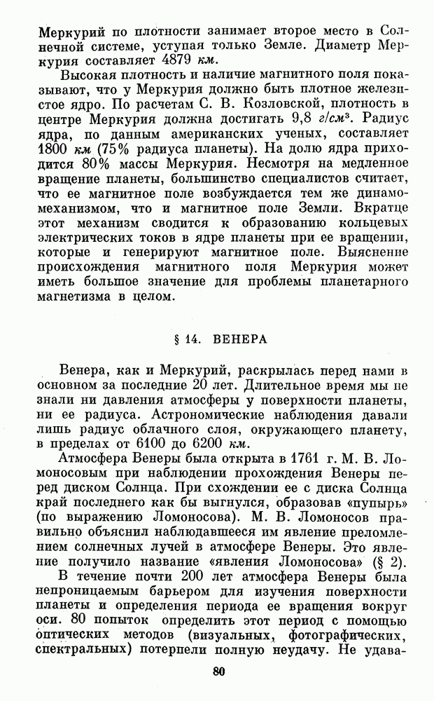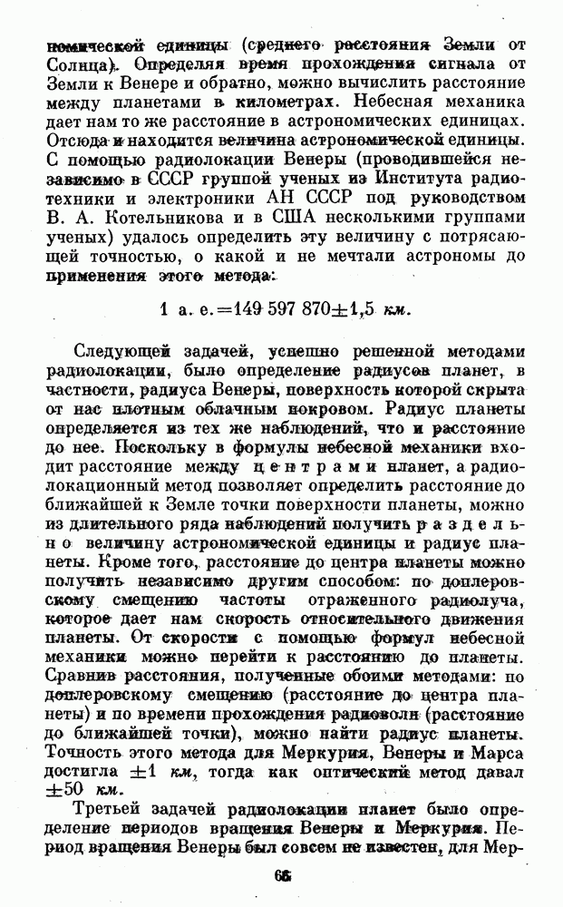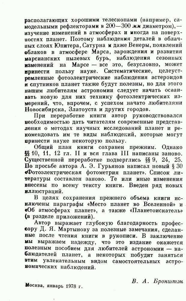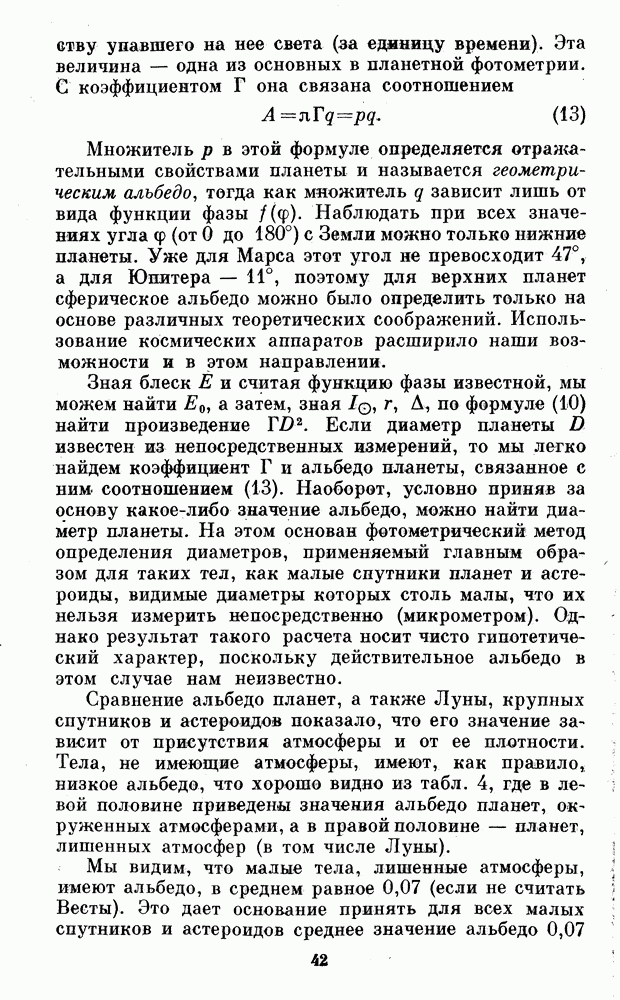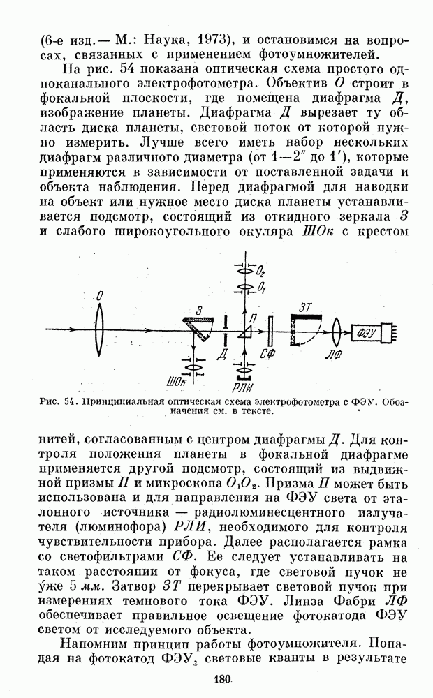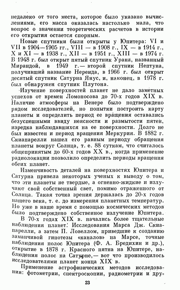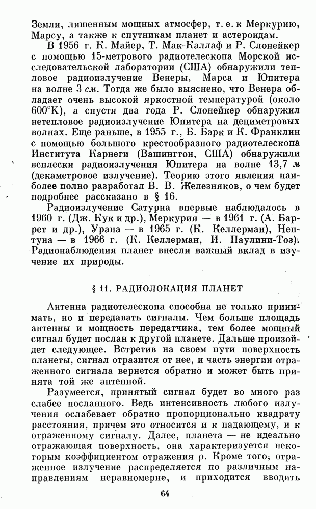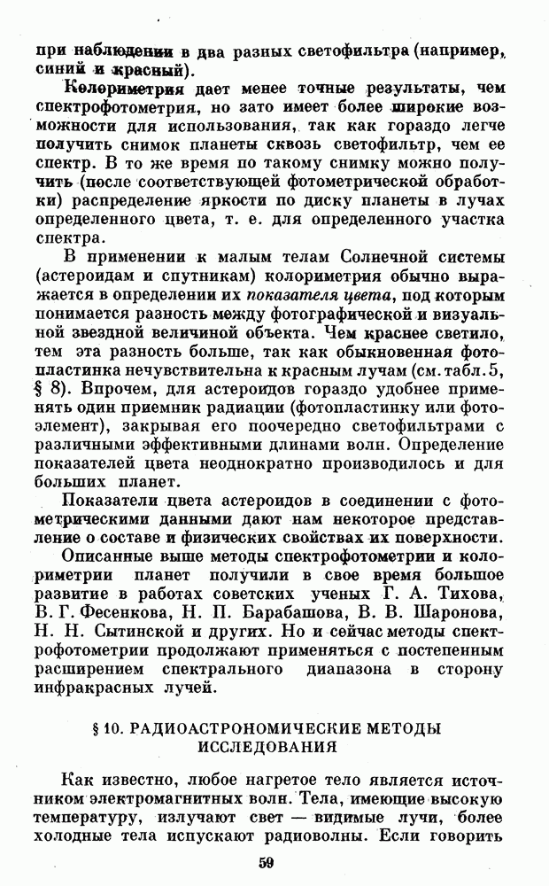 ГЛАВА V. ОБРАБОТКА НАБЛЮДЕНИЙ§ 31. ЧТО ТАКОЕ ОБРАБОТКА НАБЛЮДЕНИЙМы уже говорили в § 20 о бессмысленности «наблюдений ради наблюдений». Чтобы наблюдения могли принести пользу науке и дать какой-нибудь научный результат, их необходимо подвергнуть обработке. Обработка имеет целью обобщение и истолкование наблюдаемых фактов и явлений, суммирование результатов отдельных наблюдений, сравнение и сопоставление этих наблюдений друг с другом. Так как при обработке наблюдений приходится производить вычисления, важно, чтобы обрабатывающий имел необходимую математическую подготовку. В большинстве случаев достаточна подготовка в объеме полной средней школы, а в тех случаях, когда методы обработки выходят за рамки курса средней школы, они могут быть легко изучены всяким, прошедшим этот курс. К таким методам относятся интерполирование, корреляция, способ наименьших квадратов и некоторые другие. Интерполирование ставит своей задачей по двум или нескольким значениям какой-нибудь переменной величины (функции), изменяющейся в зависимости от другой переменной величины (аргумента), найти значения функции для промежуточных значений аргумента. Чаще всего аргументом является время, т. е. требуется по ряду значений функции для заданных моментов t найти ее значения для промежуточных моментов. Наиболее простой случай интерполирования имеет место, когда функция изменяется линейно, т.е. равным изменениям аргумента соответствуют равные между собой изменения функции. П При линейном интерполировании задача решается с помощью пропорций. В более общем случае требуется применение специальных интерполяционных формул, на которых мы здесь останавливаться не будем, отсылая читателя к Постоянной части «Астрономического Календаря» (6-е изд.- М.: Наука, 1973) или к книге П. Г. Куликовского «Справочник любителя астрономии» (4-е изд.- М.: Наука, 1971, с. 206). Там же читатель прочтет и о методе экстраполирования, когда функция ищется не для промежуточного значения аргумента, а для предыдущего или последующего по сравнению с данными. Корреляция преследует цель найти степень зависимости одной величины от другой или убедиться в отсутствии такой зависимости. Если коэффициент корреляции по абсолютной величине равен 1, то мы имеем дело с функциональной зависимостью; если он равен 0, зависимость отсутствует. О вычислении коэффициентов корреляции также можно прочесть в Постоянной части «Астрономического Календаря». Способ наименьших квадратов широко применяется при обработке наблюдений, когда из многих наблюдений нужно найти наиболее вероятные значения искомых величин. Изложение способа наименьших квадратов выходит за рамки этой книги, и мы отсылаем читателя к двум указанным выше книгам. Упрощенное решение той же задачи достигается при помощи способа Коши, который будет изложен в § 34. Кроме этих общих приемов обработки наблюдений, применяемых не только в астрономии, но и во многих других областях науки, при обработке наблюдений планет применяются в каждом случае специфические приемы, которые будут изложены ниже. Всякая обработка наблюдений планет состоит из двух частей: обработки отдельных наблюдений (например, измерения координат деталей, фазы планеты и т. д.) и окончательной обработки, в которой результаты отдельных наблюдений объединяются, сравниваются и обо