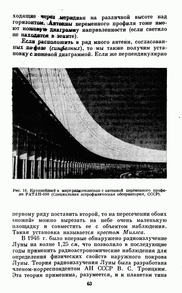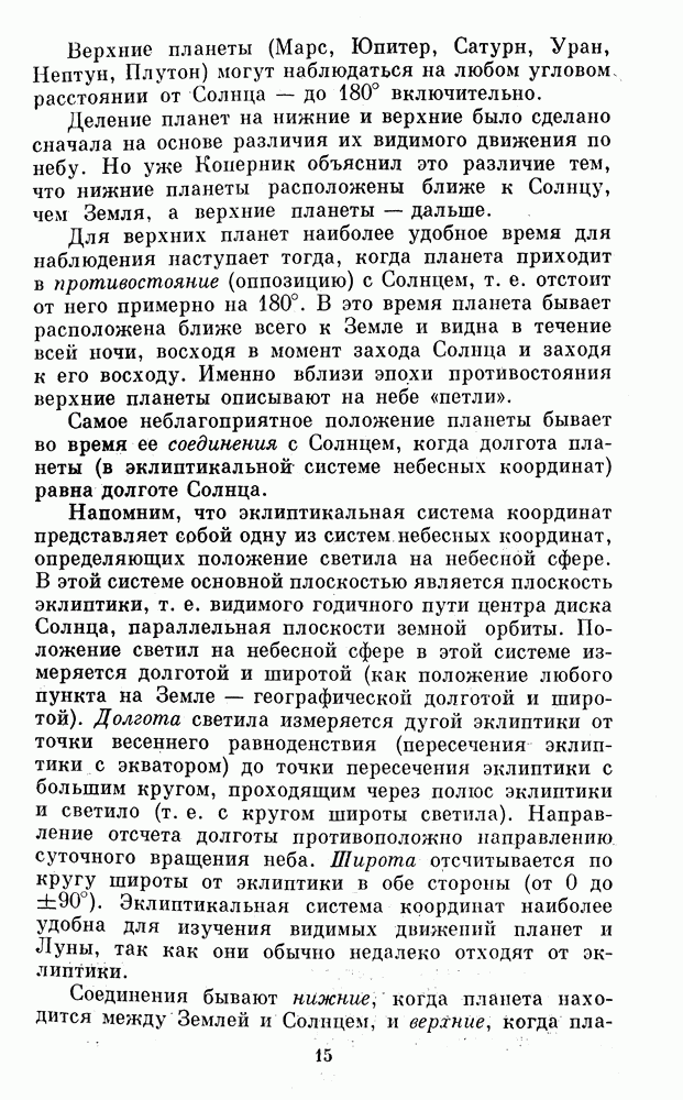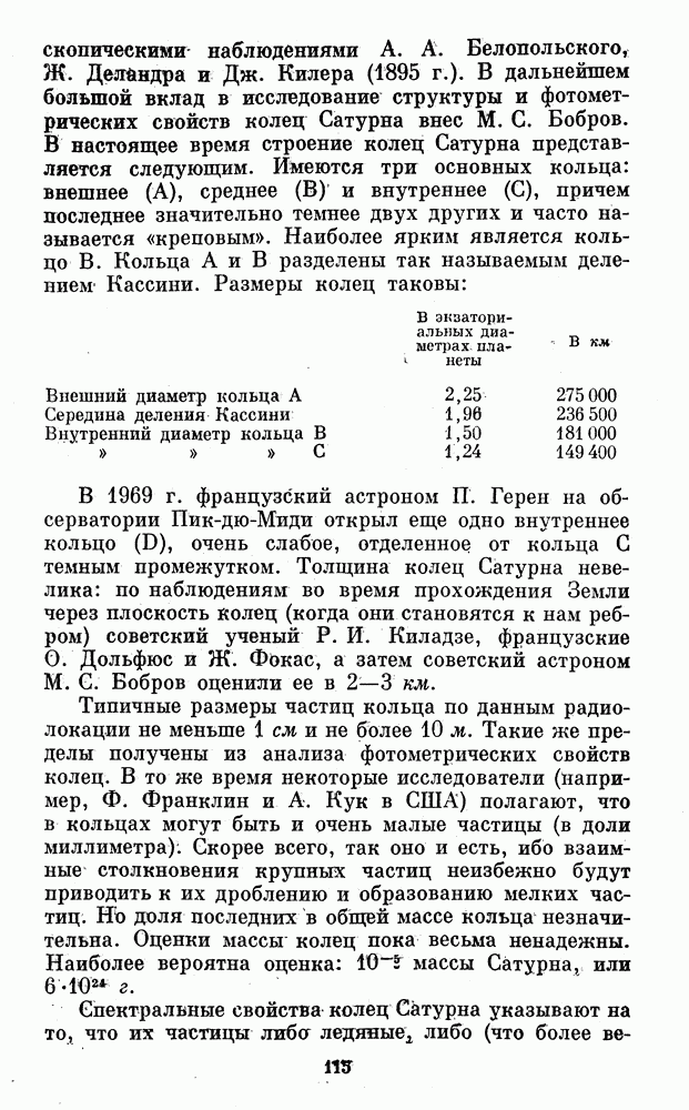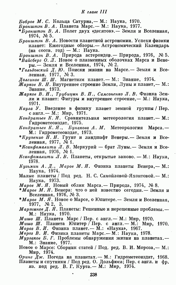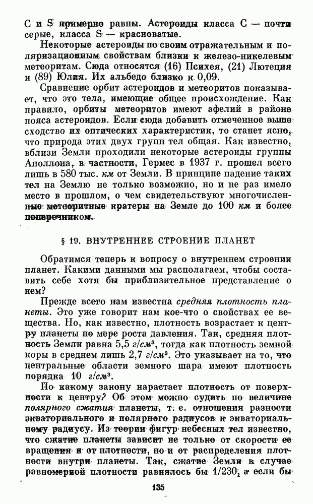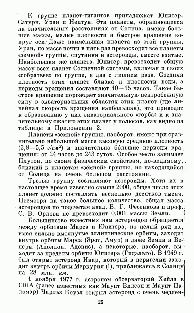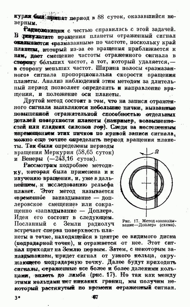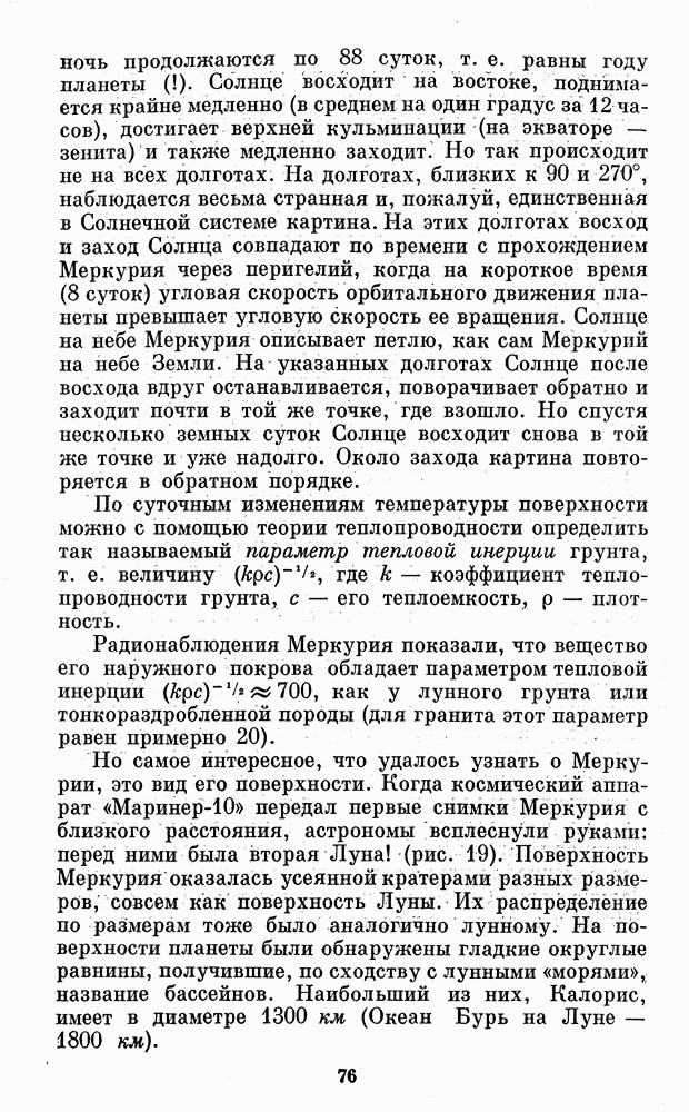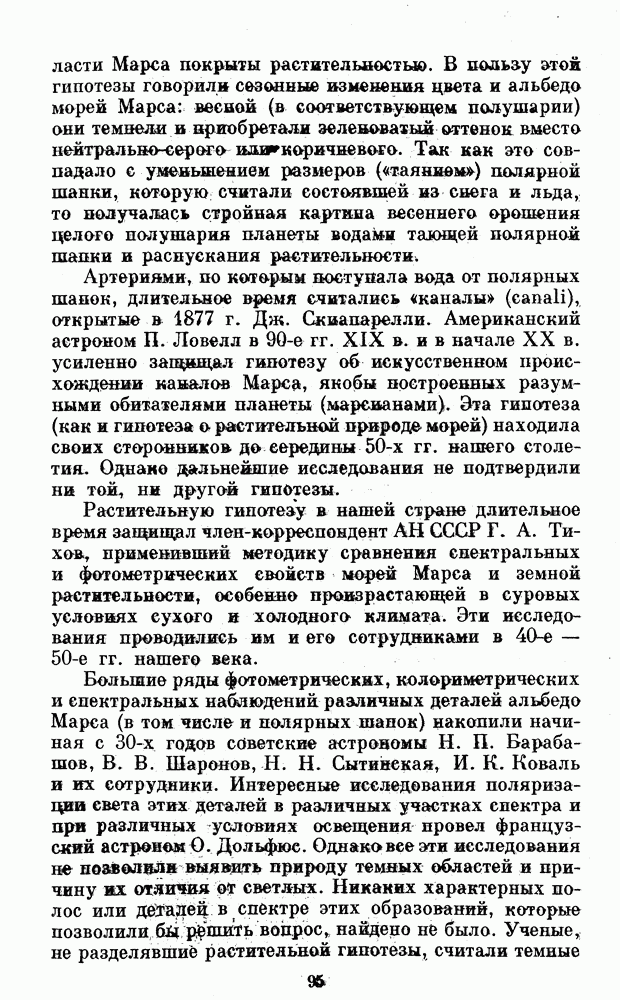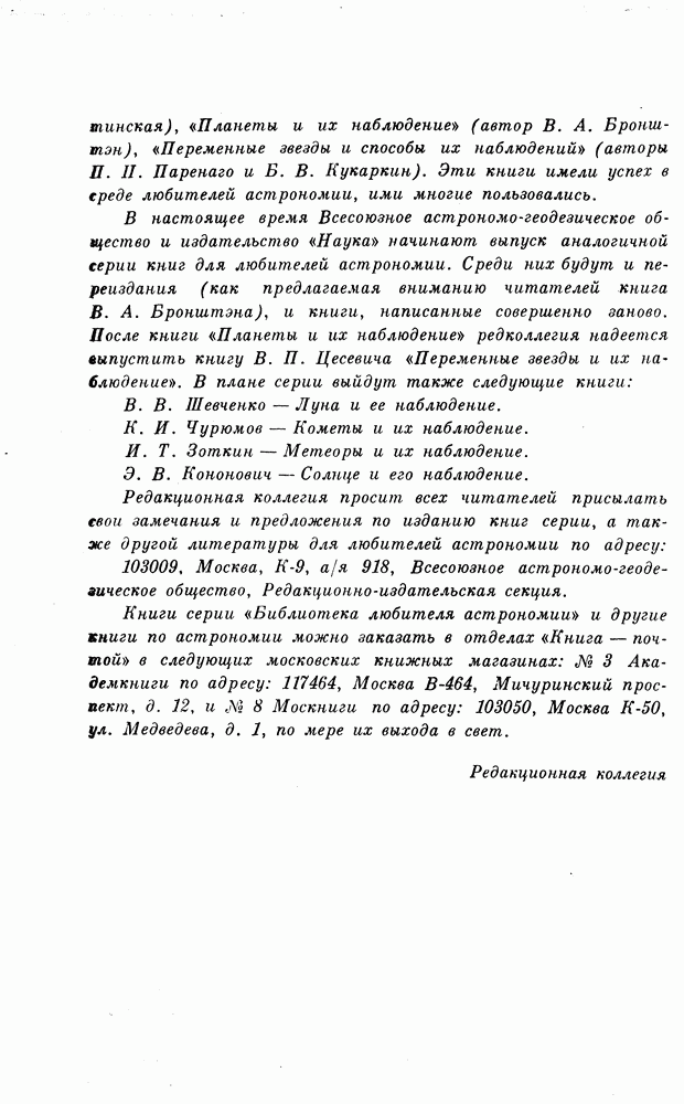 ГЛАВА V. ОБРАБОТКА НАБЛЮДЕНИЙ§ 31. ЧТО ТАКОЕ ОБРАБОТКА НАБЛЮДЕНИЙМы уже говорили в § 20 о бессмысленности «наблюдений ради наблюдений». Чтобы наблюдения могли принести пользу науке и дать какой-нибудь научный результат, их необходимо подвергнуть обработке. Обработка имеет целью обобщение и истолкование наблюдаемых фактов и явлений, суммирование результатов отдельных наблюдений, сравнение и сопоставление этих наблюдений друг с другом. Так как при обработке наблюдений приходится производить вычисления, важно, чтобы обрабатывающий имел необходимую математическую подготовку. В большинстве случаев достаточна подготовка в объеме полной средней школы, а в тех случаях, когда методы обработки выходят за рамки курса средней школы, они могут быть легко изучены всяким, прошедшим этот курс. К таким методам относятся интерполирование, корреляция, способ наименьших квадратов и некоторые другие. Интерполирование ставит своей задачей по двум или нескольким значениям какой-нибудь переменной величины (функции), изменяющейся в зависимости от другой переменной величины (аргумента), найти значения функции для промежуточных значений аргумента. Чаще всего аргументом является время, т. е. требуется по ряду значений функции для заданных моментов t найти ее значения для промежуточных моментов. Наиболее простой случай интерполирования имеет место, когда функция изменяется линейно, т.е. равным изменениям аргумента соответствуют равные между собой изменения функции. П При линейном интерполировании задача решается с помощью пропорций. В более общем случае требуется применение специальных интерполяционных формул, на которых мы здесь останавливаться не будем, отсылая читателя к Постоянной части «Астрономического Календаря» (6-е изд.- М.: Наука, 1973) или к книге П. Г. Куликовского «Справочник любителя астрономии» (4-е изд.- М.: Наука, 1971, с. 206). Там же читатель прочтет и о методе экстраполирования, когда функция ищется не для промежуточного значения аргумента, а для предыдущего или последующего по сравнению с данными. Корреляция преследует цель найти степень зависимости одной величины от другой или убедиться в отсутствии такой зависимости. Если коэффициент корреляции по абсолютной величине равен 1, то мы имеем дело с функциональной зависимостью; если он равен 0, зависимость отсутствует. О вычислении коэффициентов корреляции также можно прочесть в Постоянной части «Астрономического Календаря». Способ наименьших квадратов широко применяется при обработке наблюдений, когда из многих наблюдений нужно найти наиболее вероятные значения искомых величин. Изложение способа наименьших квадратов выходит за рамки этой книги, и мы отсылаем читателя к двум указанным выше книгам. Упрощенное решение той же задачи достигается при помощи способа Коши, который будет изложен в § 34. Кроме этих общих приемов обработки наблюдений, применяемых не только в астрономии, но и во многих других областях науки, при обработке наблюдений планет применяются в каждом случае специфические приемы, которые будут изложены ниже. Всякая обработка наблюдений планет состоит из двух частей: обработки отдельных наблюдений (например, измерения координат деталей, фазы планеты и т. д.) и окончательной обработки, в которой результаты отдельных наблюдений объединяются, сравниваются и обо