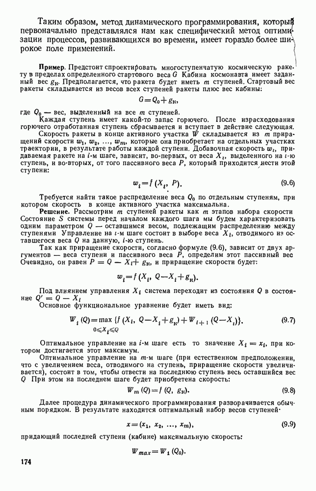 а вся процедура условной и безусловной оптимизации ничем не отличается от той задачи о распределении ресурсов по неоднородным этапам с резервированием, которую мы рассматривали выше, в § 6. Таким образом, метод динамического программирования, который первоначально представлялся нам как специфический метод оптимизации процессов, развивающихся во времени, имеет гораздо более широкое поле применений. Пример. Предстоит спроектировать многоступенчатую космическую ракету в пределах определенного стартового веса G Кабина космонавта имеет заданный вес