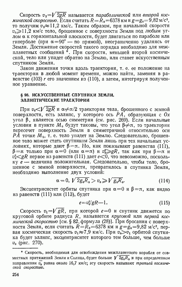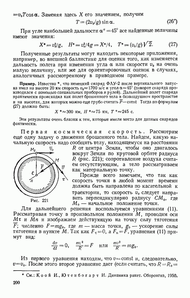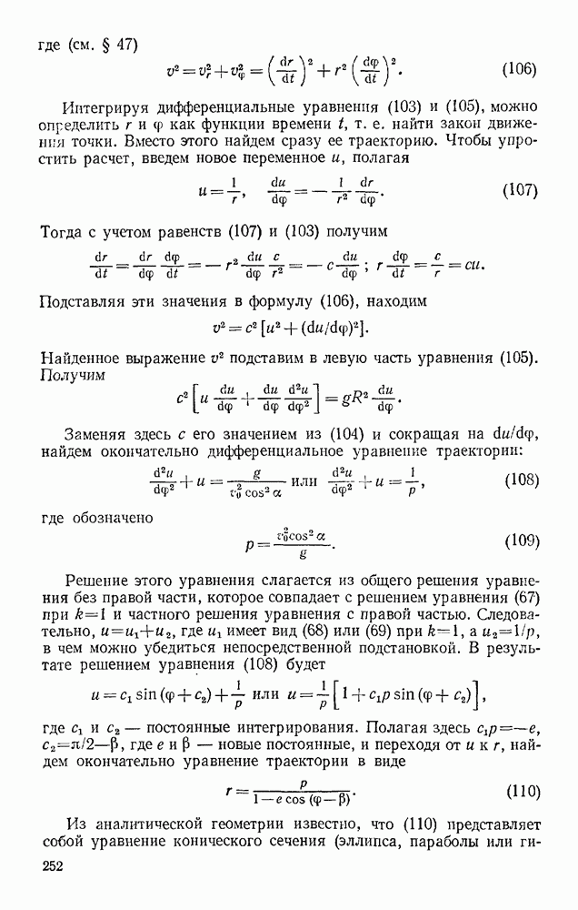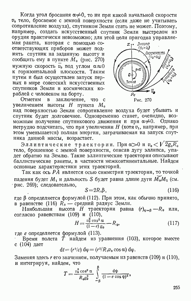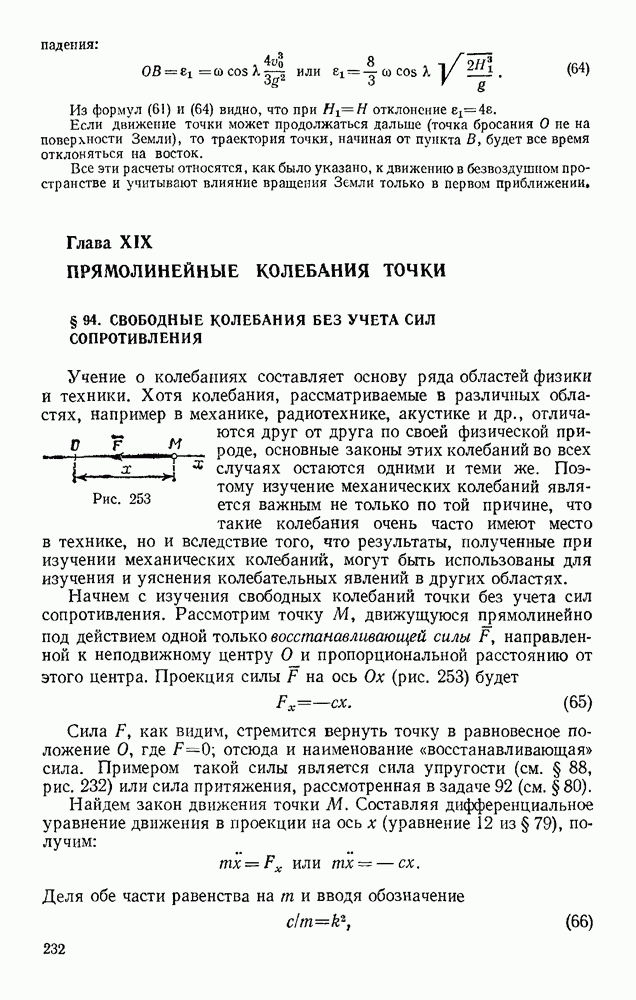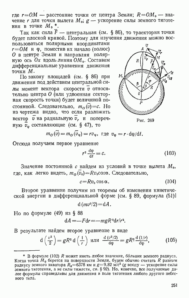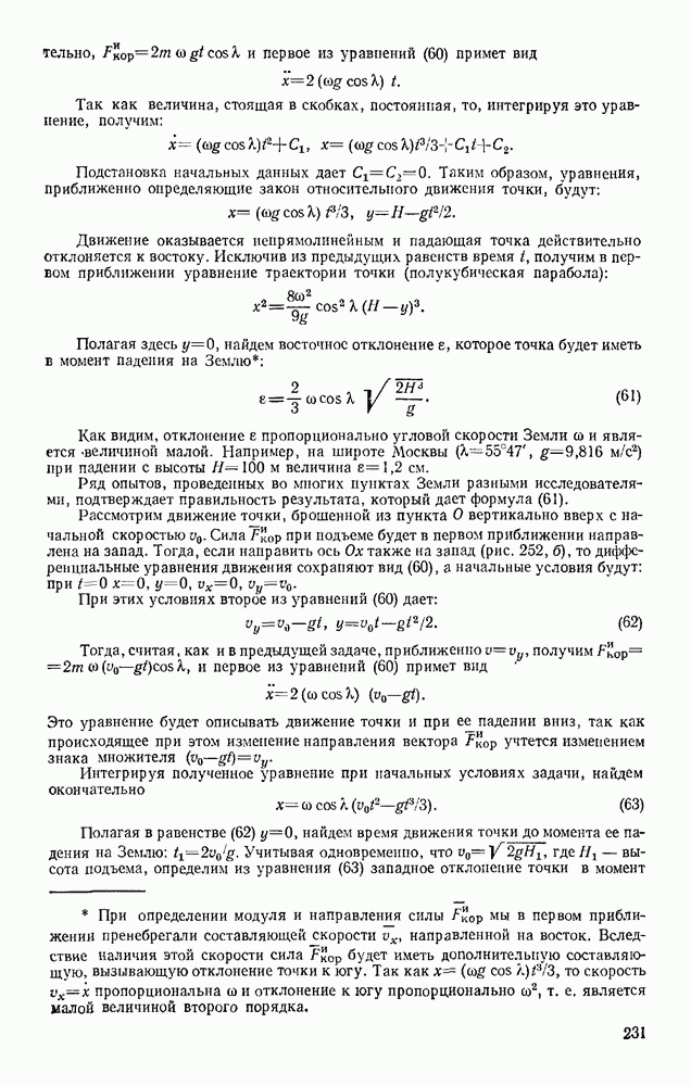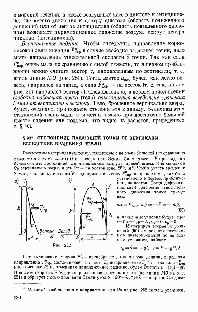 — на восток (т. е. так, как на рис. 251 направлен вектор v). Следовательно, в первом приближении свободно падающая точка (тело) отклоняется вследствие вращения Земли от вертикали к востоку. Тело, брошенное вертикально вверх, будет, очевидно, при подъеме отклоняться к западу. Величины этих отклонений очень малы и заметны только при достаточно большой высоте падения или подъема, что видно из расчетов, приведенных в § 93.