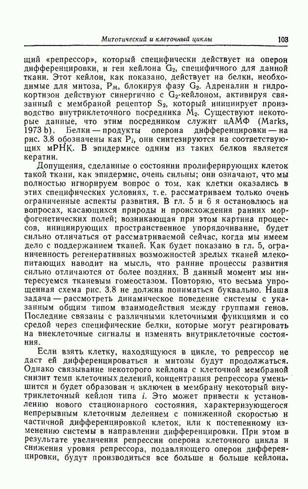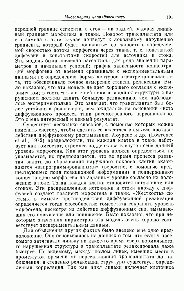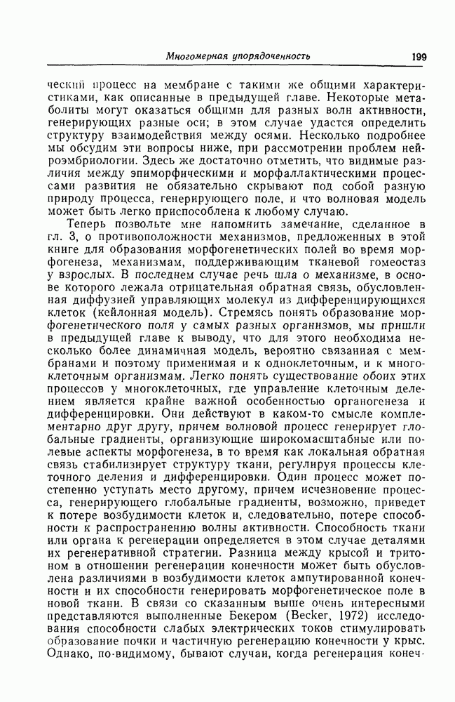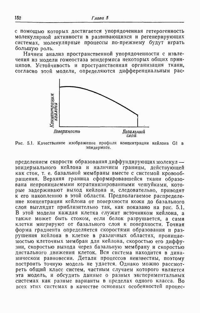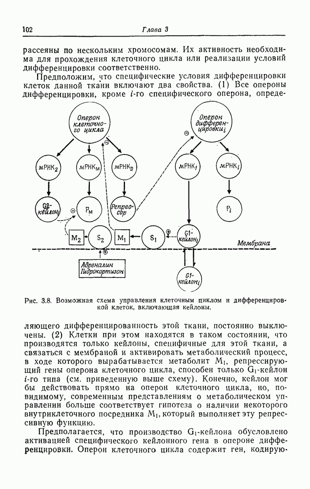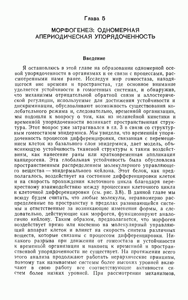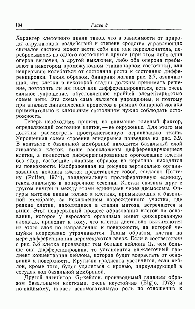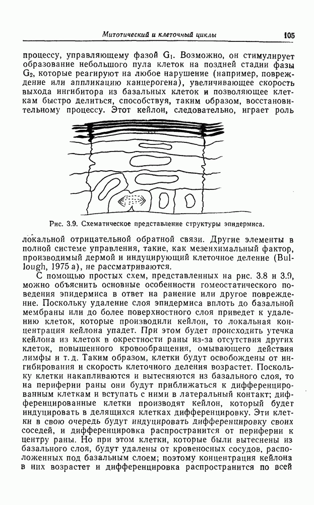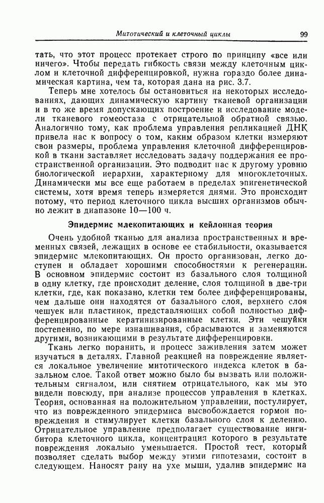 Рис. 3.7. Клеточный цикл эукариотов с ответвлением, ведущим к клеточной дифференцировке У схемы, представленной на рис. 3.7, имеется одна особенность, которая вводит в заблуждение и должна рассматриваться как недостаток: может показаться, что процесс клеточной дифференцировки и клеточный цикл работают по принципу «все или ничего», хотя на самом деле это не так. В течение эмбриогенеза, по мере того как происходят органогенез и клеточная дифференцировка, темп клеточных делений постепенно падает, но промежуточные состояния определенно существуют: частично дифференцированные клетки (миобласты, эритробласты, нейробласты и т. д.) продолжают делиться. Кроме того, четко различимы между собой линии стволовых клеток различных тканей органов у взрослых (тех органов, которые сохраняются в стационарном состоянии путем непрерывного возобновления клеток и дифференцировки, как, например кожа, печень, почка и т. д.), хотя их роль состоит в том, чтобы делиться со скоростью, определяемой некоторыми критериями, характеризующими потребности ткани или органа (используя язык теории управления). Хотя в таких системах клетки, которые в ответ на стимул к дифференцировке покидают стволовую популяцию, изменяют свое состояние, как правило, внезапно, нельзя считать, что этот процесс протекает строго по принципу «все или ничего». Чтобы передать гибкость связи между клеточным циклом и клеточной дифференцировкой, нужна гораздо более динамическая картина, чем та, которая дана на рис. 3.7. Теперь мне хотелось бы остановиться на некоторых исследованиях, дающих динамическую картину тканевой организации и в то же время допускающих построение и исследование модели тканевого гомеостаза с отрицательной обратной связью. Аналогично тому, как проблема управления репликацией ДНК привела нас к вопросу о том, каким образом клетки измеряют свои размеры, проблема управления клеточной дифференцировкой в ткани заставляет исследовать задачу поддержания ее пространственной организации. Это подводит нас к другому уровню биологической иерархии, характерному для многоклеточных. Динамически мы все еще работаем в пределах эпигенетической системы, хотя время теперь измеряется днями. Это происходит потому, что период клеточного цикла высших организмов обычно лежит в диапазоне 10-100 ч.
