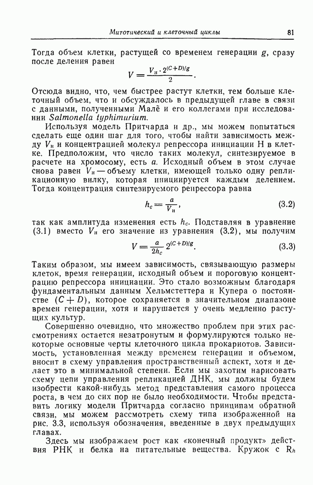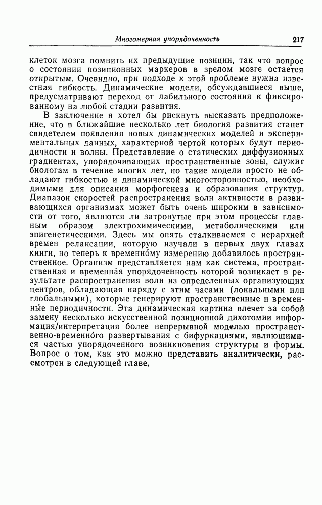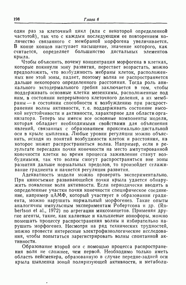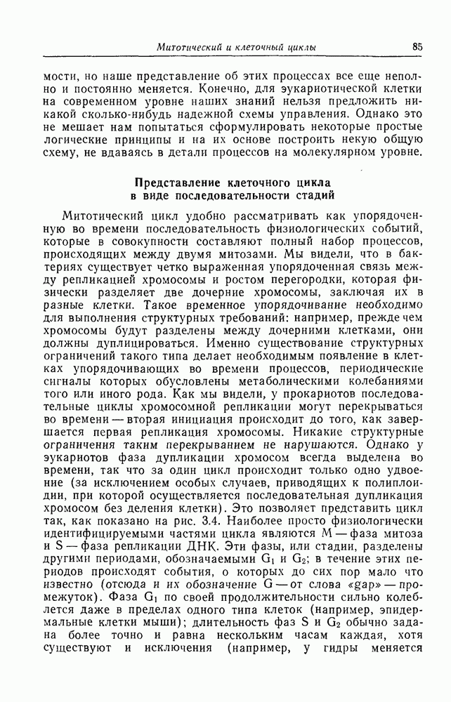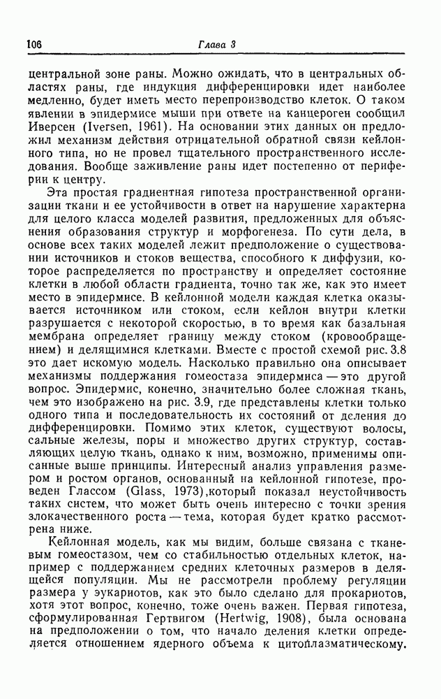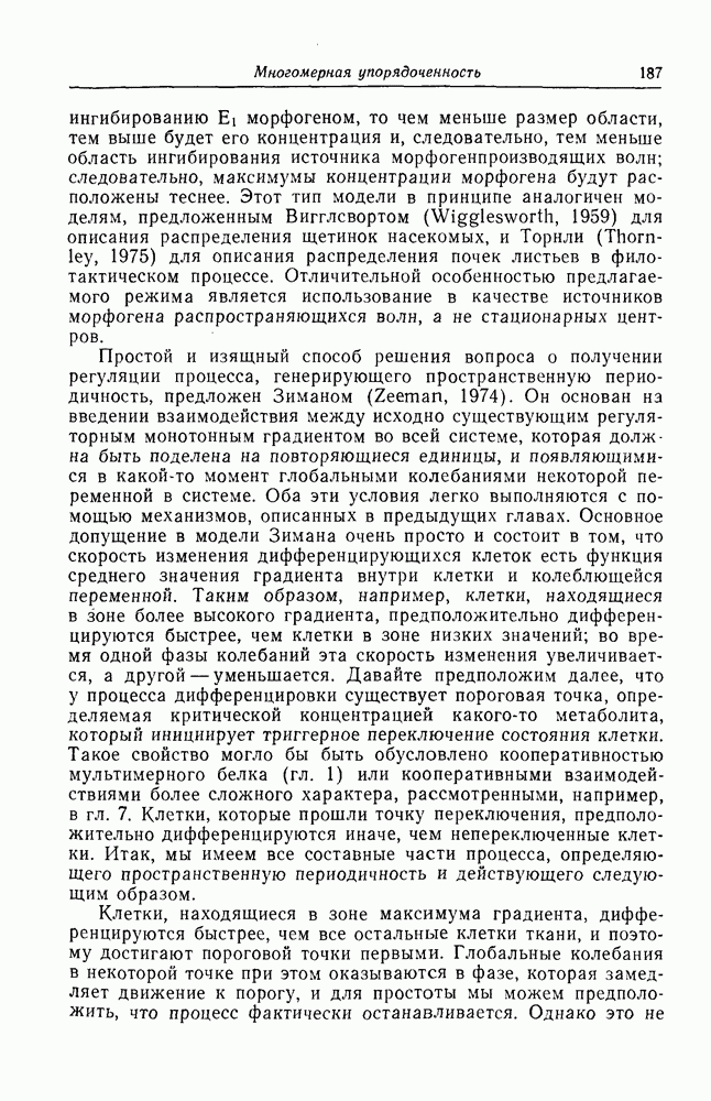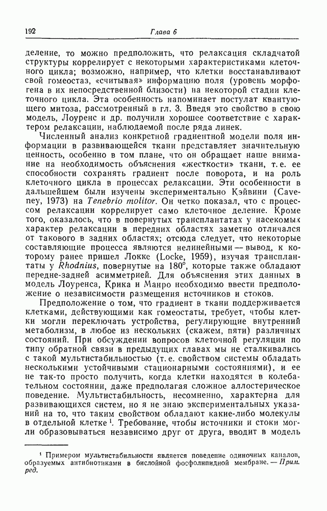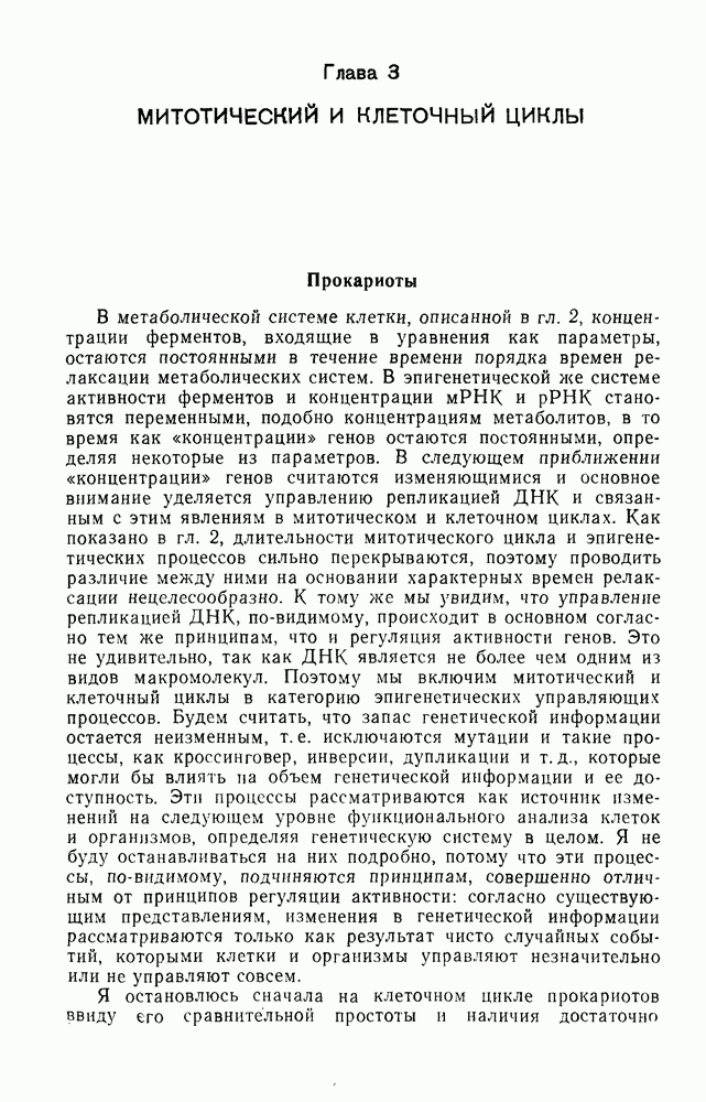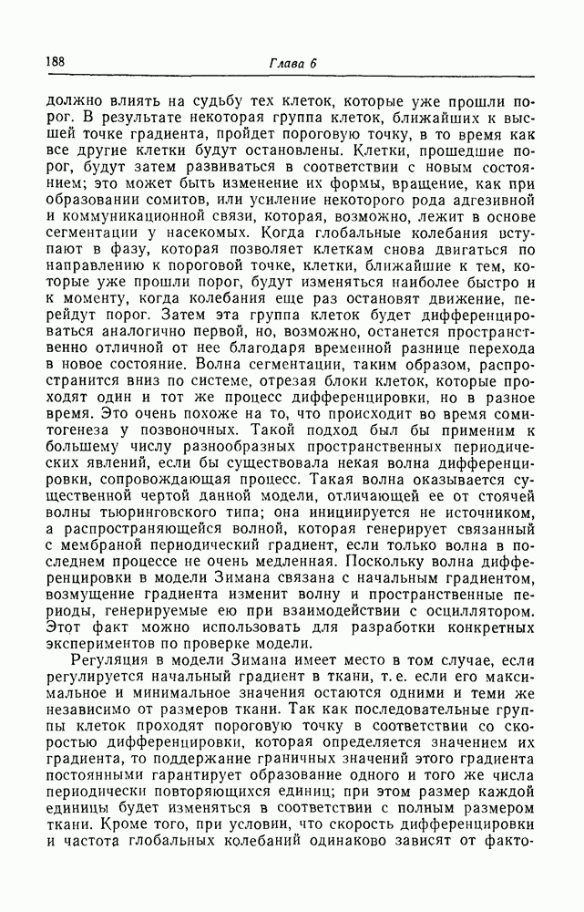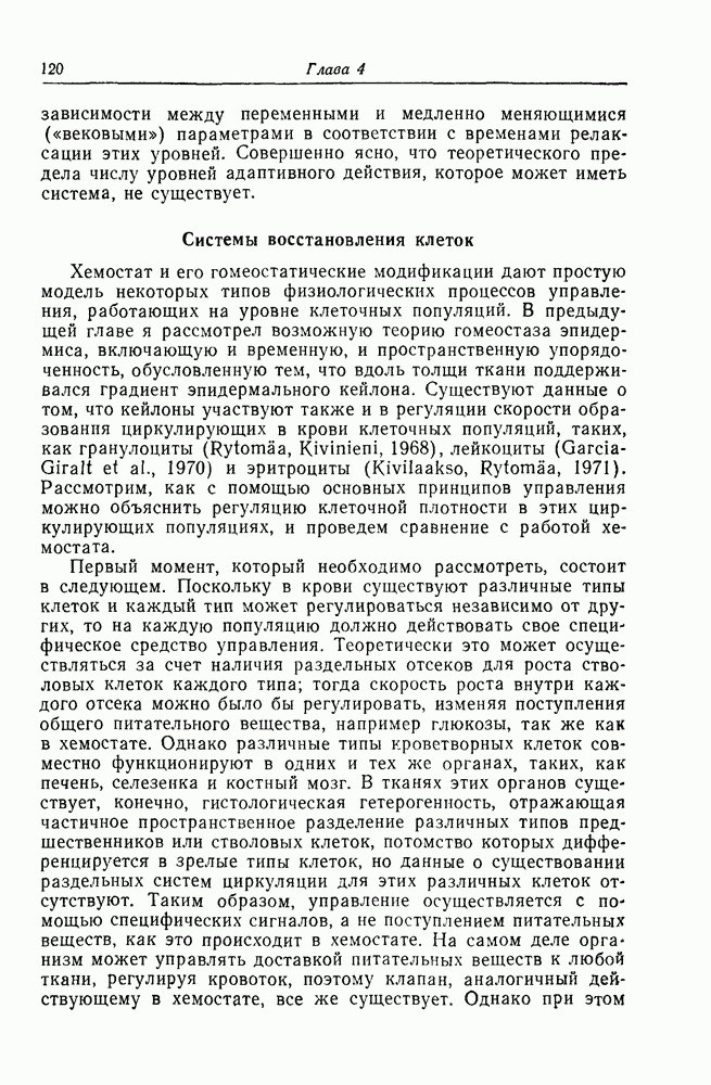 Рис. 3.7. Клеточный цикл эукариотов с ответвлением, ведущим к клеточной дифференцировке У схемы, представленной на рис. 3.7, имеется одна особенность, которая вводит в заблуждение и должна рассматриваться как недостаток: может показаться, что процесс клеточной дифференцировки и клеточный цикл работают по принципу «все или ничего», хотя на самом деле это не так. В течение эмбриогенеза, по мере того как происходят органогенез и клеточная дифференцировка, темп клеточных делений постепенно падает, но промежуточные состояния определенно существуют: частично дифференцированные клетки (миобласты, эритробласты, нейробласты и т. д.) продолжают делиться. Кроме того, четко различимы между собой линии стволовых клеток различных тканей органов у взрослых (тех органов, которые сохраняются в стационарном состоянии путем непрерывного возобновления клеток и дифференцировки, как, например кожа, печень, почка и т. д.), хотя их роль состоит в том, чтобы делиться со скоростью, определяемой некоторыми критериями, характеризующими потребности ткани или органа (используя язык теории управления). Хотя в таких системах клетки, которые в ответ на стимул к дифференцировке покидают стволовую популяцию, изменяют свое состояние, как правило, внезапно, нельзя считать, что этот процесс протекает строго по принципу «все или ничего». Чтобы передать гибкость связи между клеточным циклом и клеточной дифференцировкой, нужна гораздо более динамическая картина, чем та, которая дана на рис. 3.7. Теперь мне хотелось бы остановиться на некоторых исследованиях, дающих динамическую картину тканевой организации и в то же время допускающих построение и исследование модели тканевого гомеостаза с отрицательной обратной связью. Аналогично тому, как проблема управления репликацией ДНК привела нас к вопросу о том, каким образом клетки измеряют свои размеры, проблема управления клеточной дифференцировкой в ткани заставляет исследовать задачу поддержания ее пространственной организации. Это подводит нас к другому уровню биологической иерархии, характерному для многоклеточных. Динамически мы все еще работаем в пределах эпигенетической системы, хотя время теперь измеряется днями. Это происходит потому, что период клеточного цикла высших организмов обычно лежит в диапазоне 10-100 ч.