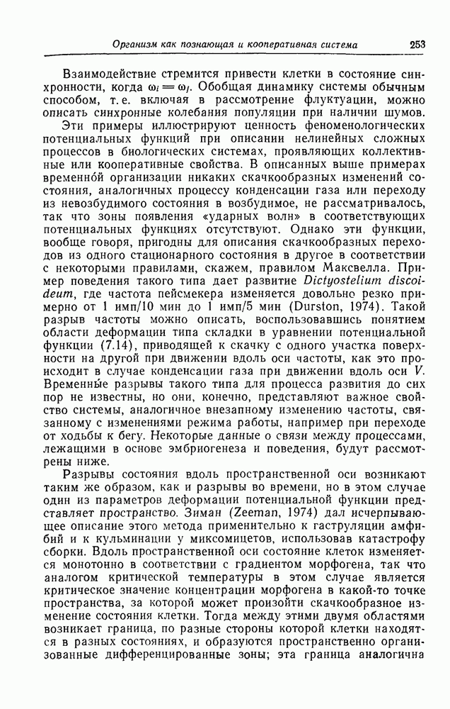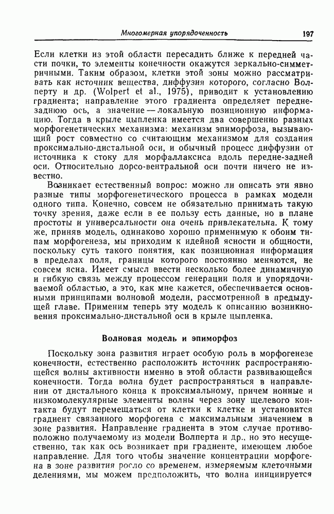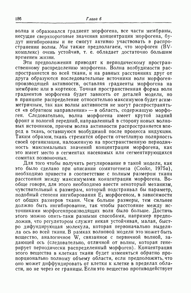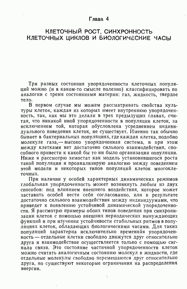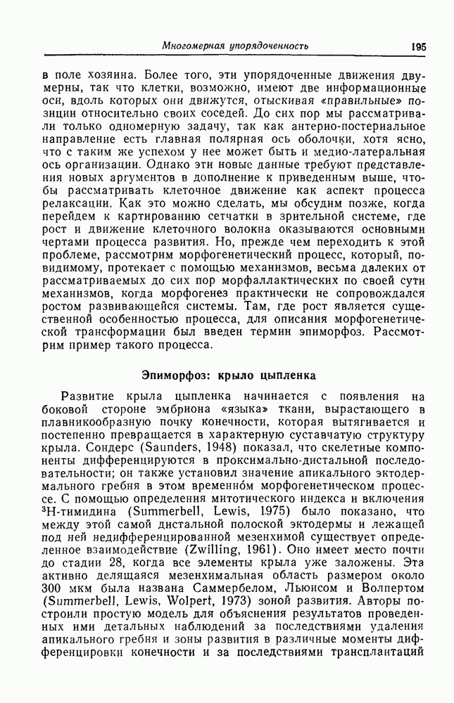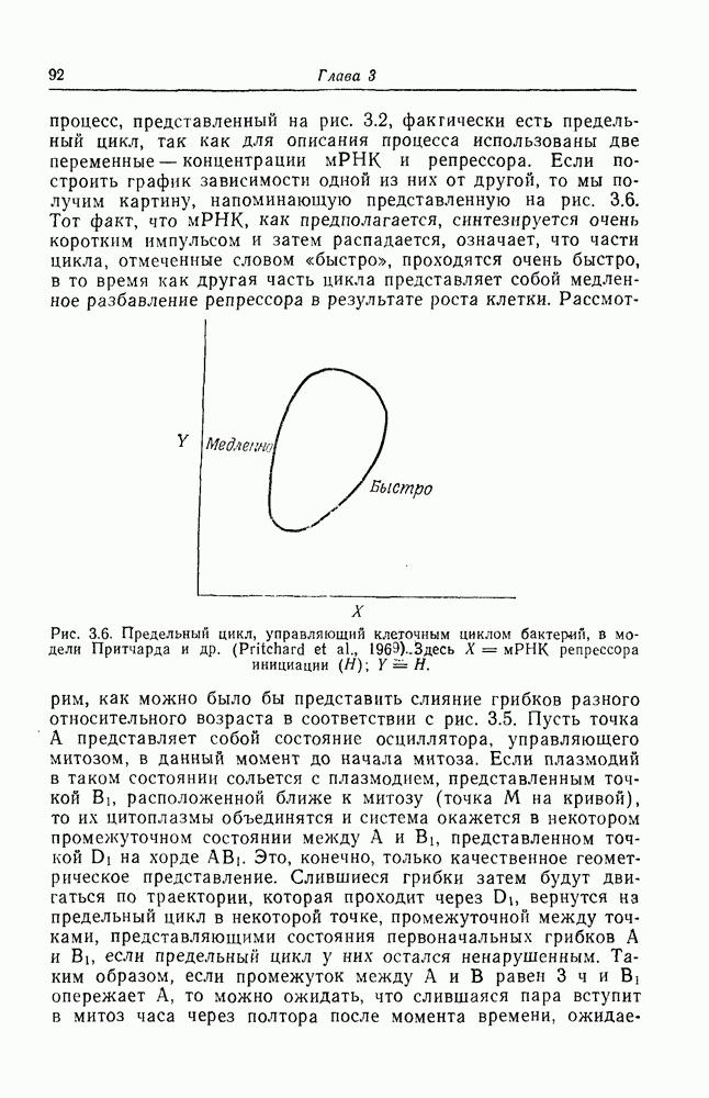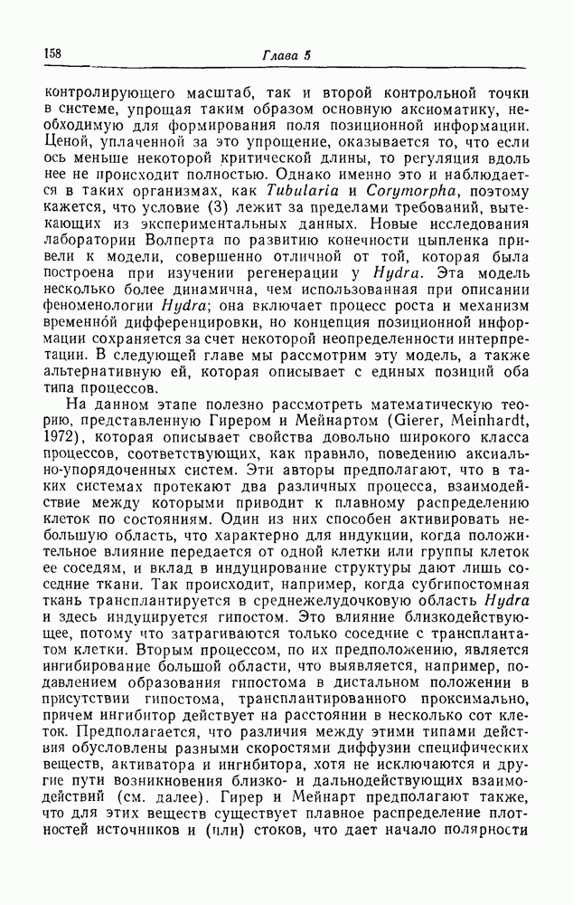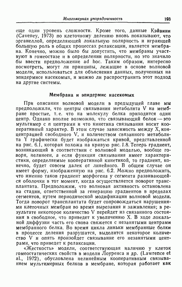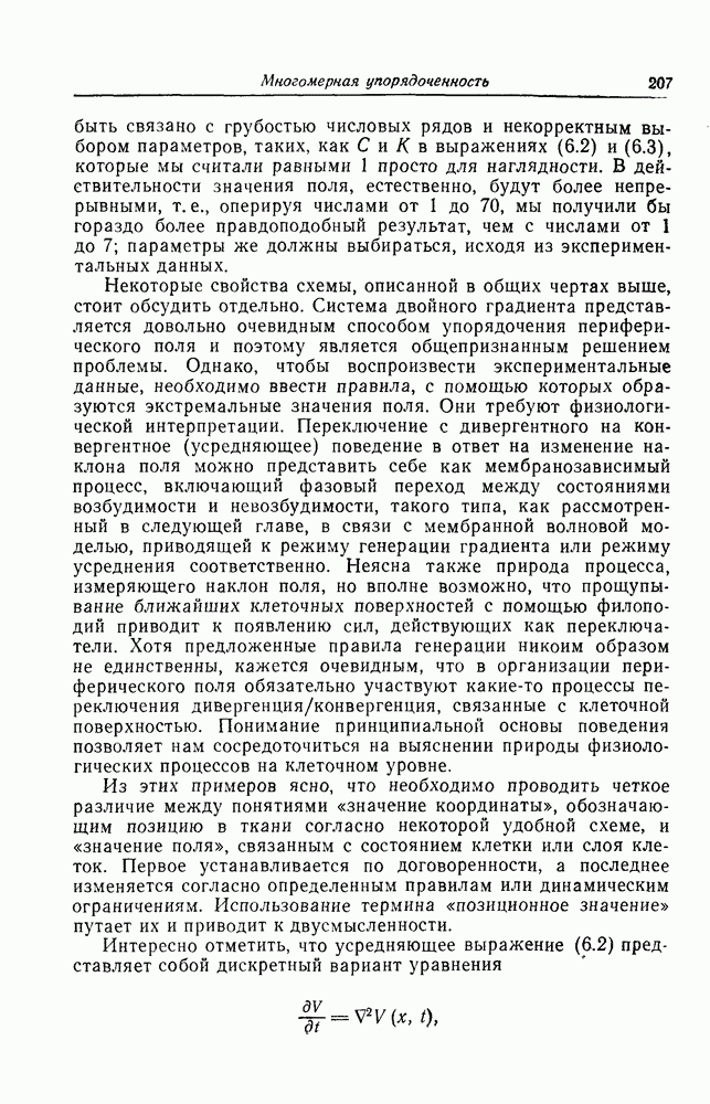 Рис. 3.7. Клеточный цикл эукариотов с ответвлением, ведущим к клеточной дифференцировке У схемы, представленной на рис. 3.7, имеется одна особенность, которая вводит в заблуждение и должна рассматриваться как недостаток: может показаться, что процесс клеточной дифференцировки и клеточный цикл работают по принципу «все или ничего», хотя на самом деле это не так. В течение эмбриогенеза, по мере того как происходят органогенез и клеточная дифференцировка, темп клеточных делений постепенно падает, но промежуточные состояния определенно существуют: частично дифференцированные клетки (миобласты, эритробласты, нейробласты и т. д.) продолжают делиться. Кроме того, четко различимы между собой линии стволовых клеток различных тканей органов у взрослых (тех органов, которые сохраняются в стационарном состоянии путем непрерывного возобновления клеток и дифференцировки, как, например кожа, печень, почка и т. д.), хотя их роль состоит в том, чтобы делиться со скоростью, определяемой некоторыми критериями, характеризующими потребности ткани или органа (используя язык теории управления). Хотя в таких системах клетки, которые в ответ на стимул к дифференцировке покидают стволовую популяцию, изменяют свое состояние, как правило, внезапно, нельзя считать, что этот процесс протекает строго по принципу «все или ничего». Чтобы передать гибкость связи между клеточным циклом и клеточной дифференцировкой, нужна гораздо более динамическая картина, чем та, которая дана на рис. 3.7. Теперь мне хотелось бы остановиться на некоторых исследованиях, дающих динамическую картину тканевой организации и в то же время допускающих построение и исследование модели тканевого гомеостаза с отрицательной обратной связью. Аналогично тому, как проблема управления репликацией ДНК привела нас к вопросу о том, каким образом клетки измеряют свои размеры, проблема управления клеточной дифференцировкой в ткани заставляет исследовать задачу поддержания ее пространственной организации. Это подводит нас к другому уровню биологической иерархии, характерному для многоклеточных. Динамически мы все еще работаем в пределах эпигенетической системы, хотя время теперь измеряется днями. Это происходит потому, что период клеточного цикла высших организмов обычно лежит в диапазоне 10-100 ч.