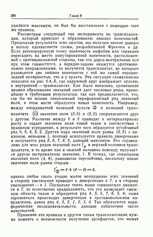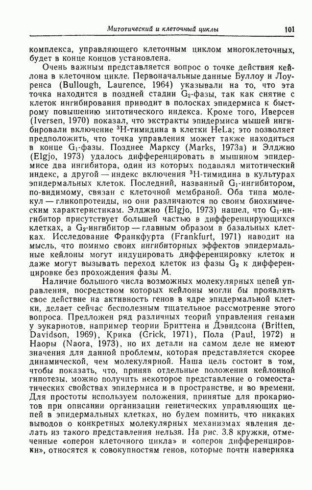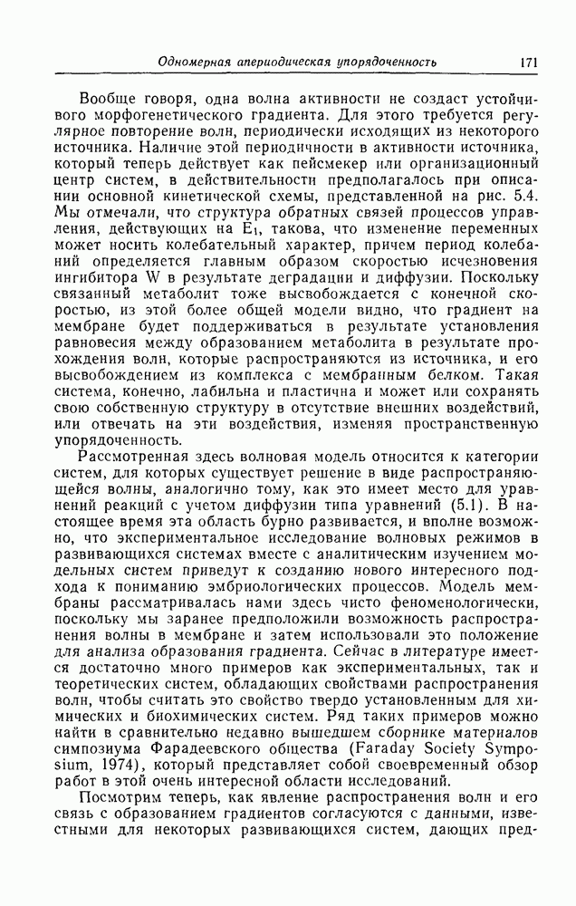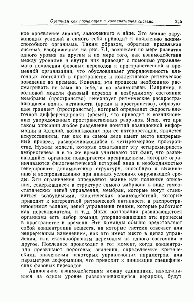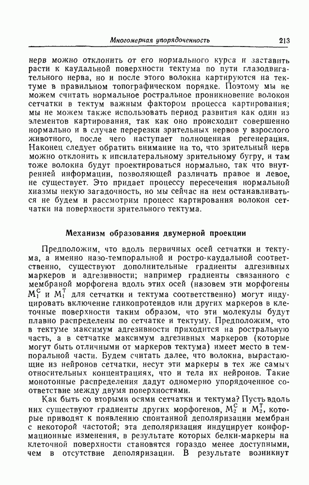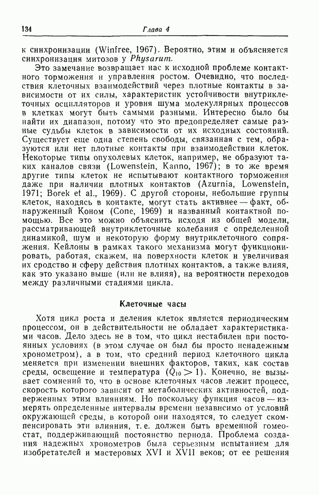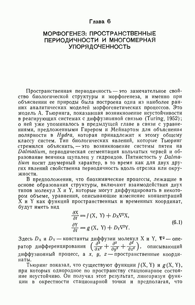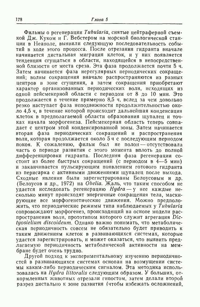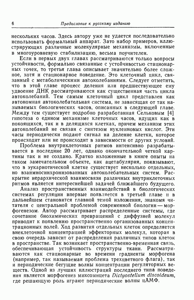 Рис. 3.7. Клеточный цикл эукариотов с ответвлением, ведущим к клеточной дифференцировке У схемы, представленной на рис. 3.7, имеется одна особенность, которая вводит в заблуждение и должна рассматриваться как недостаток: может показаться, что процесс клеточной дифференцировки и клеточный цикл работают по принципу «все или ничего», хотя на самом деле это не так. В течение эмбриогенеза, по мере того как происходят органогенез и клеточная дифференцировка, темп клеточных делений постепенно падает, но промежуточные состояния определенно существуют: частично дифференцированные клетки (миобласты, эритробласты, нейробласты и т. д.) продолжают делиться. Кроме того, четко различимы между собой линии стволовых клеток различных тканей органов у взрослых (тех органов, которые сохраняются в стационарном состоянии путем непрерывного возобновления клеток и дифференцировки, как, например кожа, печень, почка и т. д.), хотя их роль состоит в том, чтобы делиться со скоростью, определяемой некоторыми критериями, характеризующими потребности ткани или органа (используя язык теории управления). Хотя в таких системах клетки, которые в ответ на стимул к дифференцировке покидают стволовую популяцию, изменяют свое состояние, как правило, внезапно, нельзя считать, что этот процесс протекает строго по принципу «все или ничего». Чтобы передать гибкость связи между клеточным циклом и клеточной дифференцировкой, нужна гораздо более динамическая картина, чем та, которая дана на рис. 3.7. Теперь мне хотелось бы остановиться на некоторых исследованиях, дающих динамическую картину тканевой организации и в то же время допускающих построение и исследование модели тканевого гомеостаза с отрицательной обратной связью. Аналогично тому, как проблема управления репликацией ДНК привела нас к вопросу о том, каким образом клетки измеряют свои размеры, проблема управления клеточной дифференцировкой в ткани заставляет исследовать задачу поддержания ее пространственной организации. Это подводит нас к другому уровню биологической иерархии, характерному для многоклеточных. Динамически мы все еще работаем в пределах эпигенетической системы, хотя время теперь измеряется днями. Это происходит потому, что период клеточного цикла высших организмов обычно лежит в диапазоне 10-100 ч.