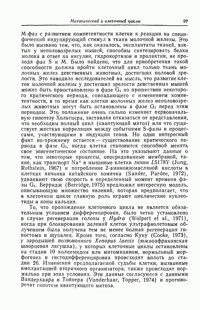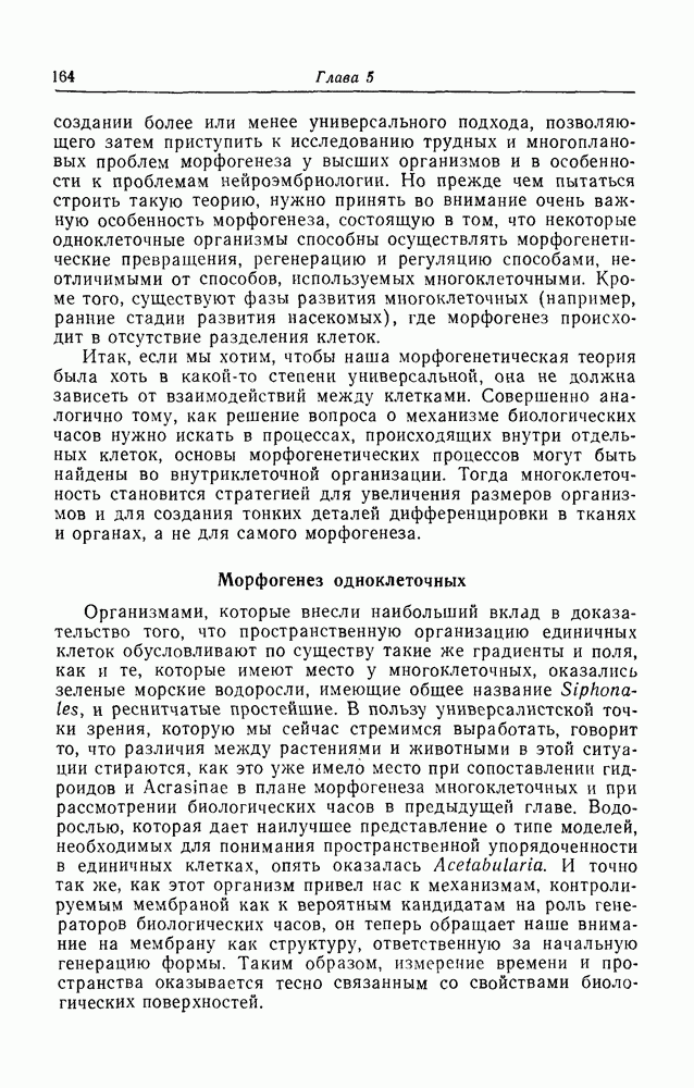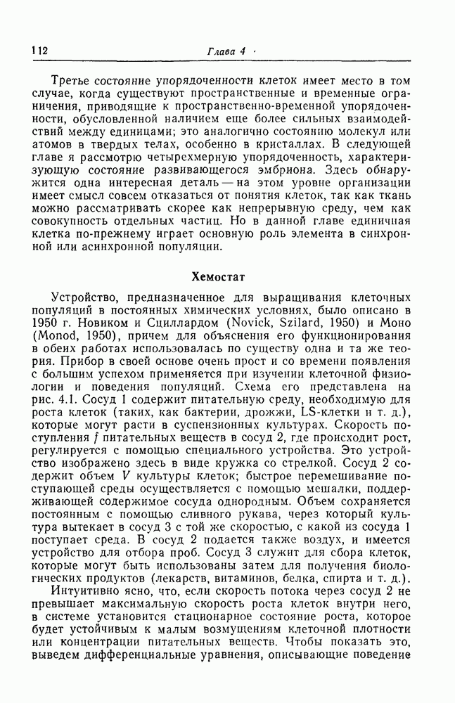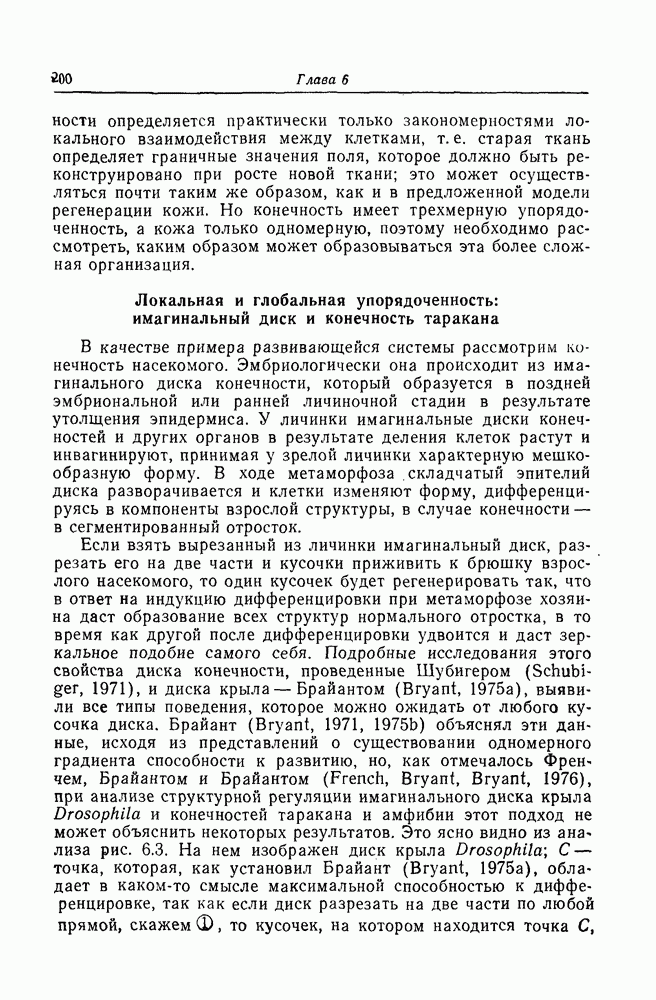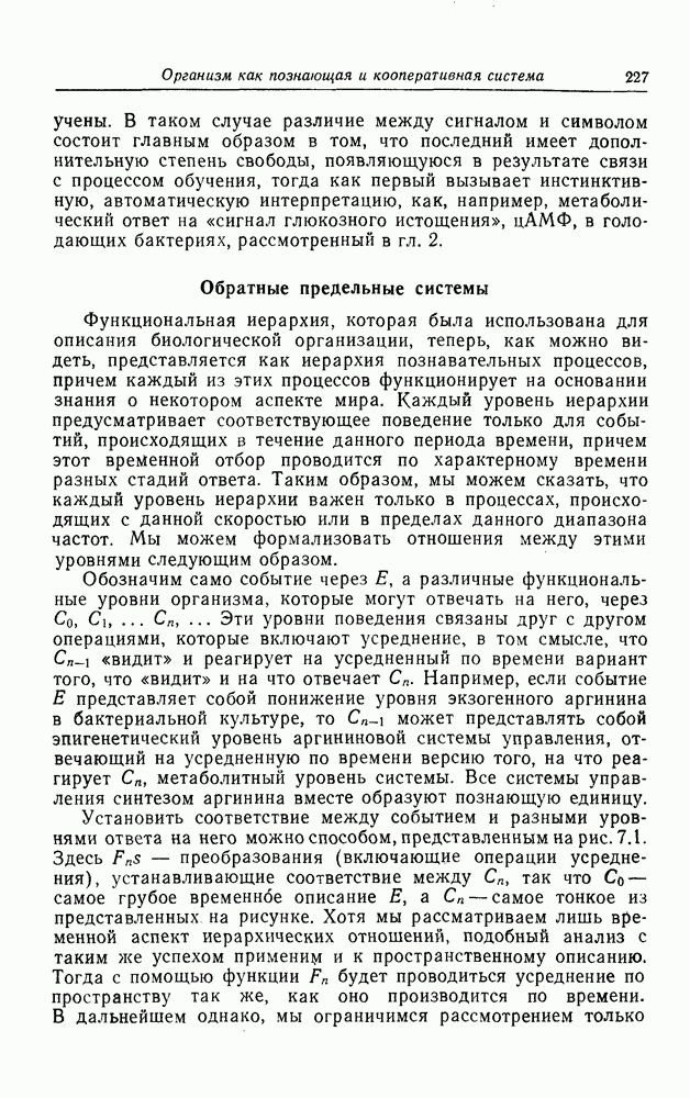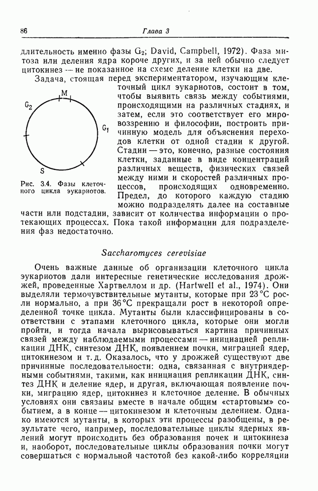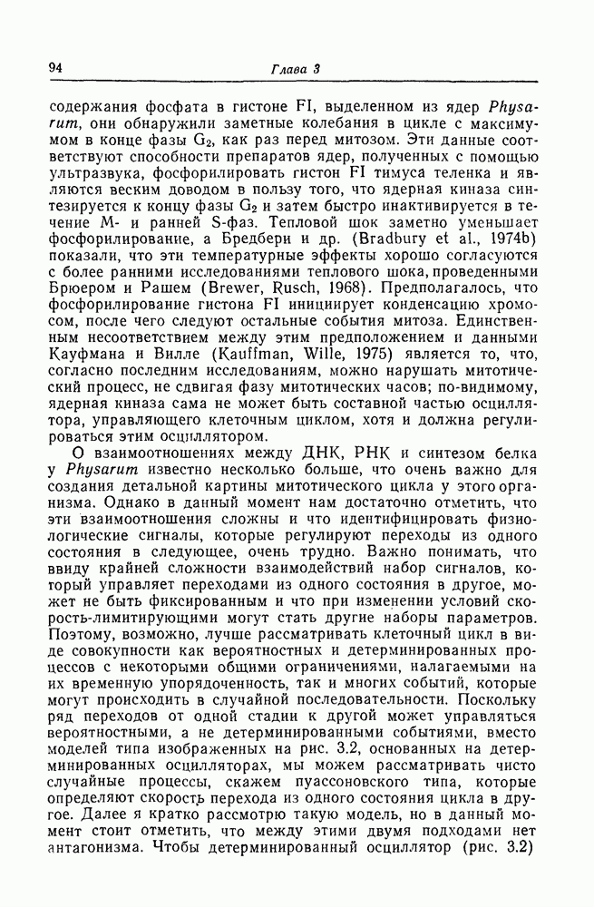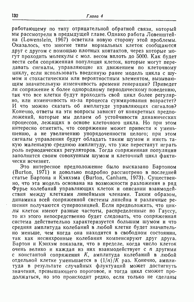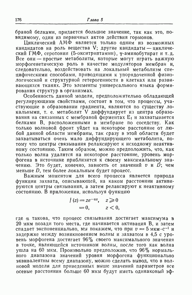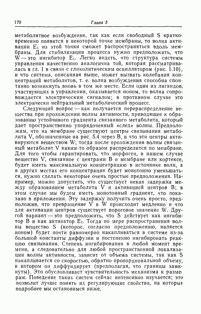 Рис. 3.7. Клеточный цикл эукариотов с ответвлением, ведущим к клеточной дифференцировке У схемы, представленной на рис. 3.7, имеется одна особенность, которая вводит в заблуждение и должна рассматриваться как недостаток: может показаться, что процесс клеточной дифференцировки и клеточный цикл работают по принципу «все или ничего», хотя на самом деле это не так. В течение эмбриогенеза, по мере того как происходят органогенез и клеточная дифференцировка, темп клеточных делений постепенно падает, но промежуточные состояния определенно существуют: частично дифференцированные клетки (миобласты, эритробласты, нейробласты и т. д.) продолжают делиться. Кроме того, четко различимы между собой линии стволовых клеток различных тканей органов у взрослых (тех органов, которые сохраняются в стационарном состоянии путем непрерывного возобновления клеток и дифференцировки, как, например кожа, печень, почка и т. д.), хотя их роль состоит в том, чтобы делиться со скоростью, определяемой некоторыми критериями, характеризующими потребности ткани или органа (используя язык теории управления). Хотя в таких системах клетки, которые в ответ на стимул к дифференцировке покидают стволовую популяцию, изменяют свое состояние, как правило, внезапно, нельзя считать, что этот процесс протекает строго по принципу «все или ничего». Чтобы передать гибкость связи между клеточным циклом и клеточной дифференцировкой, нужна гораздо более динамическая картина, чем та, которая дана на рис. 3.7. Теперь мне хотелось бы остановиться на некоторых исследованиях, дающих динамическую картину тканевой организации и в то же время допускающих построение и исследование модели тканевого гомеостаза с отрицательной обратной связью. Аналогично тому, как проблема управления репликацией ДНК привела нас к вопросу о том, каким образом клетки измеряют свои размеры, проблема управления клеточной дифференцировкой в ткани заставляет исследовать задачу поддержания ее пространственной организации. Это подводит нас к другому уровню биологической иерархии, характерному для многоклеточных. Динамически мы все еще работаем в пределах эпигенетической системы, хотя время теперь измеряется днями. Это происходит потому, что период клеточного цикла высших организмов обычно лежит в диапазоне 10-100 ч.