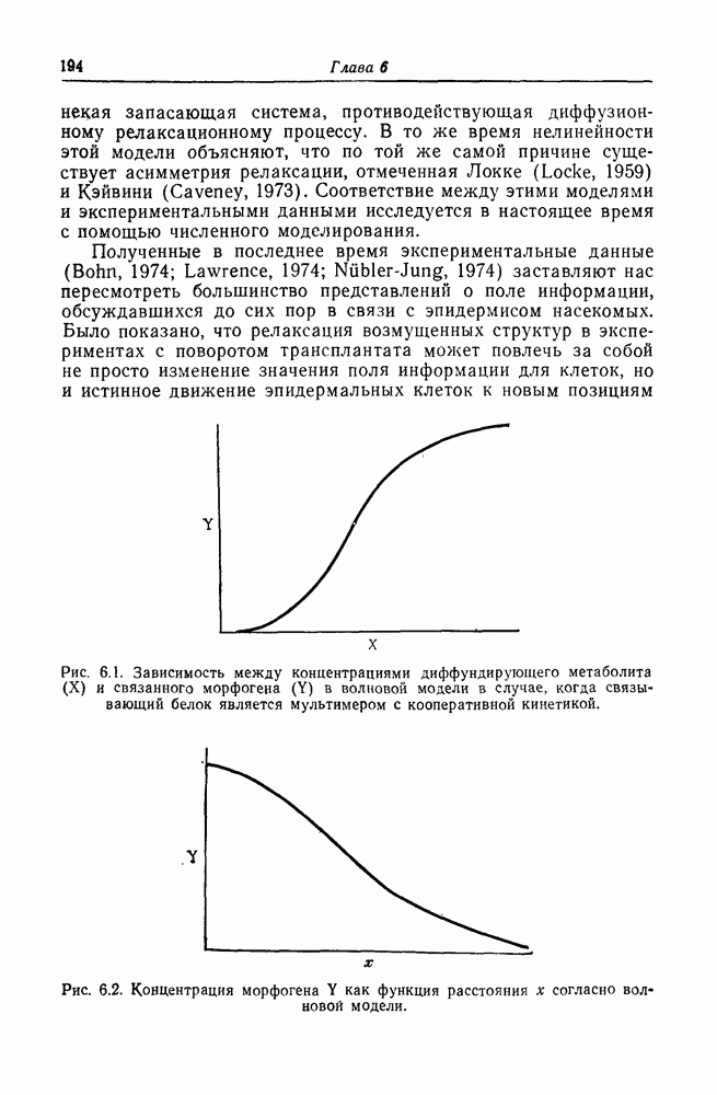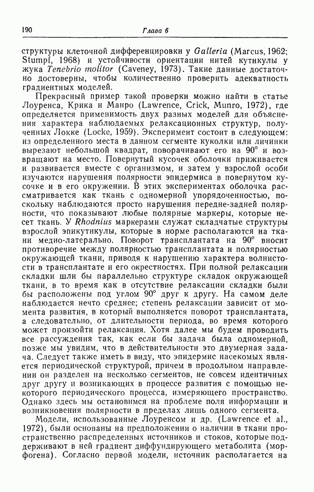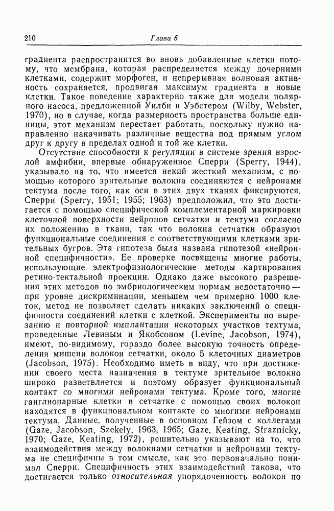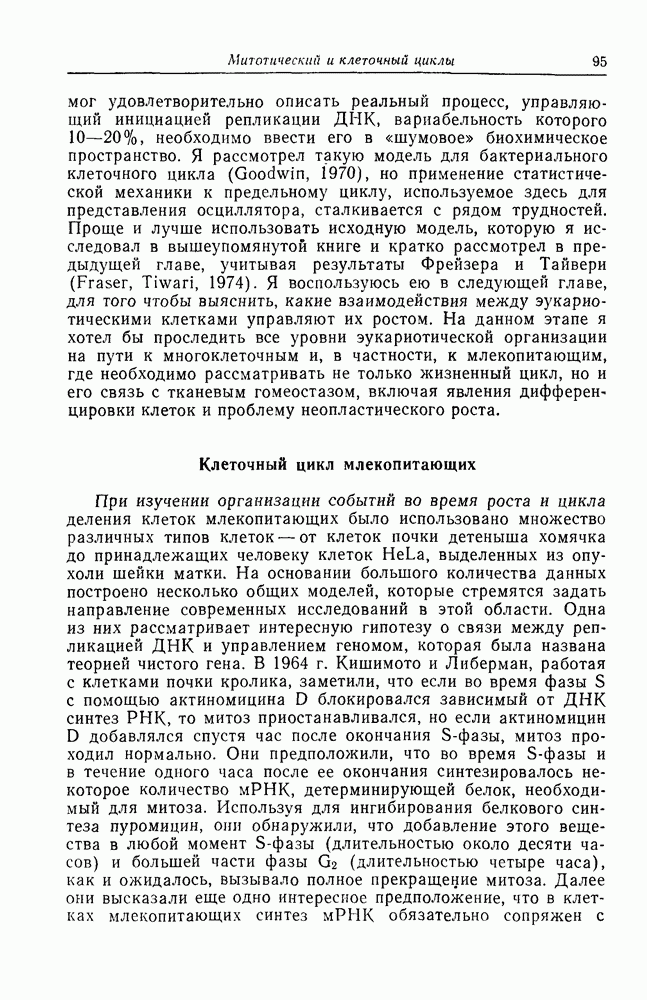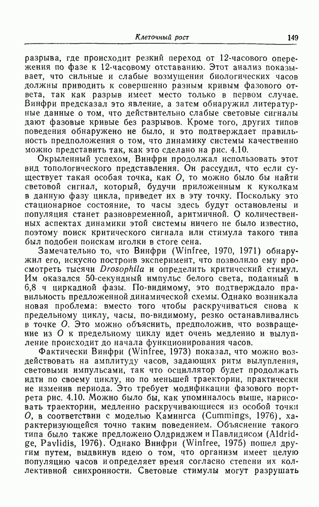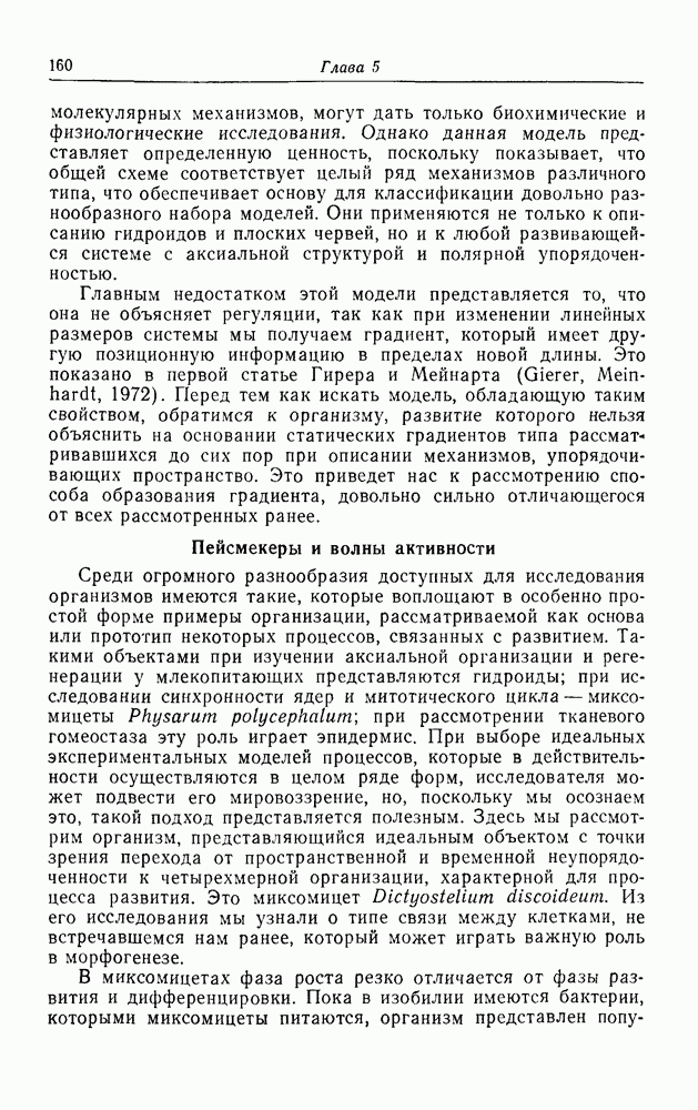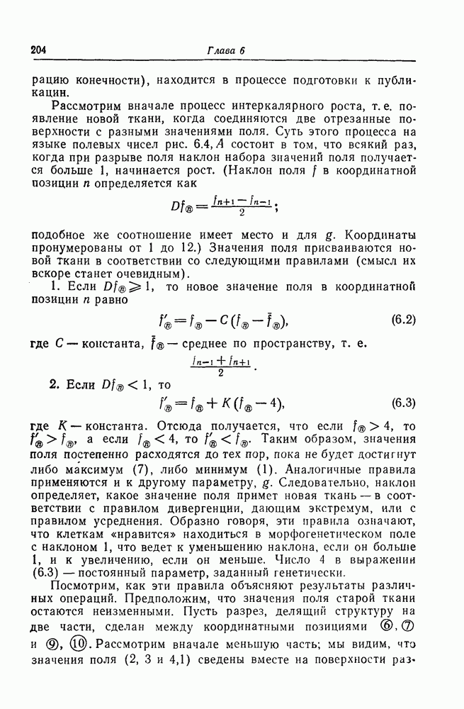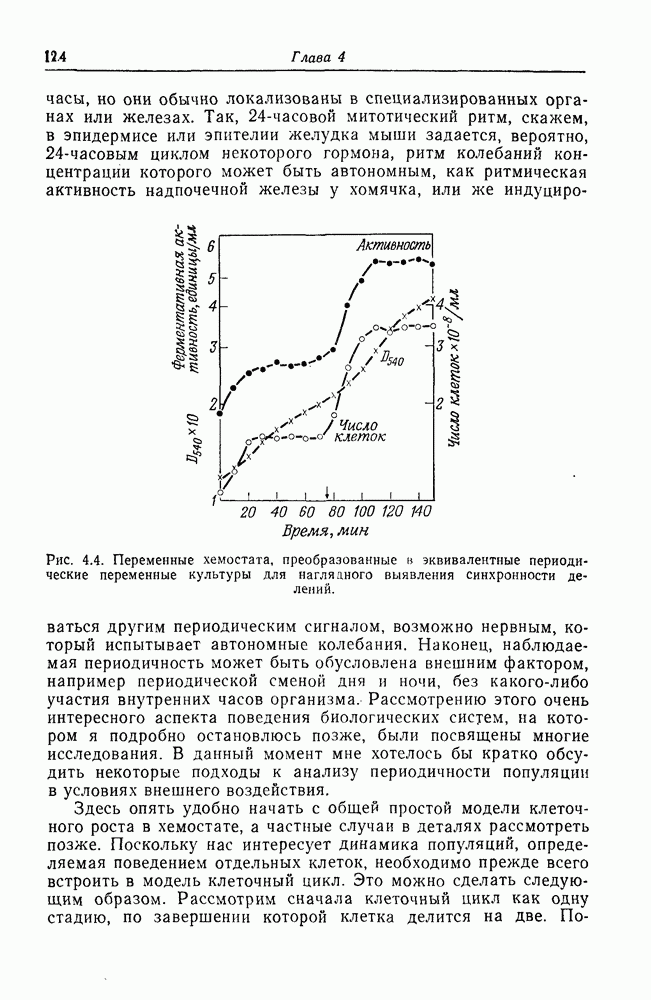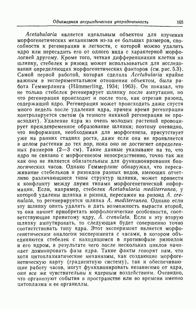Рис. 3.7. Клеточный цикл эукариотов с ответвлением, ведущим к клеточной дифференцировке У схемы, представленной на рис. 3.7, имеется одна особенность, которая вводит в заблуждение и должна рассматриваться как недостаток: может показаться, что процесс клеточной дифференцировки и клеточный цикл работают по принципу «все или ничего», хотя на самом деле это не так. В течение эмбриогенеза, по мере того как происходят органогенез и клеточная дифференцировка, темп клеточных делений постепенно падает, но промежуточные состояния определенно существуют: частично дифференцированные клетки (миобласты, эритробласты, нейробласты и т. д.) продолжают делиться. Кроме того, четко различимы между собой линии стволовых клеток различных тканей органов у взрослых (тех органов, которые сохраняются в стационарном состоянии путем непрерывного возобновления клеток и дифференцировки, как, например кожа, печень, почка и т. д.), хотя их роль состоит в том, чтобы делиться со скоростью, определяемой некоторыми критериями, характеризующими потребности ткани или органа (используя язык теории управления). Хотя в таких системах клетки, которые в ответ на стимул к дифференцировке покидают стволовую популяцию, изменяют свое состояние, как правило, внезапно, нельзя считать, что этот процесс протекает строго по принципу «все или ничего». Чтобы передать гибкость связи между клеточным циклом и клеточной дифференцировкой, нужна гораздо более динамическая картина, чем та, которая дана на рис. 3.7. Теперь мне хотелось бы остановиться на некоторых исследованиях, дающих динамическую картину тканевой организации и в то же время допускающих построение и исследование модели тканевого гомеостаза с отрицательной обратной связью. Аналогично тому, как проблема управления репликацией ДНК привела нас к вопросу о том, каким образом клетки измеряют свои размеры, проблема управления клеточной дифференцировкой в ткани заставляет исследовать задачу поддержания ее пространственной организации. Это подводит нас к другому уровню биологической иерархии, характерному для многоклеточных. Динамически мы все еще работаем в пределах эпигенетической системы, хотя время теперь измеряется днями. Это происходит потому, что период клеточного цикла высших организмов обычно лежит в диапазоне 10-100 ч.