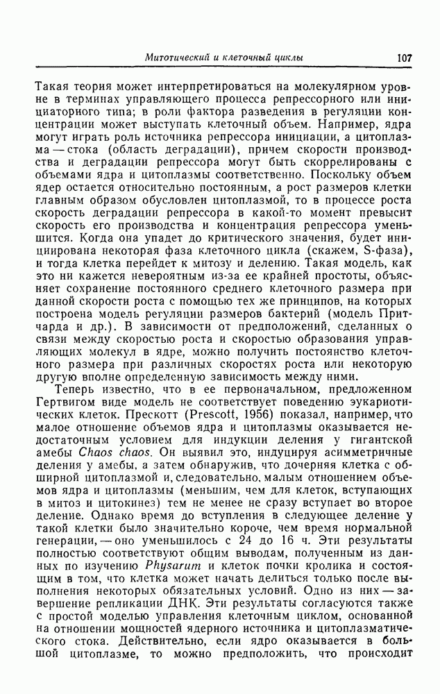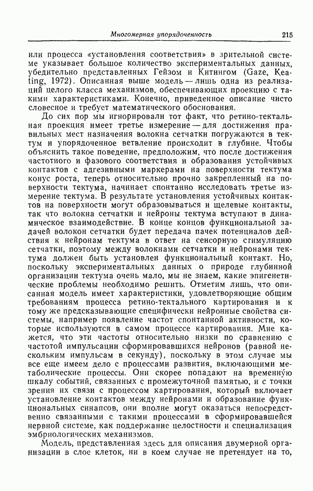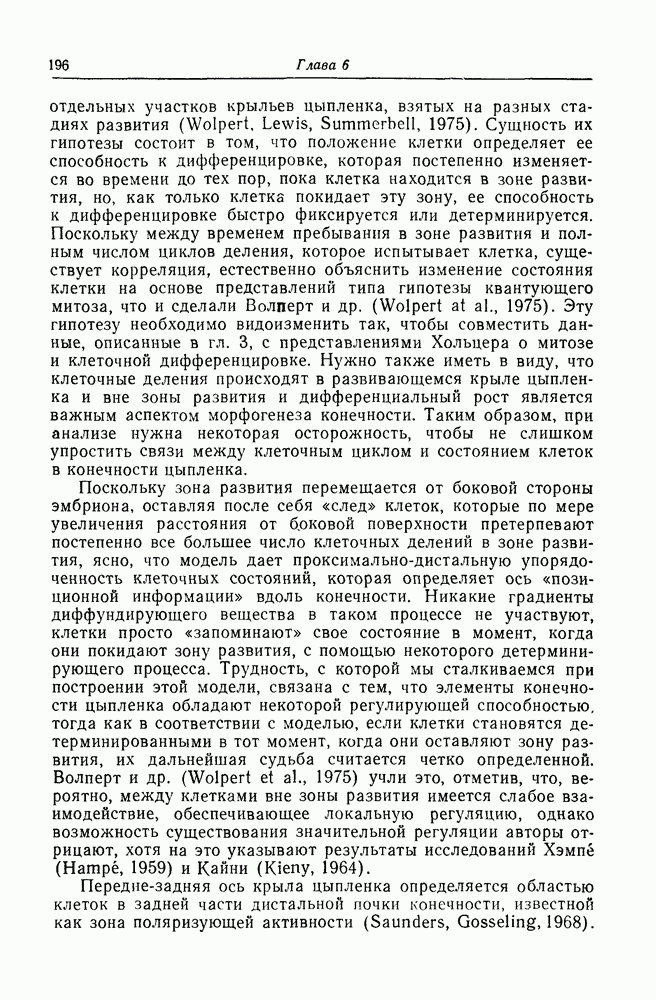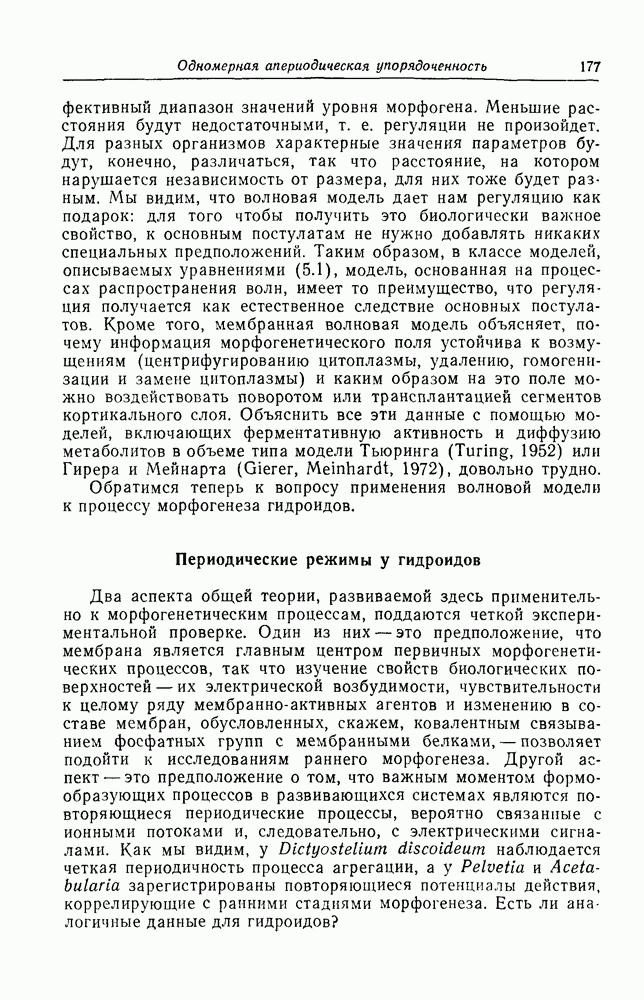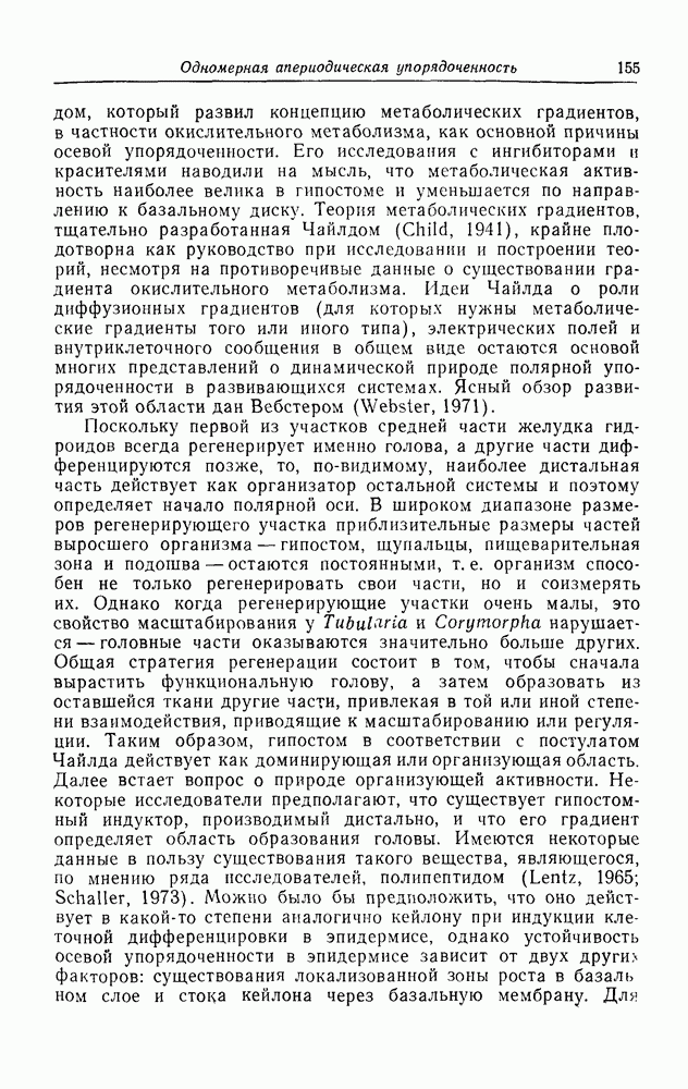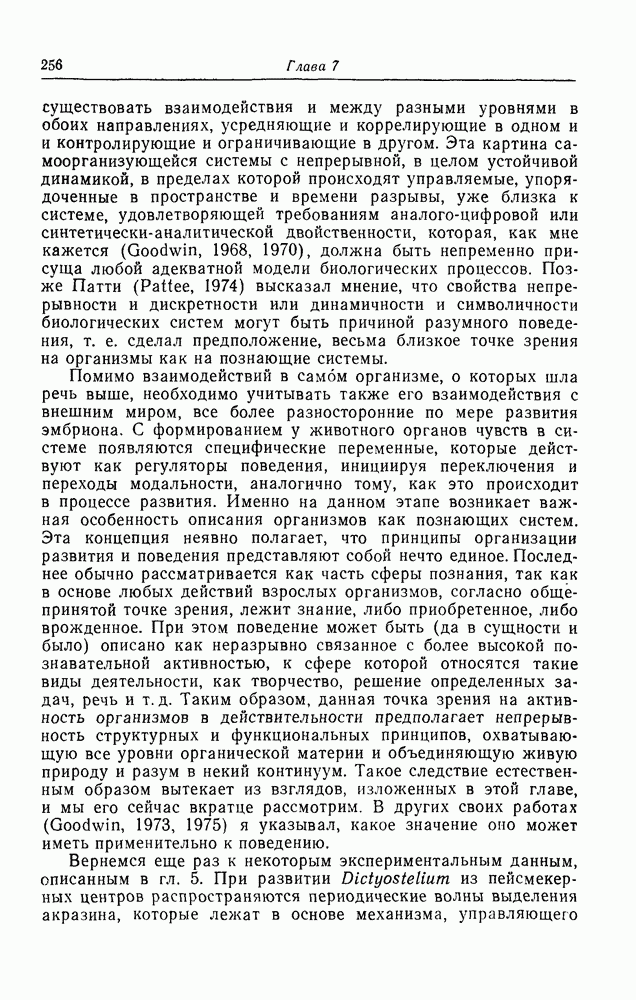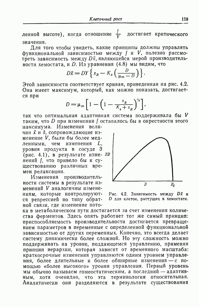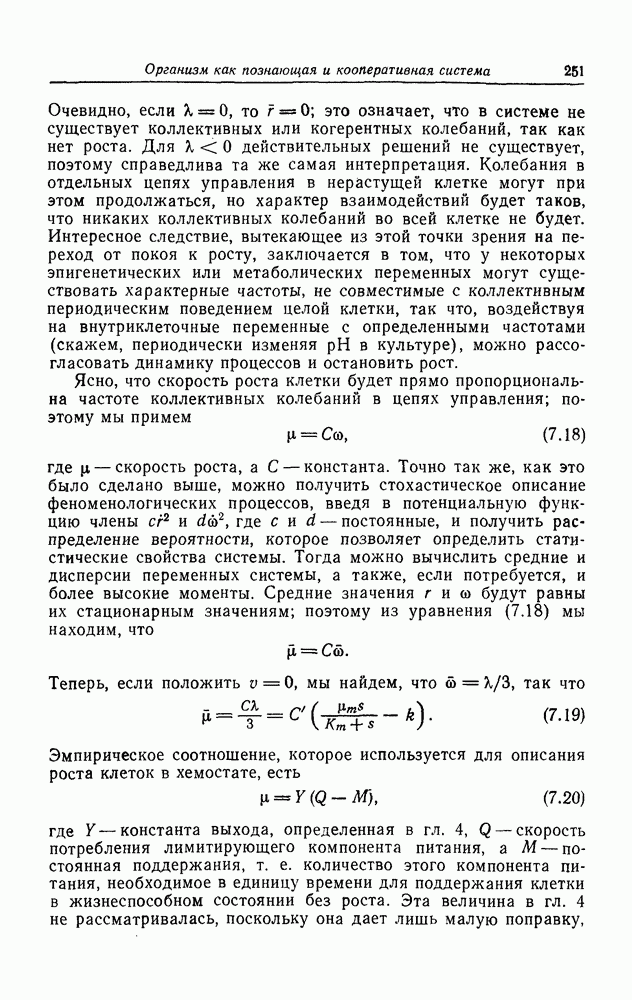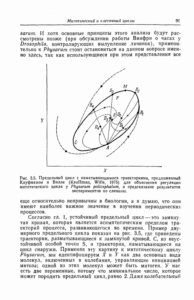 Рис. 3.7. Клеточный цикл эукариотов с ответвлением, ведущим к клеточной дифференцировке У схемы, представленной на рис. 3.7, имеется одна особенность, которая вводит в заблуждение и должна рассматриваться как недостаток: может показаться, что процесс клеточной дифференцировки и клеточный цикл работают по принципу «все или ничего», хотя на самом деле это не так. В течение эмбриогенеза, по мере того как происходят органогенез и клеточная дифференцировка, темп клеточных делений постепенно падает, но промежуточные состояния определенно существуют: частично дифференцированные клетки (миобласты, эритробласты, нейробласты и т. д.) продолжают делиться. Кроме того, четко различимы между собой линии стволовых клеток различных тканей органов у взрослых (тех органов, которые сохраняются в стационарном состоянии путем непрерывного возобновления клеток и дифференцировки, как, например кожа, печень, почка и т. д.), хотя их роль состоит в том, чтобы делиться со скоростью, определяемой некоторыми критериями, характеризующими потребности ткани или органа (используя язык теории управления). Хотя в таких системах клетки, которые в ответ на стимул к дифференцировке покидают стволовую популяцию, изменяют свое состояние, как правило, внезапно, нельзя считать, что этот процесс протекает строго по принципу «все или ничего». Чтобы передать гибкость связи между клеточным циклом и клеточной дифференцировкой, нужна гораздо более динамическая картина, чем та, которая дана на рис. 3.7. Теперь мне хотелось бы остановиться на некоторых исследованиях, дающих динамическую картину тканевой организации и в то же время допускающих построение и исследование модели тканевого гомеостаза с отрицательной обратной связью. Аналогично тому, как проблема управления репликацией ДНК привела нас к вопросу о том, каким образом клетки измеряют свои размеры, проблема управления клеточной дифференцировкой в ткани заставляет исследовать задачу поддержания ее пространственной организации. Это подводит нас к другому уровню биологической иерархии, характерному для многоклеточных. Динамически мы все еще работаем в пределах эпигенетической системы, хотя время теперь измеряется днями. Это происходит потому, что период клеточного цикла высших организмов обычно лежит в диапазоне 10-100 ч.