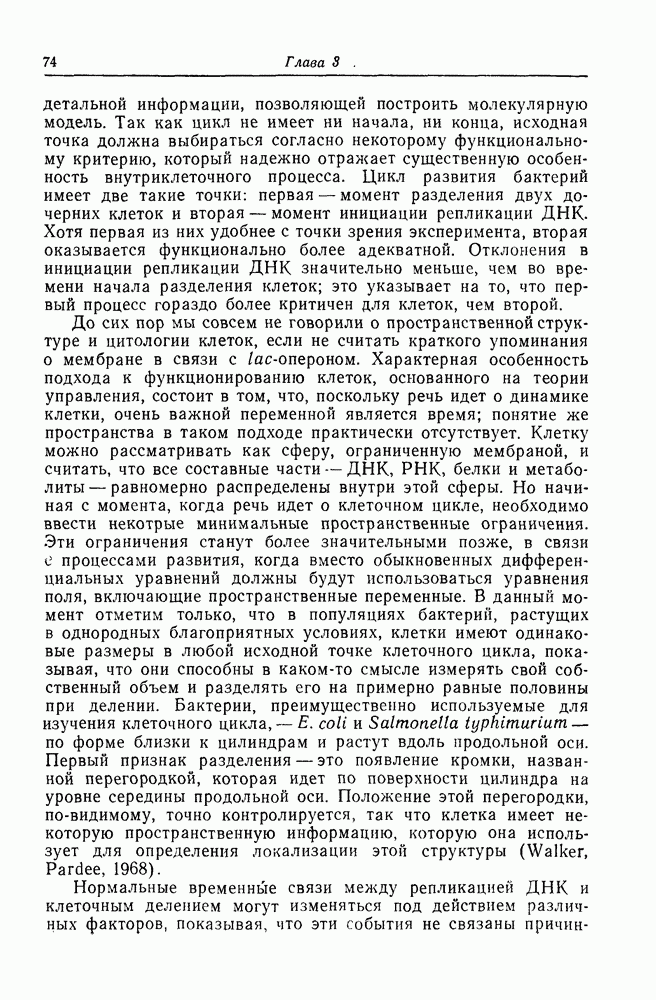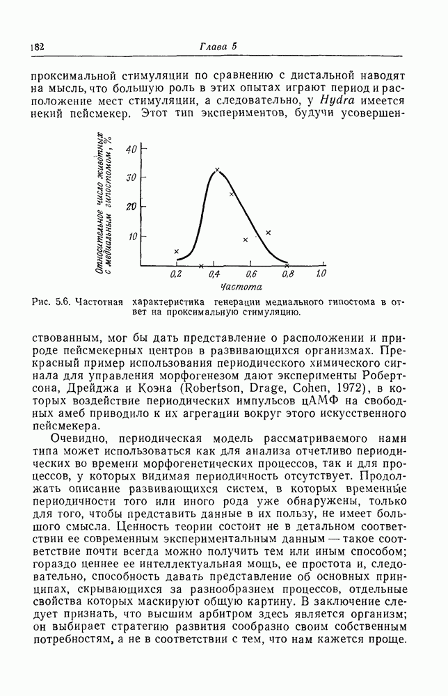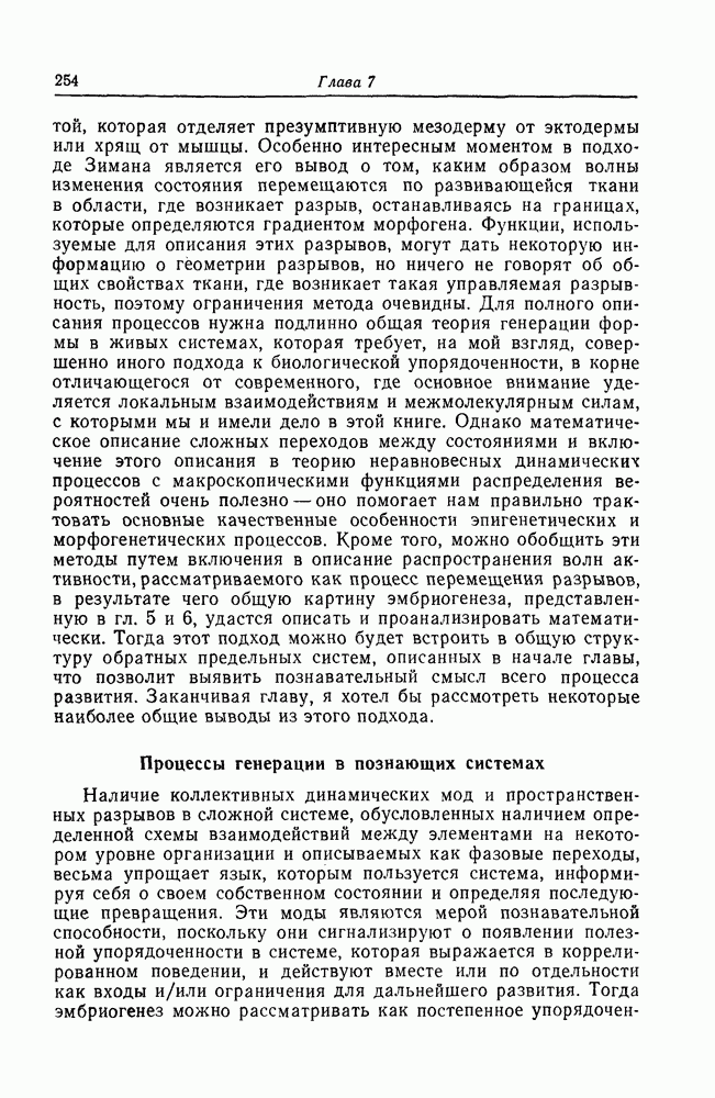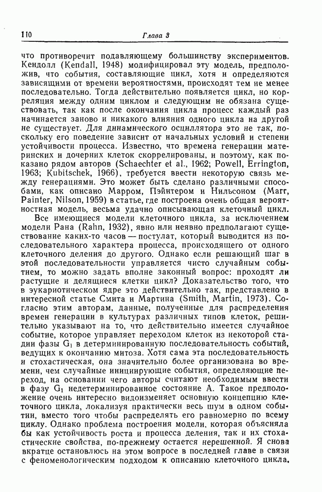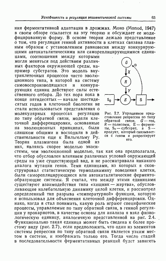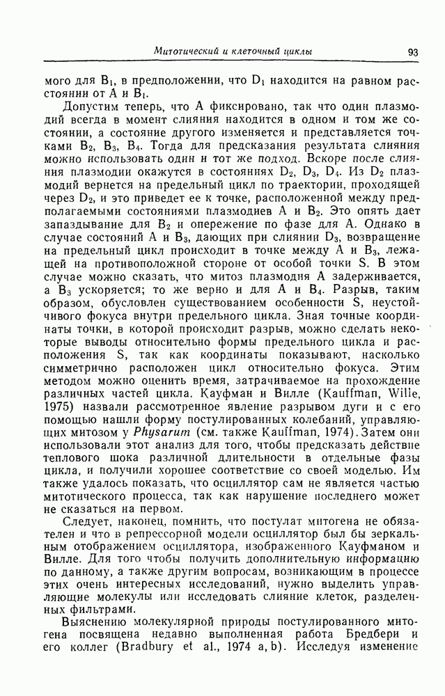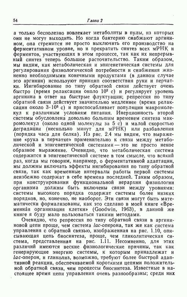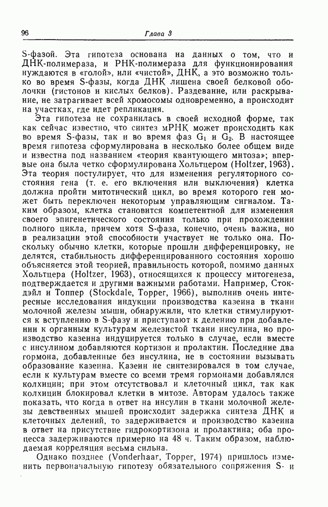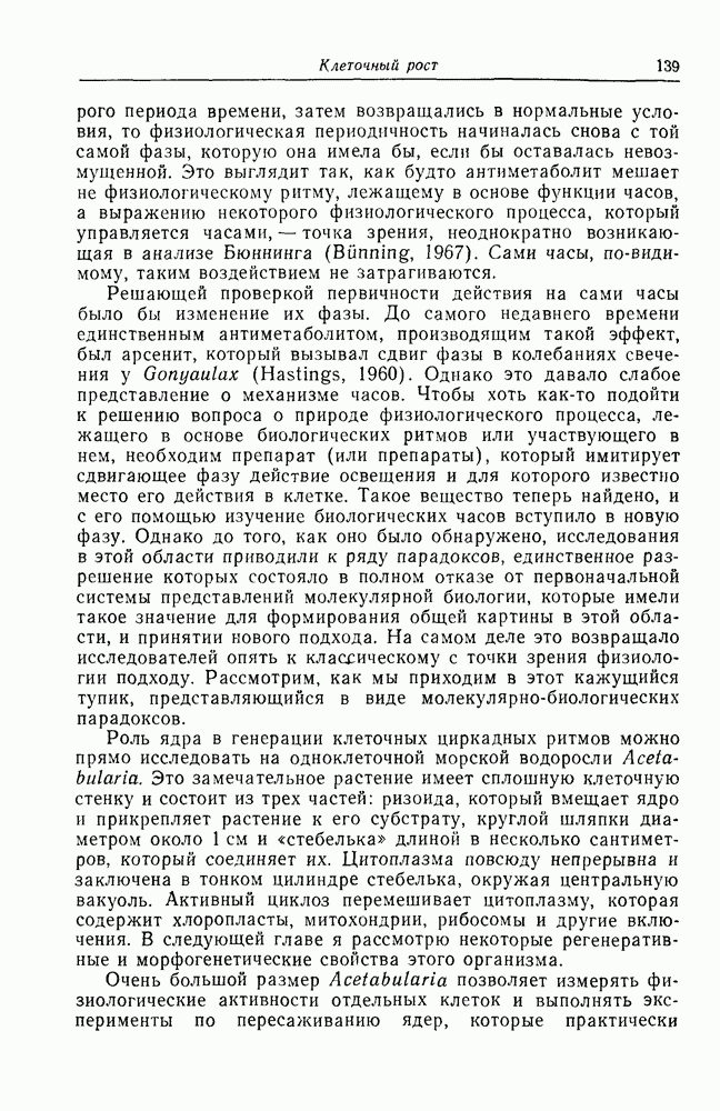 Рис. 3.7. Клеточный цикл эукариотов с ответвлением, ведущим к клеточной дифференцировке У схемы, представленной на рис. 3.7, имеется одна особенность, которая вводит в заблуждение и должна рассматриваться как недостаток: может показаться, что процесс клеточной дифференцировки и клеточный цикл работают по принципу «все или ничего», хотя на самом деле это не так. В течение эмбриогенеза, по мере того как происходят органогенез и клеточная дифференцировка, темп клеточных делений постепенно падает, но промежуточные состояния определенно существуют: частично дифференцированные клетки (миобласты, эритробласты, нейробласты и т. д.) продолжают делиться. Кроме того, четко различимы между собой линии стволовых клеток различных тканей органов у взрослых (тех органов, которые сохраняются в стационарном состоянии путем непрерывного возобновления клеток и дифференцировки, как, например кожа, печень, почка и т. д.), хотя их роль состоит в том, чтобы делиться со скоростью, определяемой некоторыми критериями, характеризующими потребности ткани или органа (используя язык теории управления). Хотя в таких системах клетки, которые в ответ на стимул к дифференцировке покидают стволовую популяцию, изменяют свое состояние, как правило, внезапно, нельзя считать, что этот процесс протекает строго по принципу «все или ничего». Чтобы передать гибкость связи между клеточным циклом и клеточной дифференцировкой, нужна гораздо более динамическая картина, чем та, которая дана на рис. 3.7. Теперь мне хотелось бы остановиться на некоторых исследованиях, дающих динамическую картину тканевой организации и в то же время допускающих построение и исследование модели тканевого гомеостаза с отрицательной обратной связью. Аналогично тому, как проблема управления репликацией ДНК привела нас к вопросу о том, каким образом клетки измеряют свои размеры, проблема управления клеточной дифференцировкой в ткани заставляет исследовать задачу поддержания ее пространственной организации. Это подводит нас к другому уровню биологической иерархии, характерному для многоклеточных. Динамически мы все еще работаем в пределах эпигенетической системы, хотя время теперь измеряется днями. Это происходит потому, что период клеточного цикла высших организмов обычно лежит в диапазоне 10-100 ч.