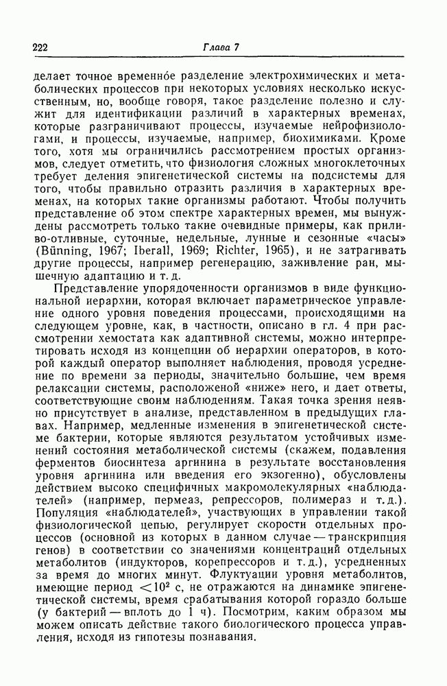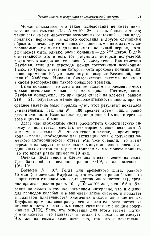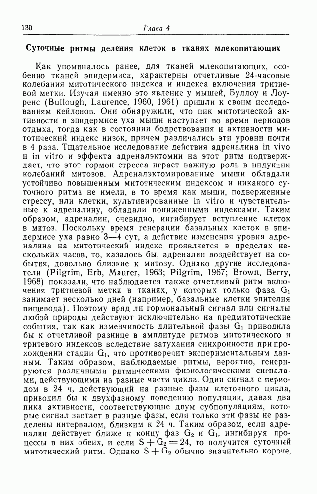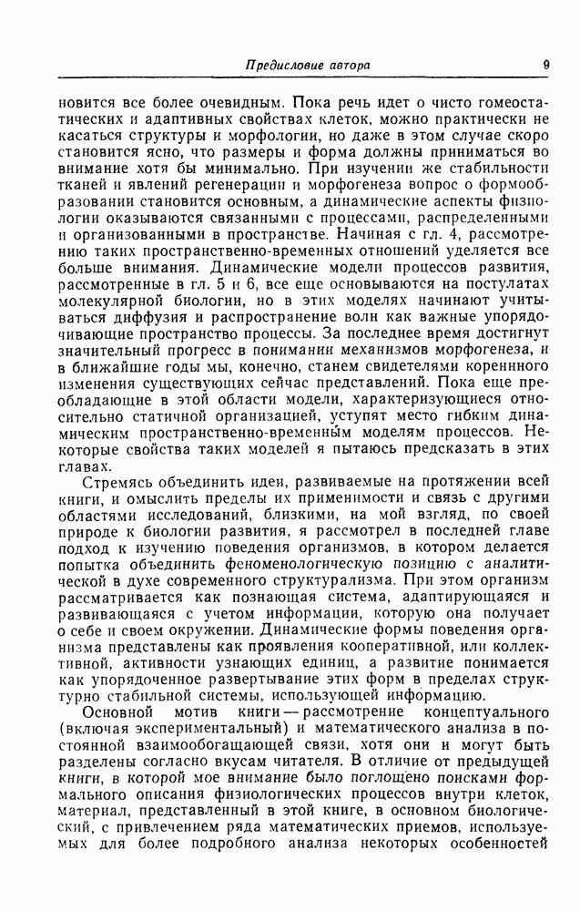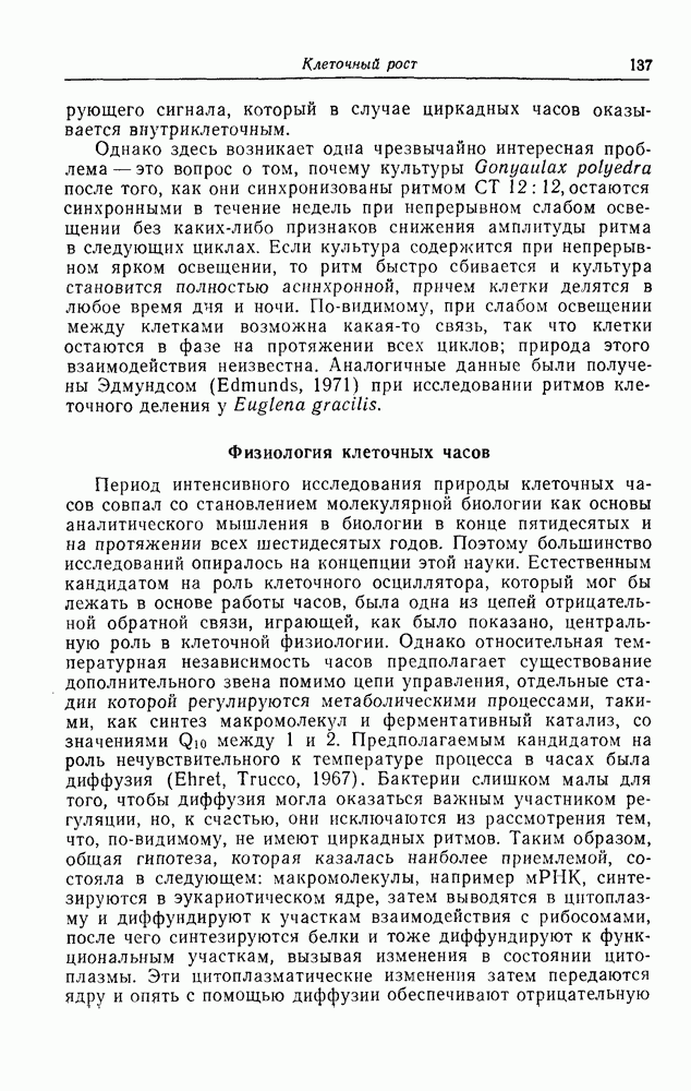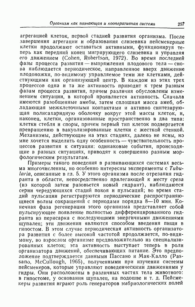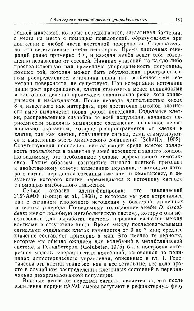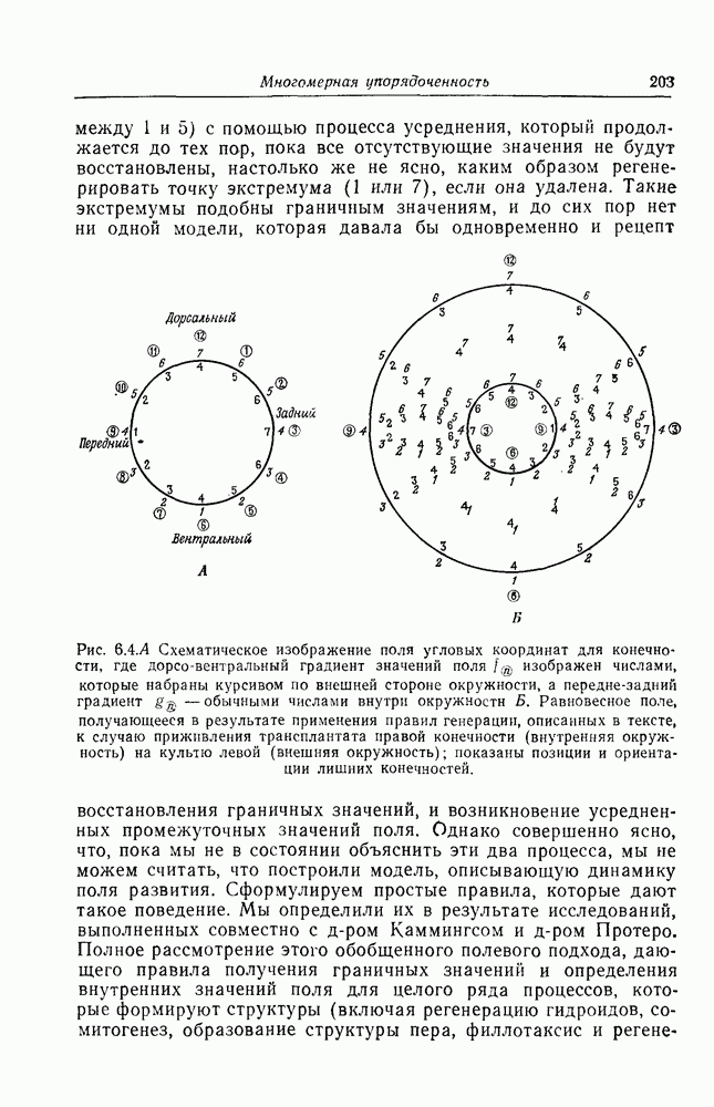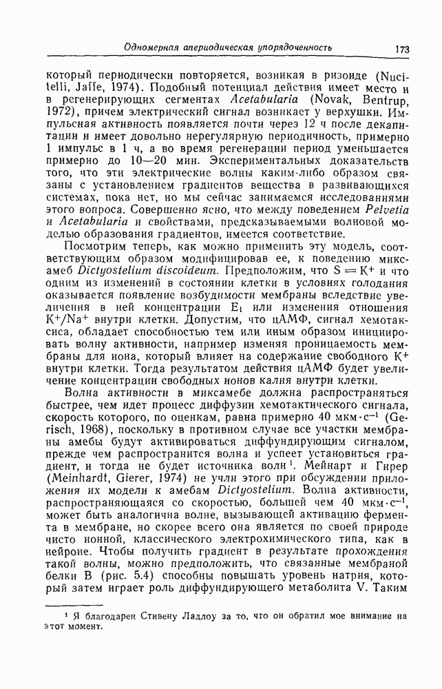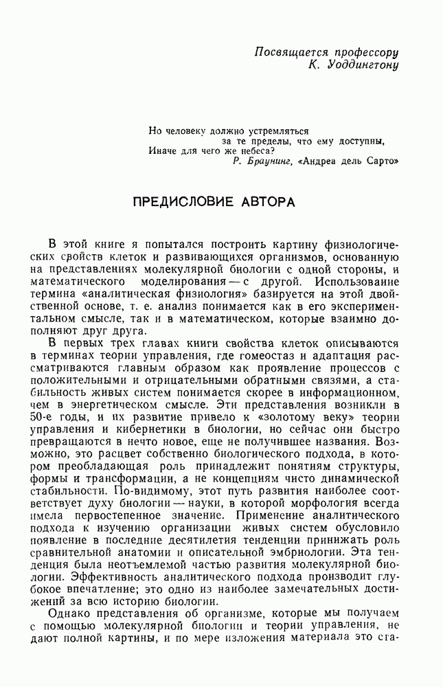 Рис. 3.7. Клеточный цикл эукариотов с ответвлением, ведущим к клеточной дифференцировке У схемы, представленной на рис. 3.7, имеется одна особенность, которая вводит в заблуждение и должна рассматриваться как недостаток: может показаться, что процесс клеточной дифференцировки и клеточный цикл работают по принципу «все или ничего», хотя на самом деле это не так. В течение эмбриогенеза, по мере того как происходят органогенез и клеточная дифференцировка, темп клеточных делений постепенно падает, но промежуточные состояния определенно существуют: частично дифференцированные клетки (миобласты, эритробласты, нейробласты и т. д.) продолжают делиться. Кроме того, четко различимы между собой линии стволовых клеток различных тканей органов у взрослых (тех органов, которые сохраняются в стационарном состоянии путем непрерывного возобновления клеток и дифференцировки, как, например кожа, печень, почка и т. д.), хотя их роль состоит в том, чтобы делиться со скоростью, определяемой некоторыми критериями, характеризующими потребности ткани или органа (используя язык теории управления). Хотя в таких системах клетки, которые в ответ на стимул к дифференцировке покидают стволовую популяцию, изменяют свое состояние, как правило, внезапно, нельзя считать, что этот процесс протекает строго по принципу «все или ничего». Чтобы передать гибкость связи между клеточным циклом и клеточной дифференцировкой, нужна гораздо более динамическая картина, чем та, которая дана на рис. 3.7. Теперь мне хотелось бы остановиться на некоторых исследованиях, дающих динамическую картину тканевой организации и в то же время допускающих построение и исследование модели тканевого гомеостаза с отрицательной обратной связью. Аналогично тому, как проблема управления репликацией ДНК привела нас к вопросу о том, каким образом клетки измеряют свои размеры, проблема управления клеточной дифференцировкой в ткани заставляет исследовать задачу поддержания ее пространственной организации. Это подводит нас к другому уровню биологической иерархии, характерному для многоклеточных. Динамически мы все еще работаем в пределах эпигенетической системы, хотя время теперь измеряется днями. Это происходит потому, что период клеточного цикла высших организмов обычно лежит в диапазоне 10-100 ч.
