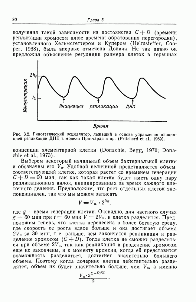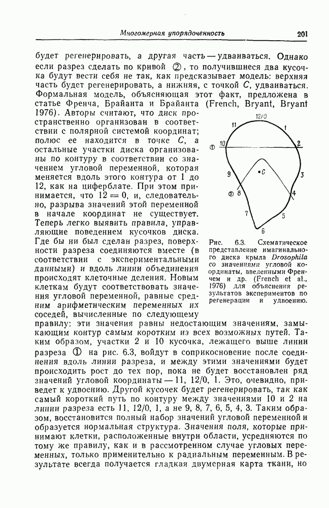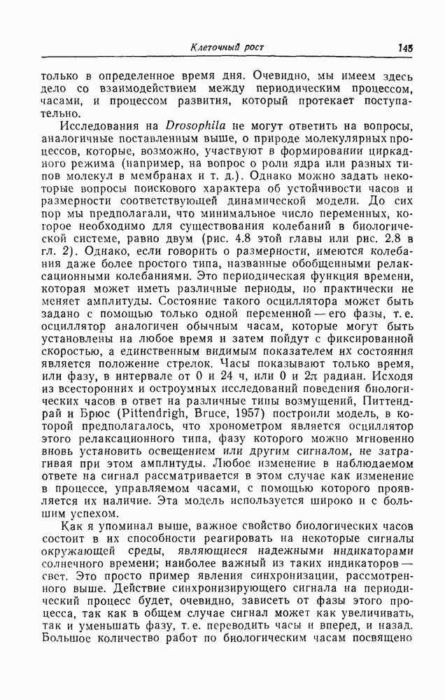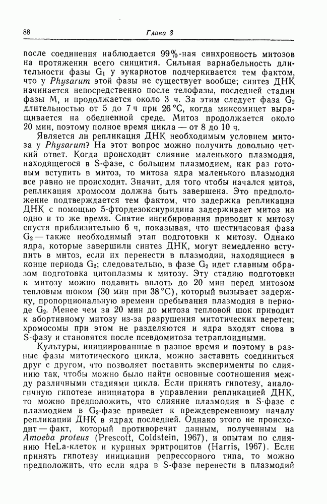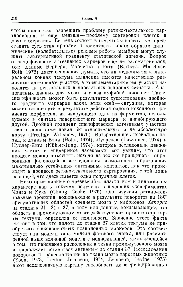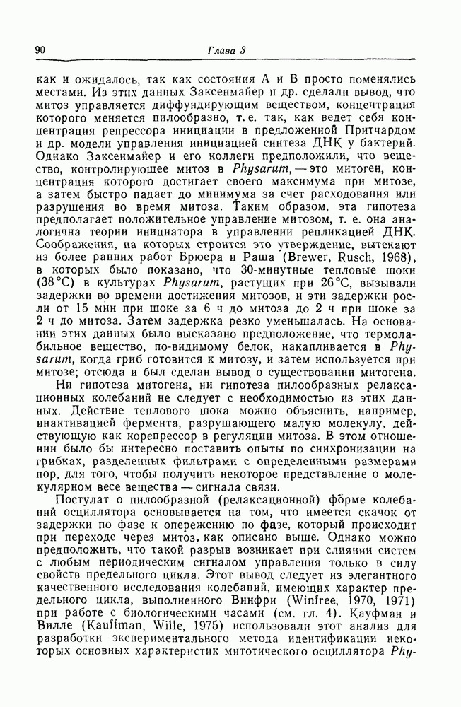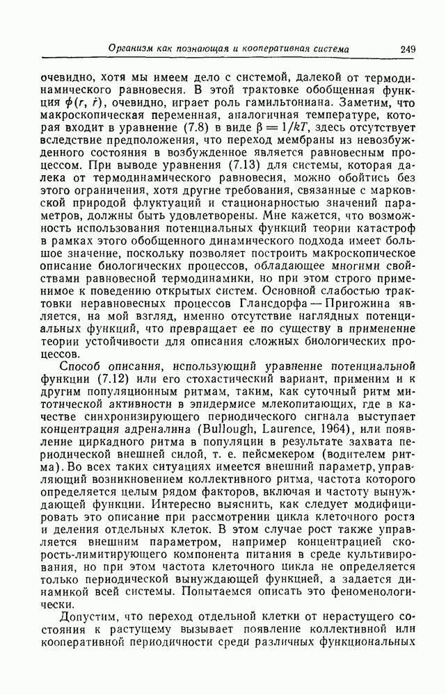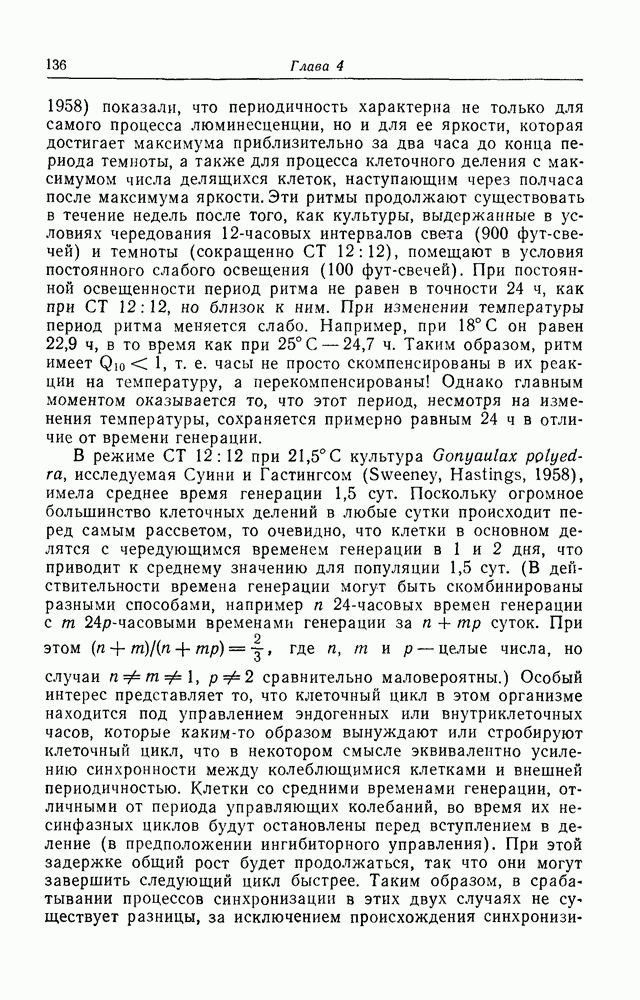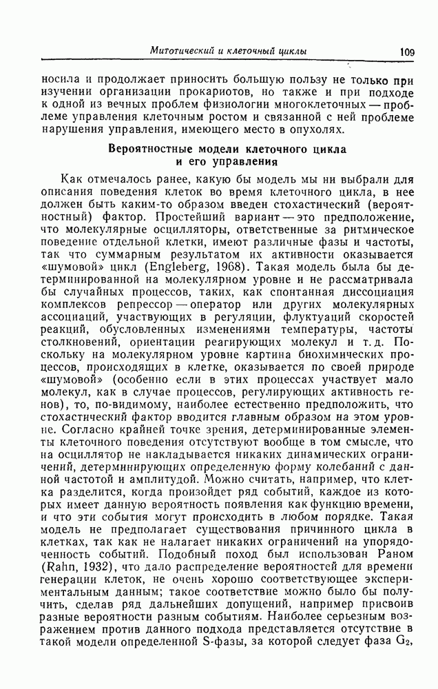 Рис. 3.7. Клеточный цикл эукариотов с ответвлением, ведущим к клеточной дифференцировке У схемы, представленной на рис. 3.7, имеется одна особенность, которая вводит в заблуждение и должна рассматриваться как недостаток: может показаться, что процесс клеточной дифференцировки и клеточный цикл работают по принципу «все или ничего», хотя на самом деле это не так. В течение эмбриогенеза, по мере того как происходят органогенез и клеточная дифференцировка, темп клеточных делений постепенно падает, но промежуточные состояния определенно существуют: частично дифференцированные клетки (миобласты, эритробласты, нейробласты и т. д.) продолжают делиться. Кроме того, четко различимы между собой линии стволовых клеток различных тканей органов у взрослых (тех органов, которые сохраняются в стационарном состоянии путем непрерывного возобновления клеток и дифференцировки, как, например кожа, печень, почка и т. д.), хотя их роль состоит в том, чтобы делиться со скоростью, определяемой некоторыми критериями, характеризующими потребности ткани или органа (используя язык теории управления). Хотя в таких системах клетки, которые в ответ на стимул к дифференцировке покидают стволовую популяцию, изменяют свое состояние, как правило, внезапно, нельзя считать, что этот процесс протекает строго по принципу «все или ничего». Чтобы передать гибкость связи между клеточным циклом и клеточной дифференцировкой, нужна гораздо более динамическая картина, чем та, которая дана на рис. 3.7. Теперь мне хотелось бы остановиться на некоторых исследованиях, дающих динамическую картину тканевой организации и в то же время допускающих построение и исследование модели тканевого гомеостаза с отрицательной обратной связью. Аналогично тому, как проблема управления репликацией ДНК привела нас к вопросу о том, каким образом клетки измеряют свои размеры, проблема управления клеточной дифференцировкой в ткани заставляет исследовать задачу поддержания ее пространственной организации. Это подводит нас к другому уровню биологической иерархии, характерному для многоклеточных. Динамически мы все еще работаем в пределах эпигенетической системы, хотя время теперь измеряется днями. Это происходит потому, что период клеточного цикла высших организмов обычно лежит в диапазоне 10-100 ч.