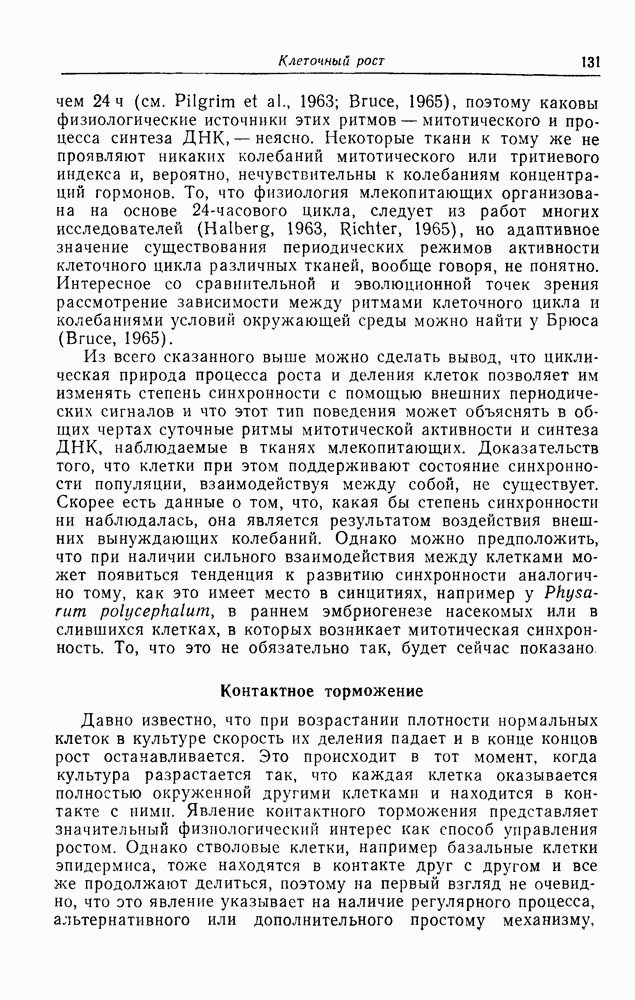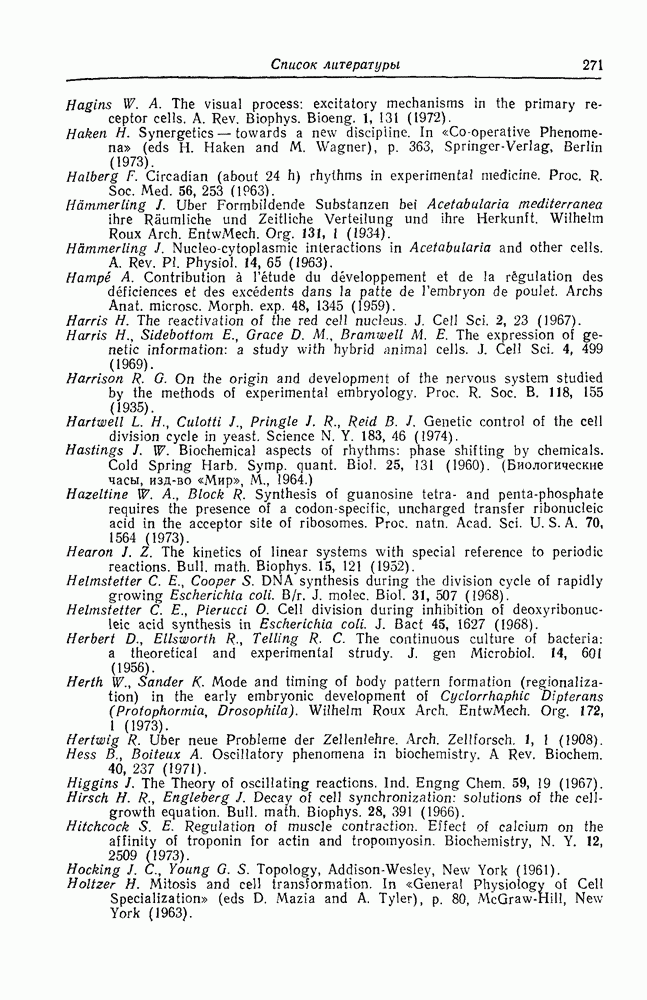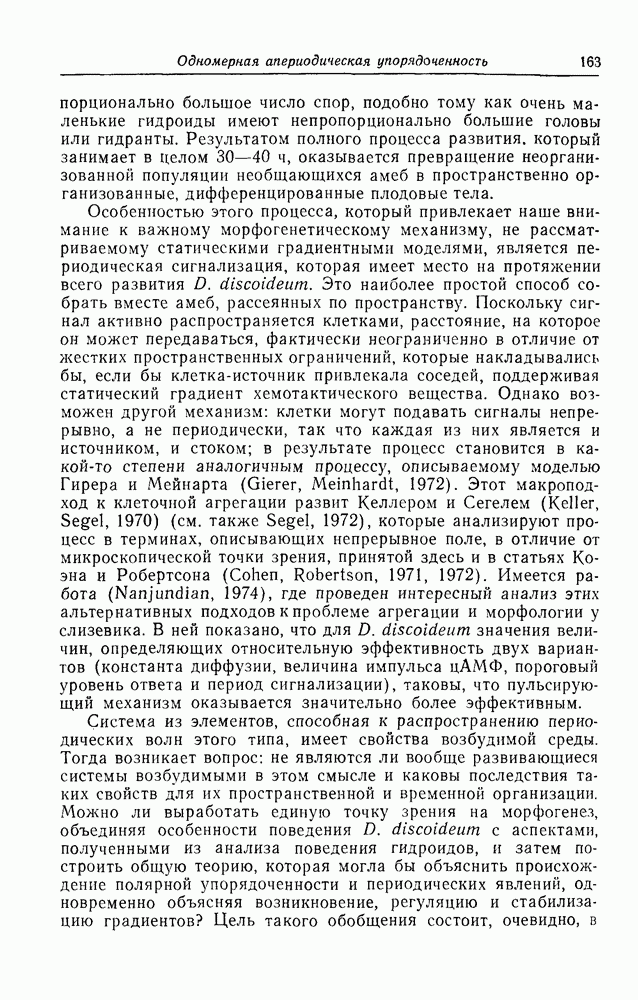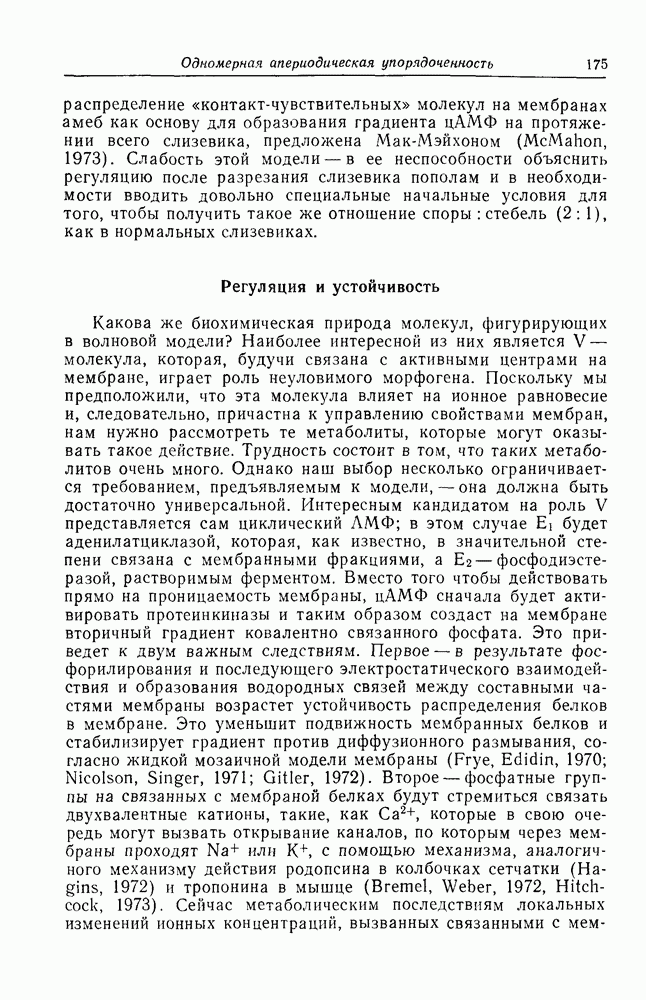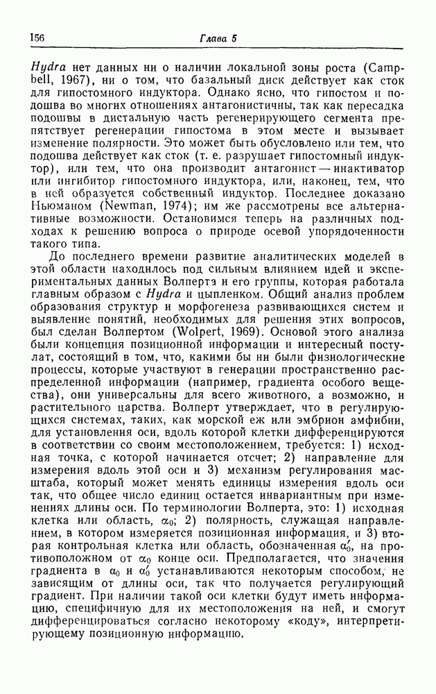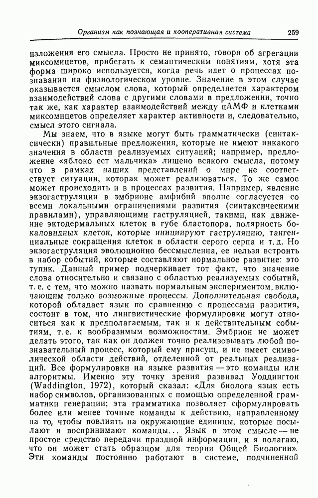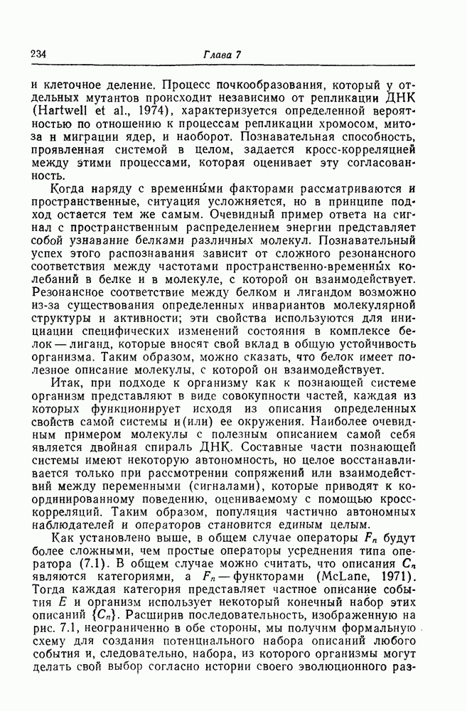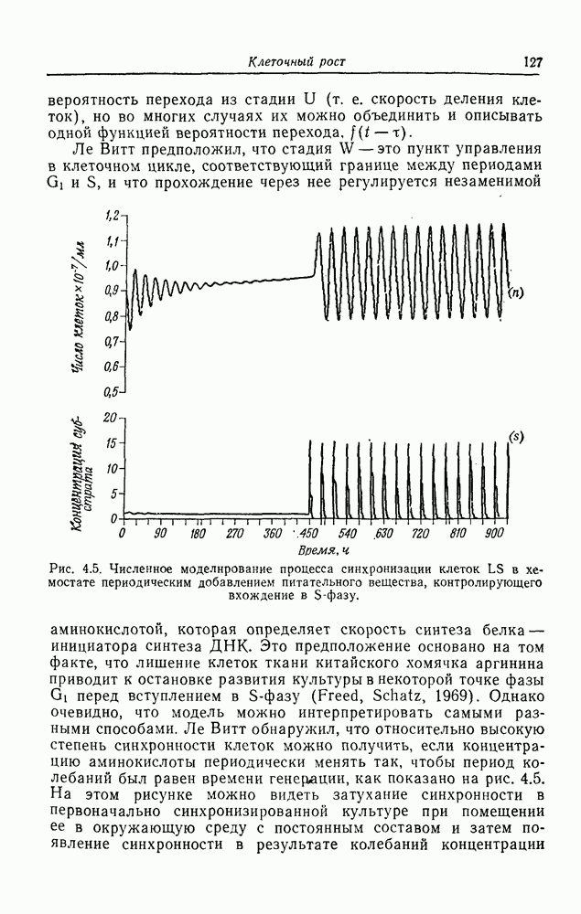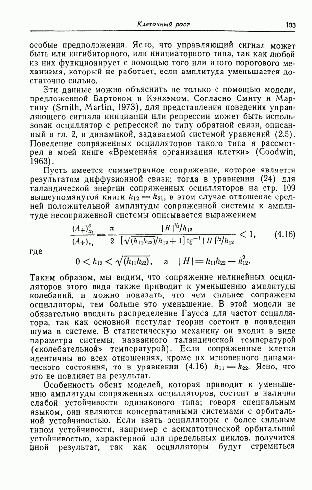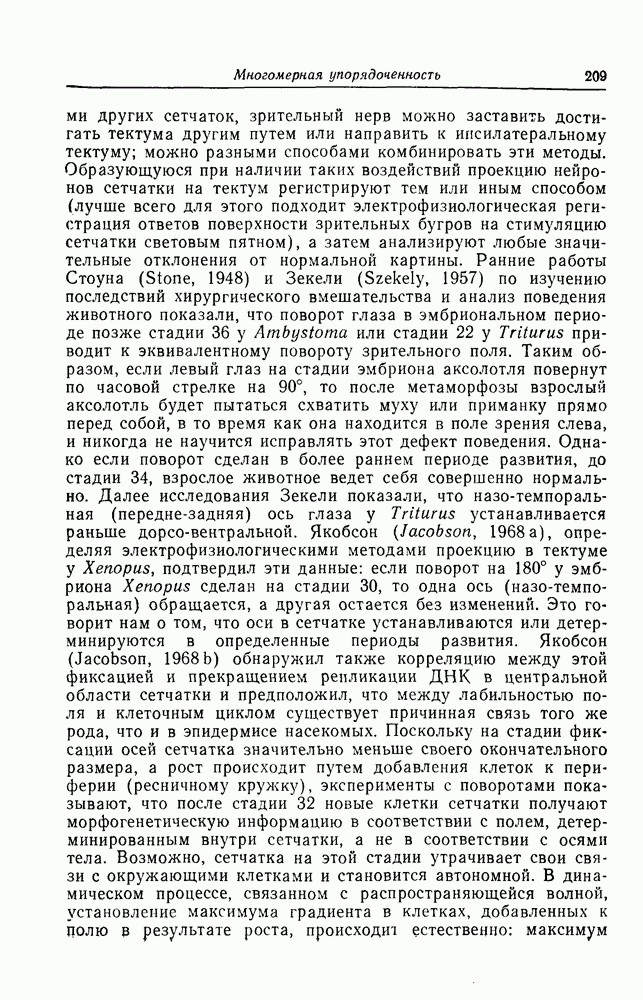 Рис. 3.7. Клеточный цикл эукариотов с ответвлением, ведущим к клеточной дифференцировке У схемы, представленной на рис. 3.7, имеется одна особенность, которая вводит в заблуждение и должна рассматриваться как недостаток: может показаться, что процесс клеточной дифференцировки и клеточный цикл работают по принципу «все или ничего», хотя на самом деле это не так. В течение эмбриогенеза, по мере того как происходят органогенез и клеточная дифференцировка, темп клеточных делений постепенно падает, но промежуточные состояния определенно существуют: частично дифференцированные клетки (миобласты, эритробласты, нейробласты и т. д.) продолжают делиться. Кроме того, четко различимы между собой линии стволовых клеток различных тканей органов у взрослых (тех органов, которые сохраняются в стационарном состоянии путем непрерывного возобновления клеток и дифференцировки, как, например кожа, печень, почка и т. д.), хотя их роль состоит в том, чтобы делиться со скоростью, определяемой некоторыми критериями, характеризующими потребности ткани или органа (используя язык теории управления). Хотя в таких системах клетки, которые в ответ на стимул к дифференцировке покидают стволовую популяцию, изменяют свое состояние, как правило, внезапно, нельзя считать, что этот процесс протекает строго по принципу «все или ничего». Чтобы передать гибкость связи между клеточным циклом и клеточной дифференцировкой, нужна гораздо более динамическая картина, чем та, которая дана на рис. 3.7. Теперь мне хотелось бы остановиться на некоторых исследованиях, дающих динамическую картину тканевой организации и в то же время допускающих построение и исследование модели тканевого гомеостаза с отрицательной обратной связью. Аналогично тому, как проблема управления репликацией ДНК привела нас к вопросу о том, каким образом клетки измеряют свои размеры, проблема управления клеточной дифференцировкой в ткани заставляет исследовать задачу поддержания ее пространственной организации. Это подводит нас к другому уровню биологической иерархии, характерному для многоклеточных. Динамически мы все еще работаем в пределах эпигенетической системы, хотя время теперь измеряется днями. Это происходит потому, что период клеточного цикла высших организмов обычно лежит в диапазоне 10-100 ч.